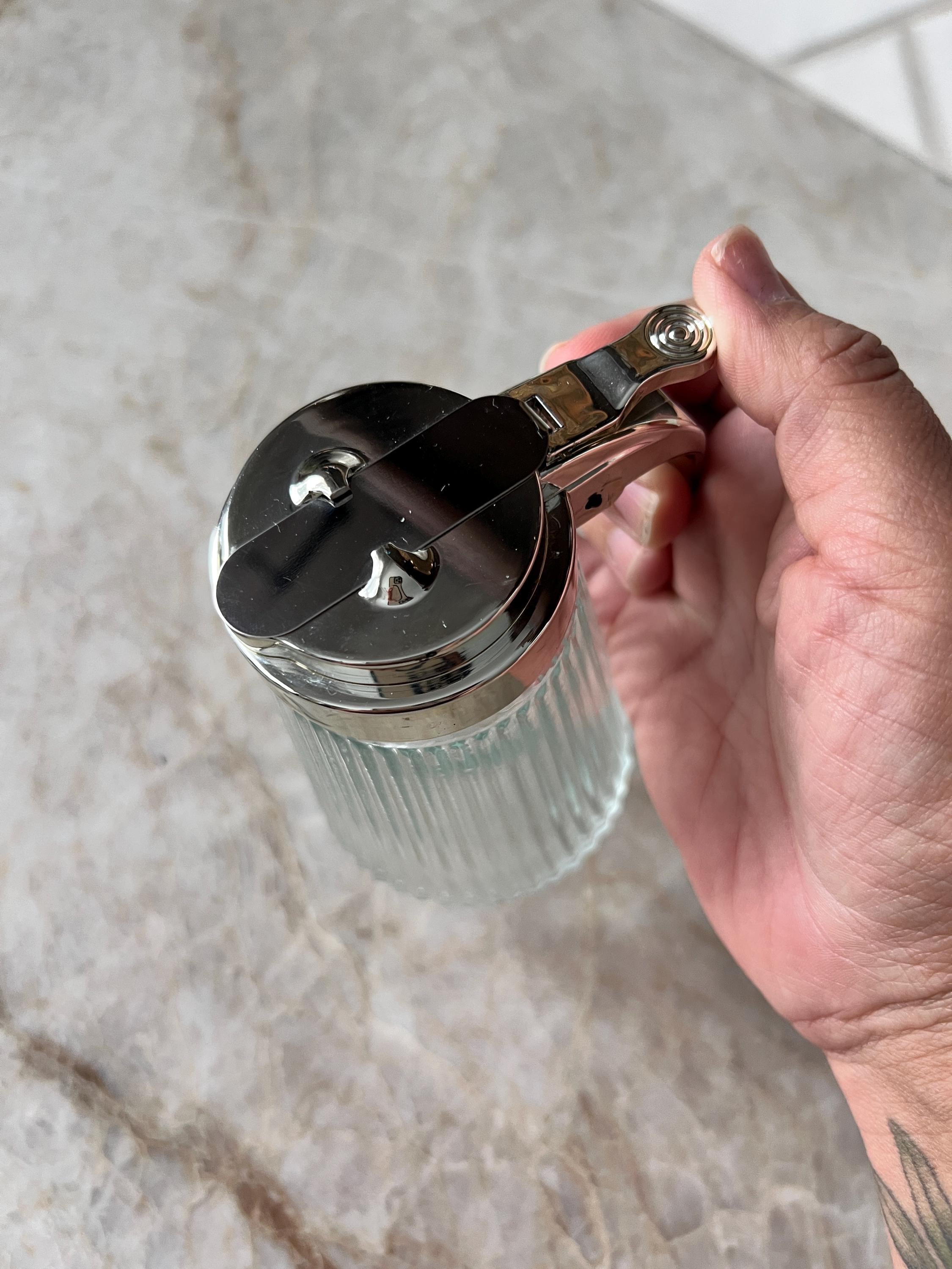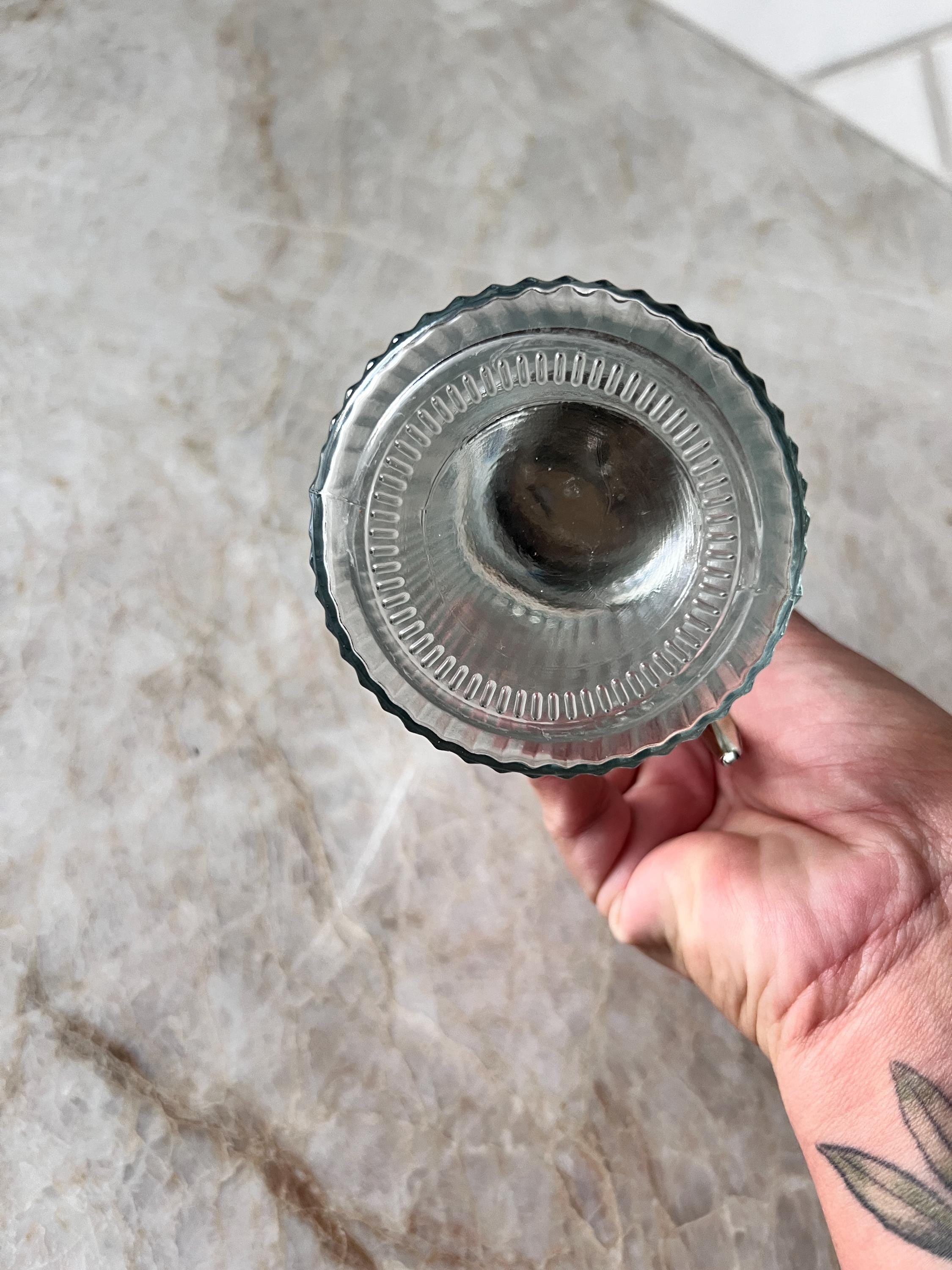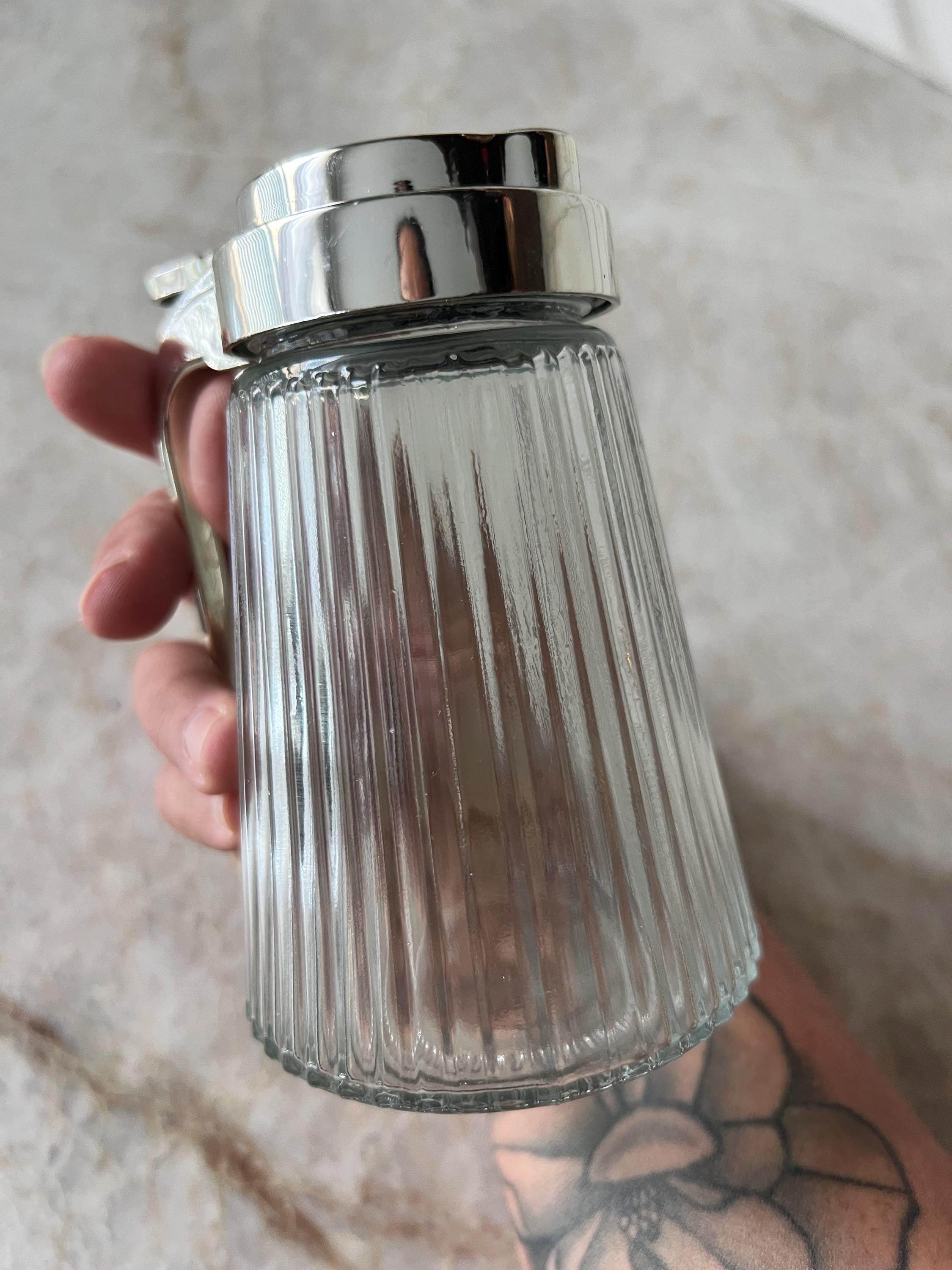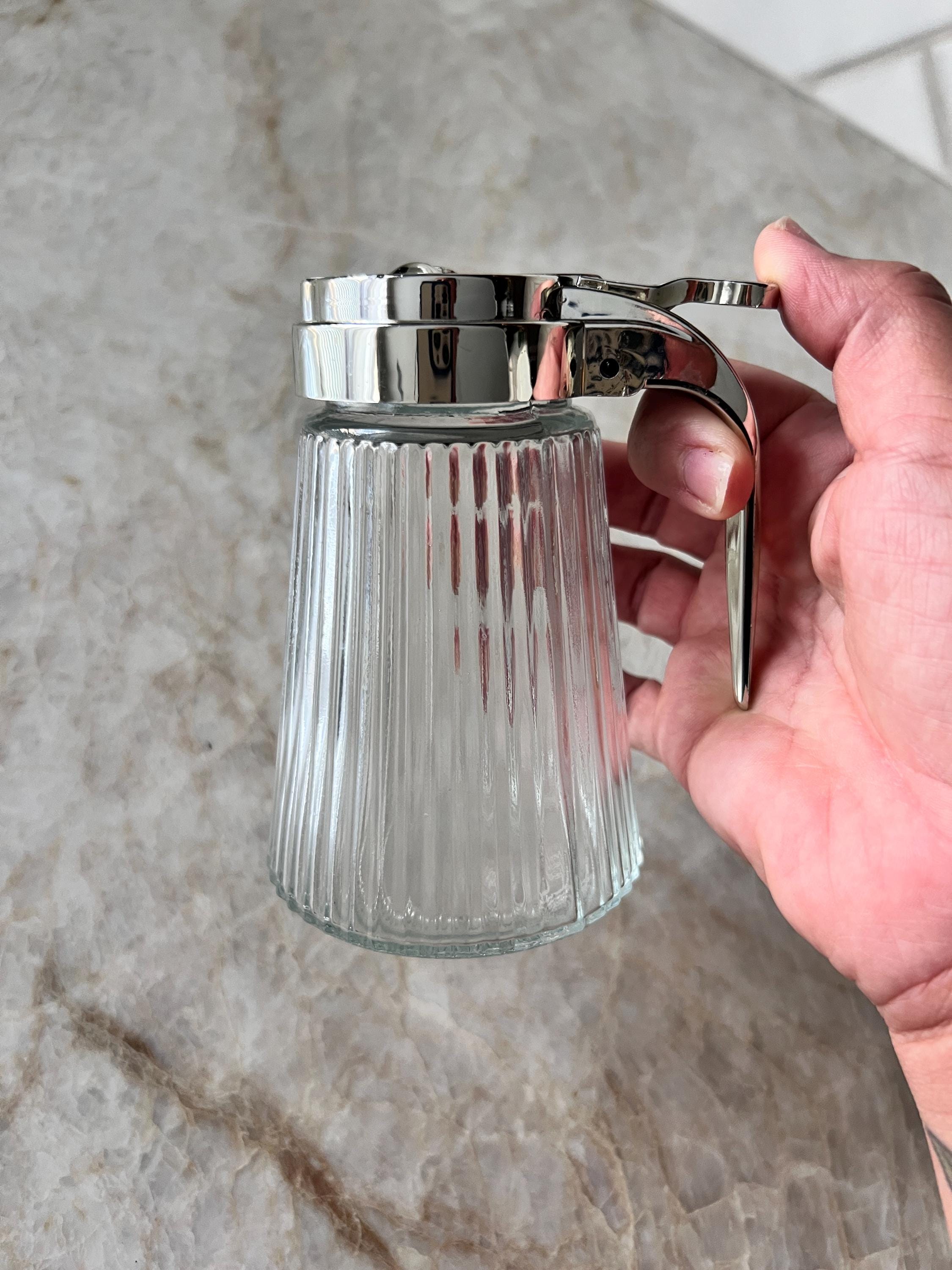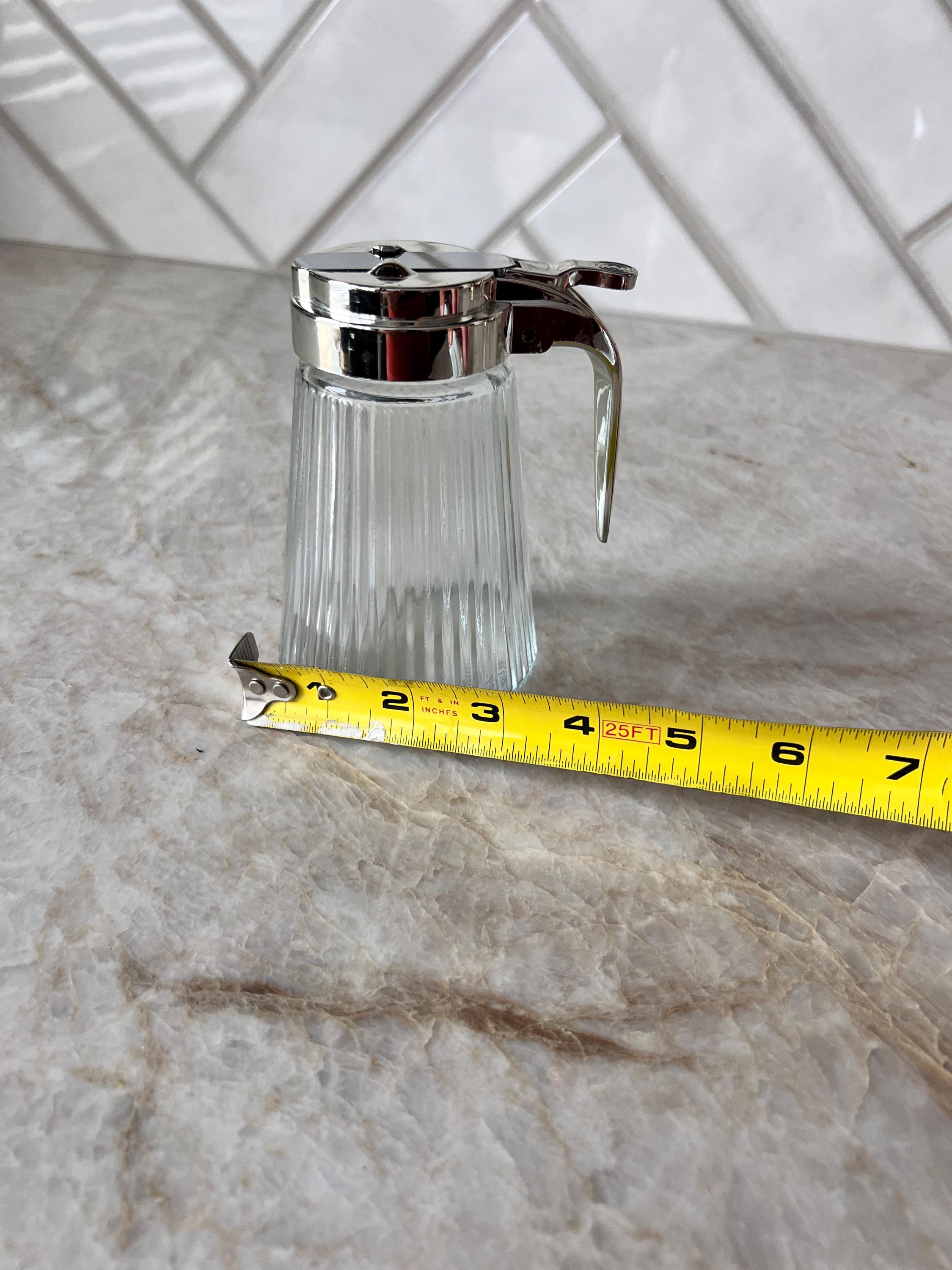 Add a touch of classic charm to your breakfast table with this vintage pressed glass syrup pitcher, featuring a beautifully detailed diamond pattern and a hinged silver-tone metal lid. Both practical and pretty, it’s perfect for serving maple syrup, honey, cream, or sauces in vintage farmhouse style.