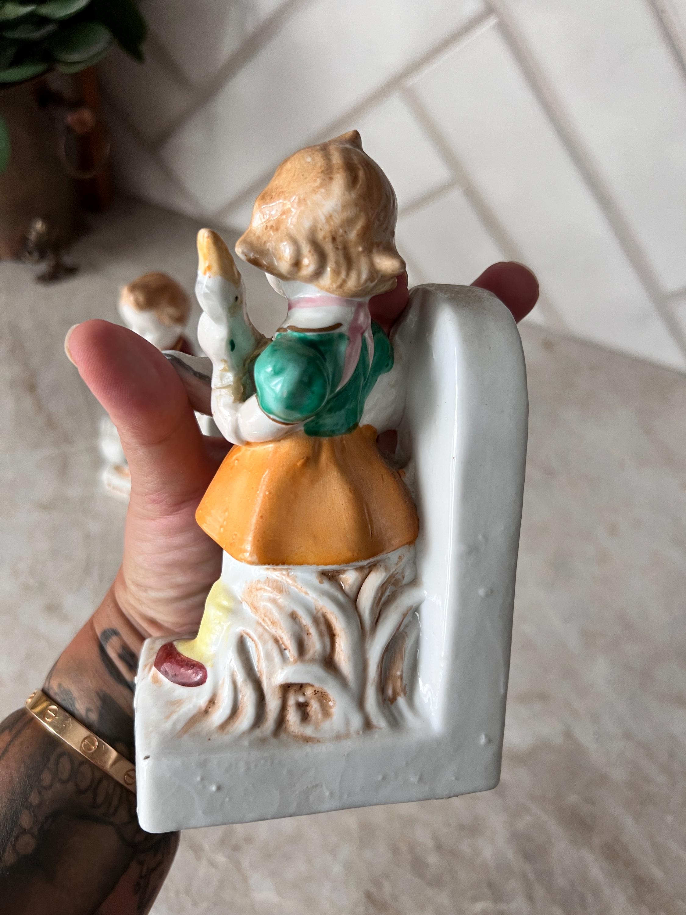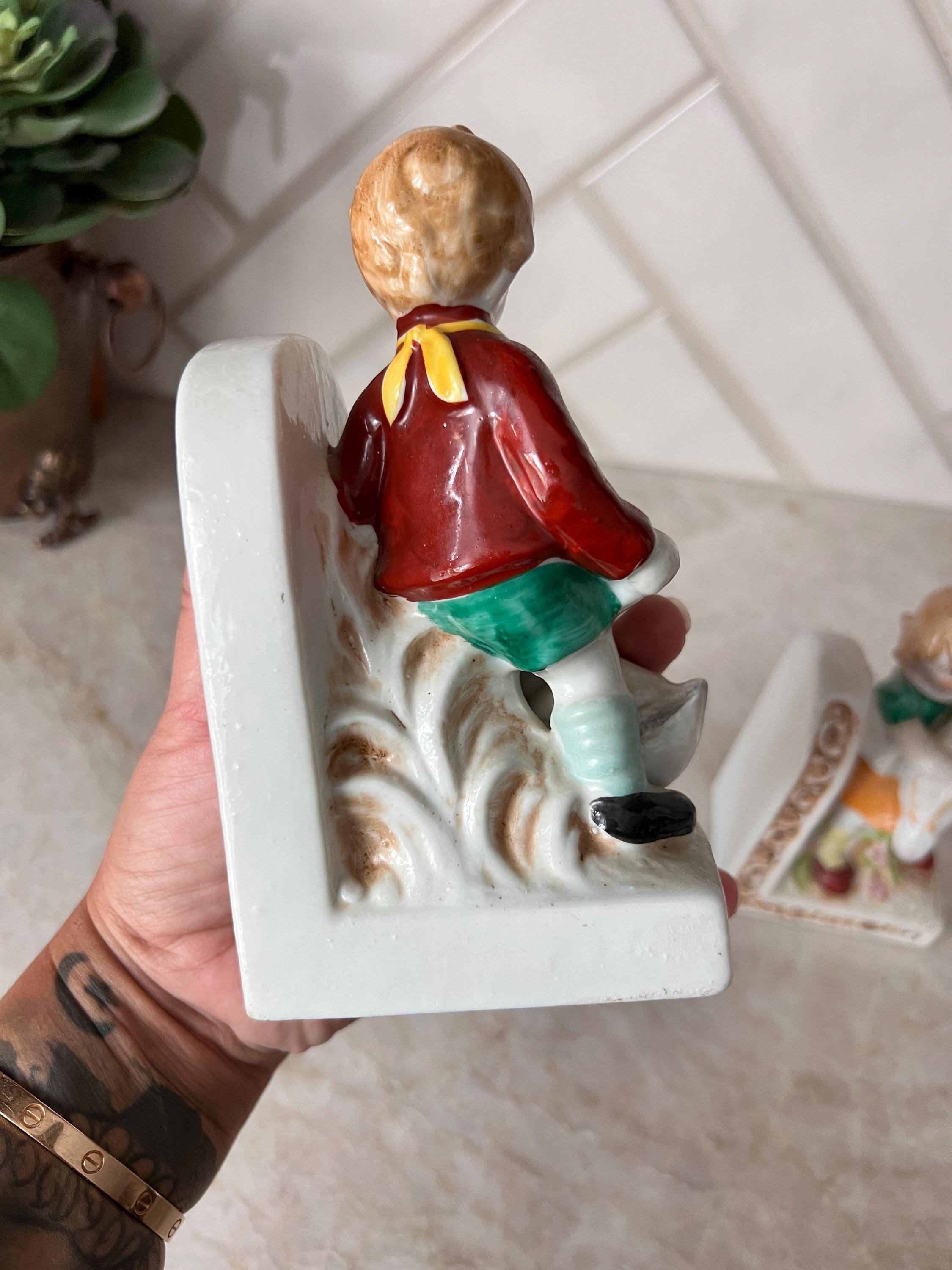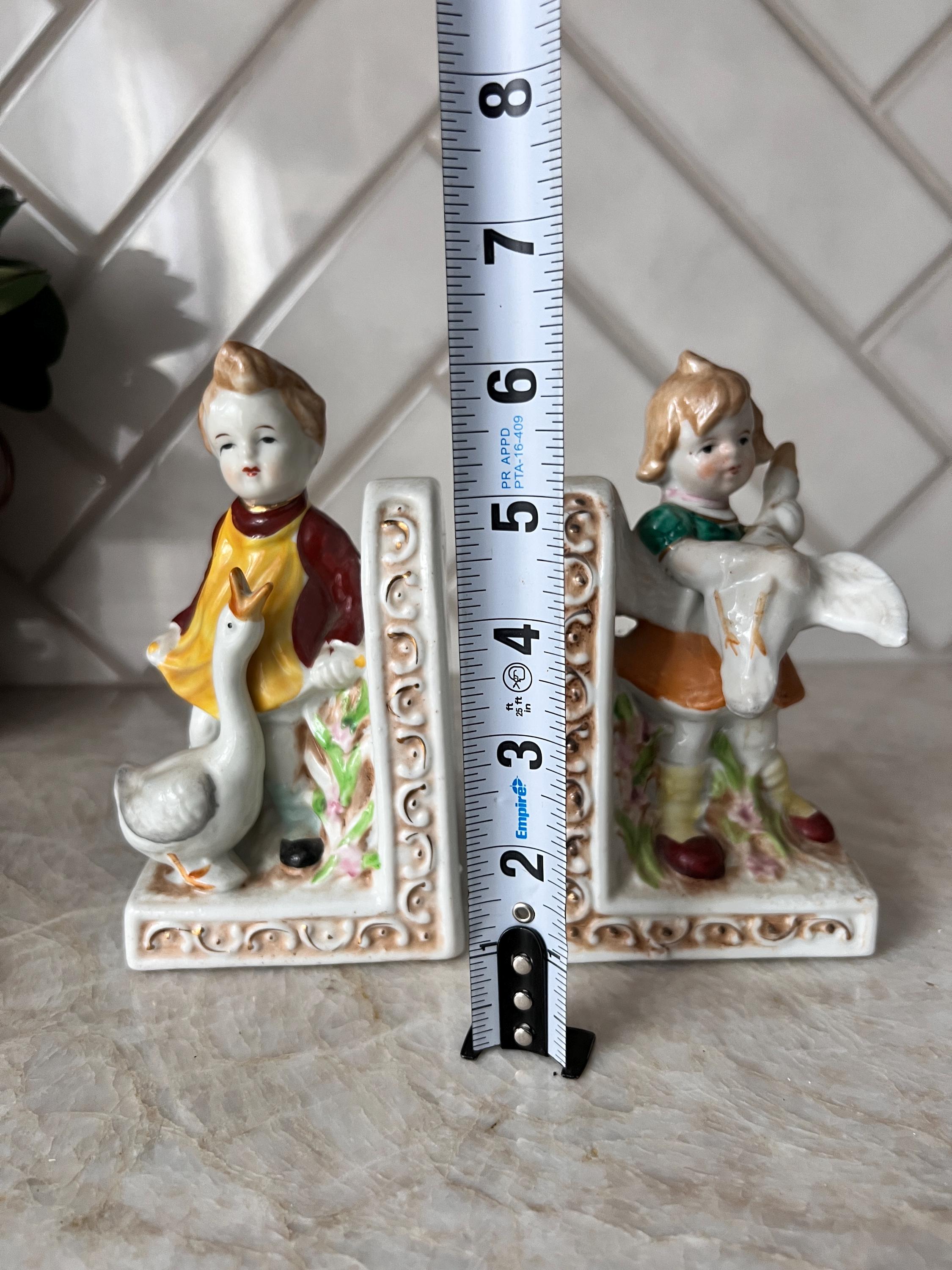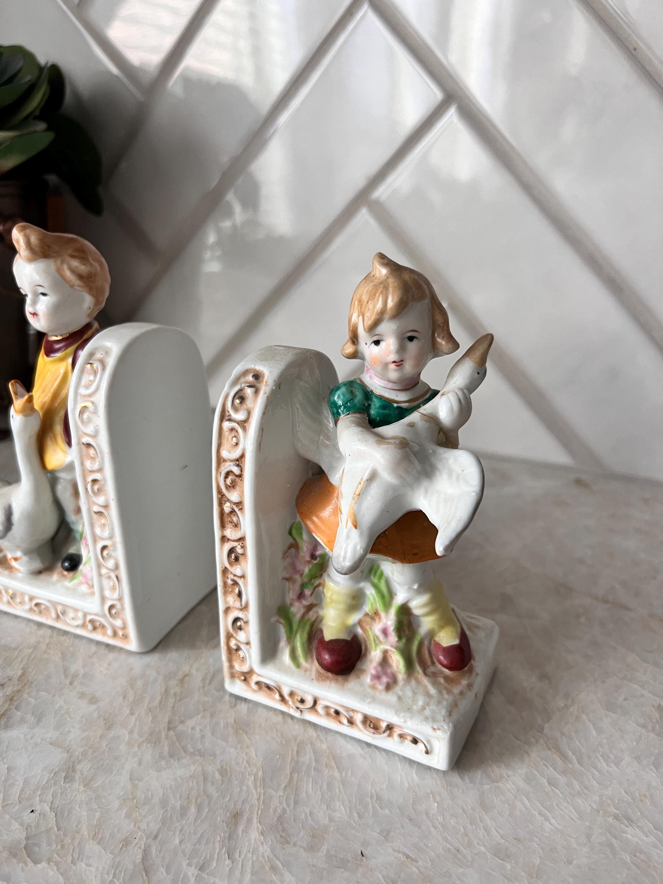 Add a nostalgic, storybook touch to your nursery or child’s room with this adorable pair of vintage ceramic bookends. Featuring a sweet little boy and girl each holding a white duck, these detailed figurines are painted in soft pastel tones with hand-painted accents. The ornate scroll detailing and floral elements lend a charming cottagecore or shabby chic aesthetic, making them perfect for a nursery bookshelf, children's storybook nook, or whimsical baby shower gift.