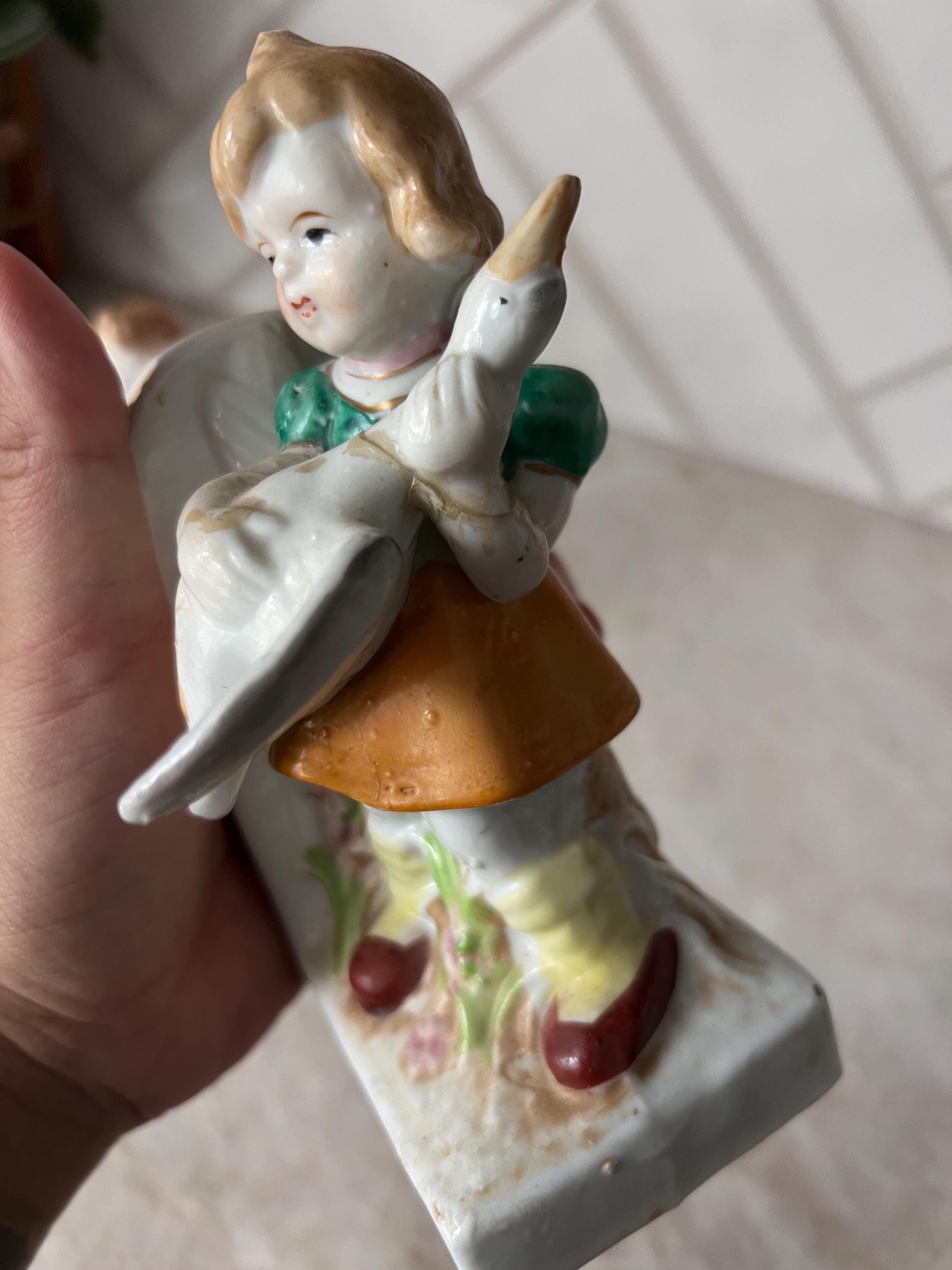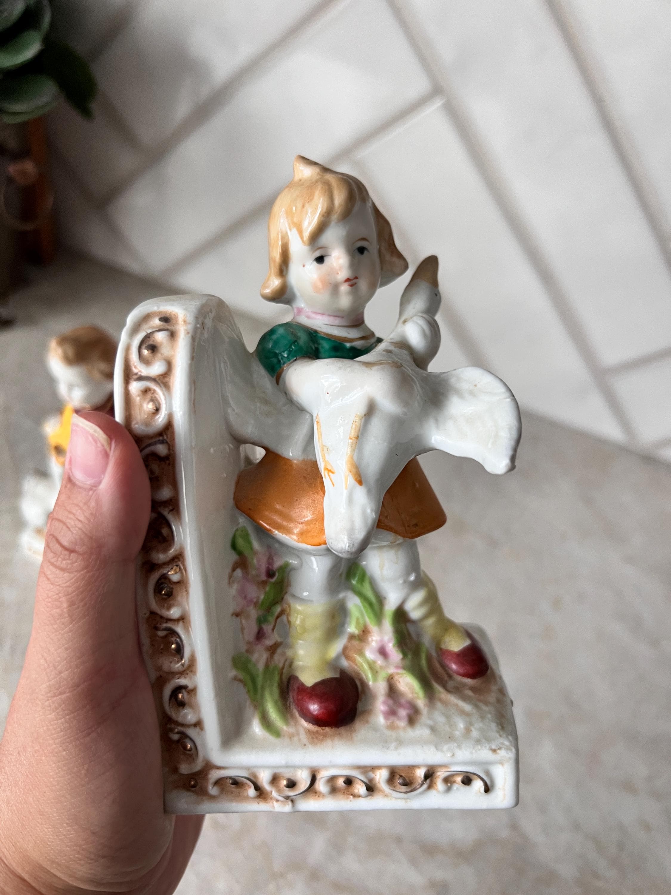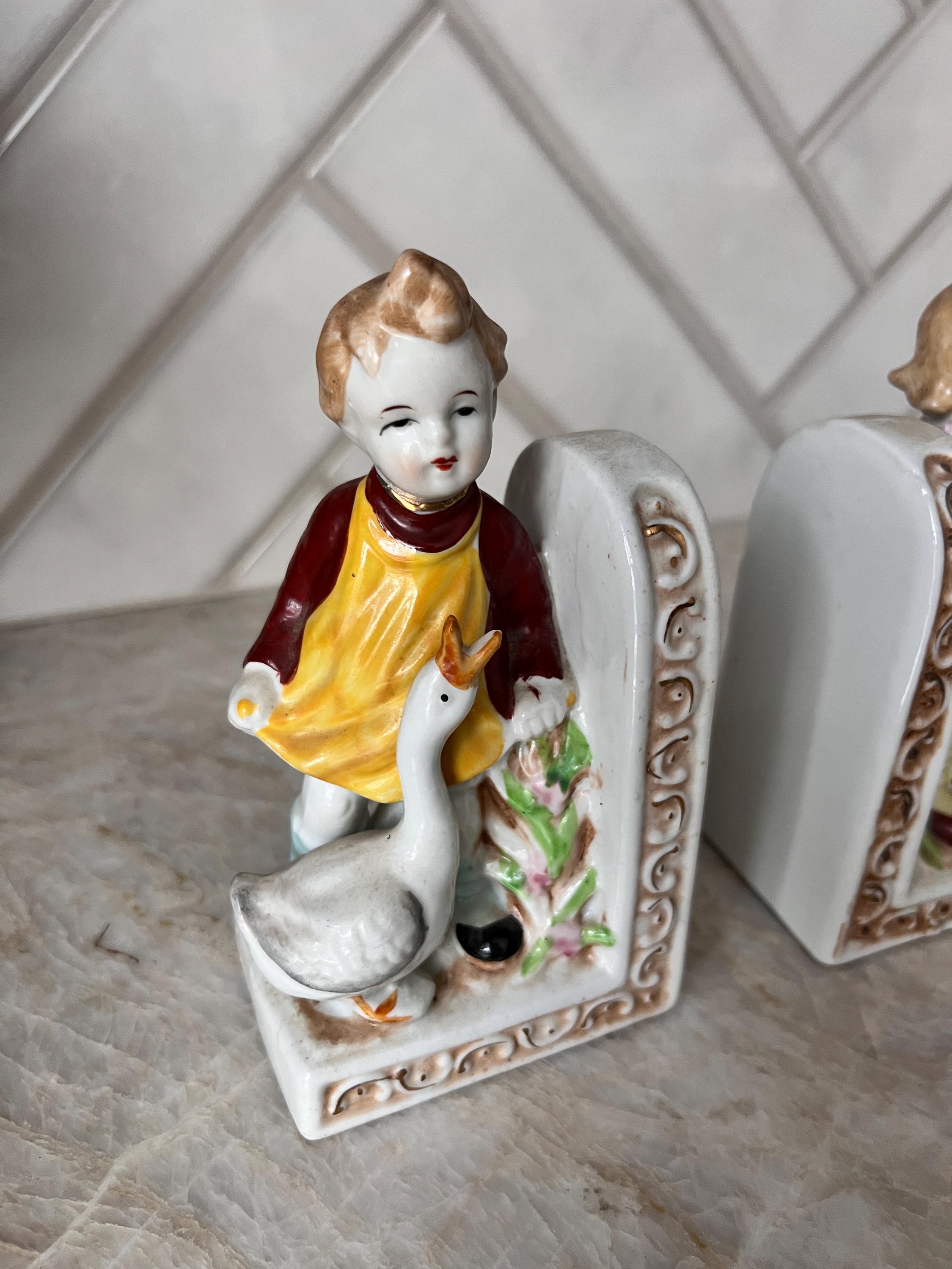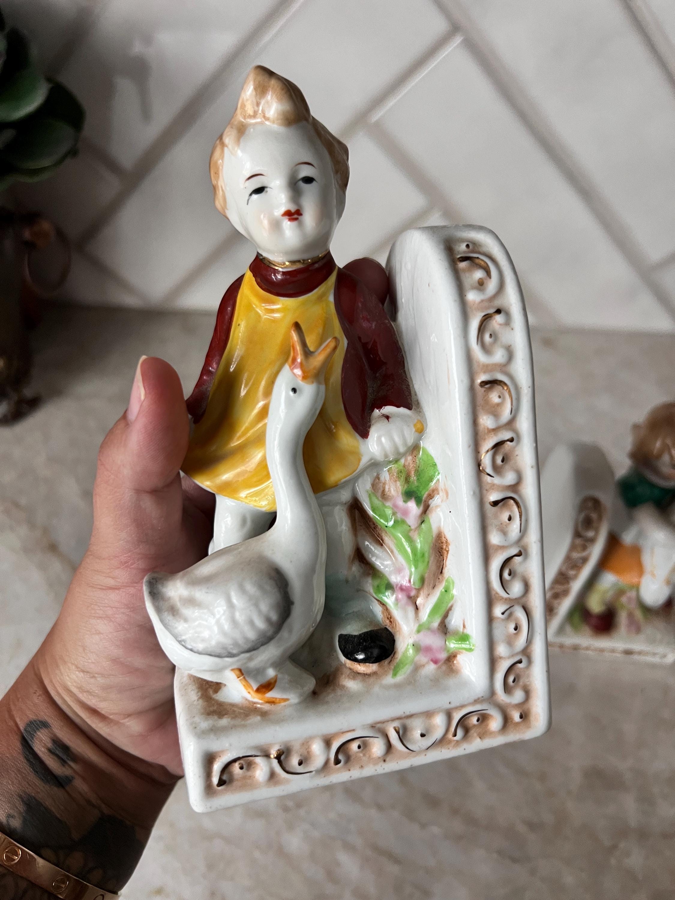 Add a nostalgic, storybook touch to your nursery or child’s room with this adorable pair of vintage ceramic bookends. Featuring a sweet little boy and girl each holding a white duck, these detailed figurines are painted in soft pastel tones with hand-painted accents. The ornate scroll detailing and floral elements lend a charming cottagecore or shabby chic aesthetic, making them perfect for a nursery bookshelf, children's storybook nook, or whimsical baby shower gift.