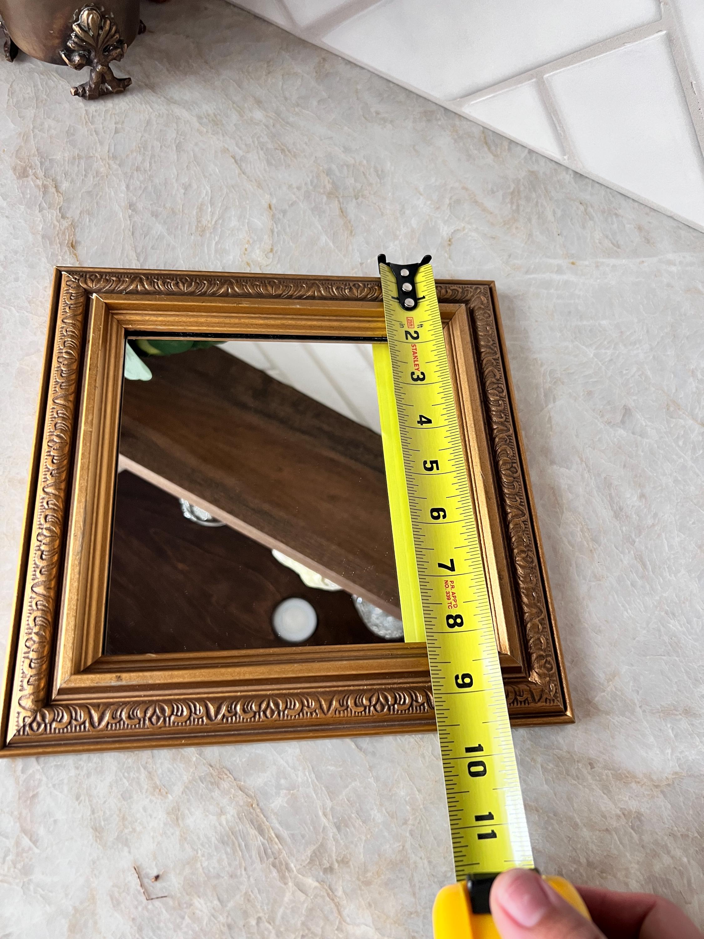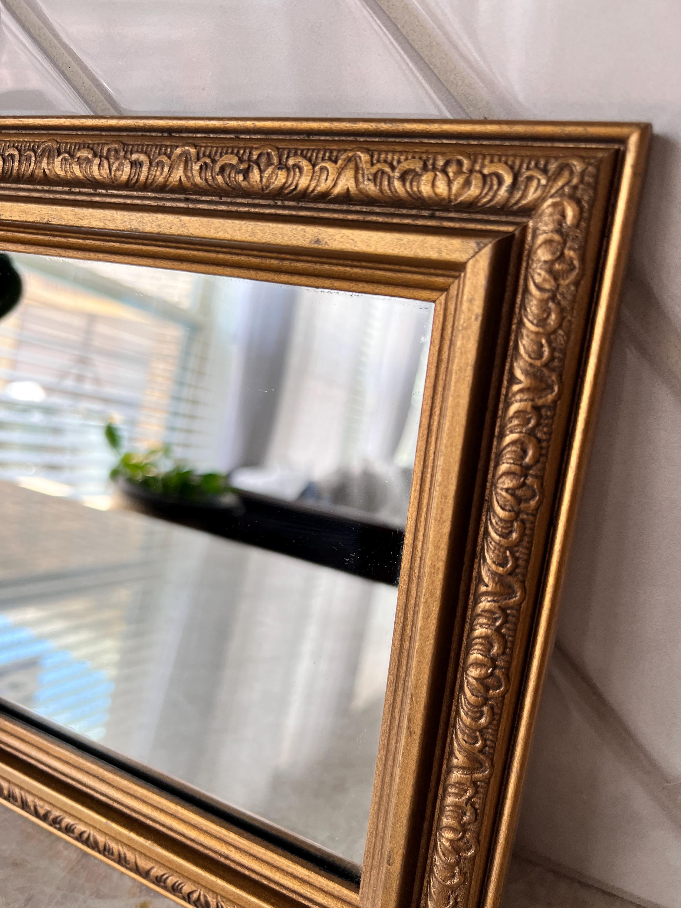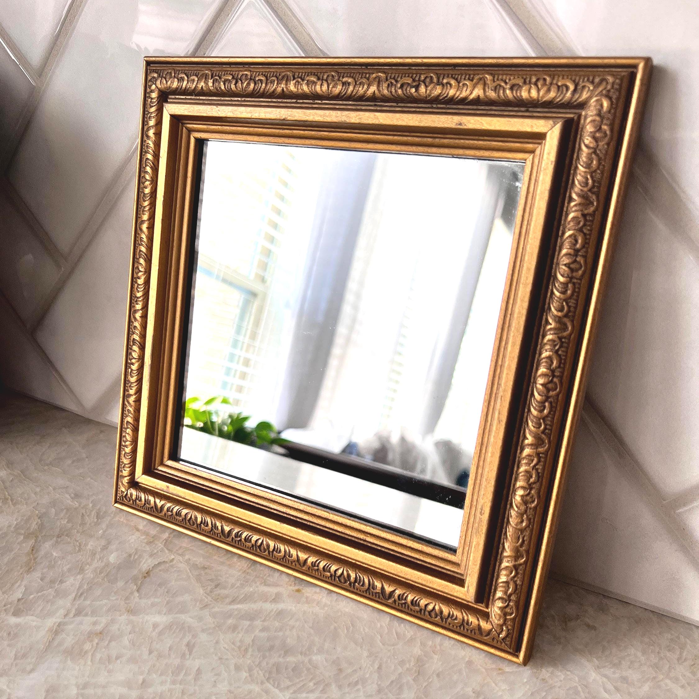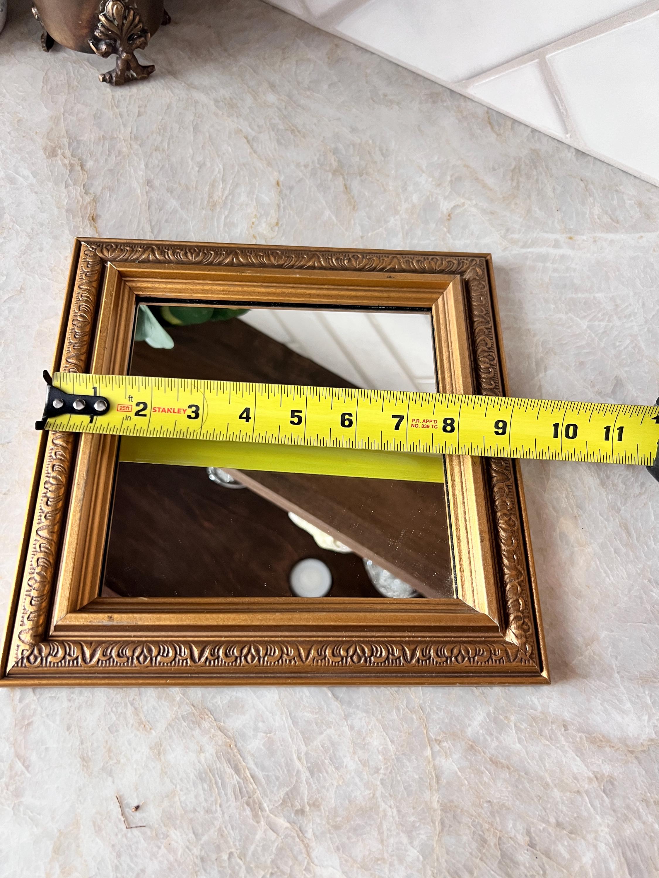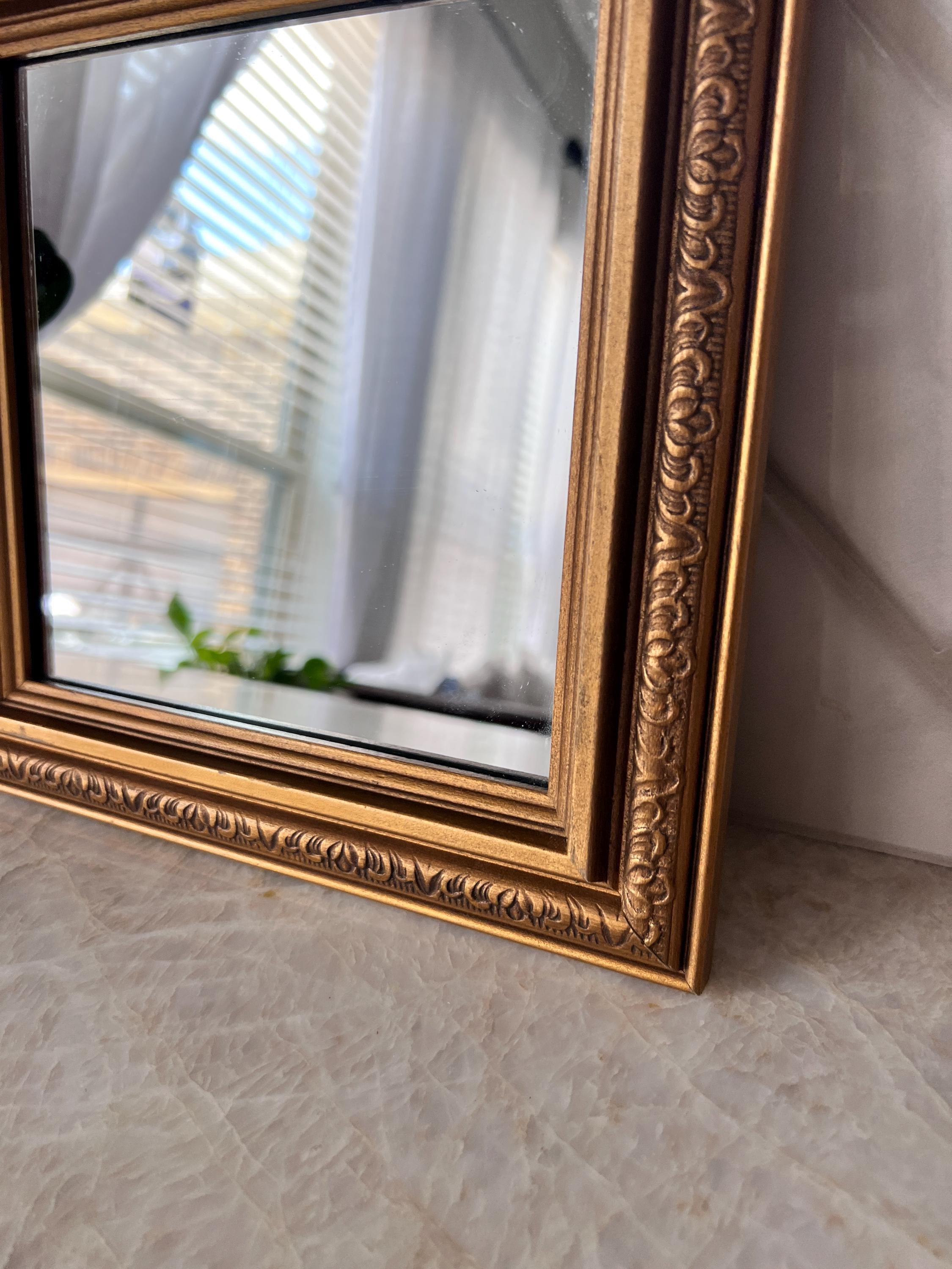 Add a touch of vintage charm to your space with this stunning small gold-framed mirror. Featuring a classic baroque-style molded frame in an antique gold finish, this timeless piece is perfect for layering into gallery walls, adding elegance to vanities or entryways, or displaying on a shelf for extra sparkle. The ornate detailing and warm gold tone make it a beautiful accent for French country, traditional, or eclectic decor styles.