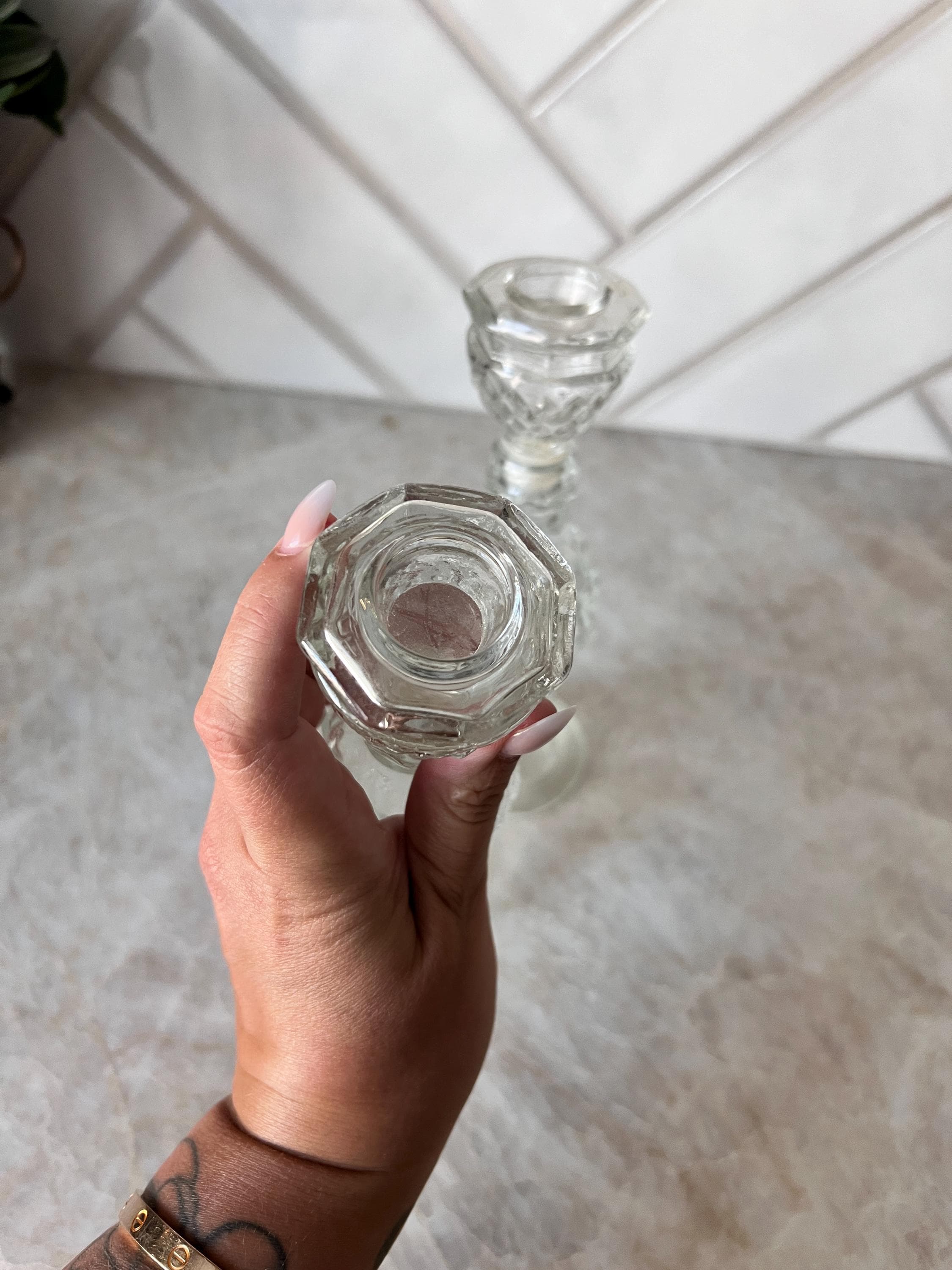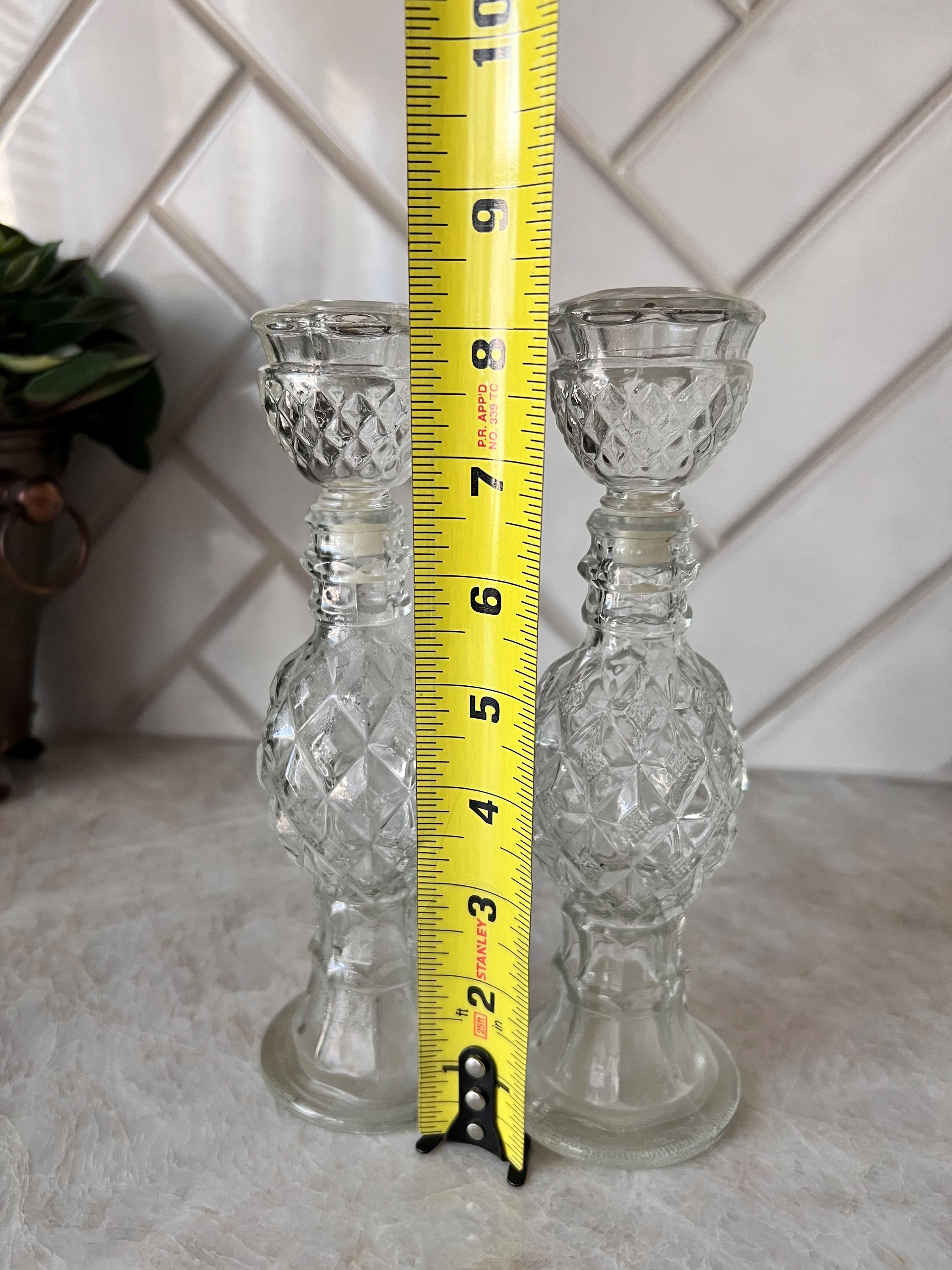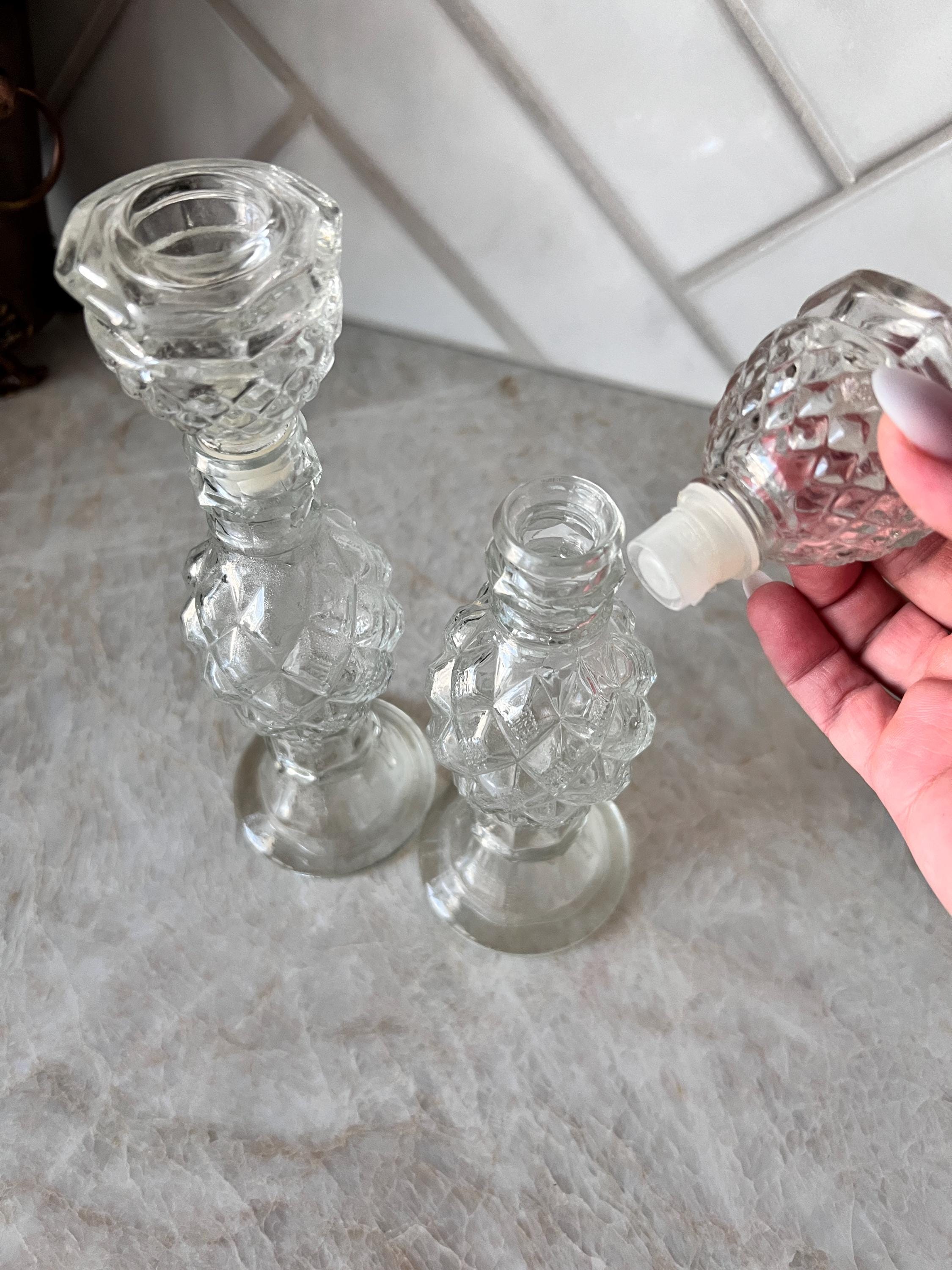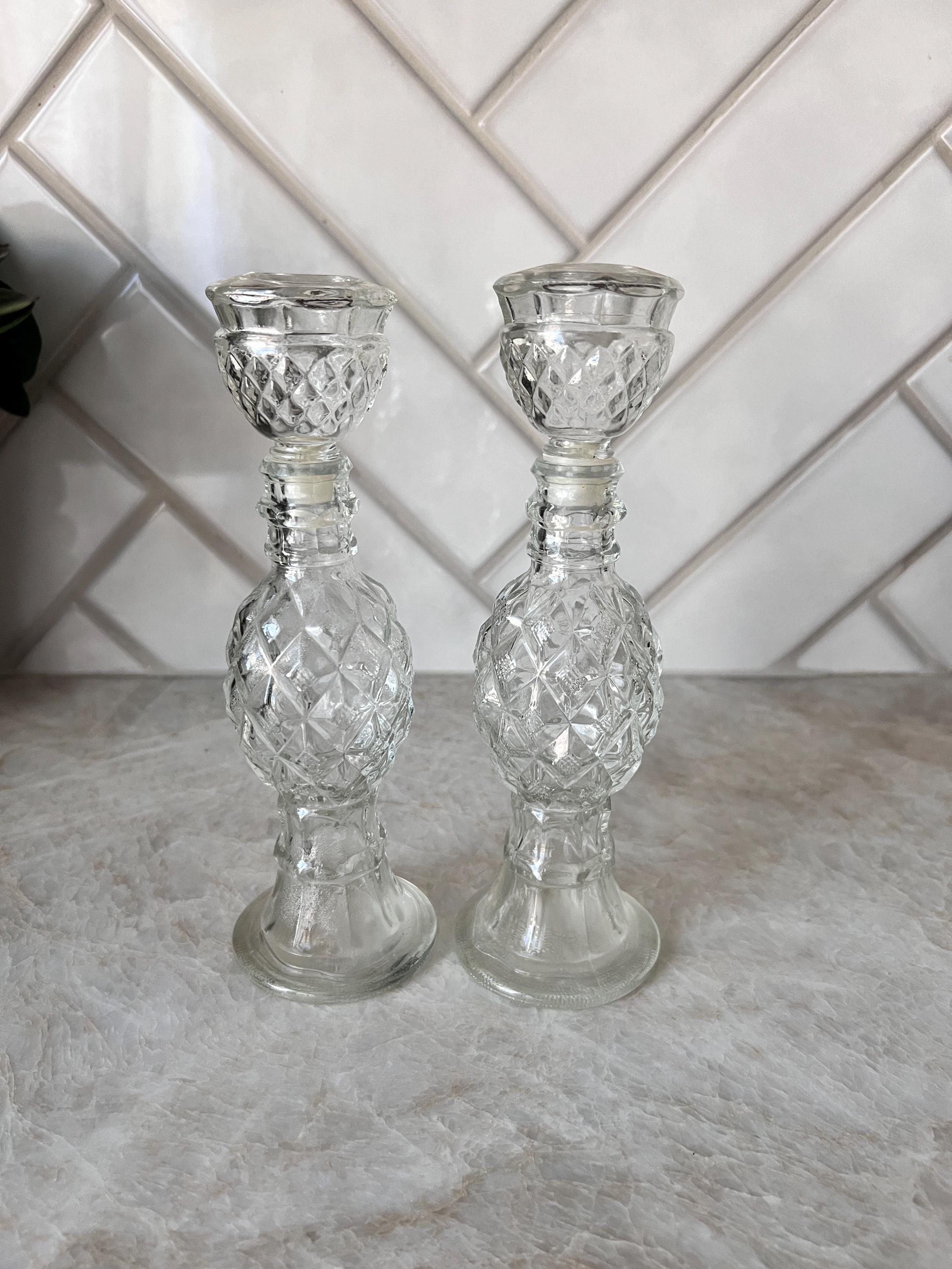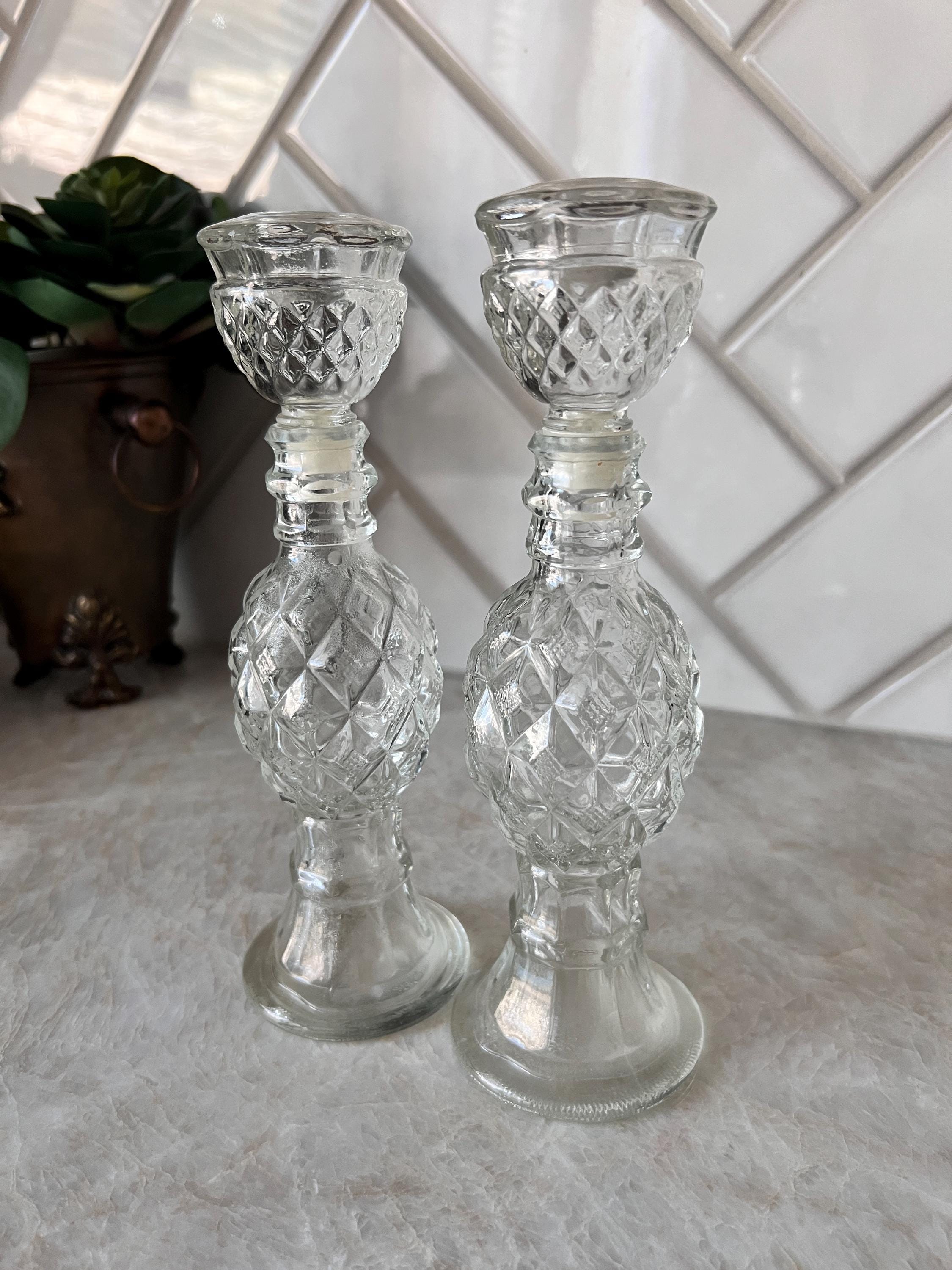 Add a touch of vintage charm to your space with this matching set of AVON pressed glass candlestick holders. Originally created as dual-purpose perfume bottles and candle holders, these elegant pieces feature a clear, diamond-cut pattern reminiscent of a pineapple—symbolizing hospitality and warmth.