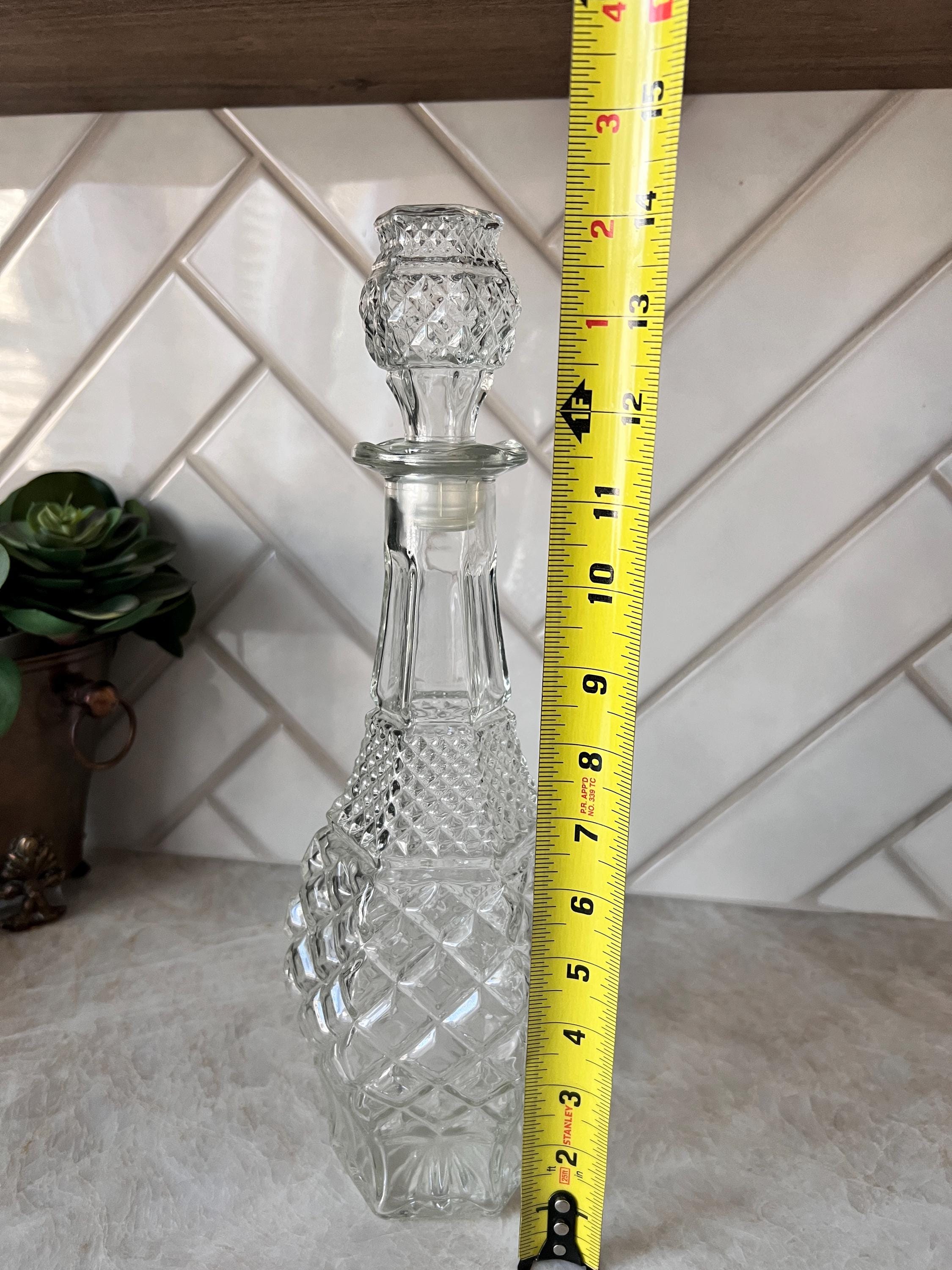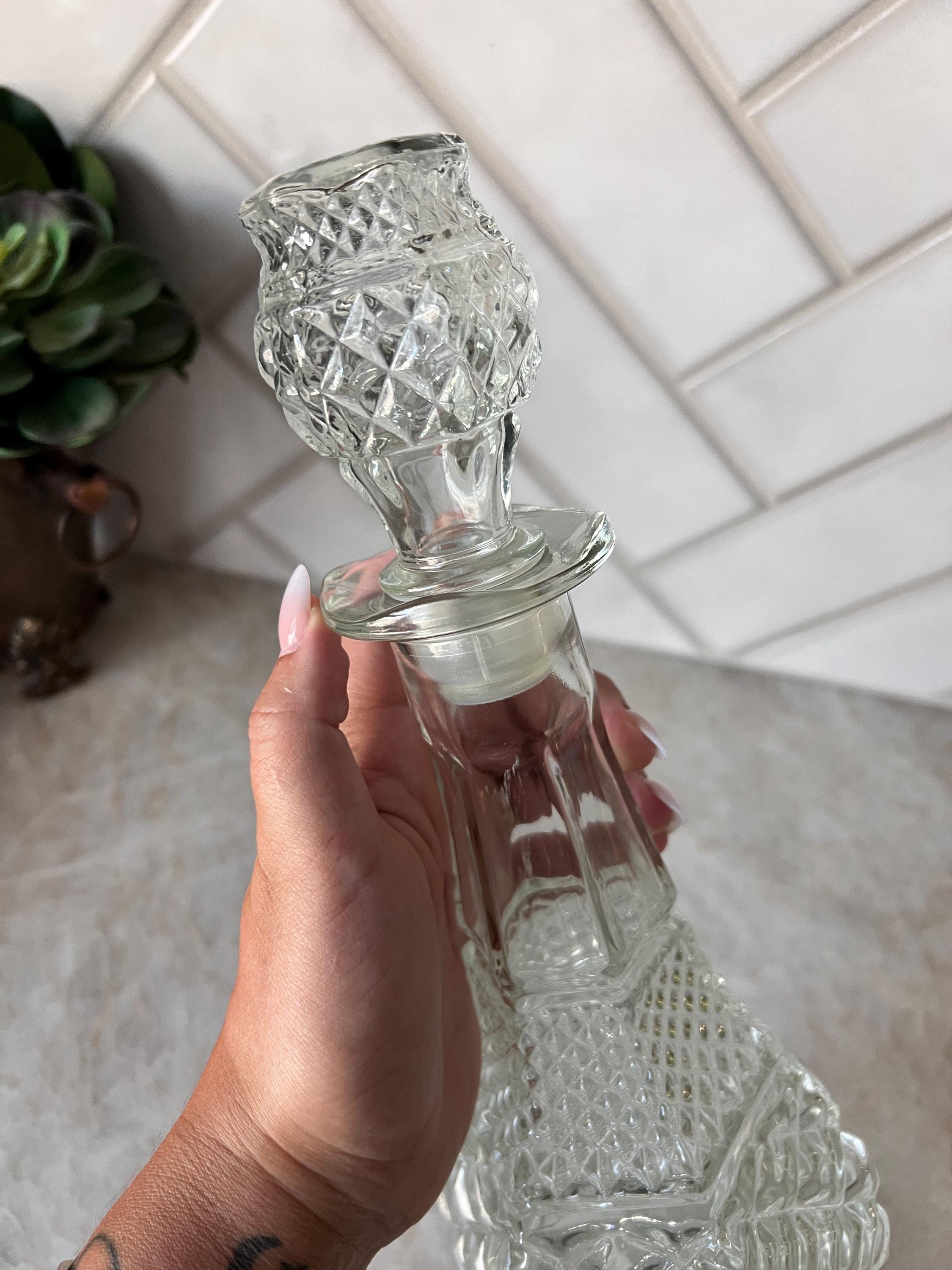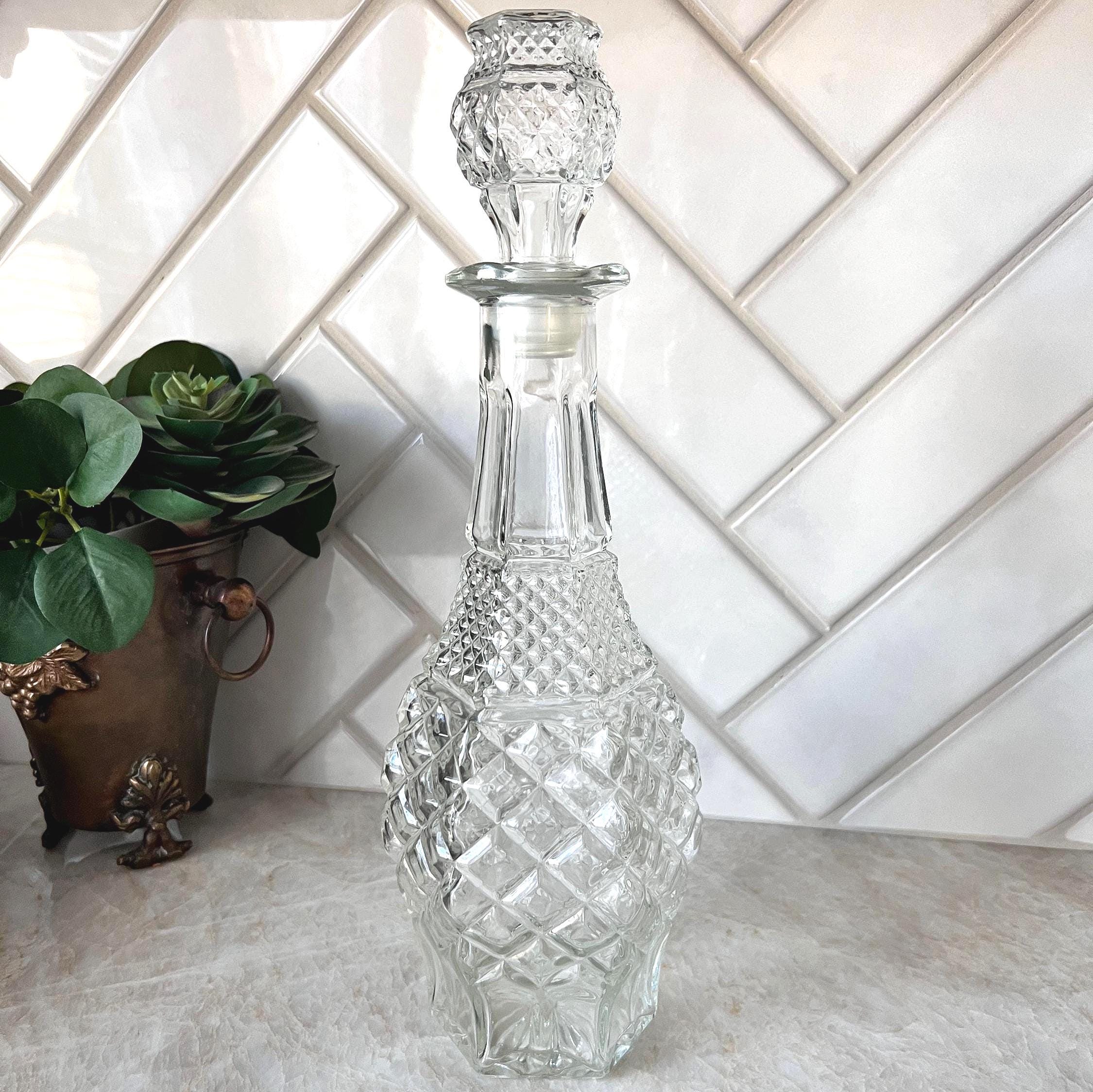 his stunning vintage decanter is a classic piece from Anchor Hocking’s Wexford collection, known for its elegant diamond point pattern. Crafted from clear pressed glass, this large decanter features a beautifully faceted design and includes the original stopper. Its bold, geometric form adds vintage charm and sparkle to any bar cart, shelf, or dining room display.