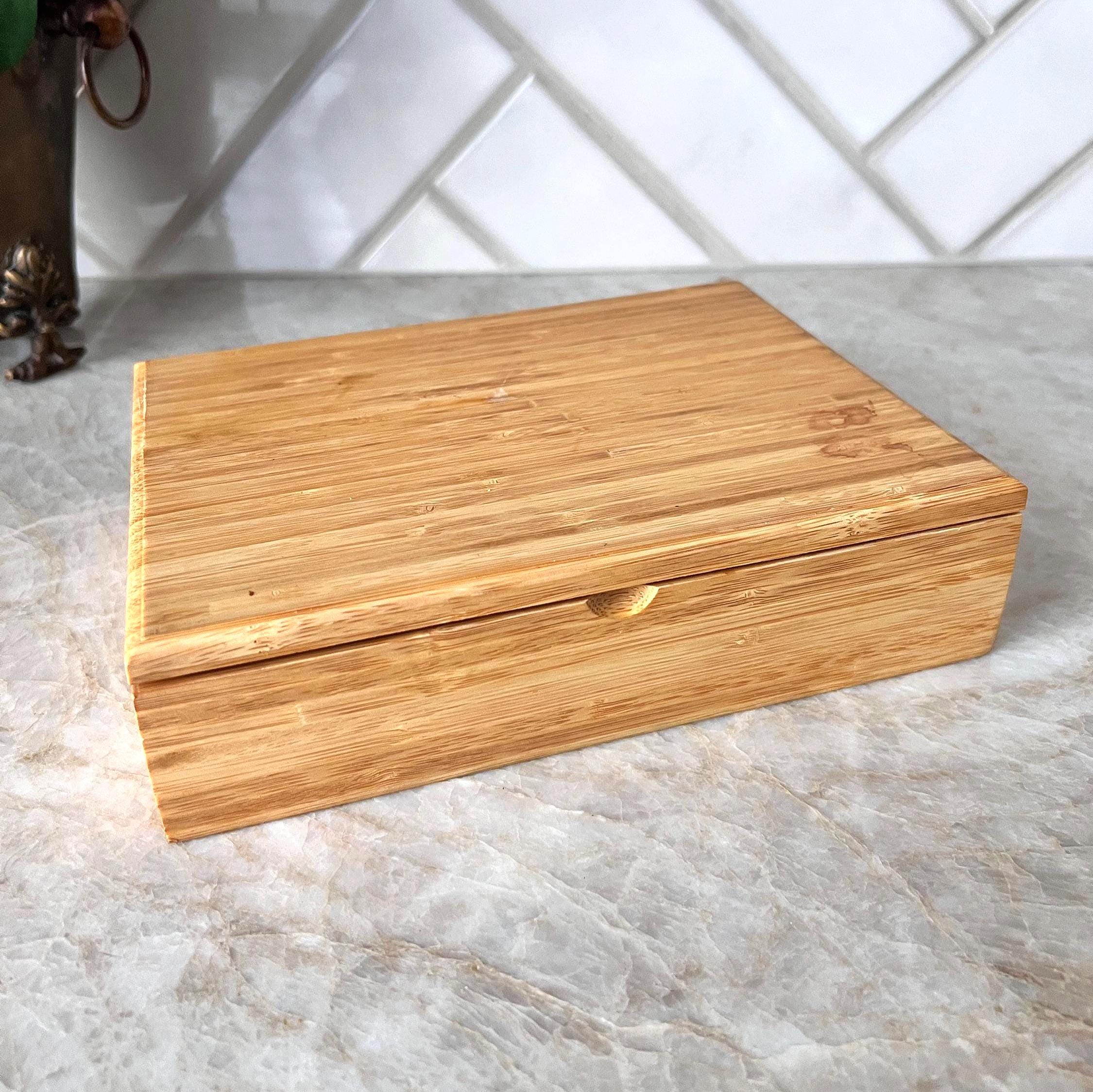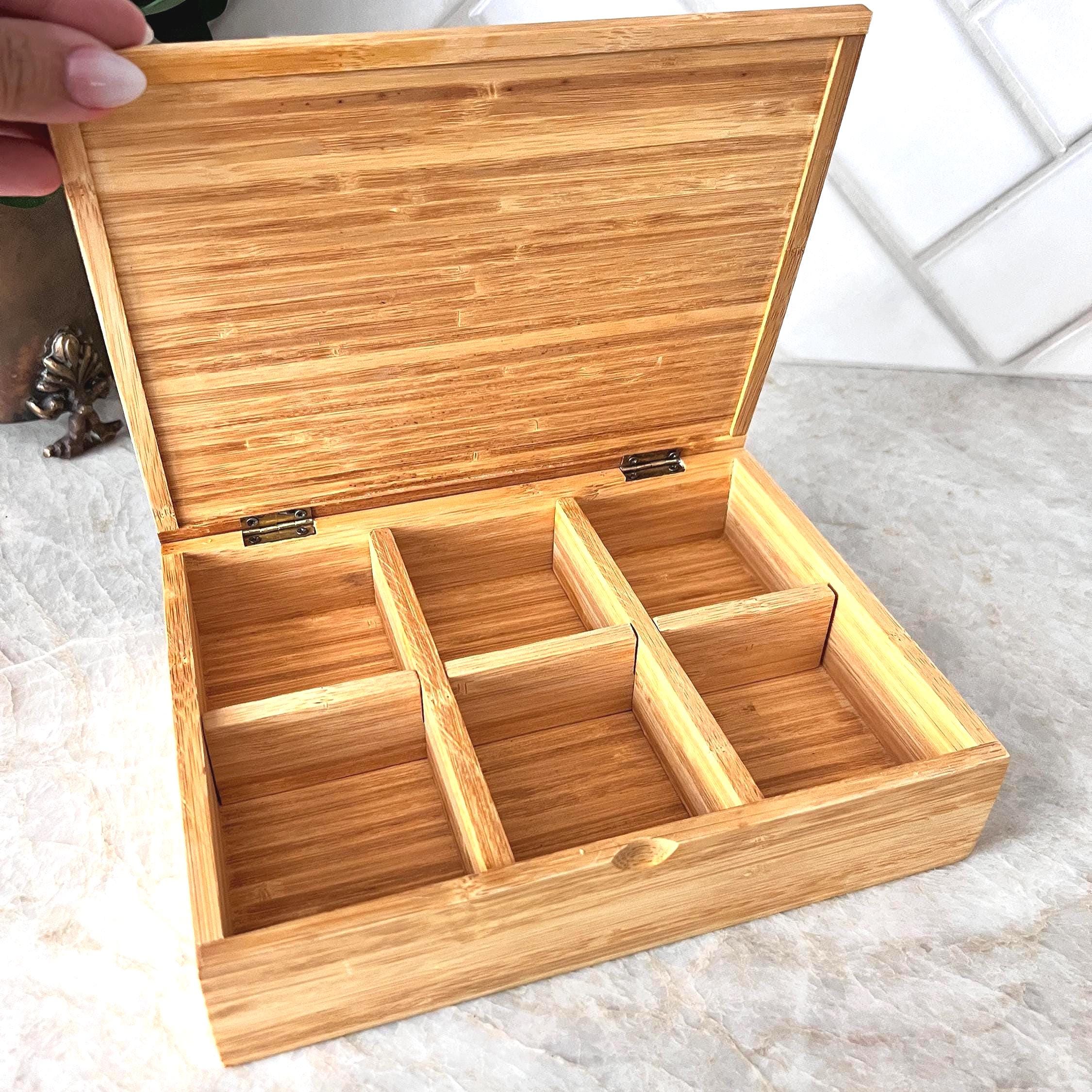 Organize in style with this eco-friendly bamboo tea box, featuring 8 generously sized compartments and a hinged lid. Crafted from smooth, natural bamboo, this versatile organizer is perfect for storing tea bags, jewelry, essential oils, sewing notions, or craft supplies. The warm wood tones and minimalist design blend beautifully into farmhouse, boho, or Japandi interiors.