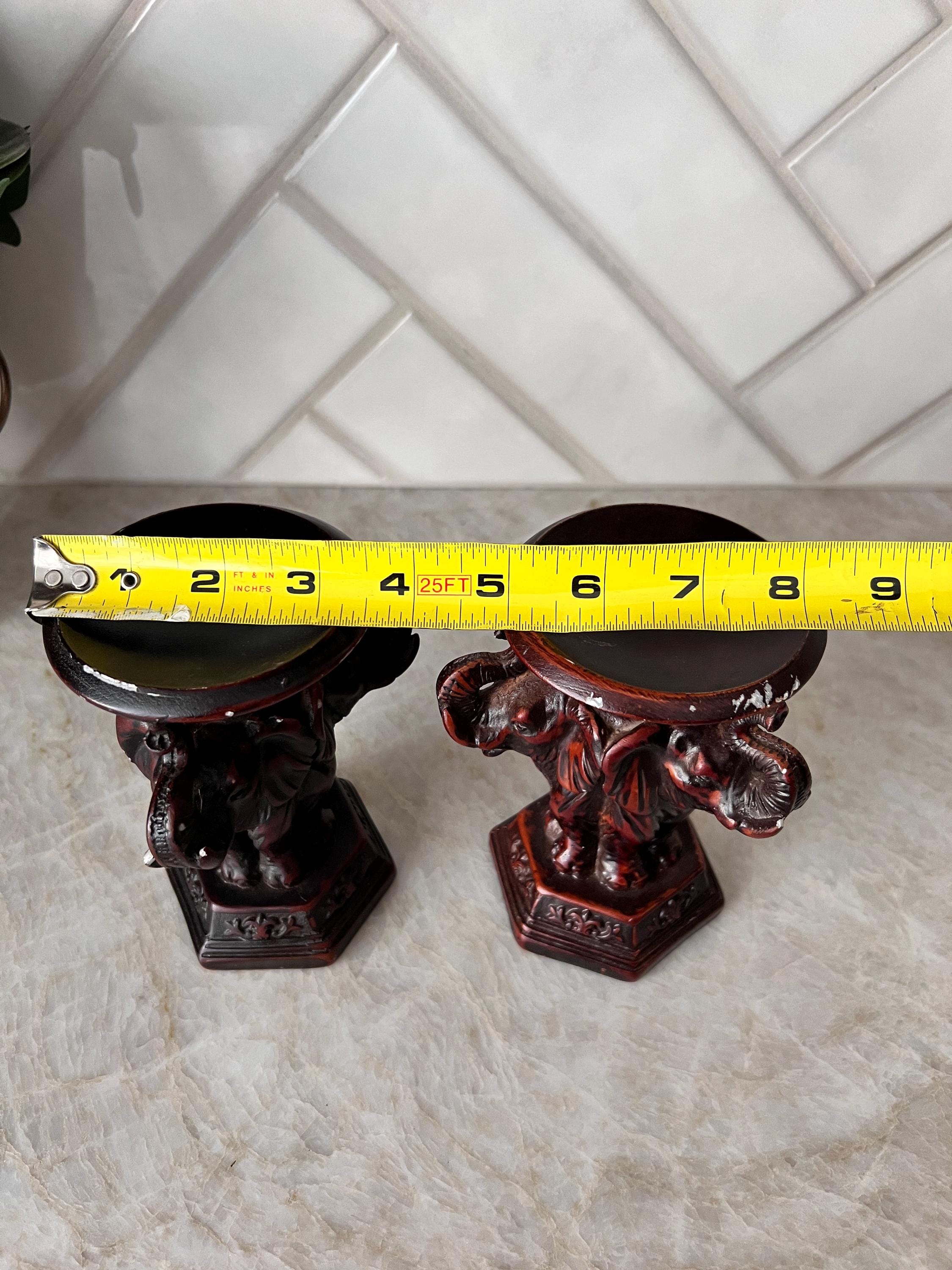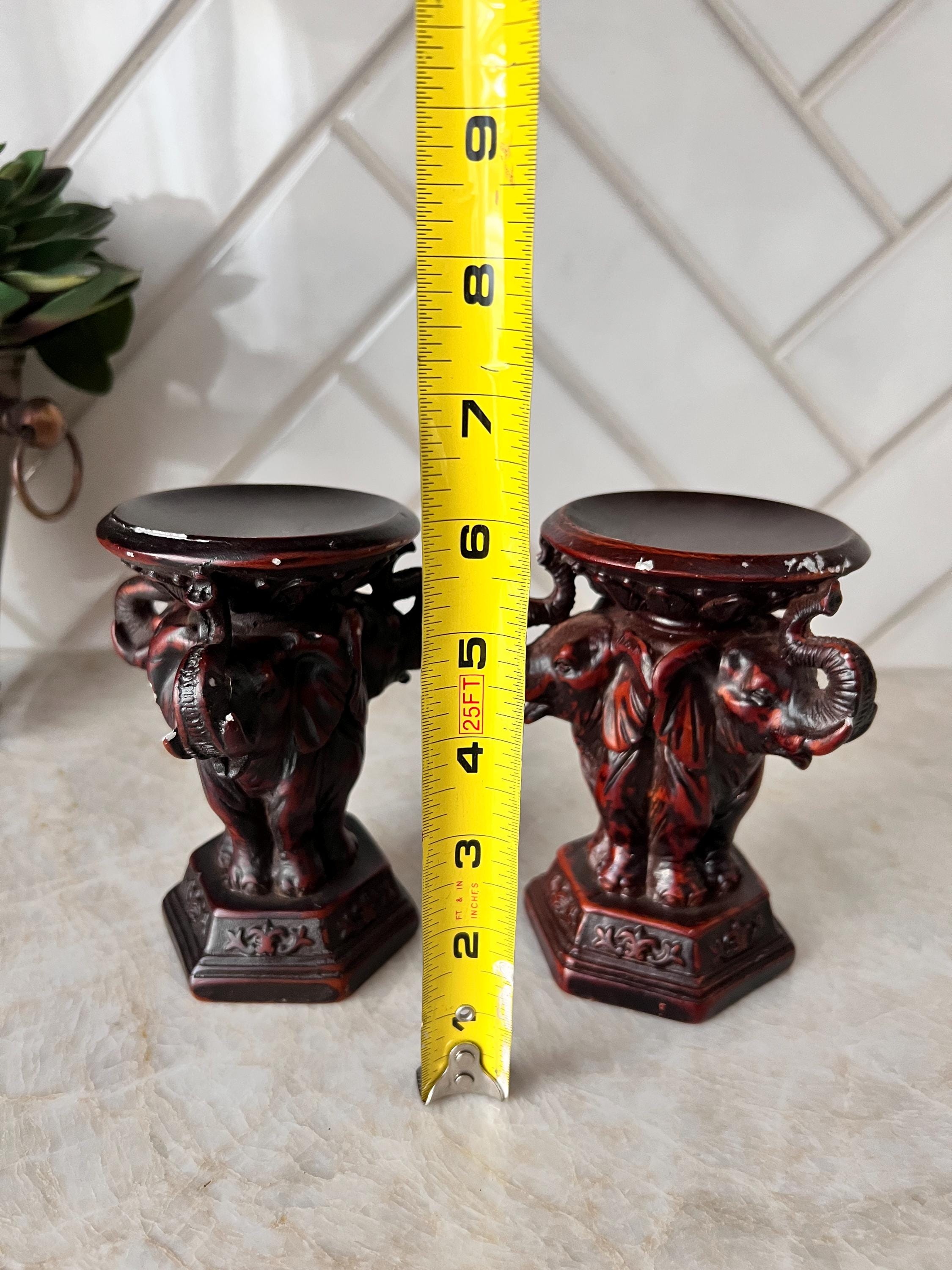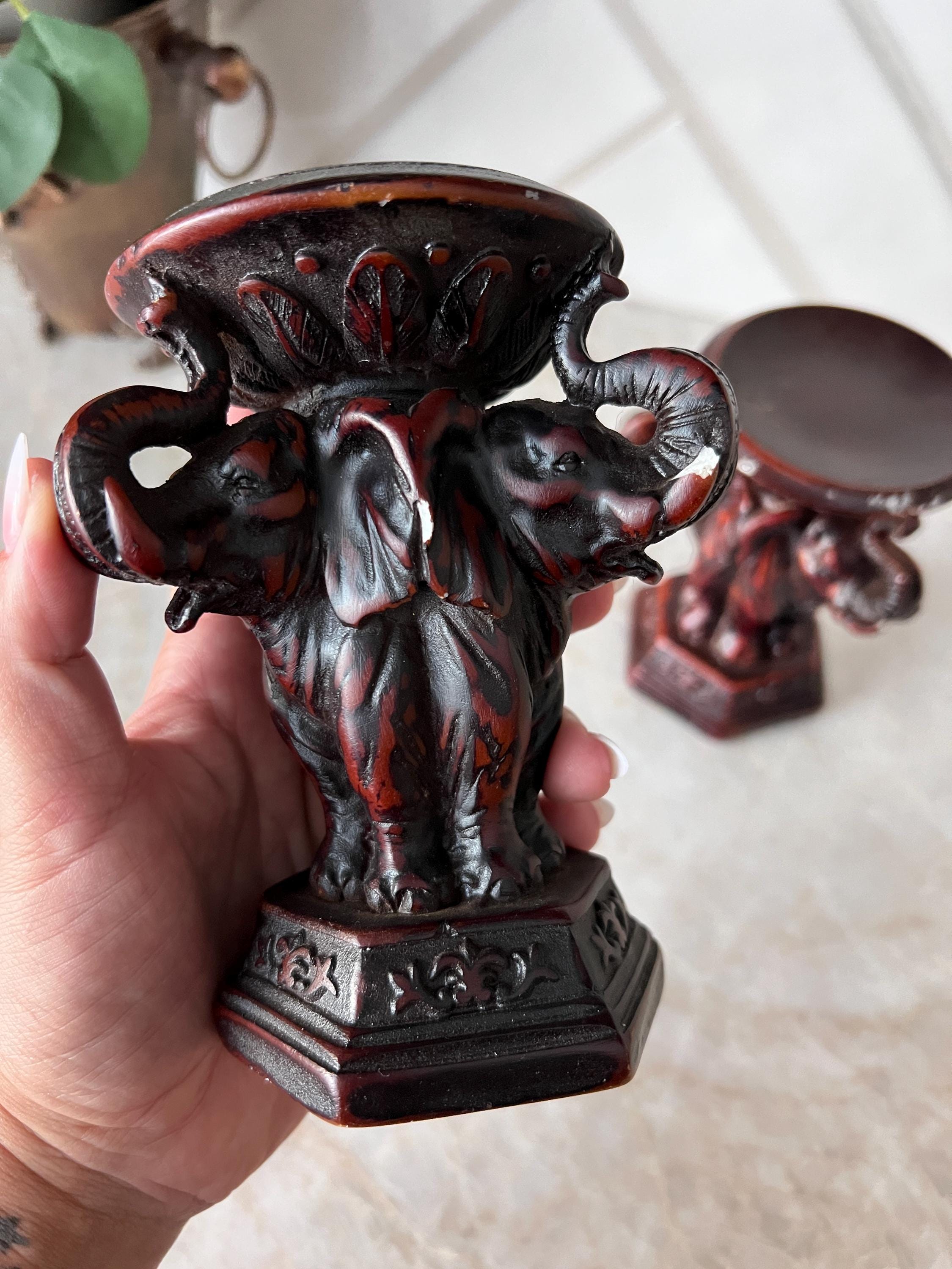 This striking pair of vintage elephant candle holders from The Bombay Company adds a bold, regal presence to any space. Crafted in a richly toned faux wood resin or composite material, these heavy and ornate candle stands feature three intricately sculpted elephants on each base, trunk up, symbolizing strength and good fortune. Their aged finish and carved floral details evoke a global, worldly aesthetic perfect for boho, safari, or eclectic decor.