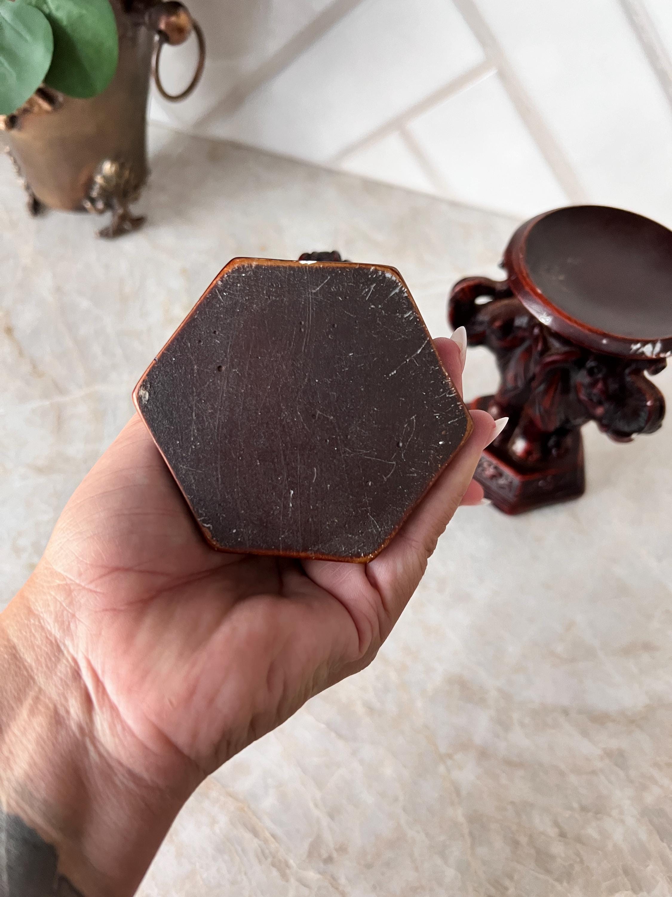 Due to their age and material, these pieces do show some minor chips and wear (see photos), which only add to their vintage charm. Their solid weight gives them a high-quality feel—perfect for a mantel, shelf, or statement table centerpiece.