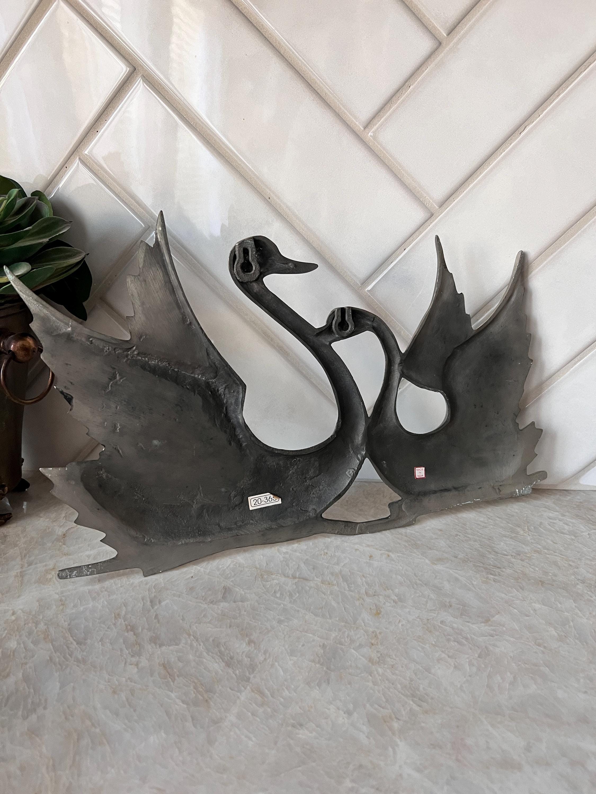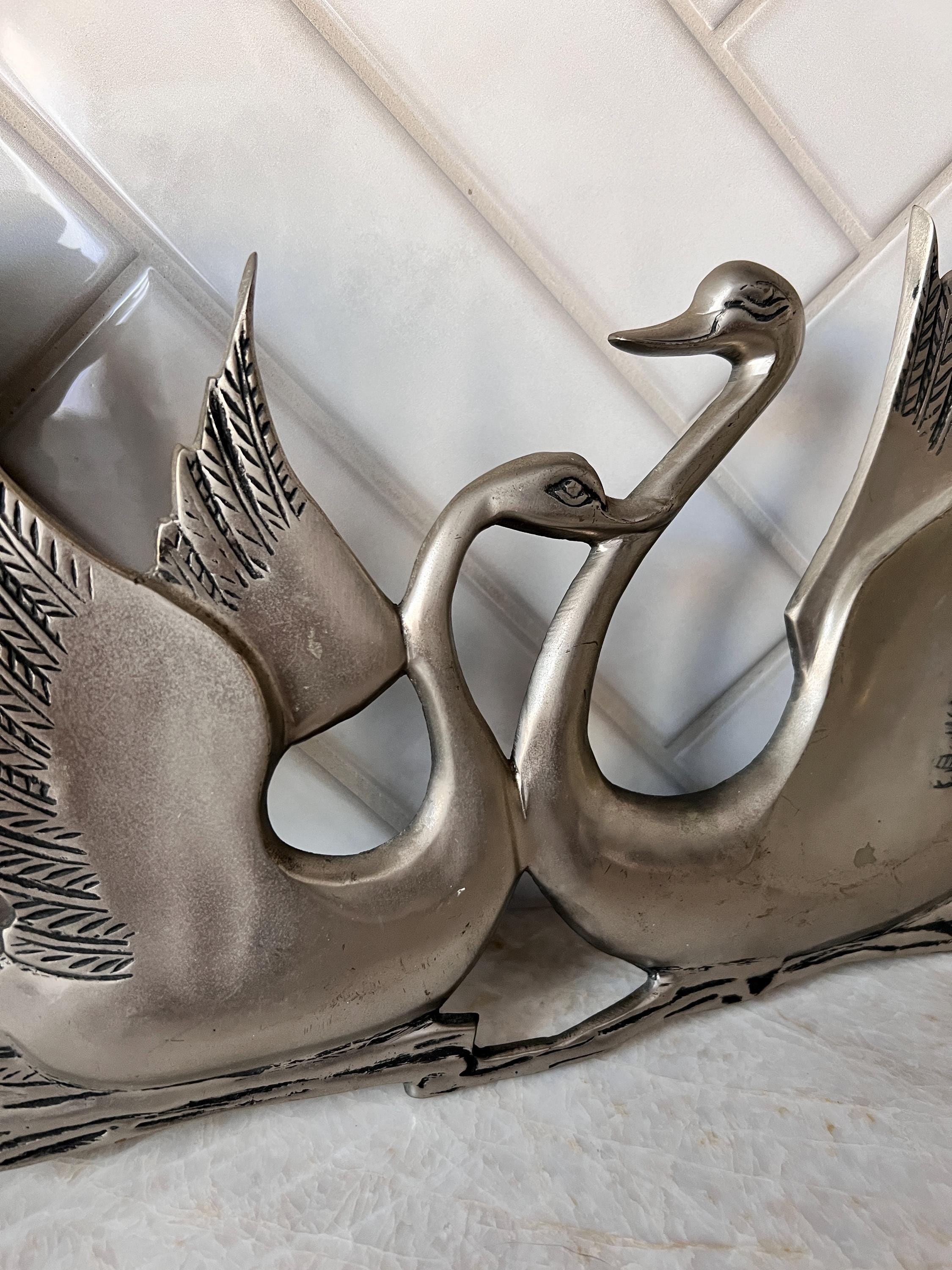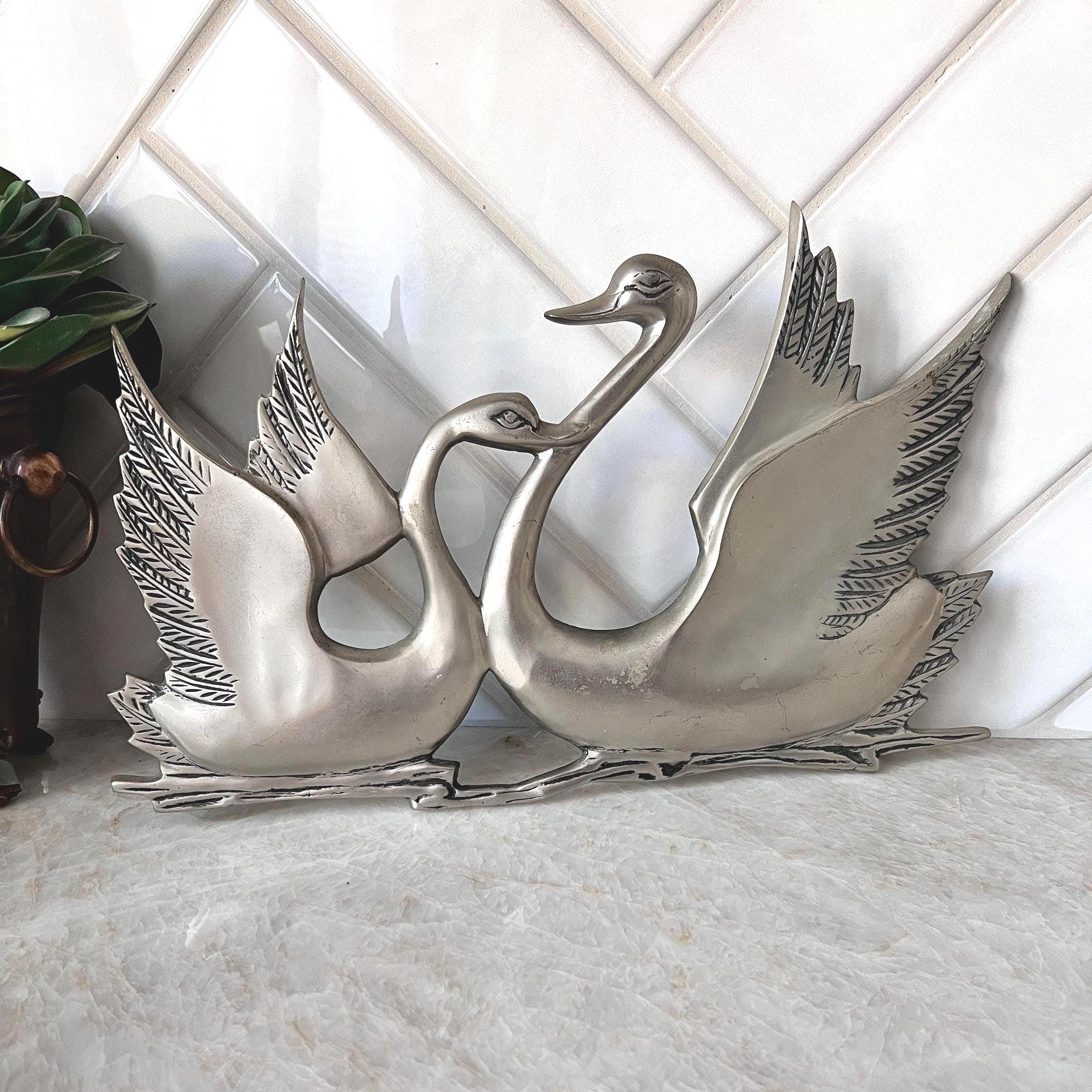 Add a touch of elegant romance to your space with this vintage brass swan wall hanging featuring two beautifully stylized swans with raised wings and intricate detailing. The graceful lines and brushed brass finish give it an Art Deco or Hollywood Regency flair, perfect for gallery walls, entryways, or vintage-inspired interiors.