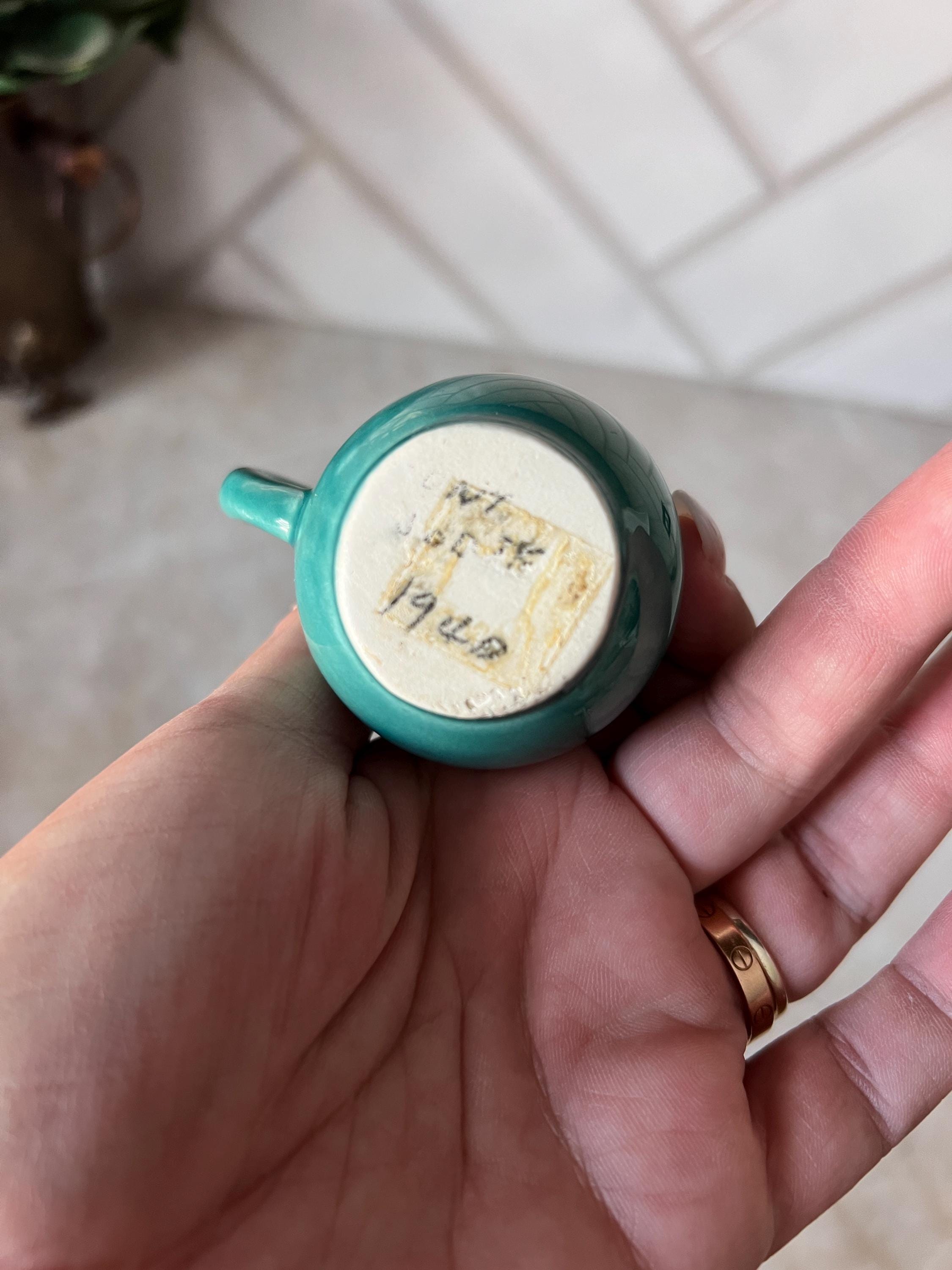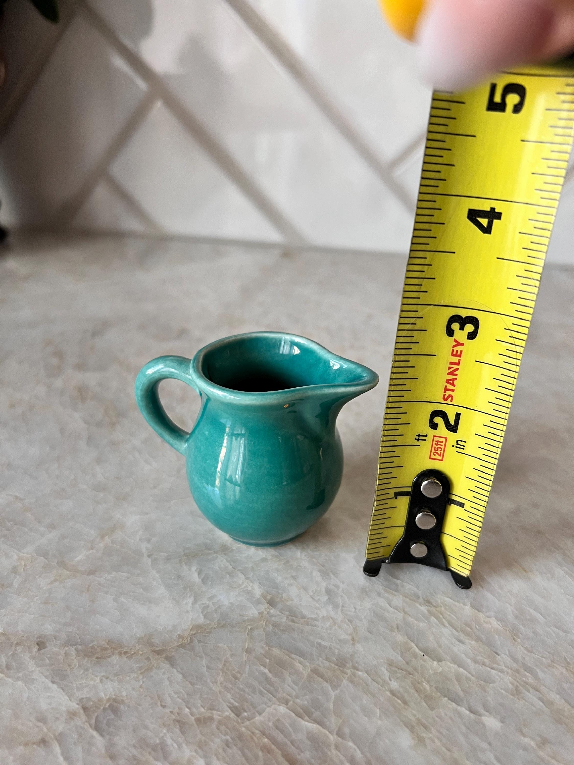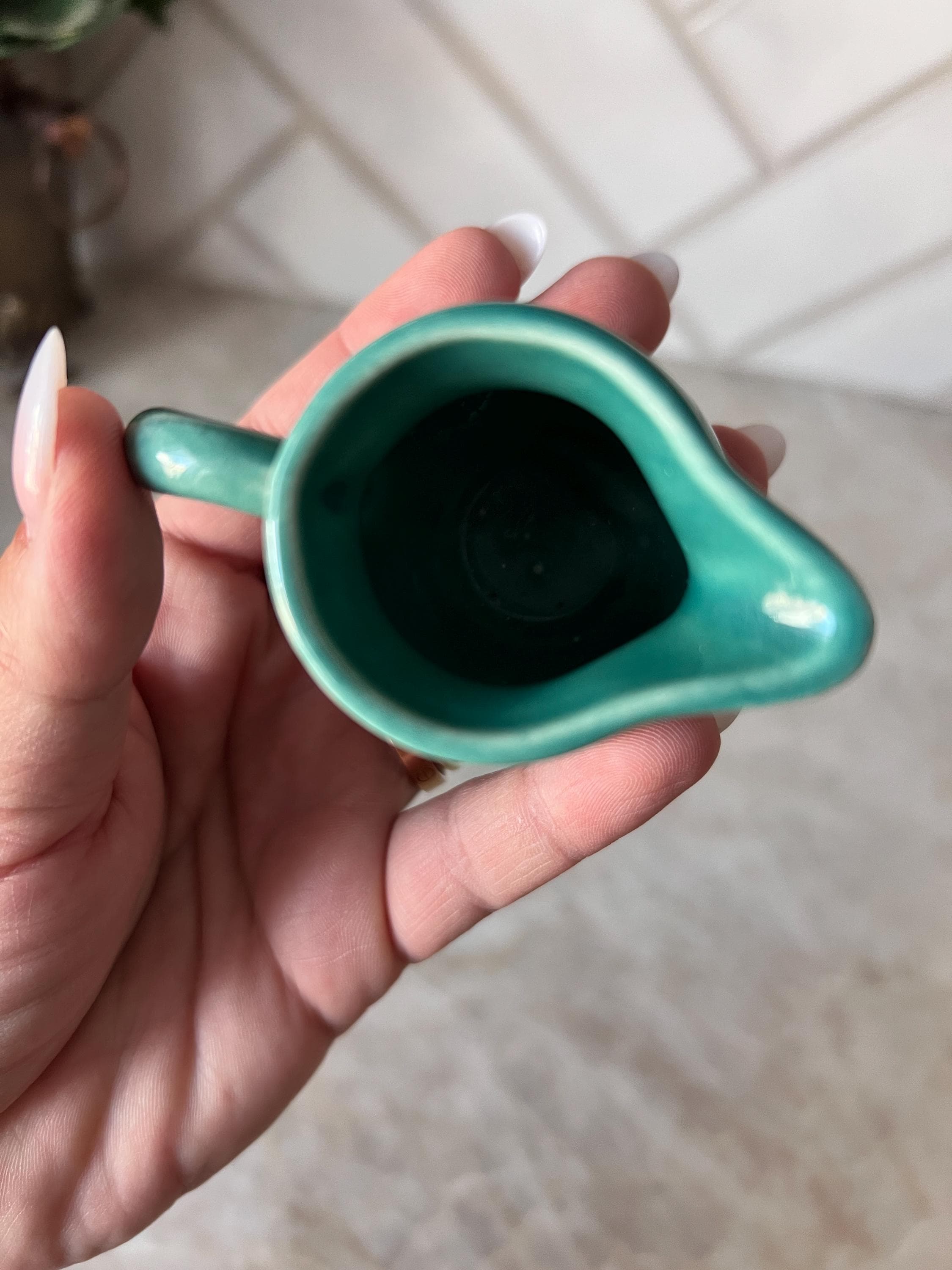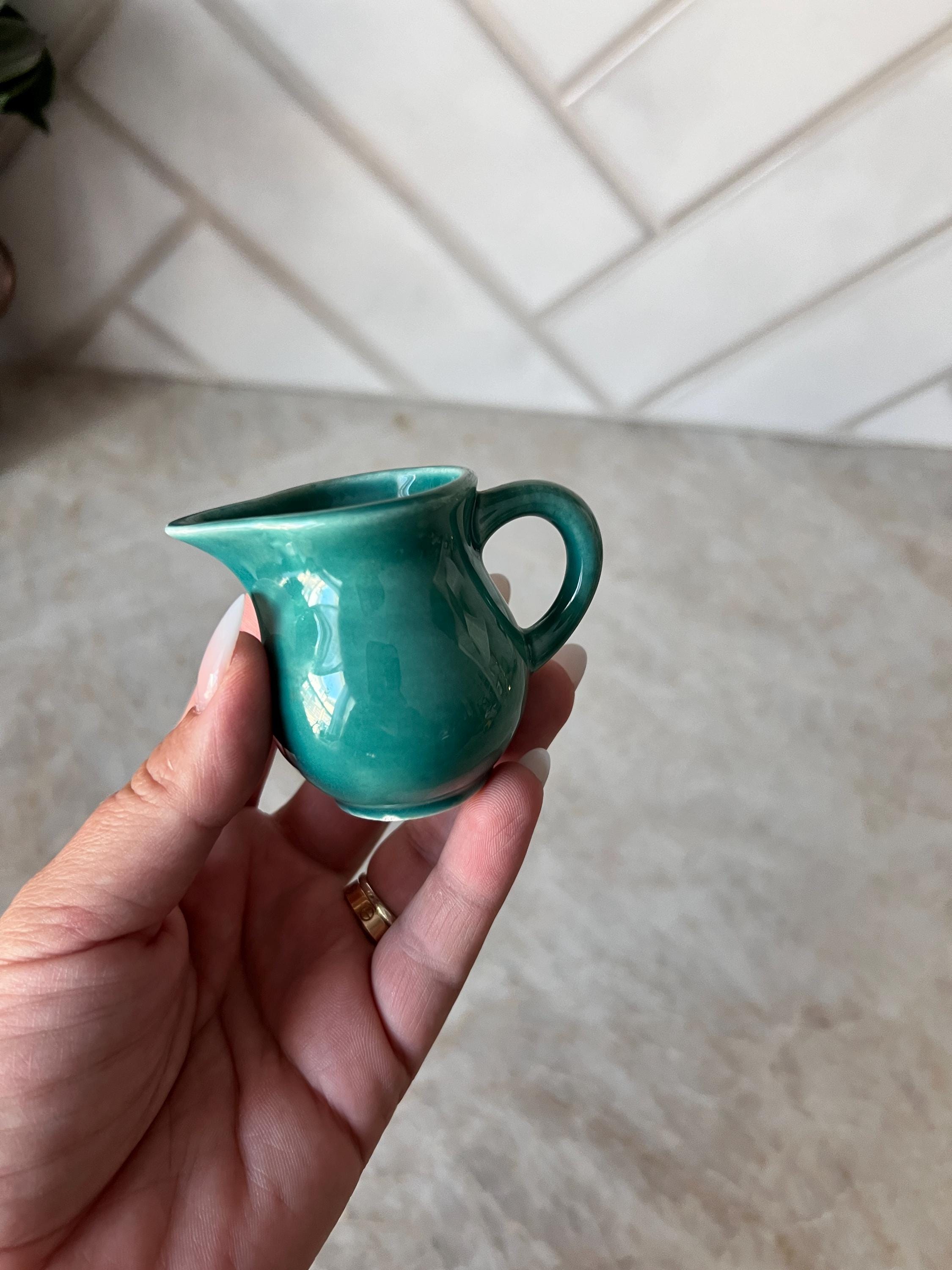 Whether you're an avid collector of mini ceramics, staging a photo shoot, or simply styling your kitchen with meaningful vintage finds, this small green pitcher is the perfect accent piece.