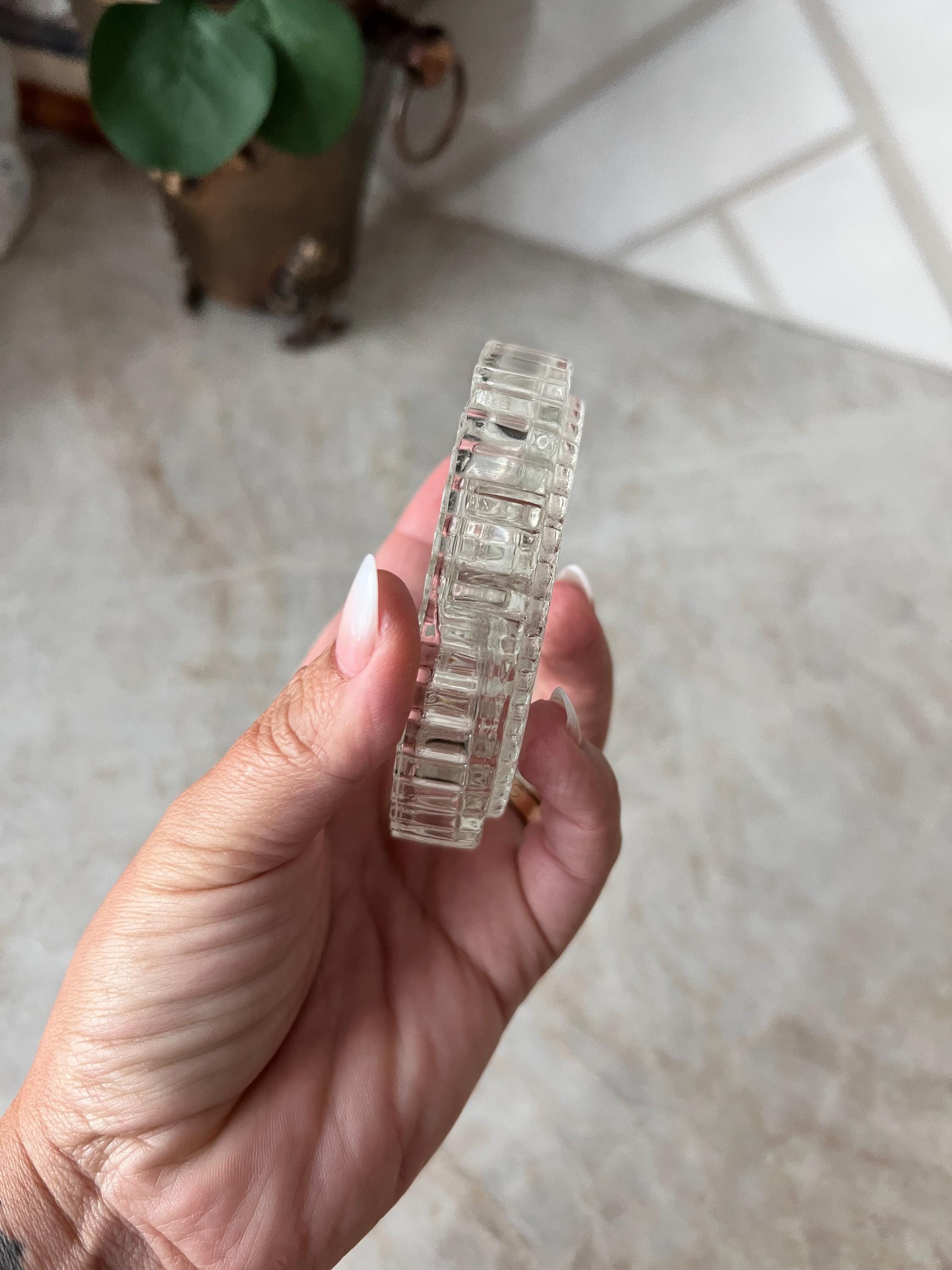This beautiful vintage ashtray by L.G. Wright Glass Co. features the iconic Daisy & Button pressed glass pattern and integrated snuffer rests—a unique piece of early American pattern glass from the 1930s. The clear glass sparkles in the light, and the detailed cut-style edges add an elegant touch.