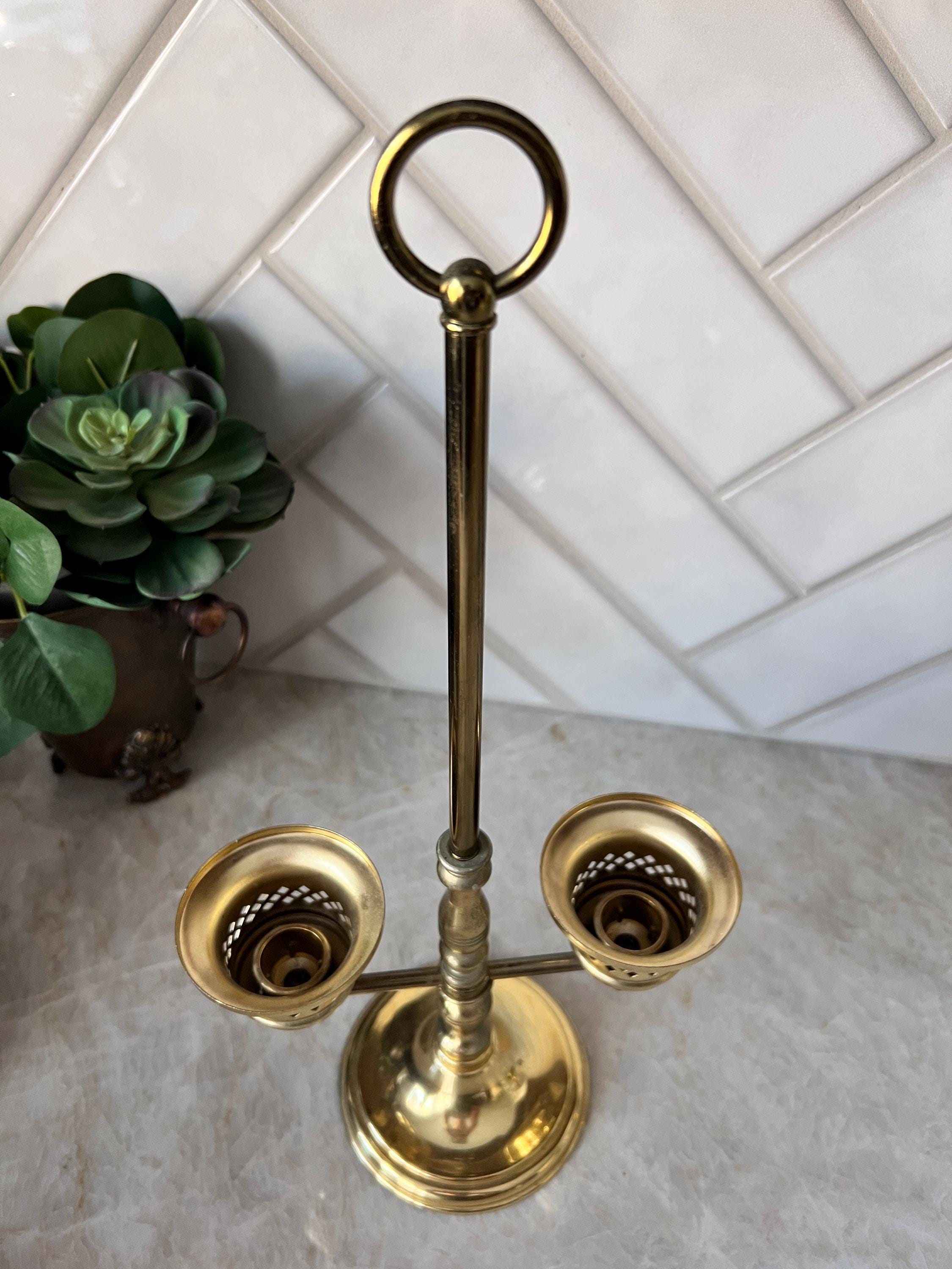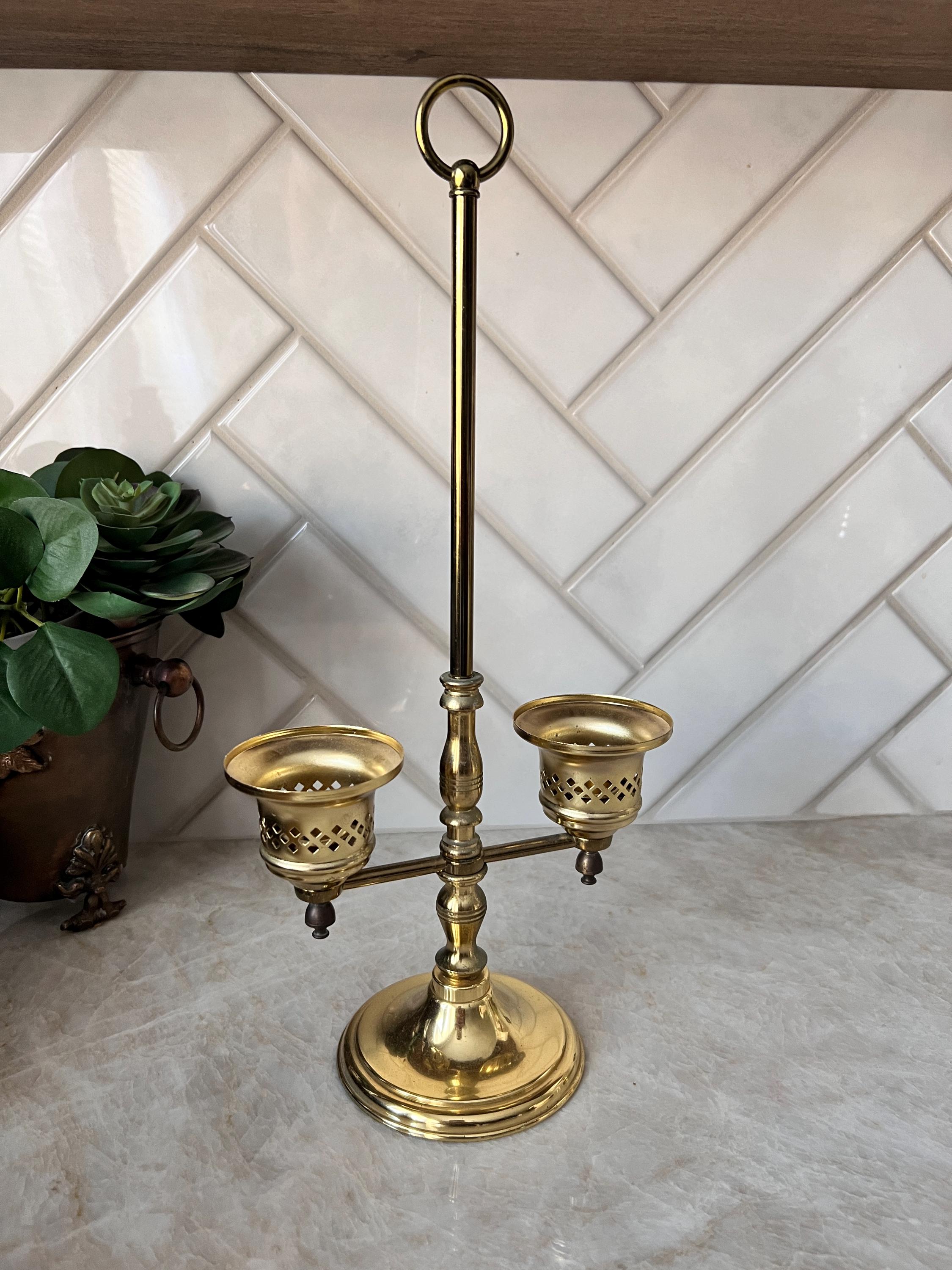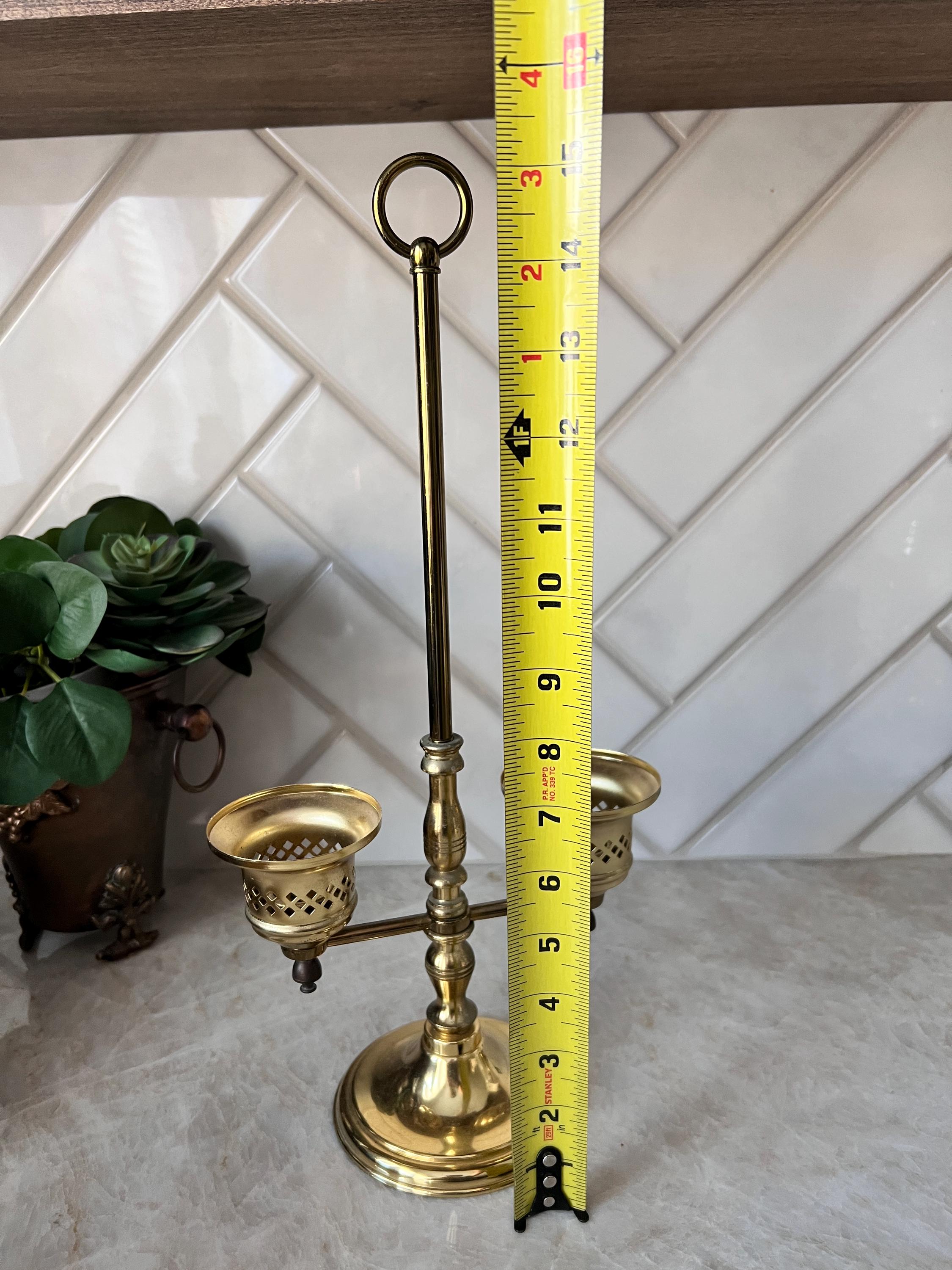 Add a touch of timeless charm to your home with this vintage Princess House double candelabra. Crafted in gleaming brass with a central ringed handle and twin taper candle holders, this piece exudes vintage elegance. Whether you’re styling a romantic dinner, adding ambiance to your mantel, or curating a maximalist gallery shelf, this candelabra delivers a perfect mix of function and Hollywood Regency flair.