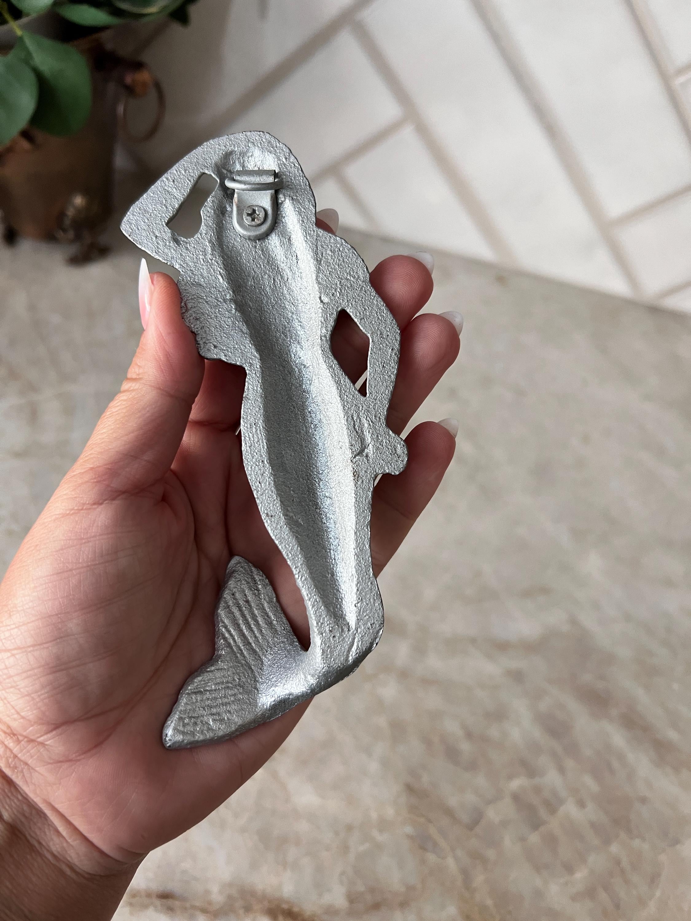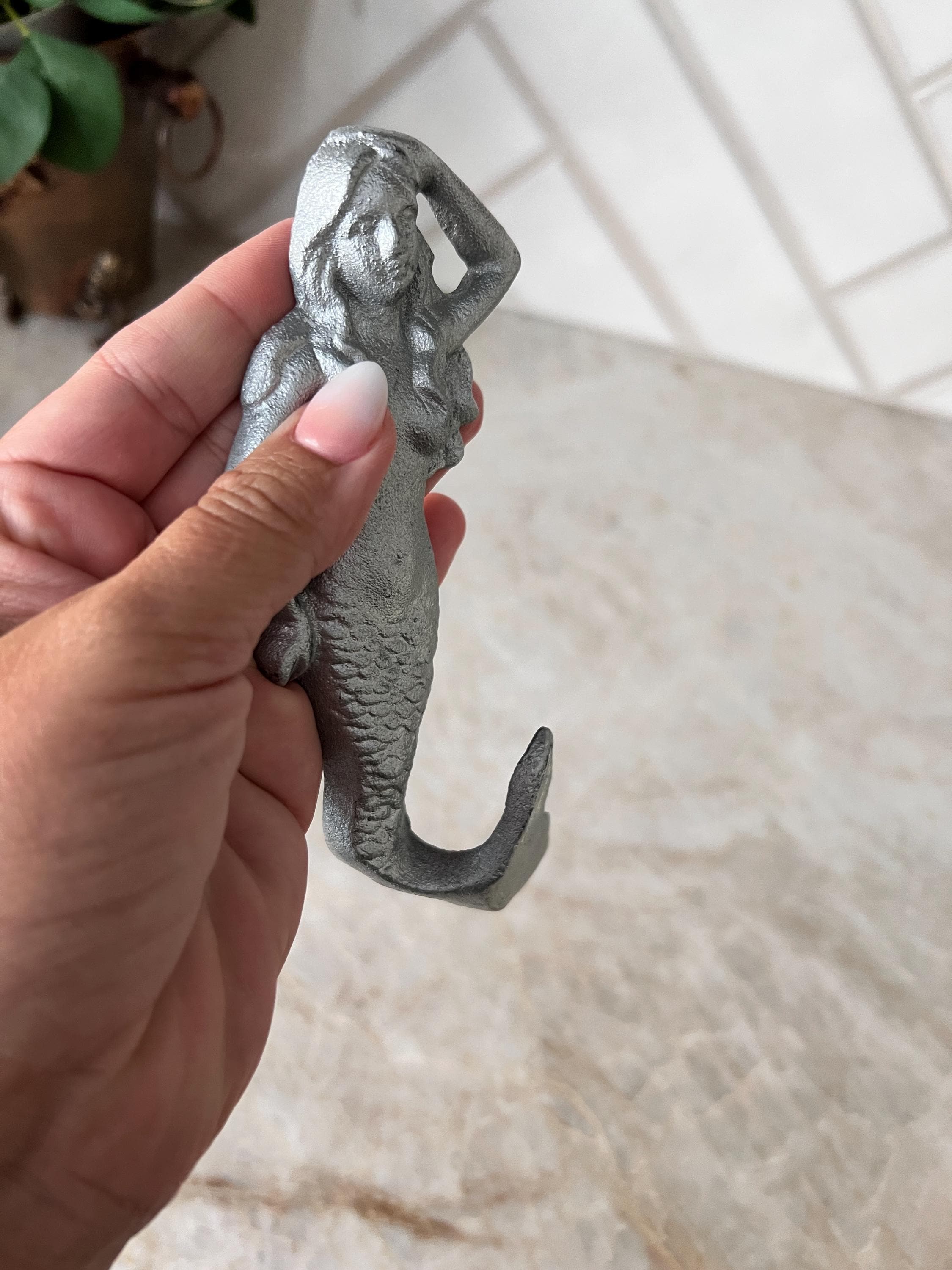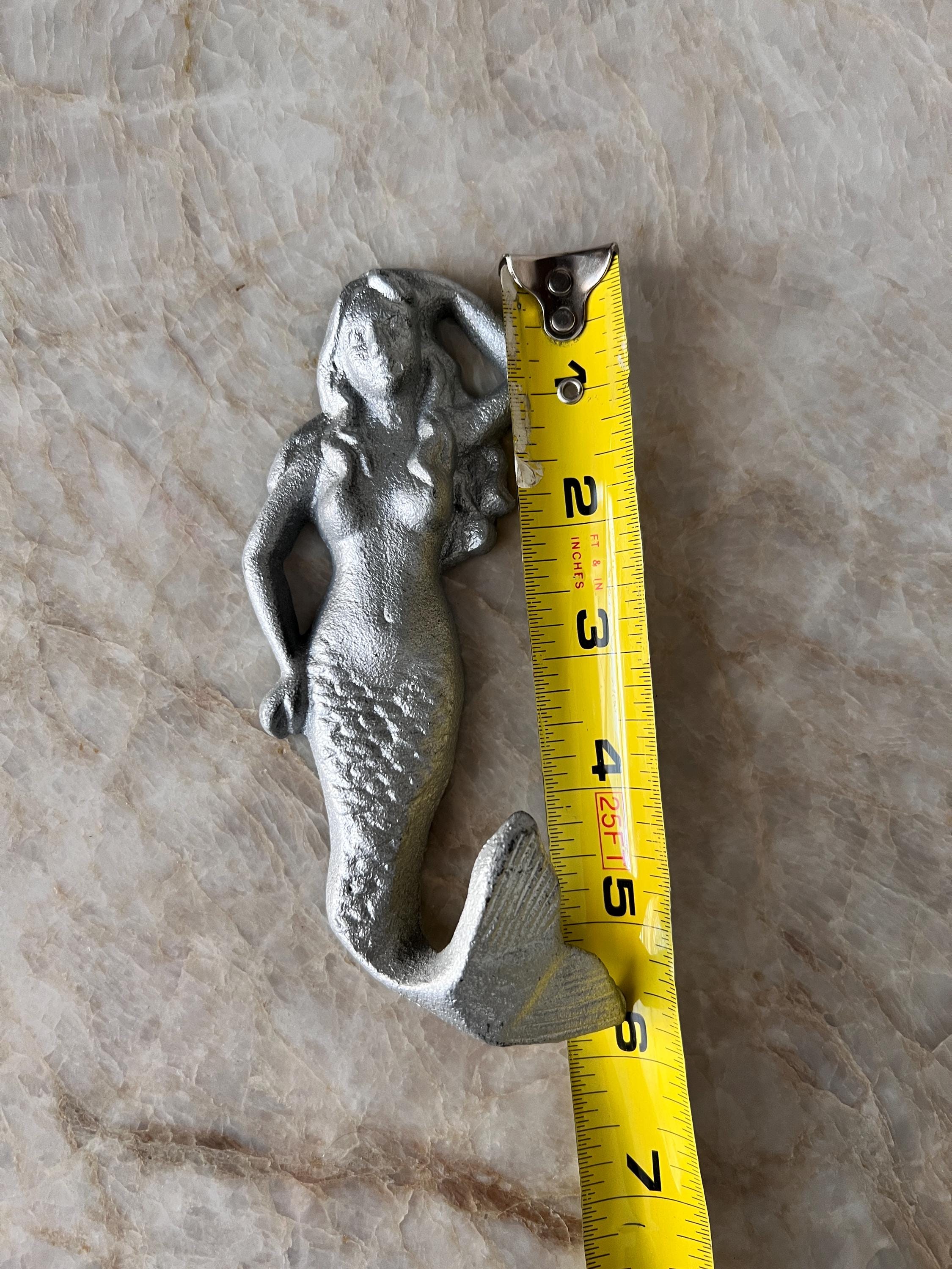 Add a splash of ocean charm to your space with this silver cast iron mermaid hook. Perfect for coastal, nautical, or beach house themes, this sturdy and whimsical wall hook features a graceful mermaid with flowing hair and a curled tail that doubles as a hook. Whether you hang it in a bathroom for towels, in an entryway for keys, or in a beachy kitchen for aprons, this sea siren is ready to lend a hand—or a tail.