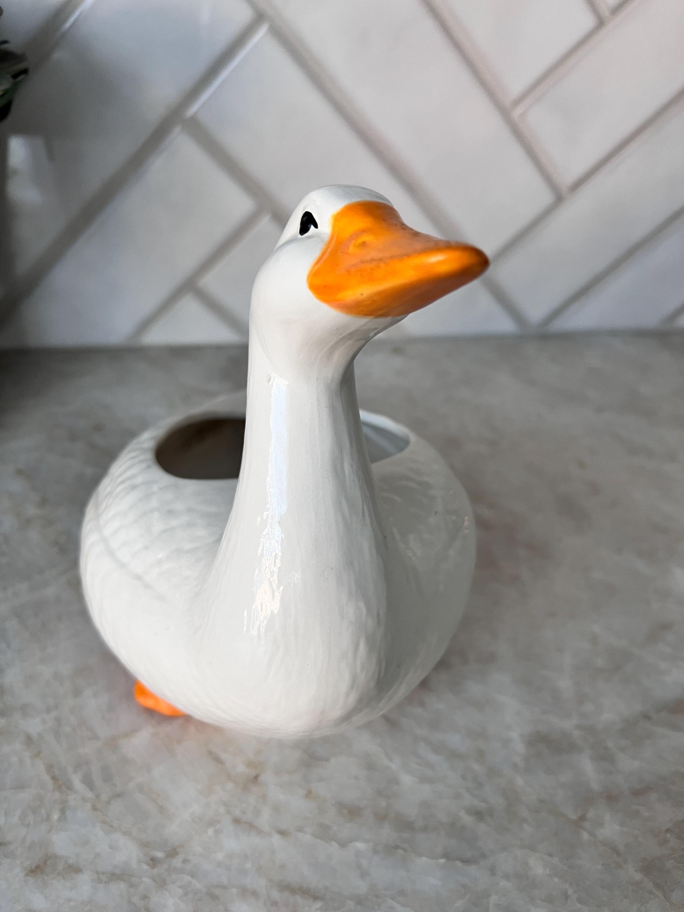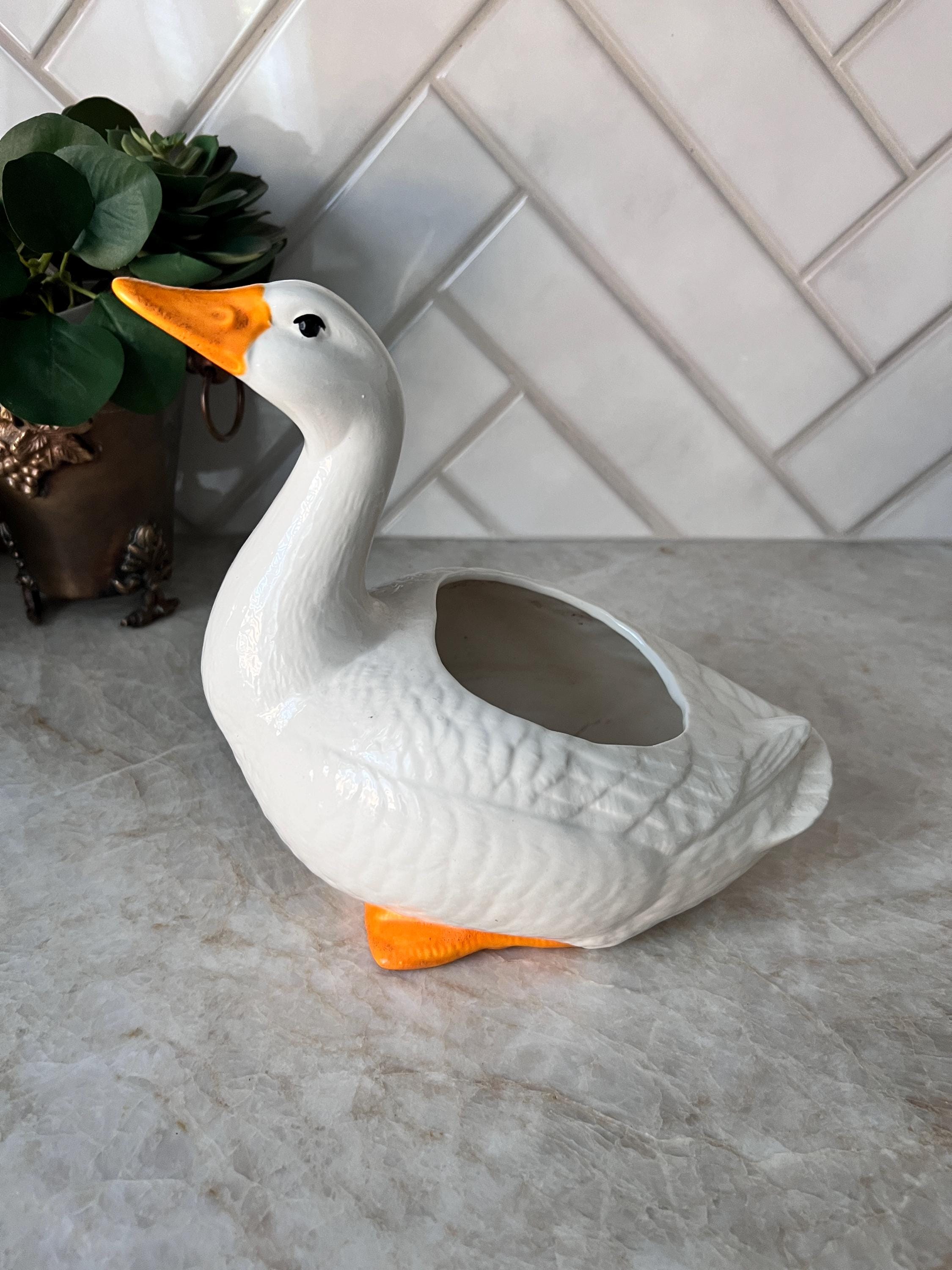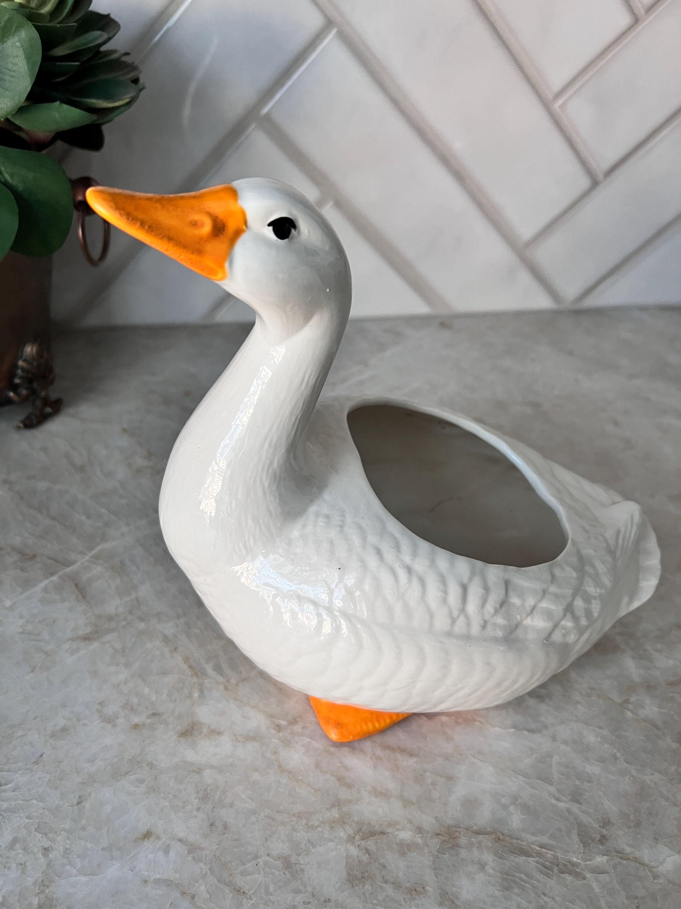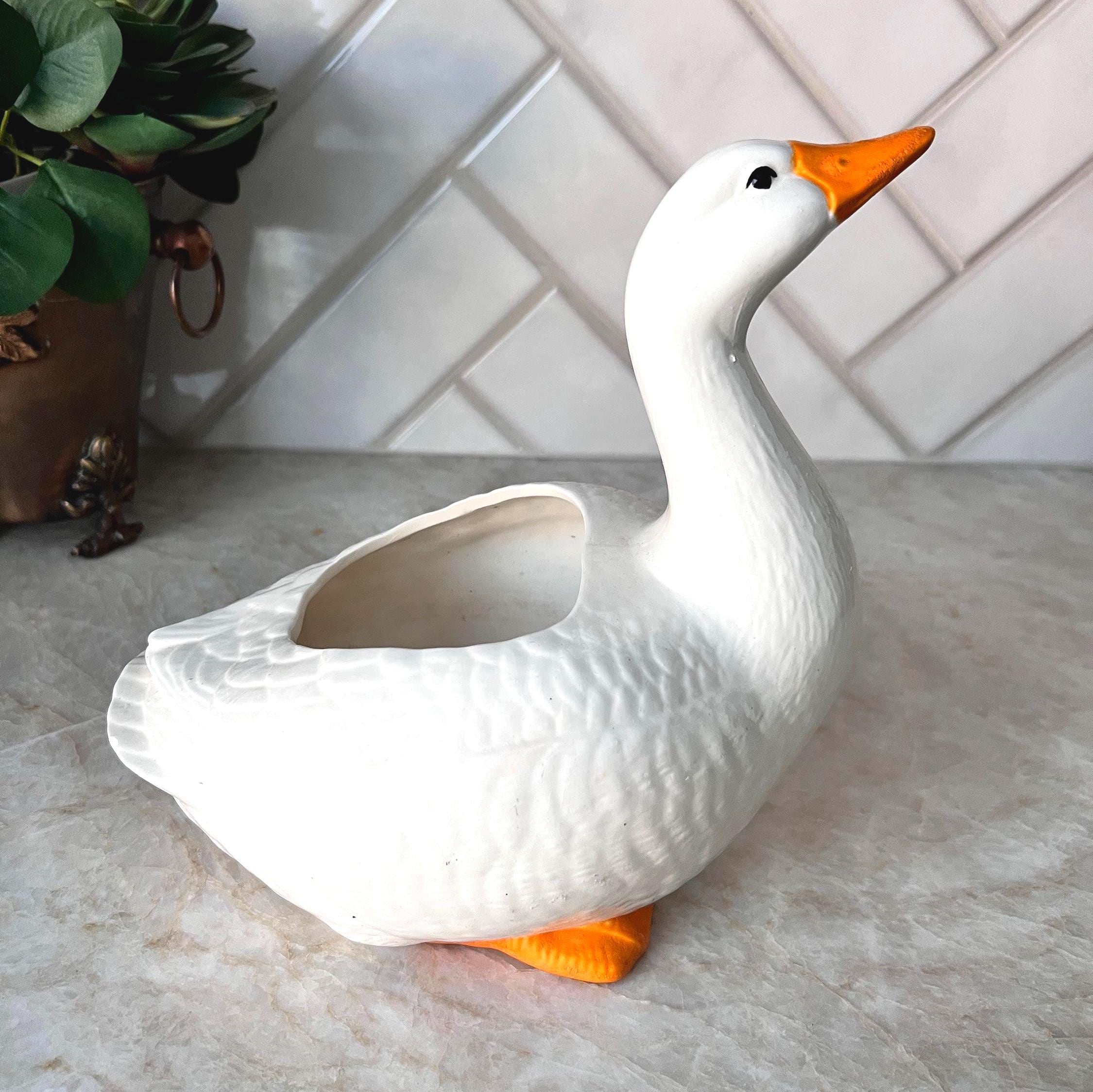Add a touch of charming country whimsy to your home with this vintage ceramic goose planter. Featuring glossy white glaze, sculpted feather detailing, and a cheerful orange beak and feet, this planter is perfect for a small houseplant, kitchen herbs, or even styled as a kitschy catch-all for utensils or office supplies.
