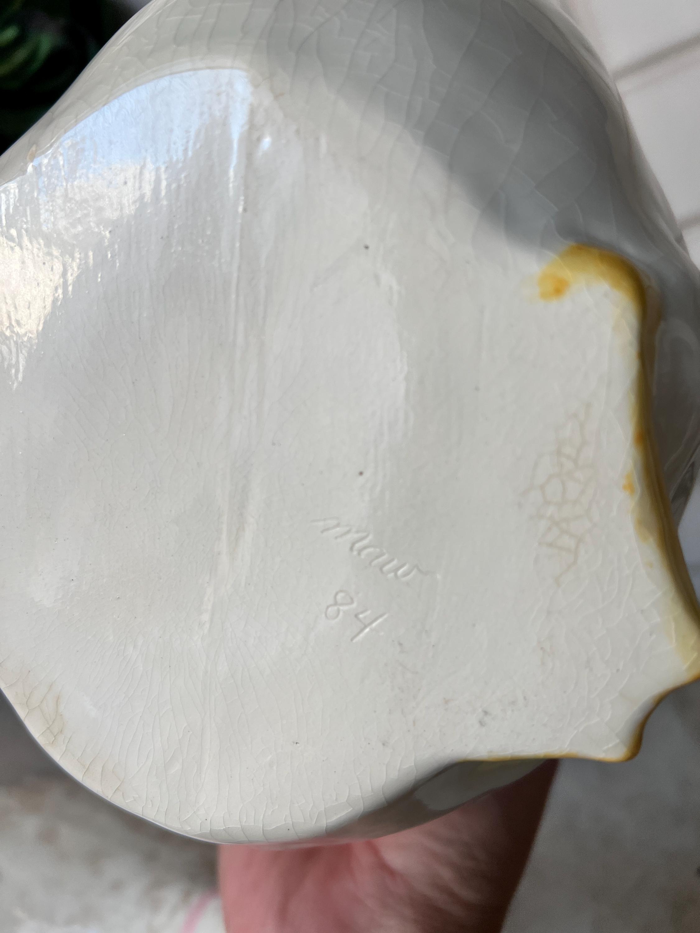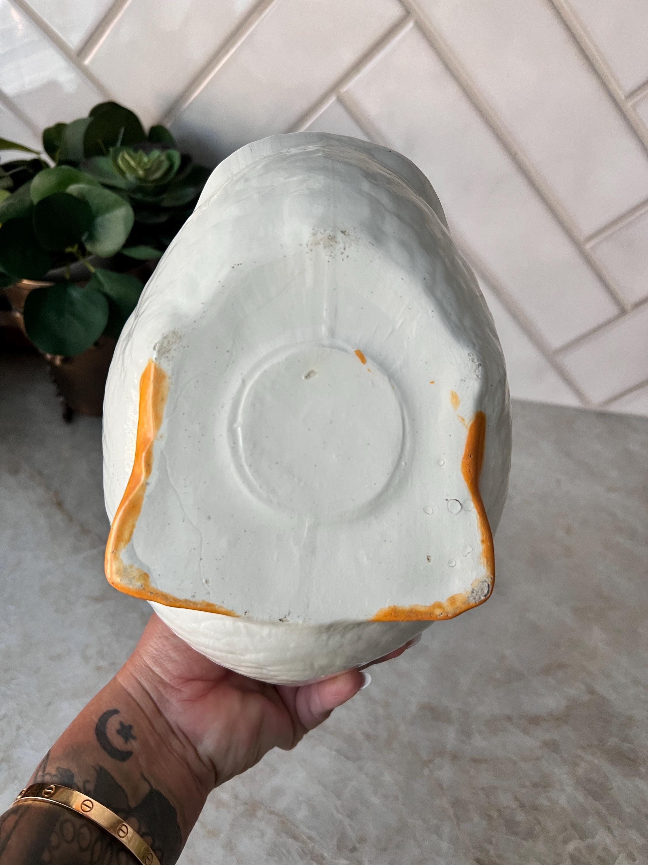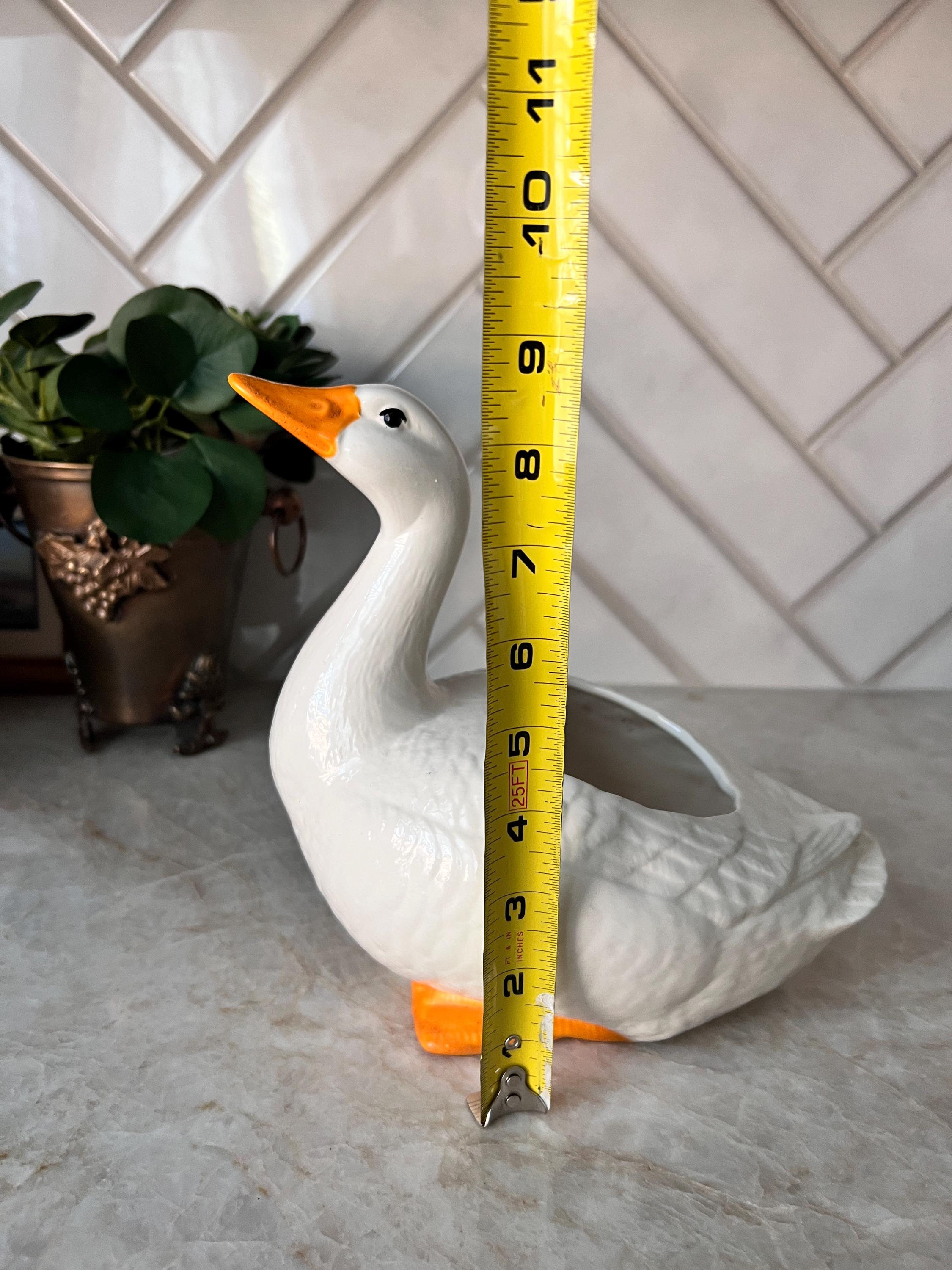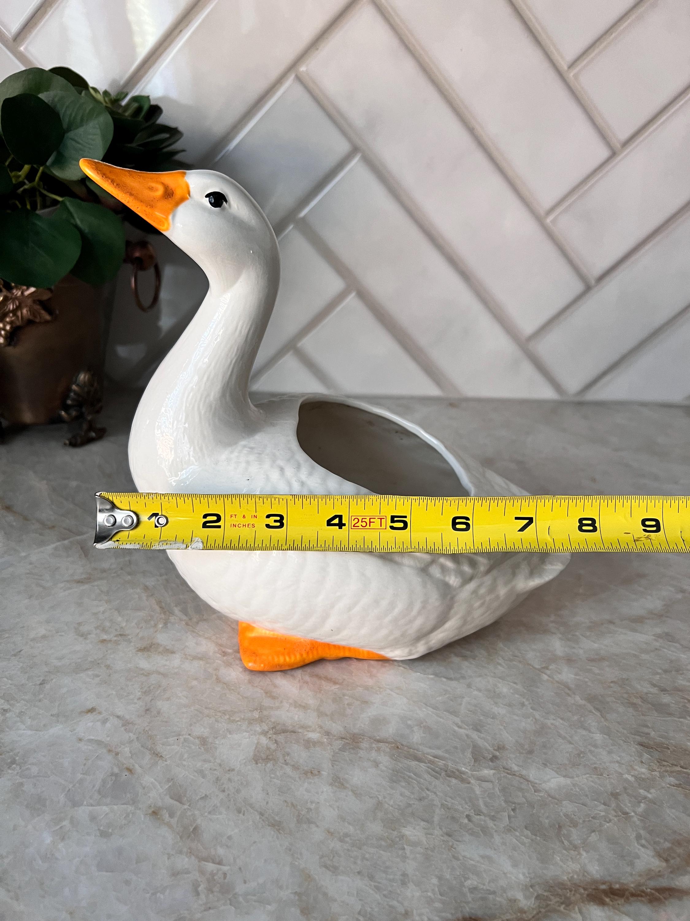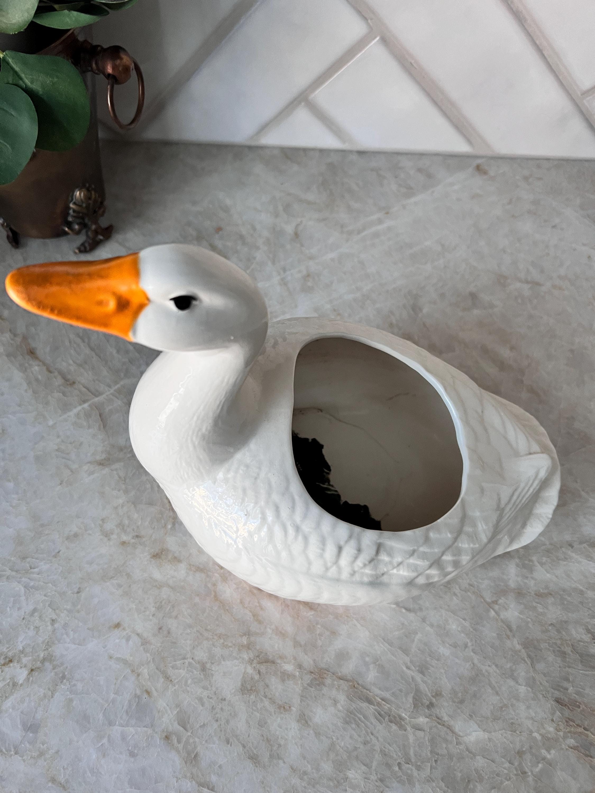 Add a touch of charming country whimsy to your home with this vintage ceramic goose planter. Featuring glossy white glaze, sculpted feather detailing, and a cheerful orange beak and feet, this planter is perfect for a small houseplant, kitchen herbs, or even styled as a kitschy catch-all for utensils or office supplies.
