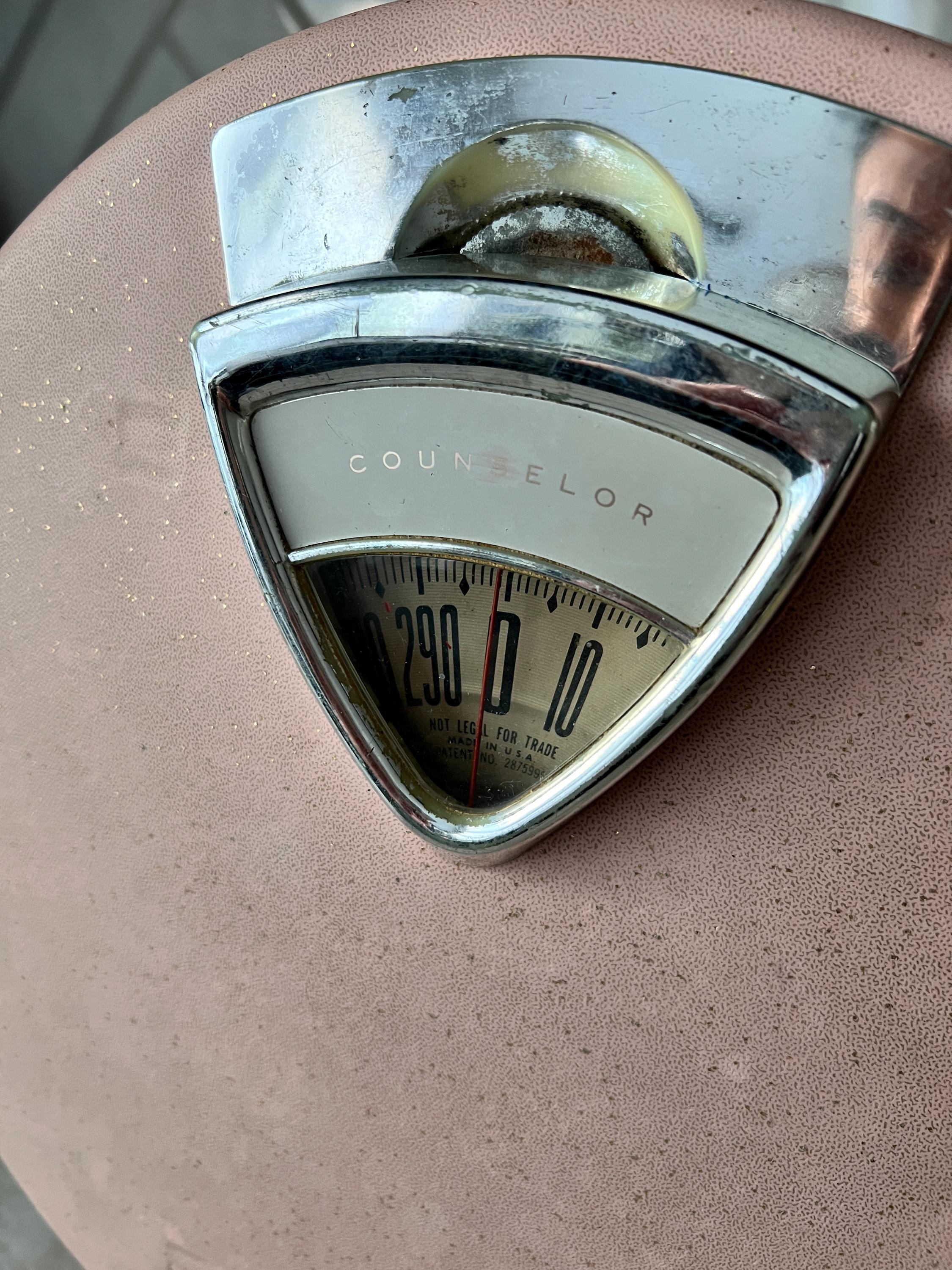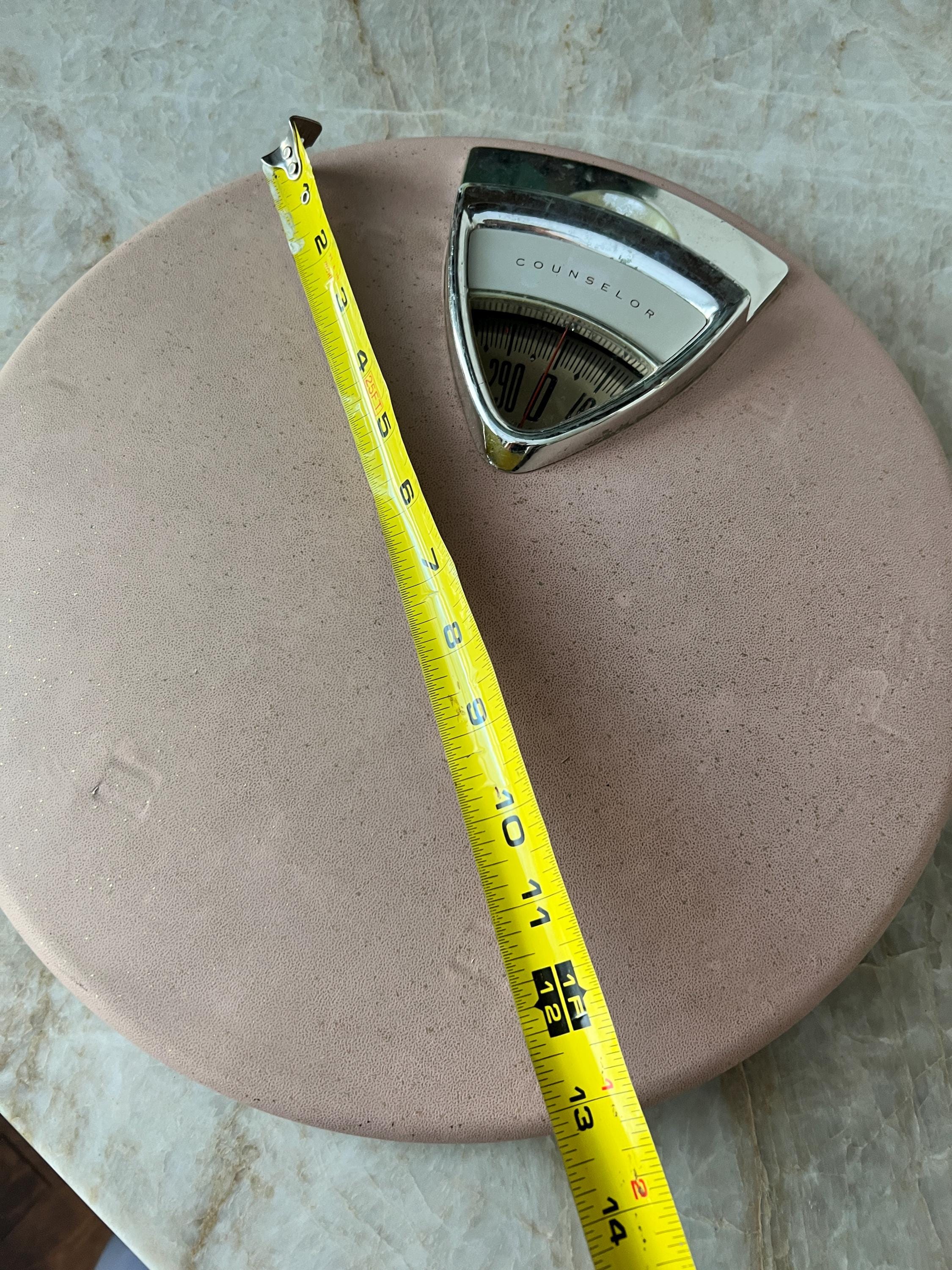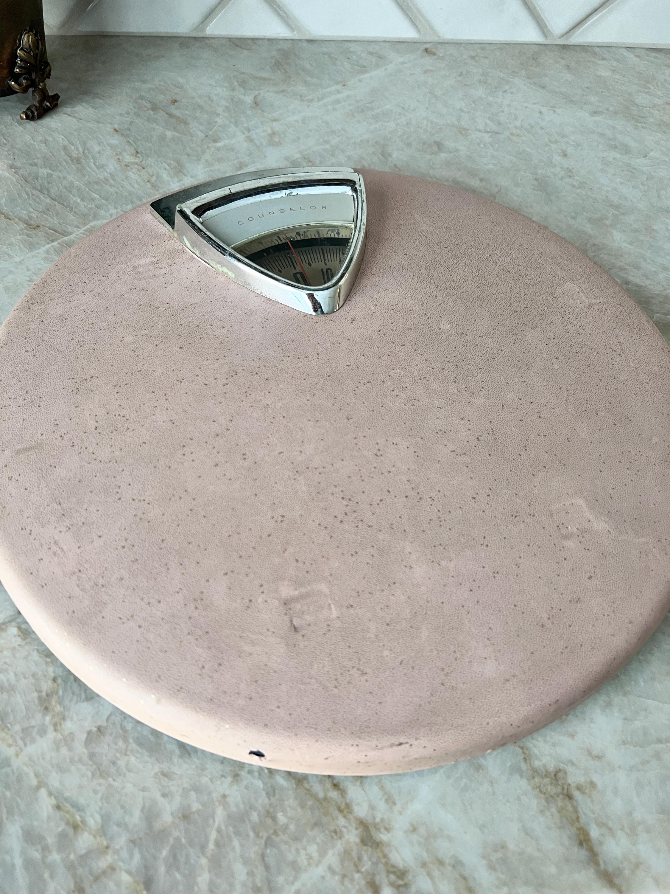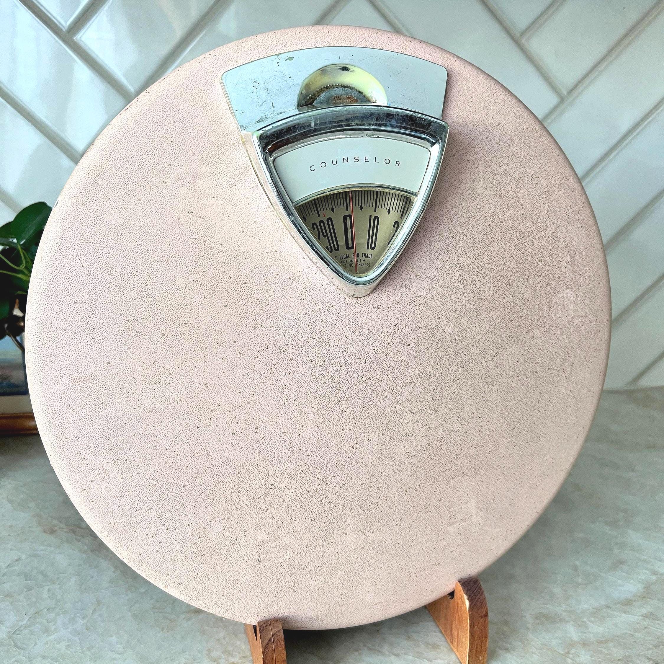 Step back in time with this fabulous vintage mid-century bathroom scale! Featuring a rare round pink body with subtle gold speckles, this Counselor brand scale screams atomic-era charm. The sleek chrome-trimmed dial and space-age design make it a stunning accent for your retro bathroom or vintage vanity setup.