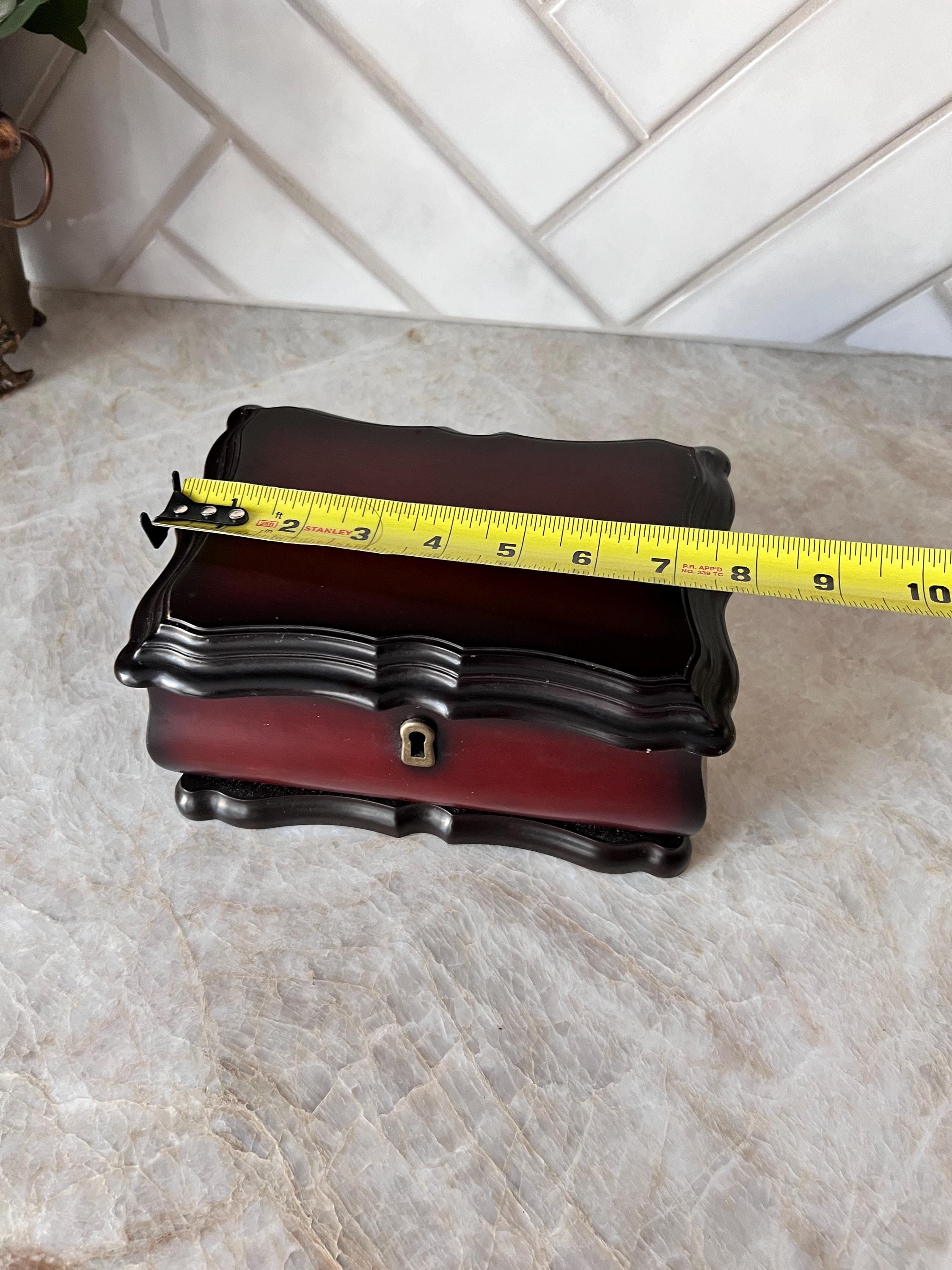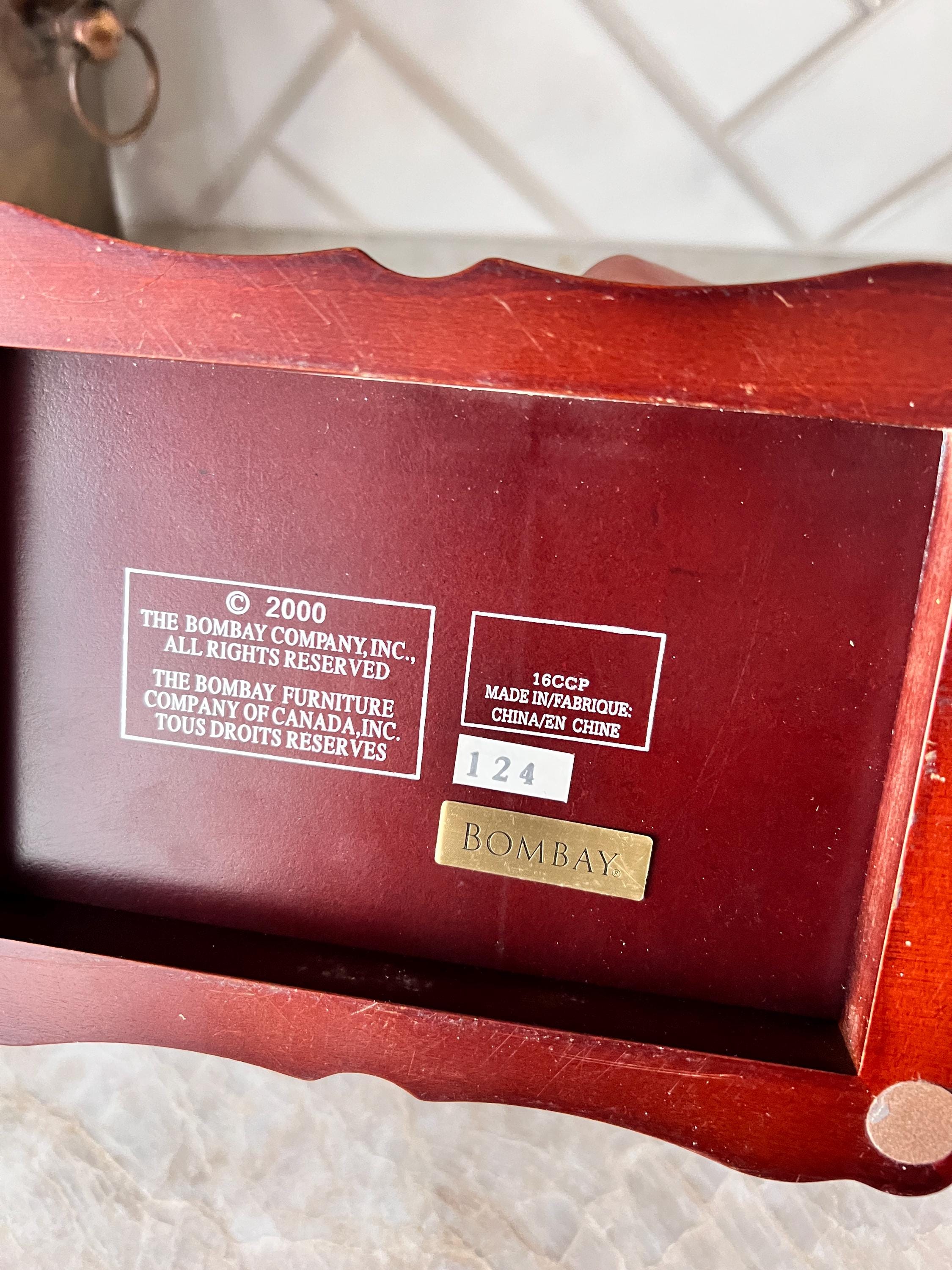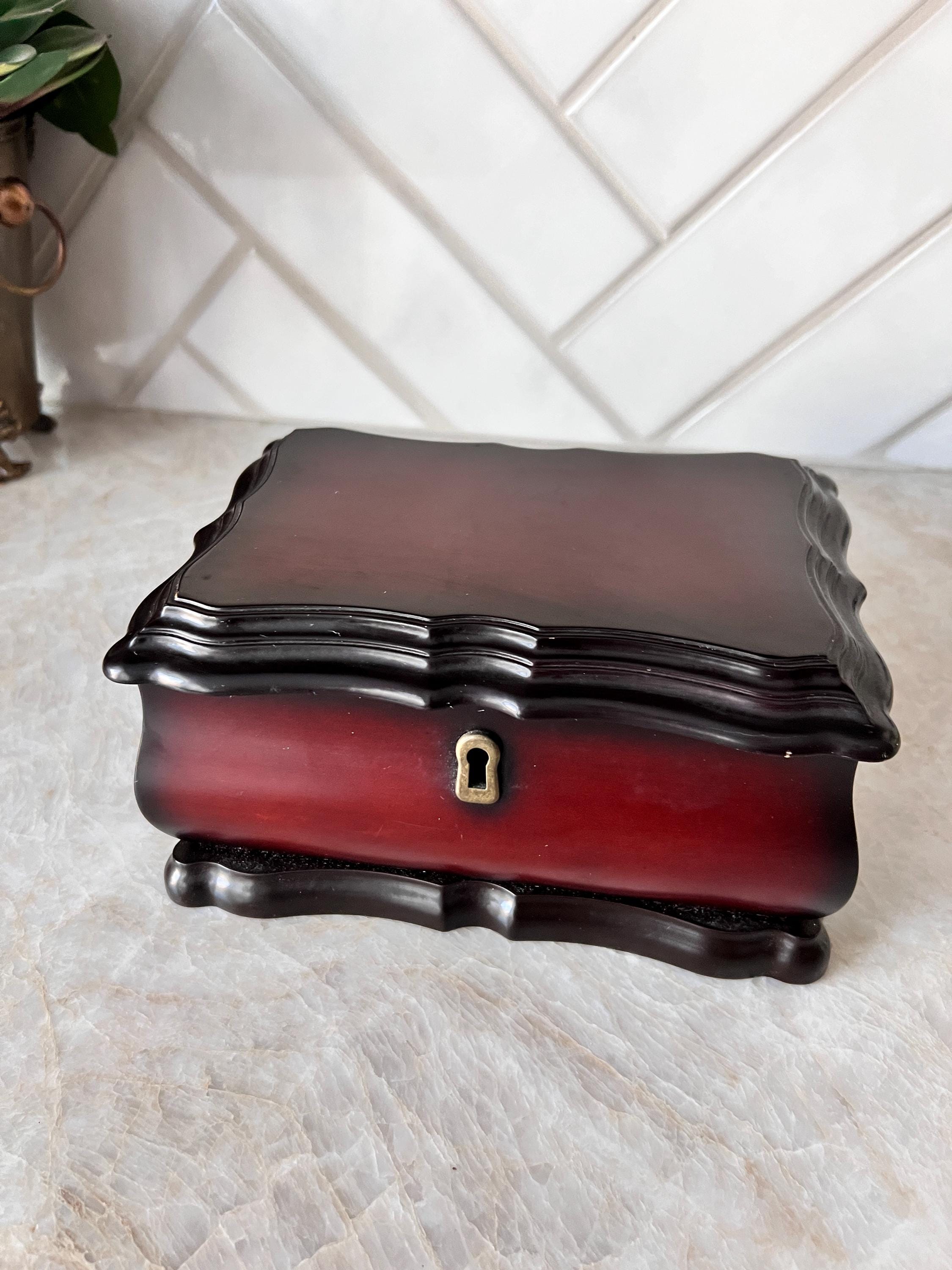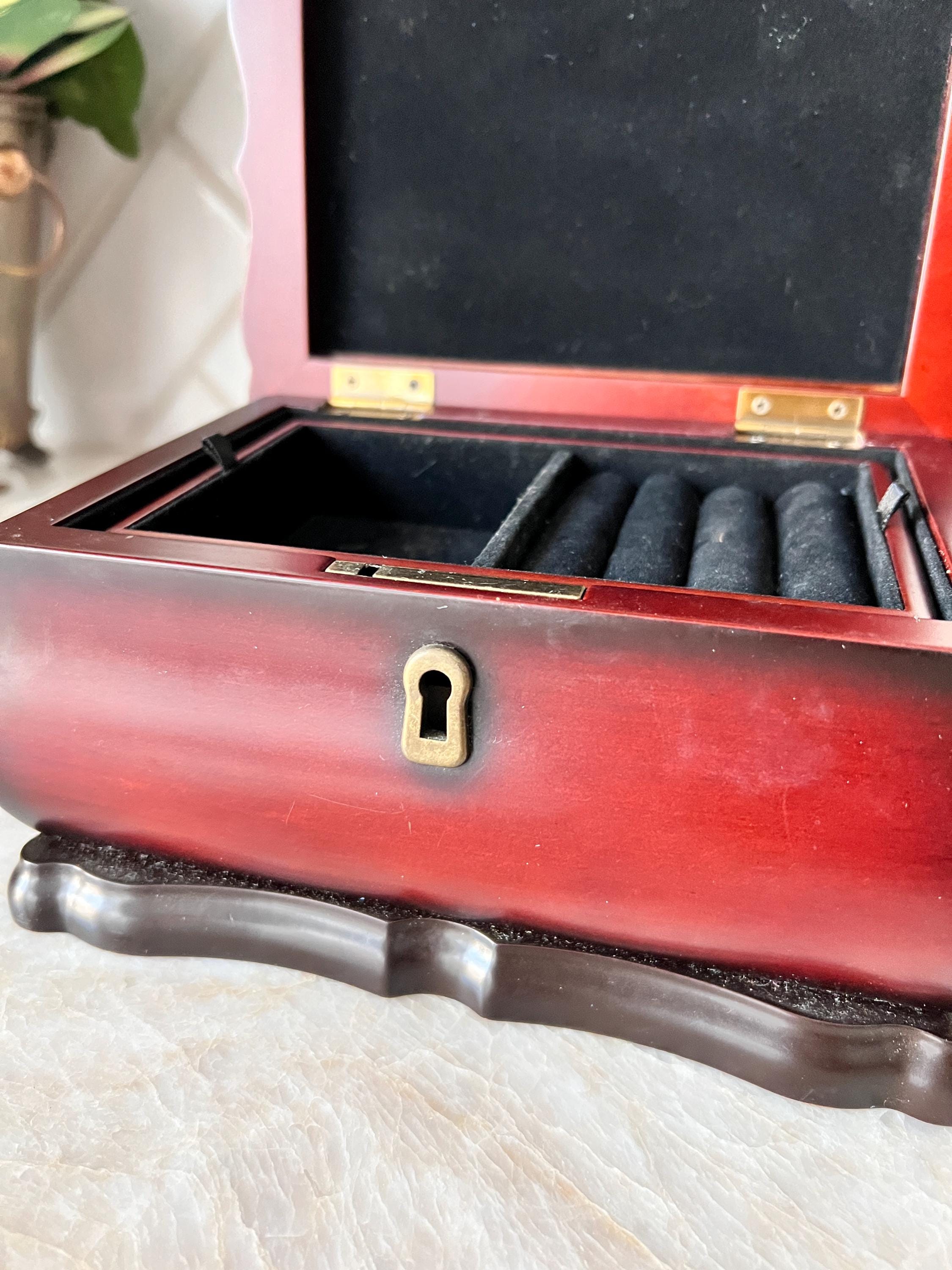 Add timeless elegance to your vanity or dresser with this vintage Bombay Company mahogany jewelry box. Crafted in a rich reddish-brown wood stain with curved Rococo-style edges, this charming box is perfect for storing rings, earrings, necklaces, or keepsakes. The elegant shape and brass-tone keyhole detail offer a sophisticated touch, making it as decorative as it is functional.
