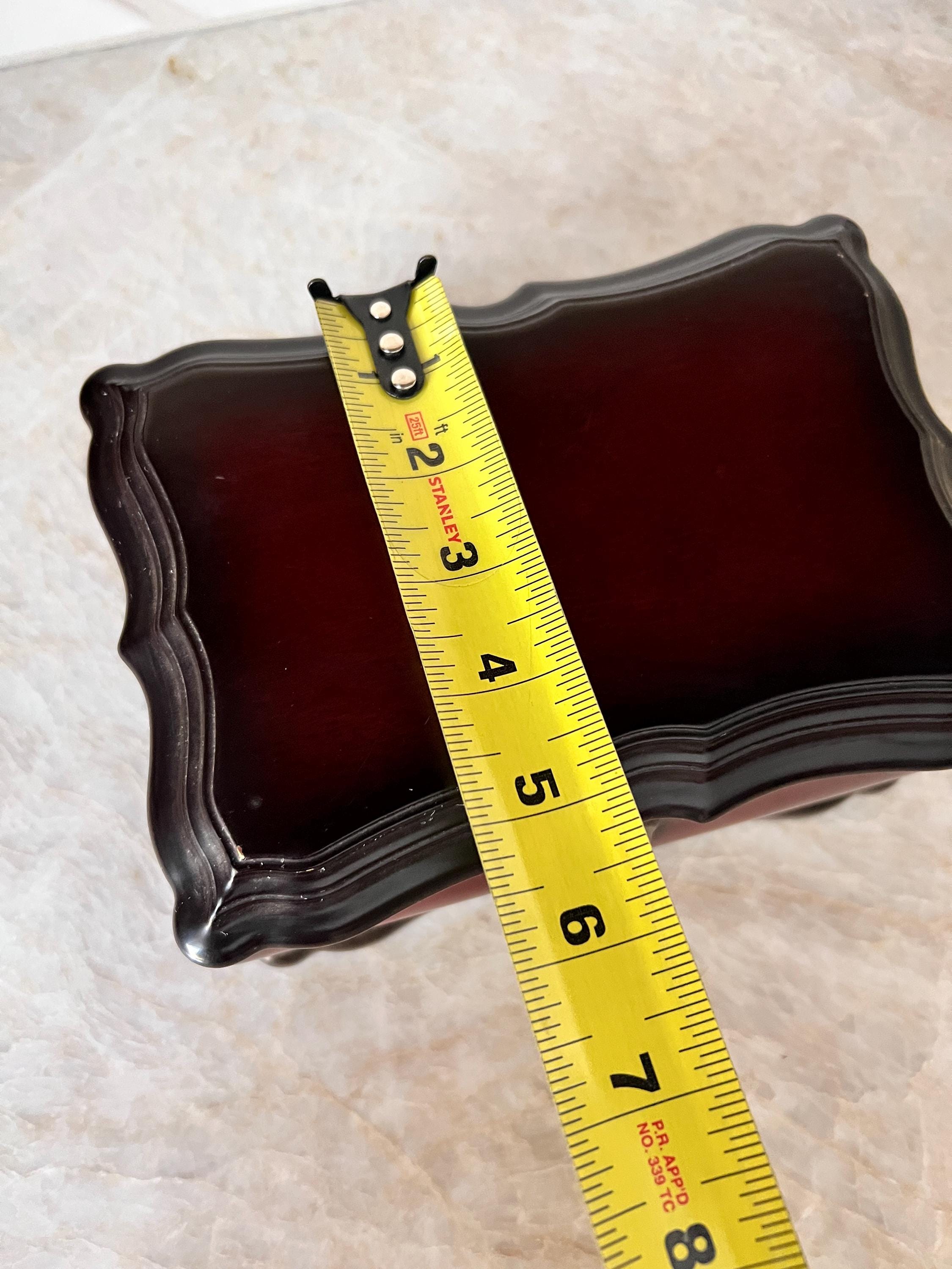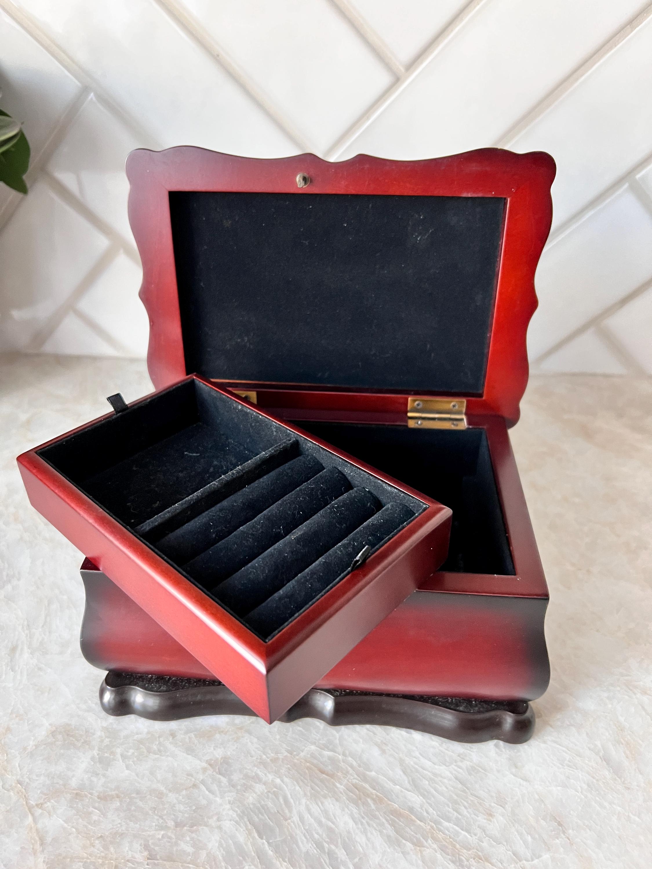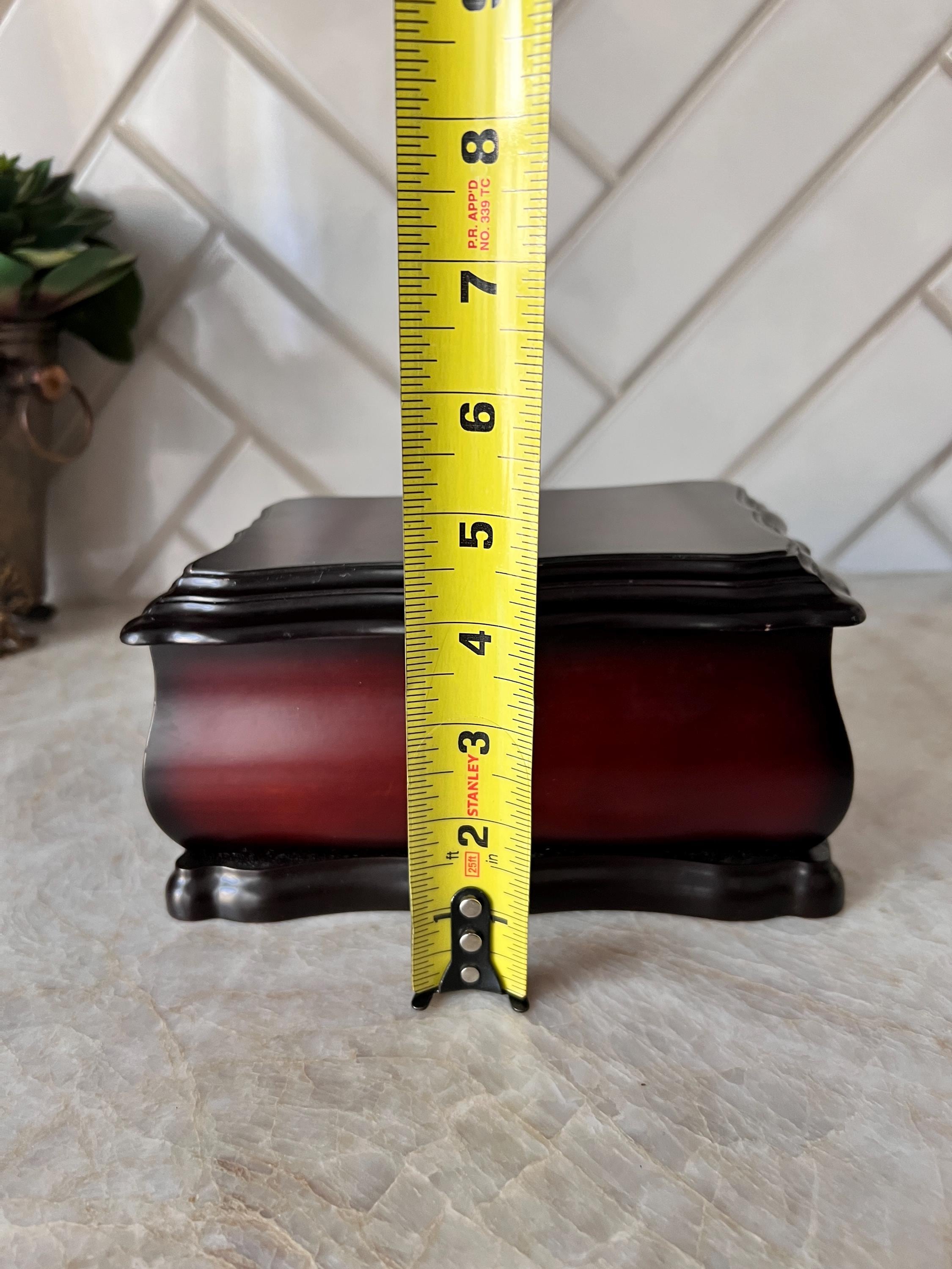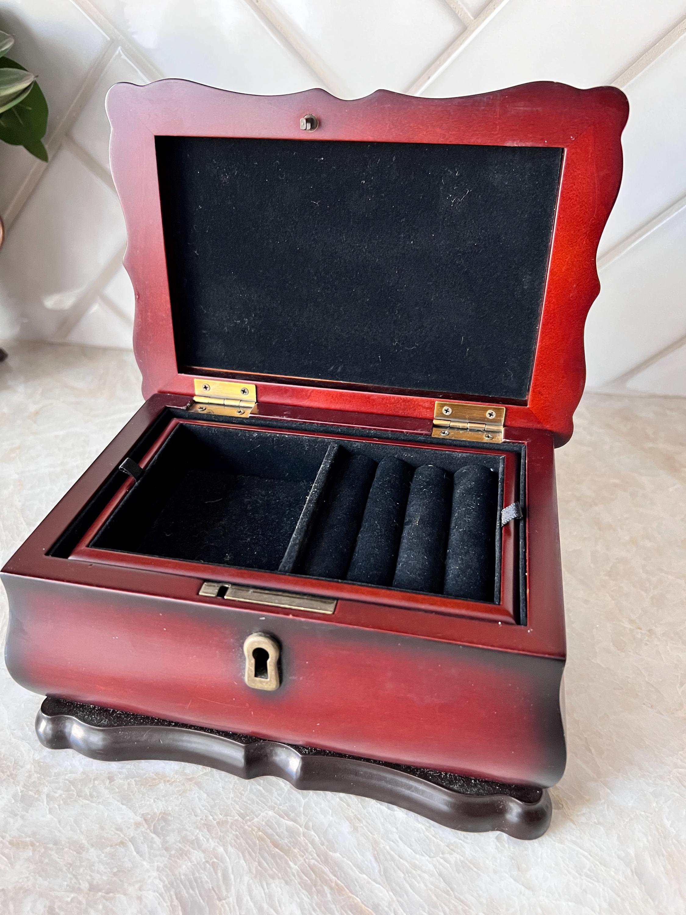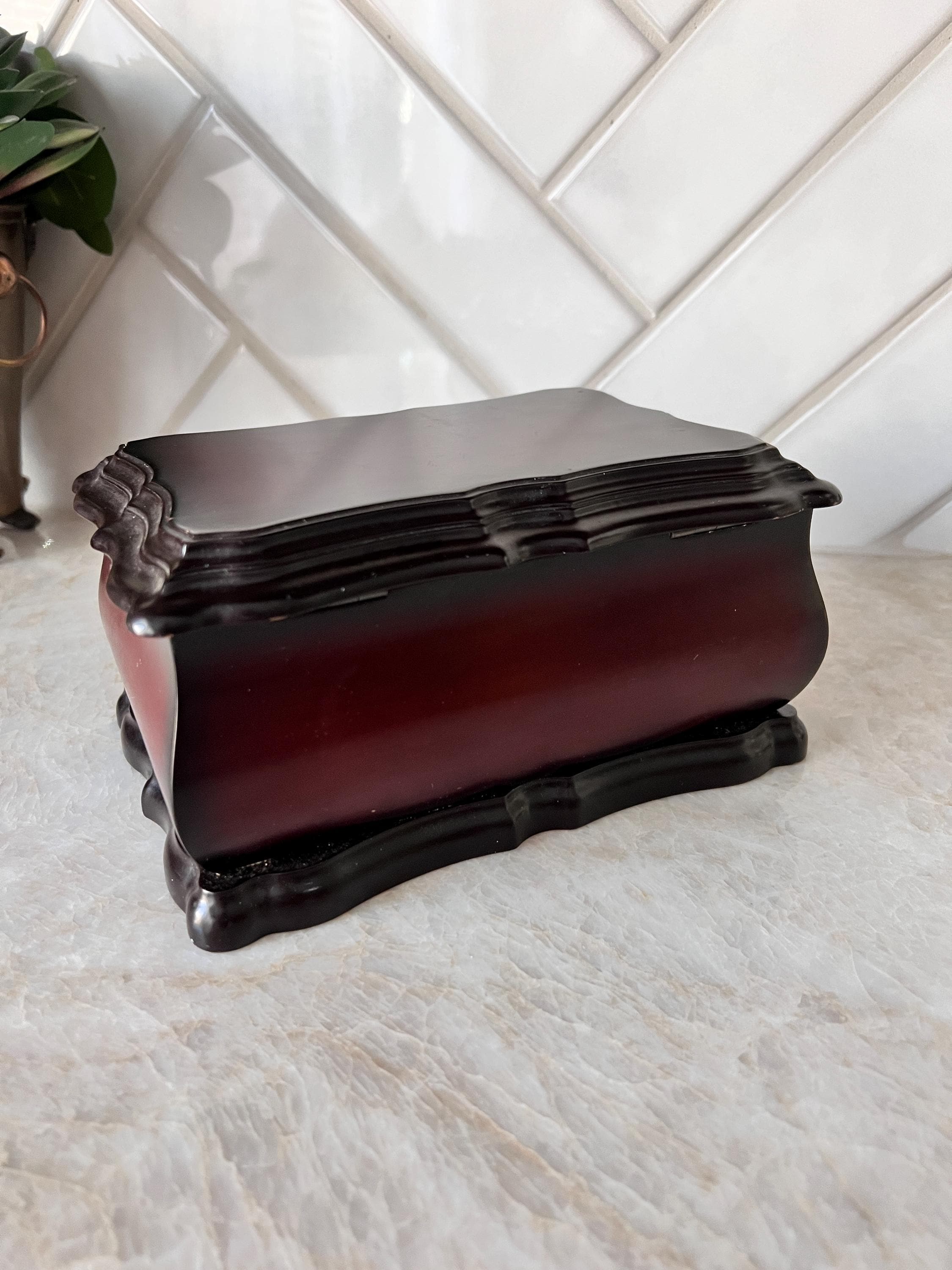 Add timeless elegance to your vanity or dresser with this vintage Bombay Company mahogany jewelry box. Crafted in a rich reddish-brown wood stain with curved Rococo-style edges, this charming box is perfect for storing rings, earrings, necklaces, or keepsakes. The elegant shape and brass-tone keyhole detail offer a sophisticated touch, making it as decorative as it is functional.
