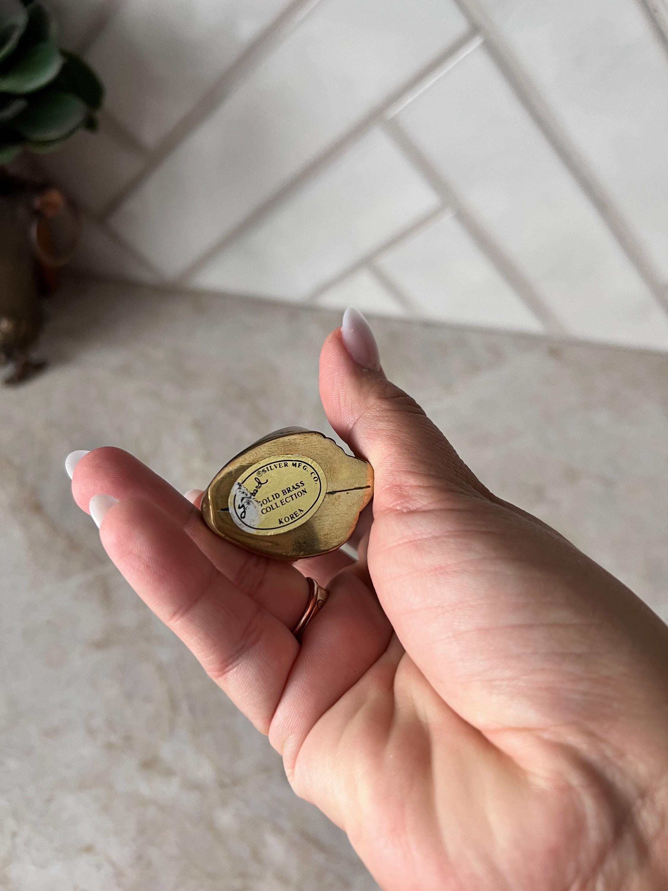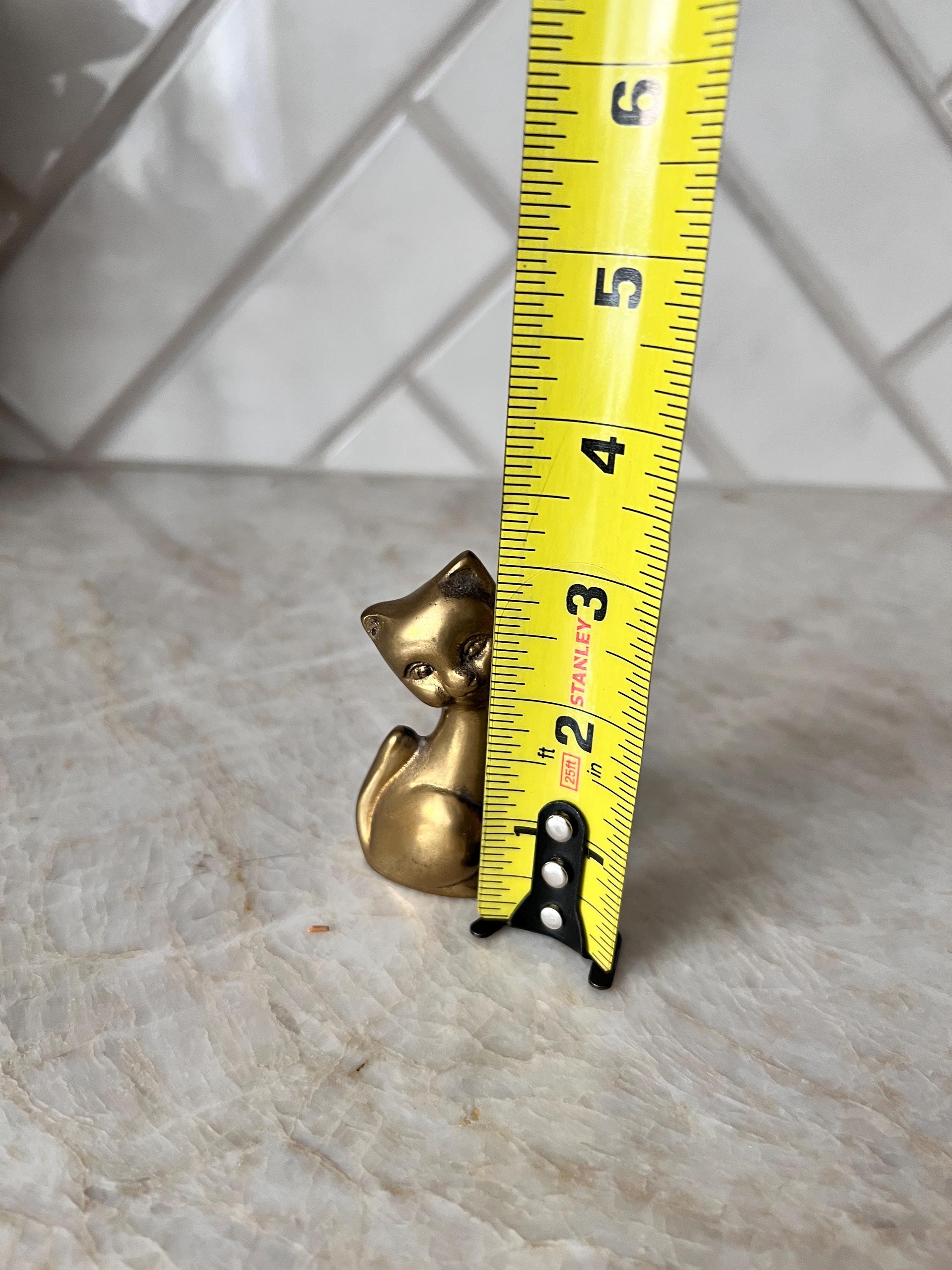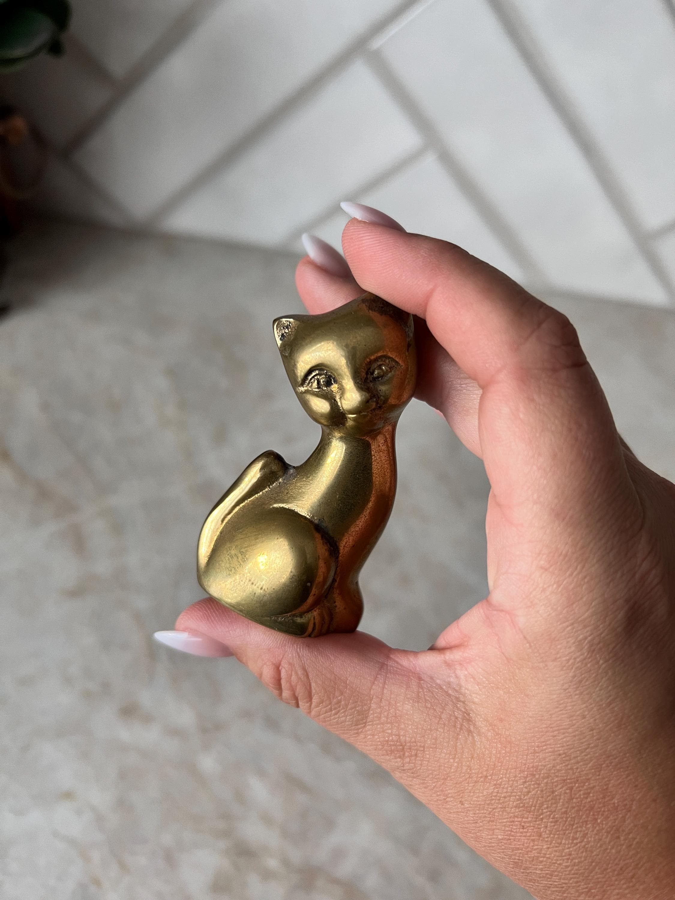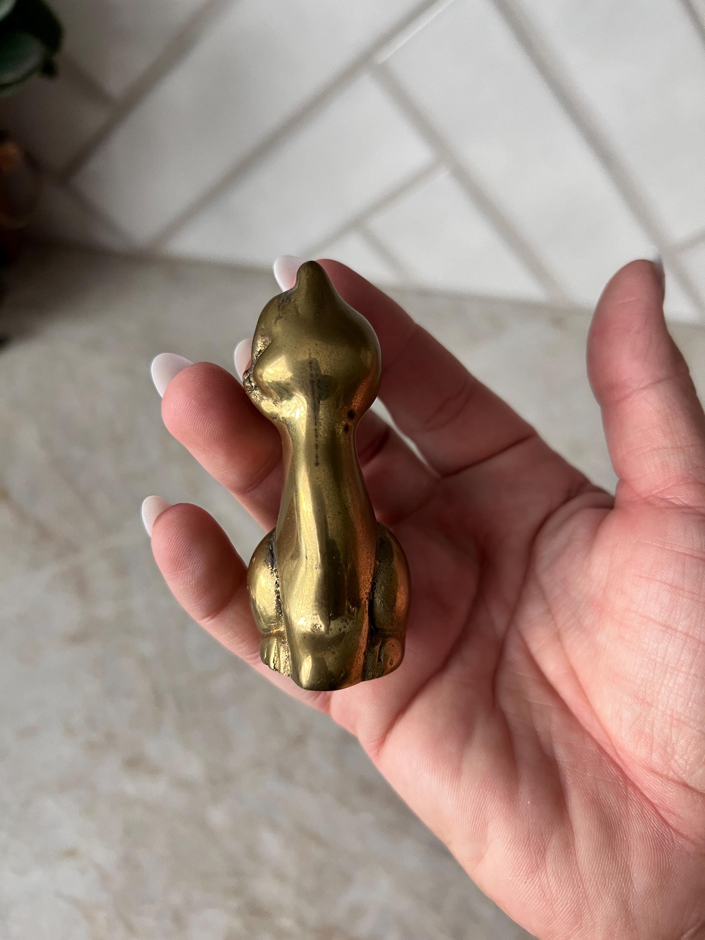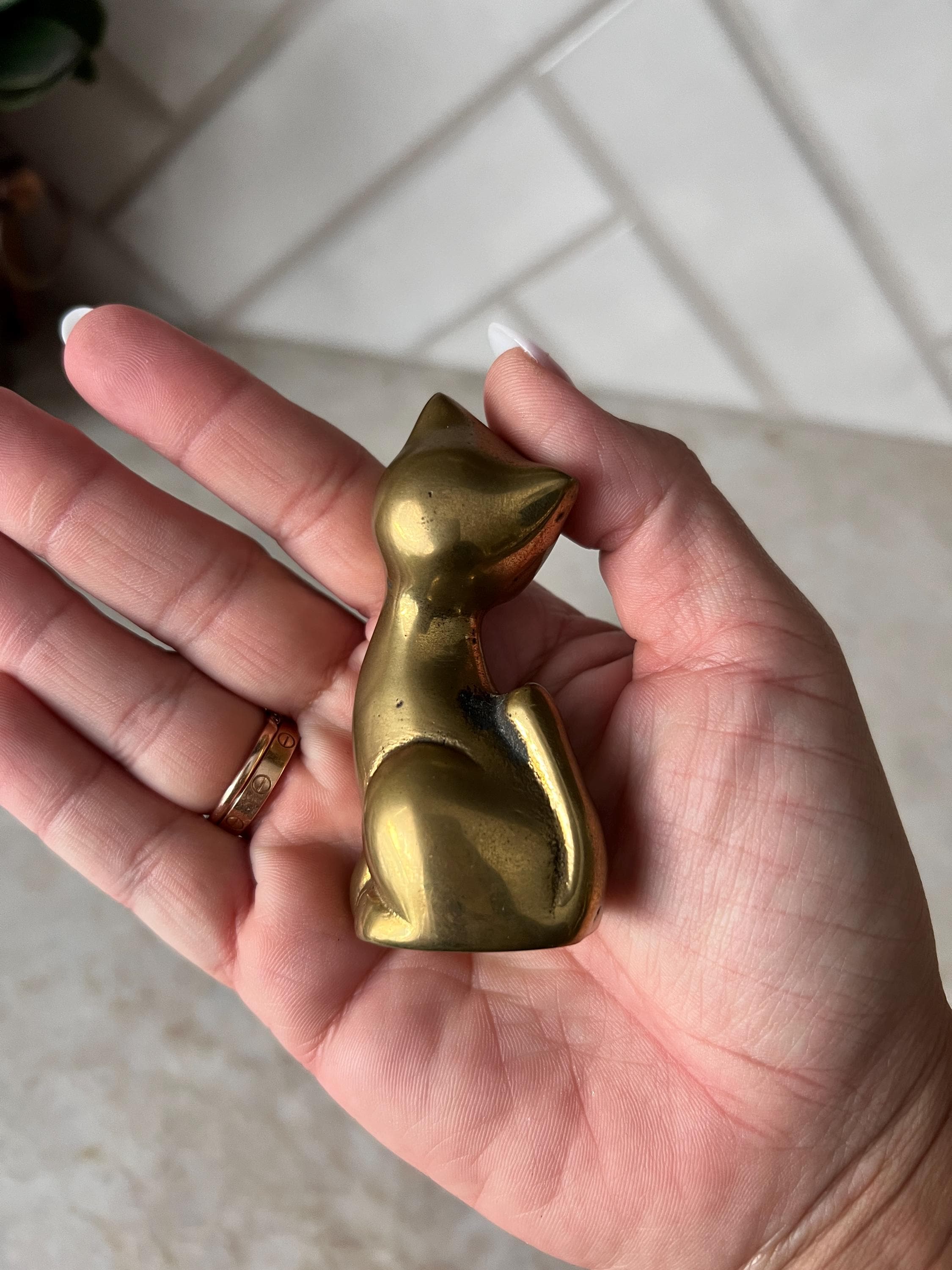 This charming vintage brass cat figurine is a purr-fect addition to any eclectic shelf or boho vignette. Crafted in solid brass, this petite feline features sweet facial details and a sleek, mid-century modern shape. Whether you're a collector of brass animals, a cat lover, or simply looking for a unique touch of vintage charm, this tiny treasure will make you smile.