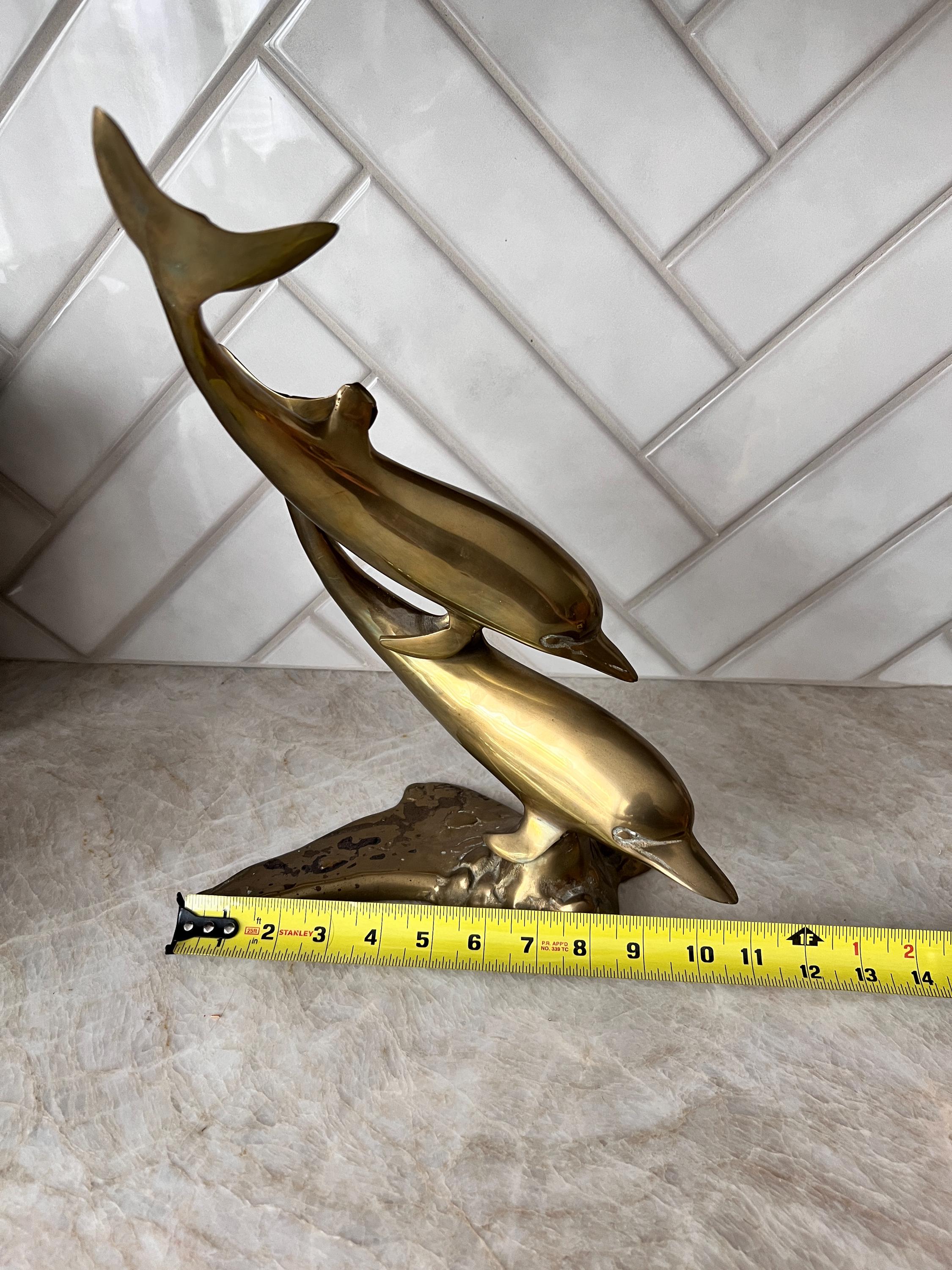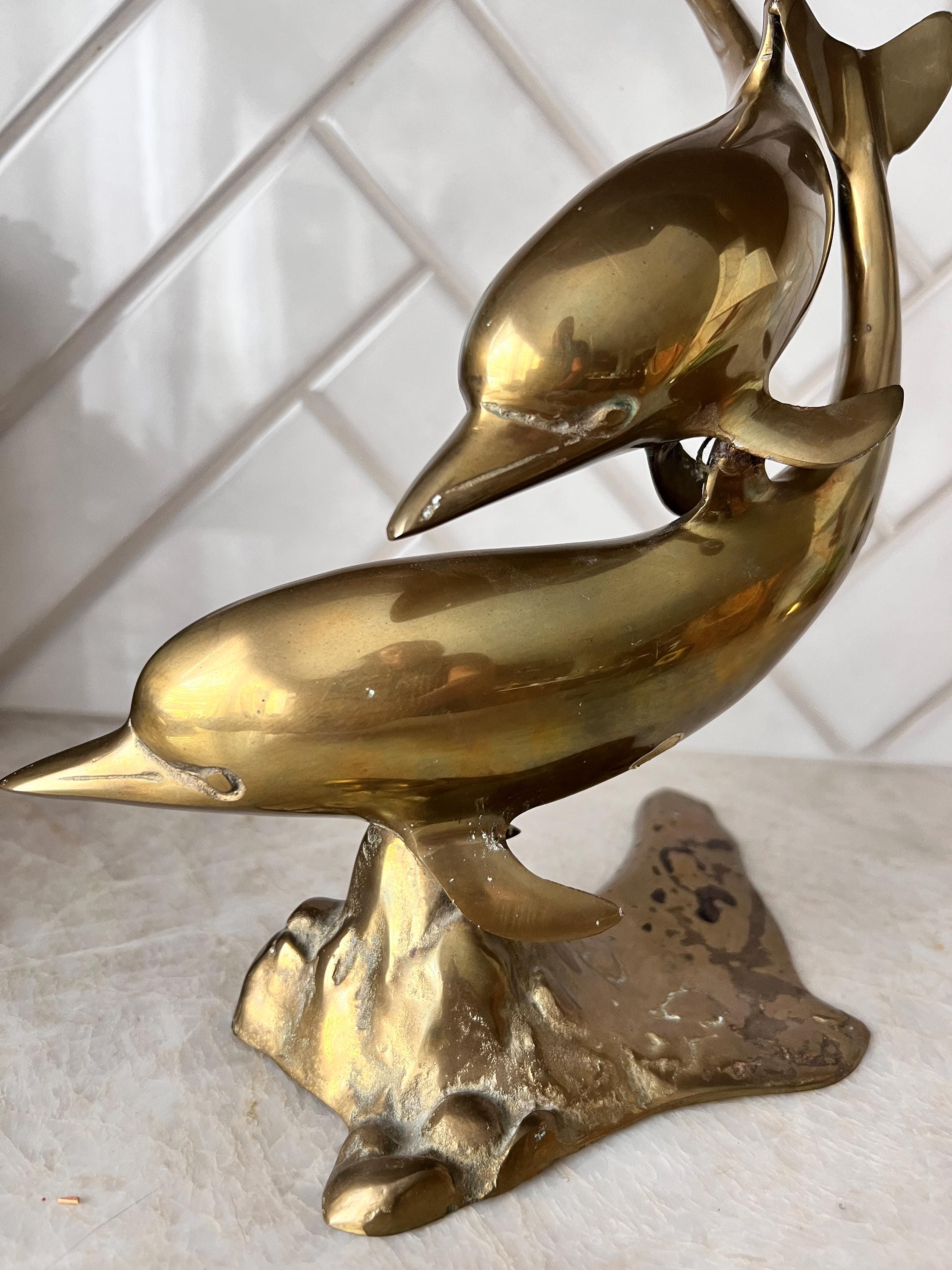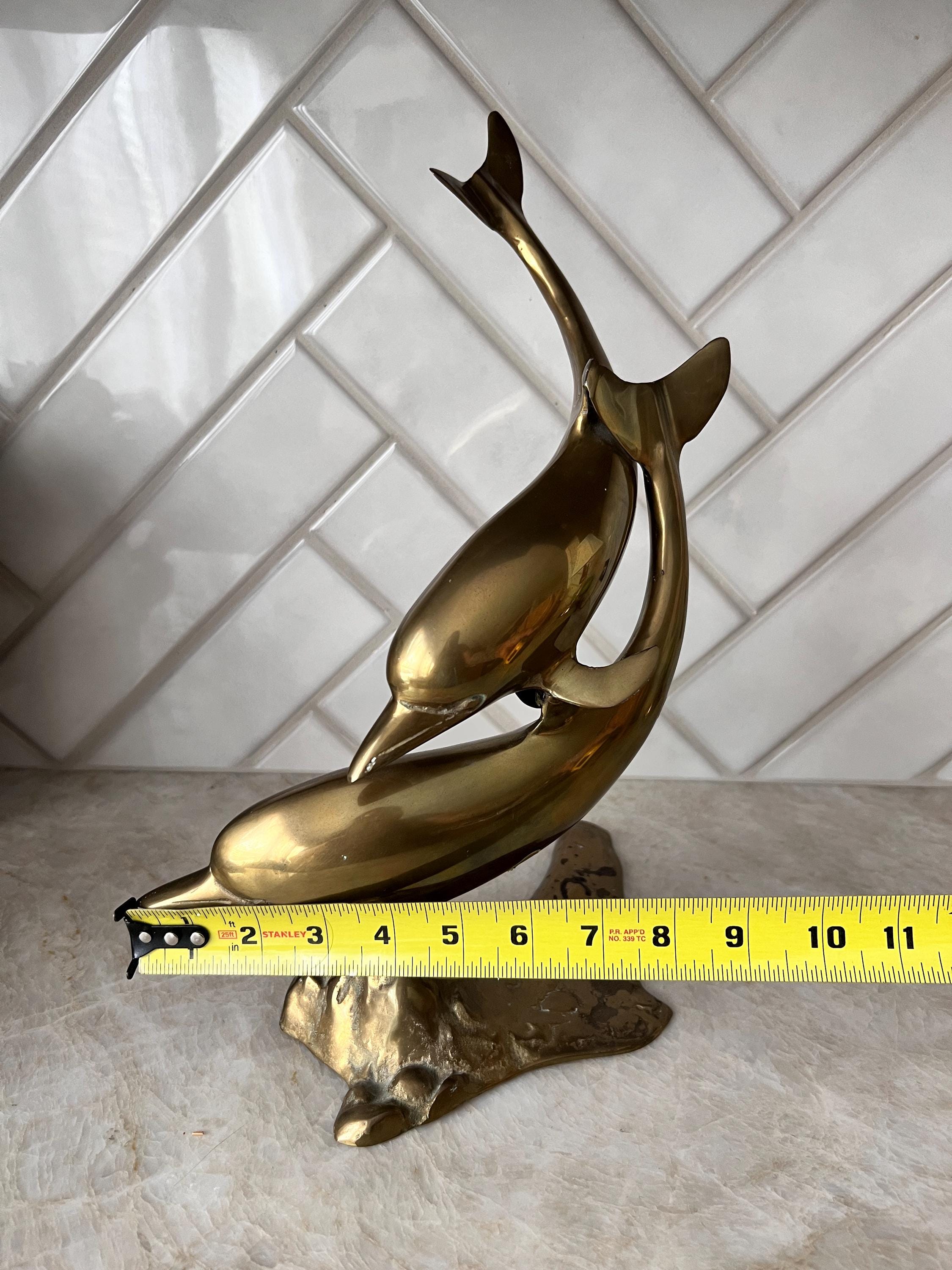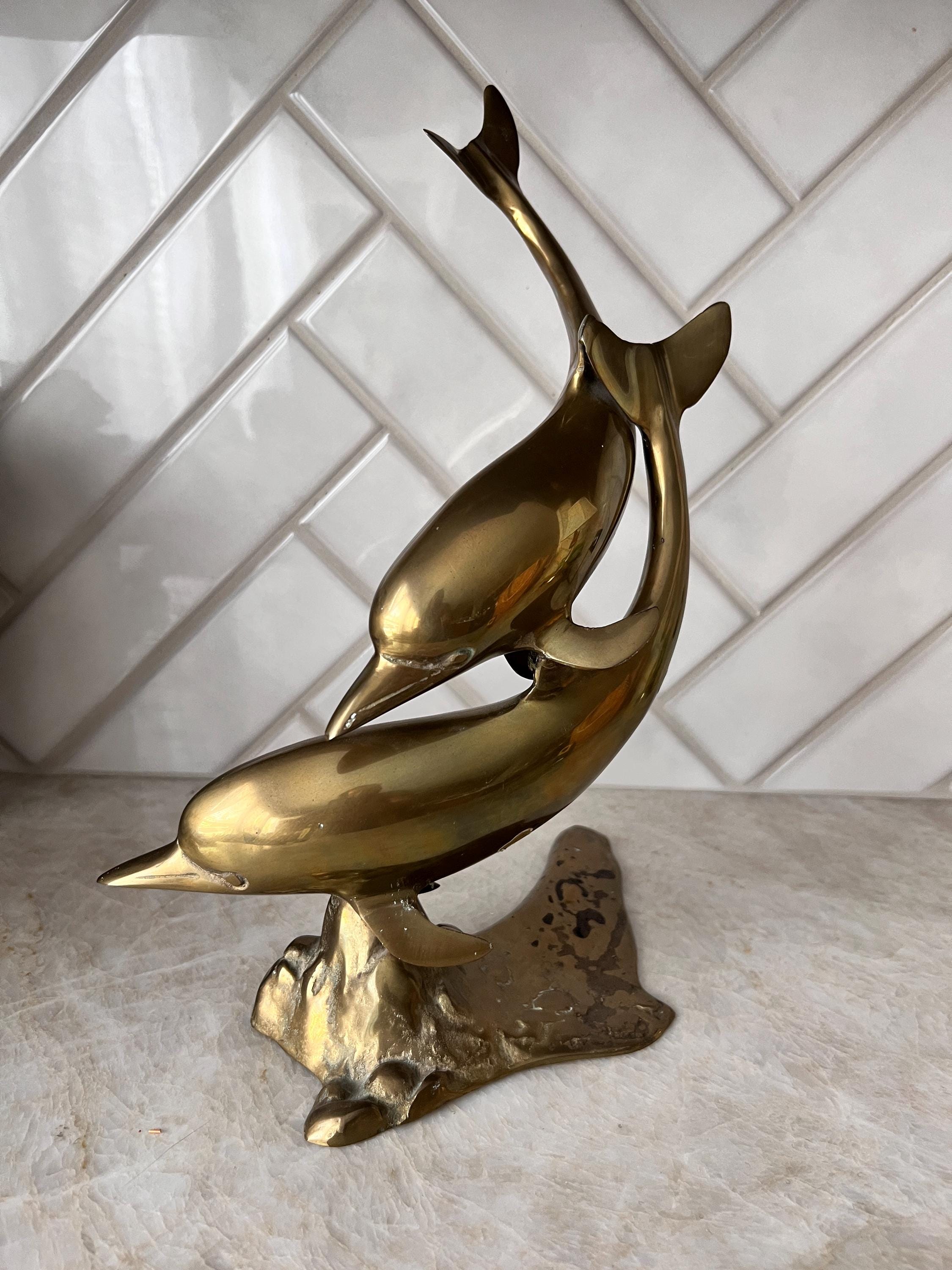 Make a splash with this stunning mid century modern brass dolphin sculpture featuring two sleek dolphins riding an abstract wave. This solid brass piece is both nautical and sculptural—perfect for a beach house, ocean-inspired gallery wall, or coastal cottagecore shelf. Its warm vintage patina and fluid design give it that classic 1960s–1970s charm with timeless appeal.