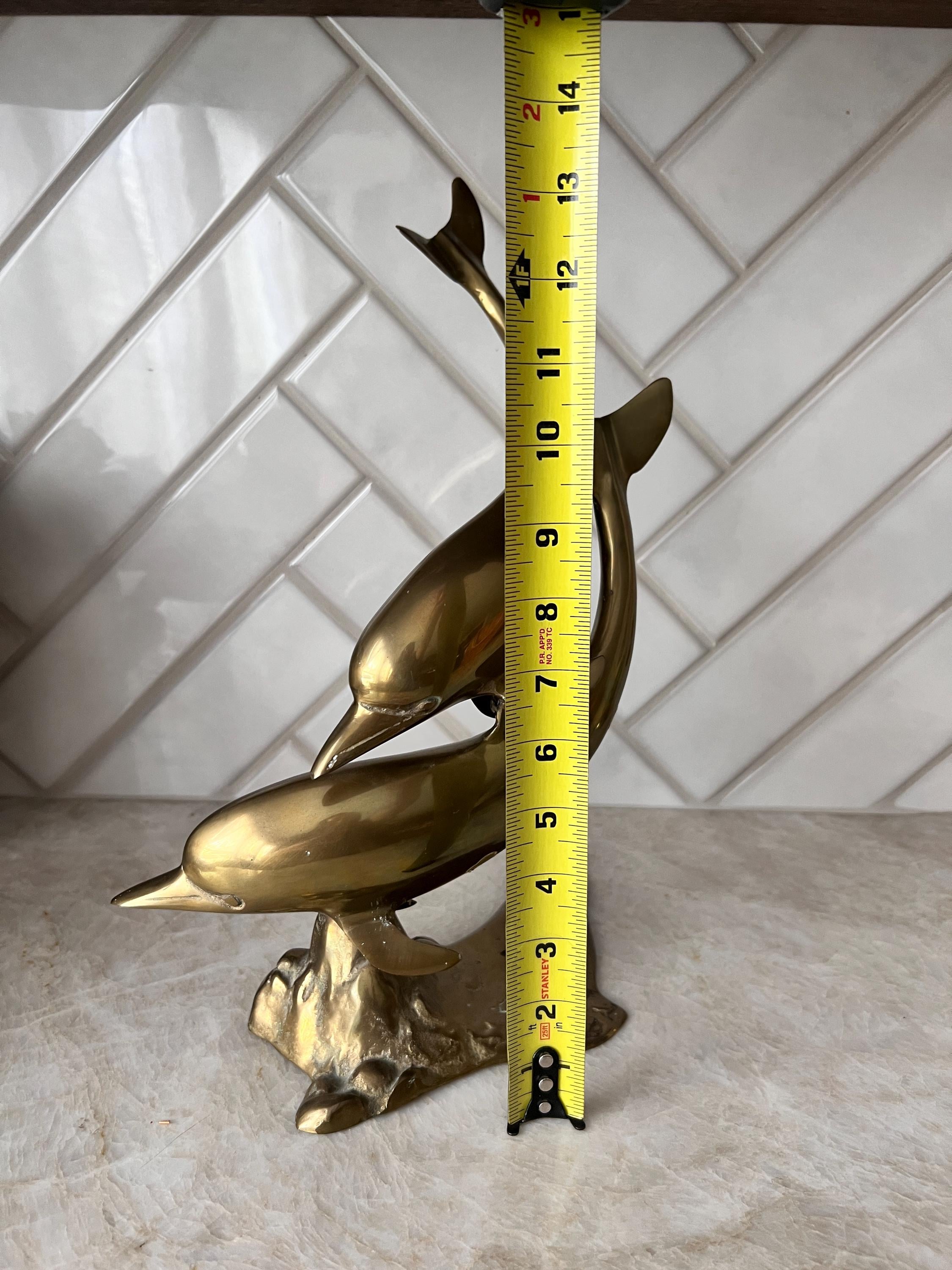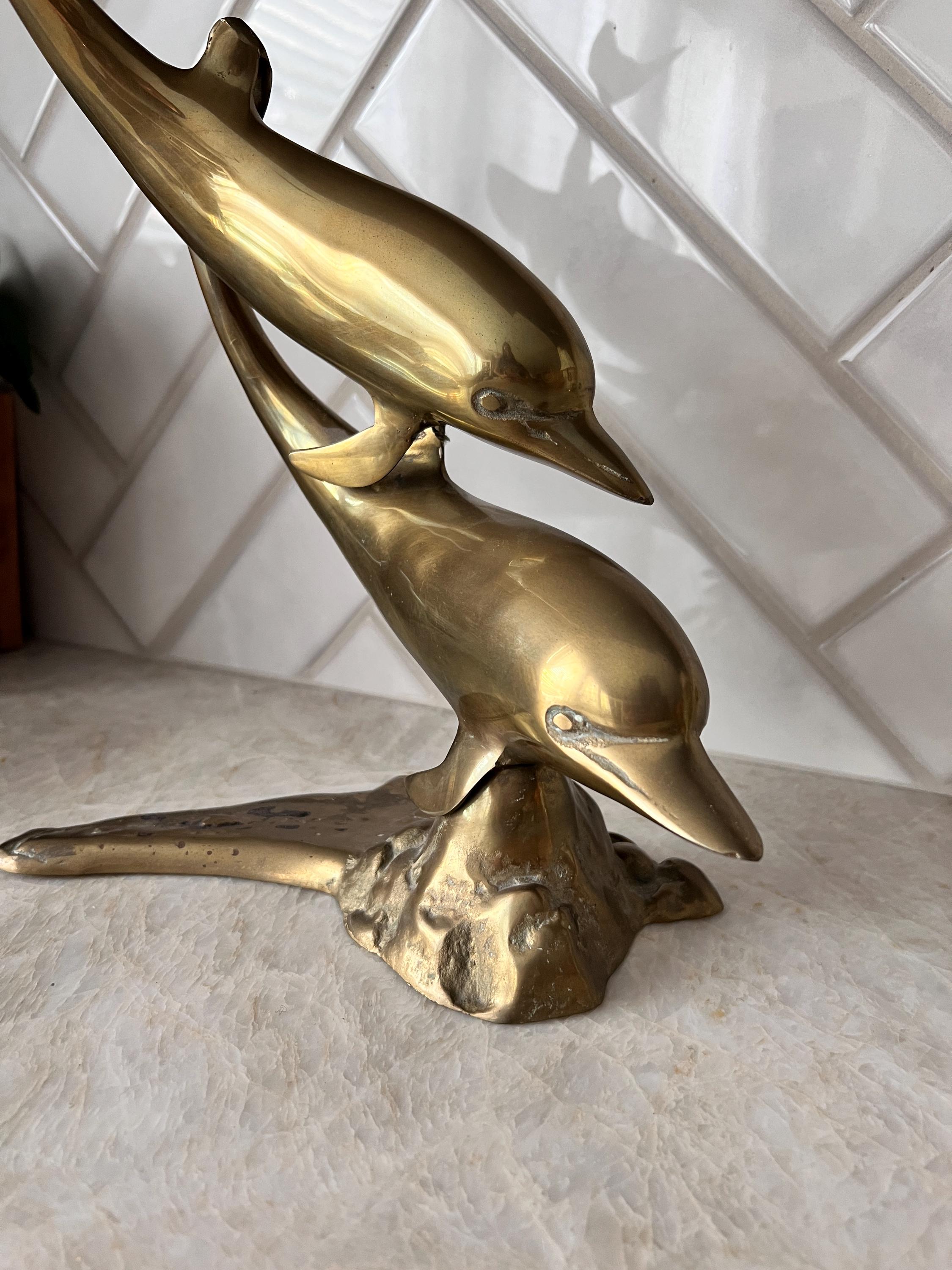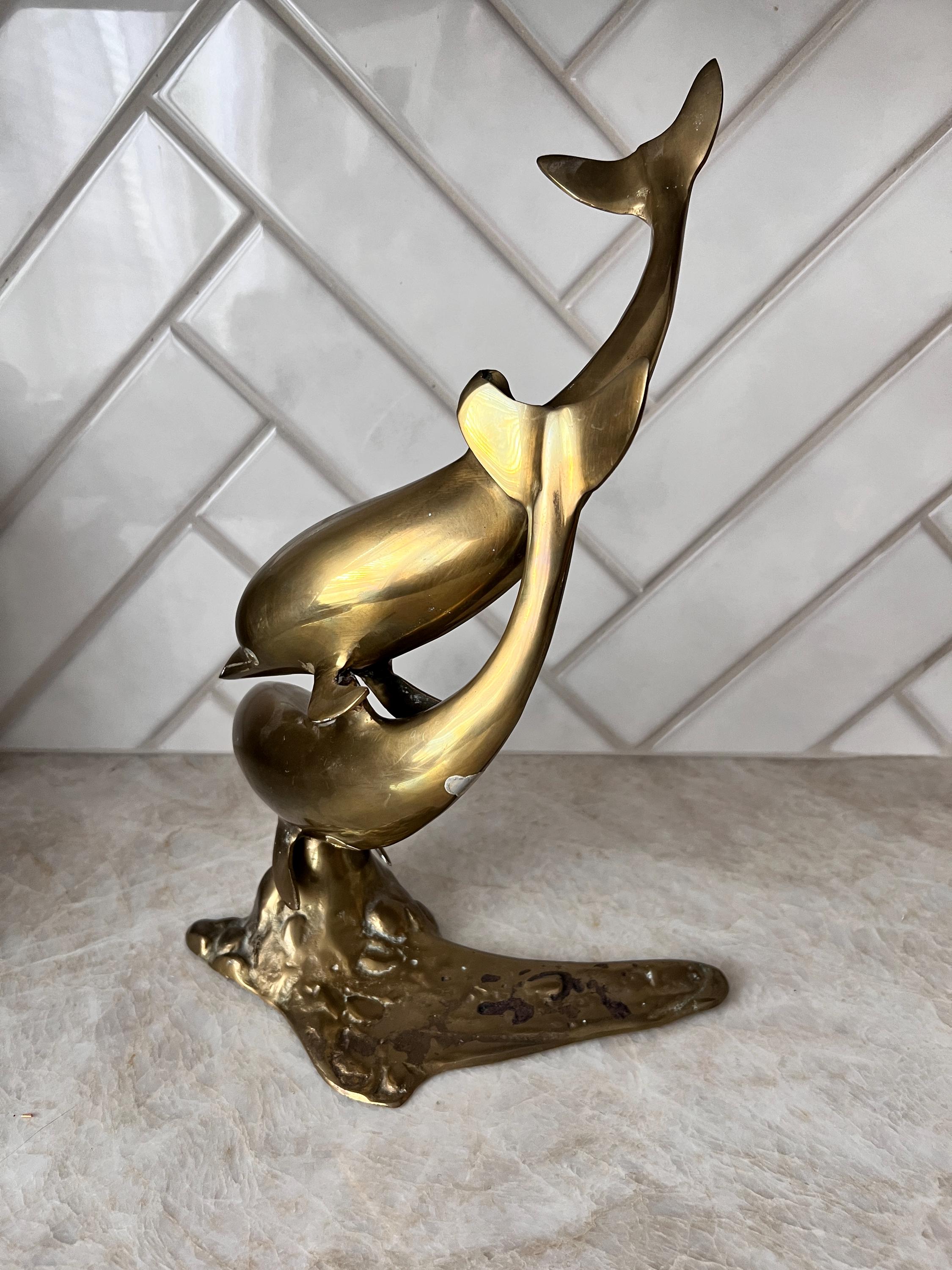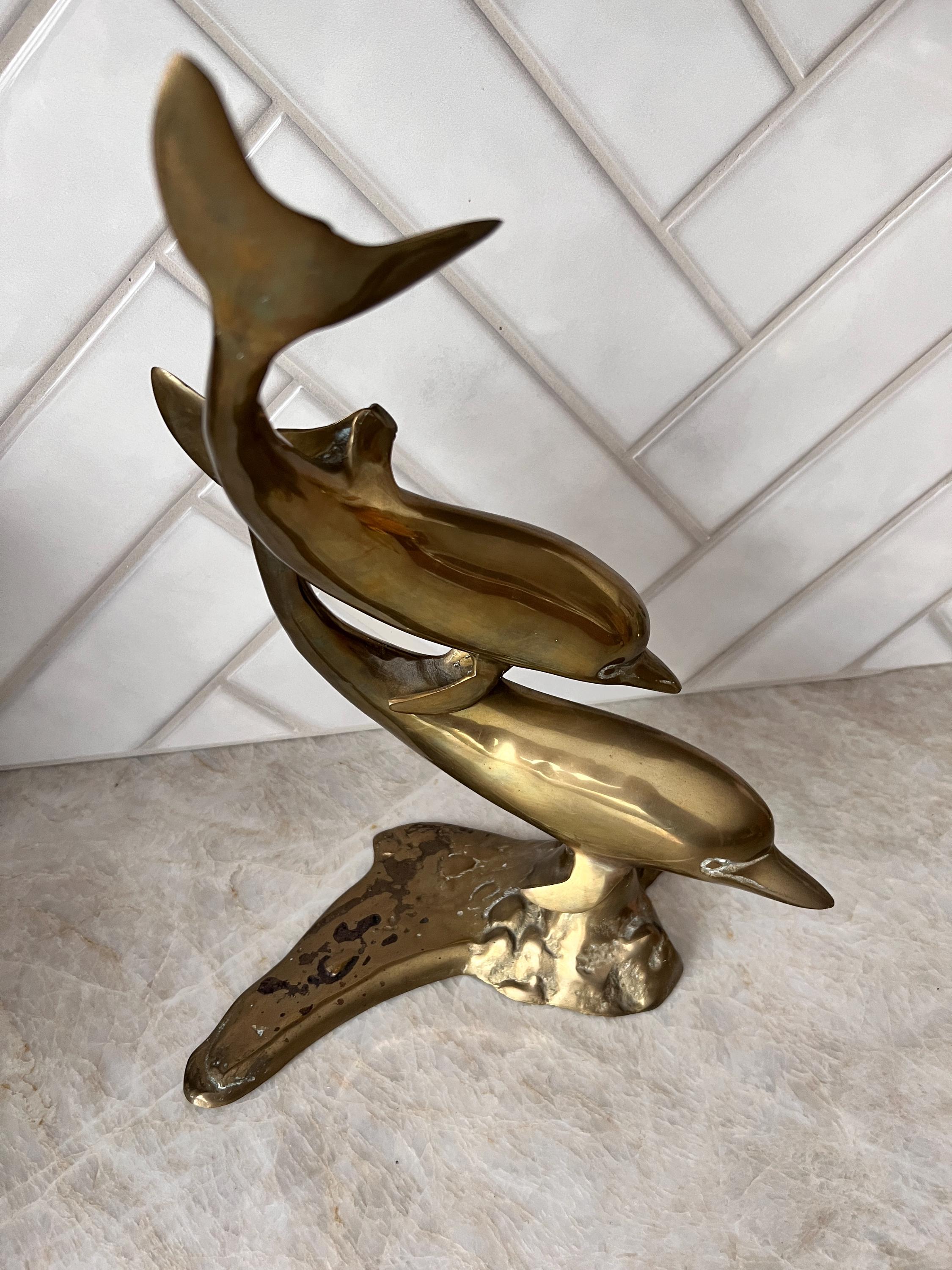 Make a splash with this stunning mid century modern brass dolphin sculpture featuring two sleek dolphins riding an abstract wave. This solid brass piece is both nautical and sculptural—perfect for a beach house, ocean-inspired gallery wall, or coastal cottagecore shelf. Its warm vintage patina and fluid design give it that classic 1960s–1970s charm with timeless appeal.