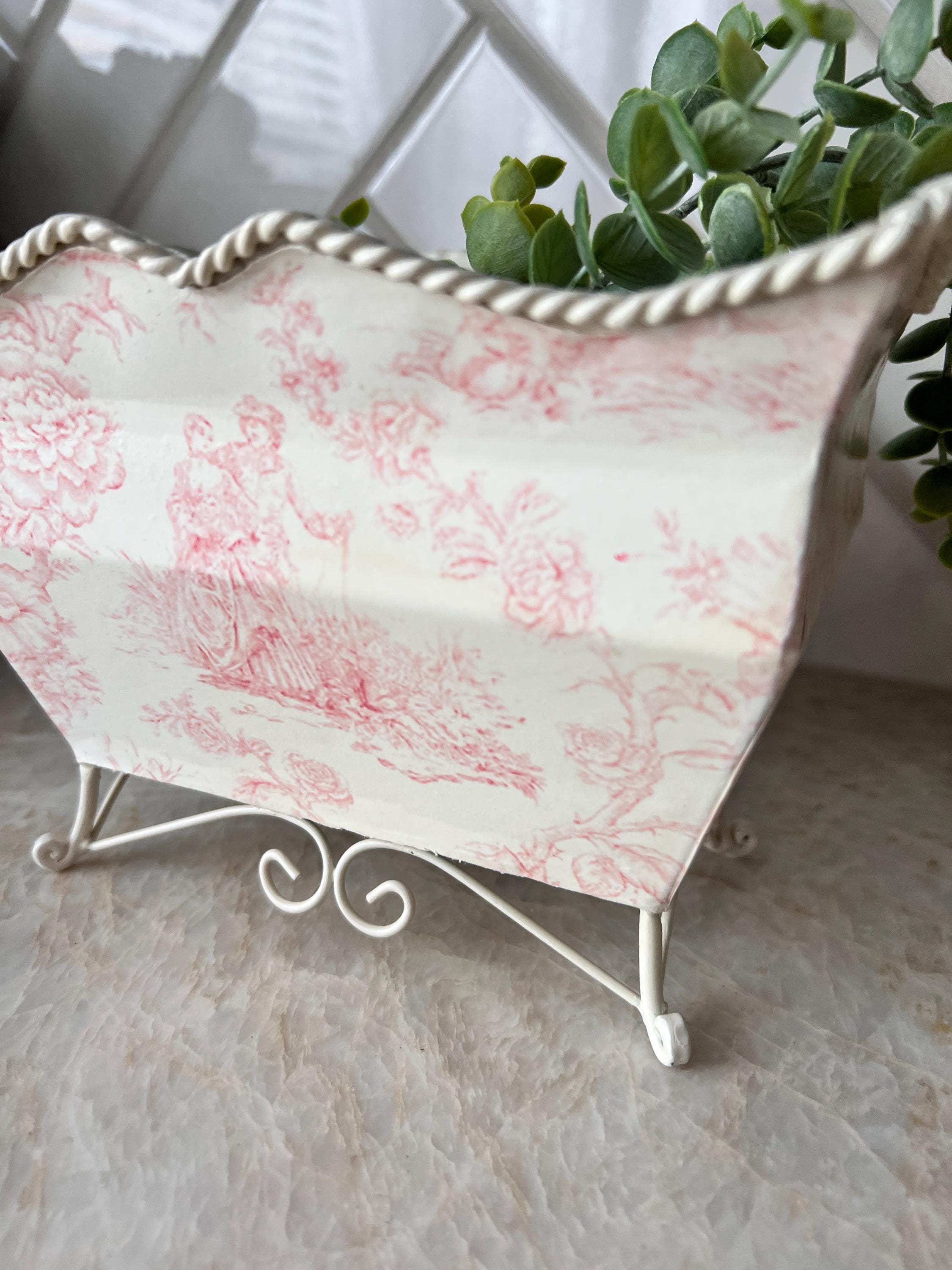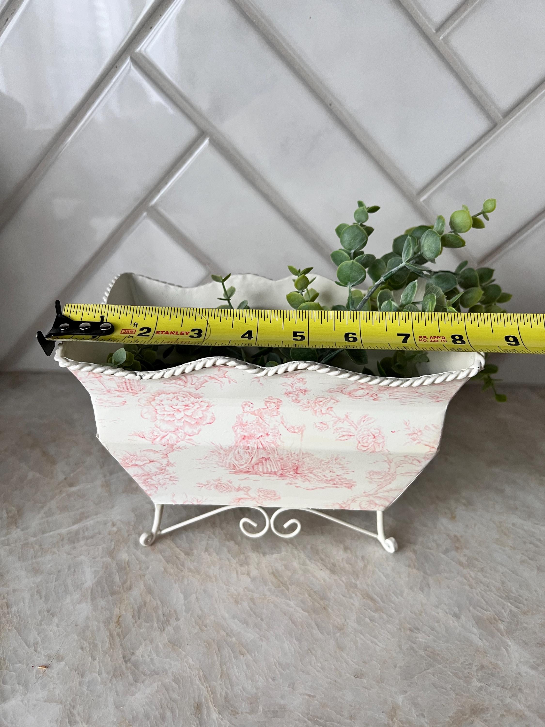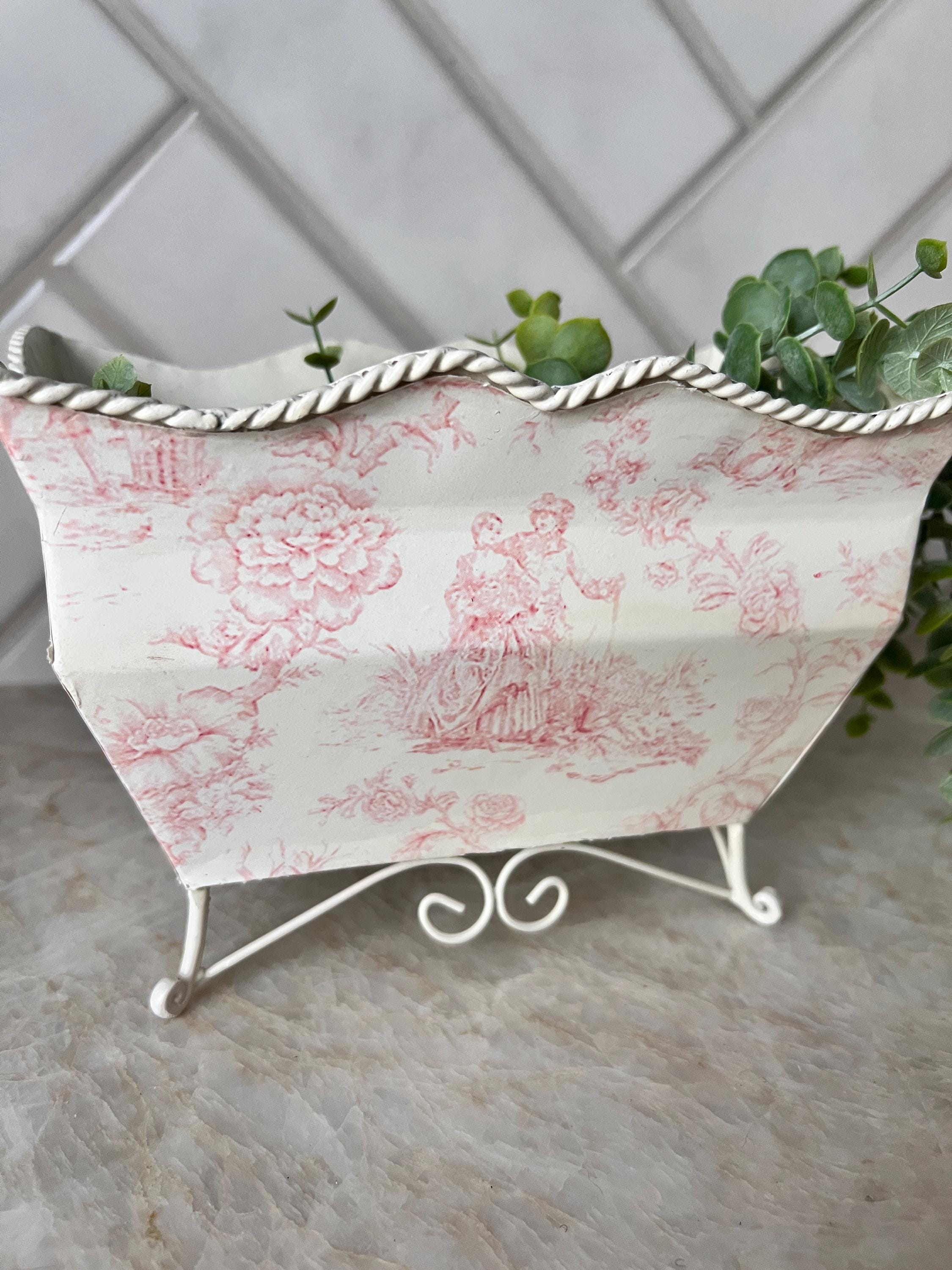 Bring home a dash of whimsical French country charm with this delightfully odd vintage planter! Featuring a red pastoral toile pattern on a cream-toned metal body and nestled in an ornate white scroll wire stand, this cachepot is pure romantic nostalgia. The curved top edge adds flair, and the raised footed base gives it a decorative touch that feels both playful and refined. Perfect for faux greenery, dried florals, rolled hand towels in a guest bath, or as an unexpected desk organizer for your coquette cottage workspace.