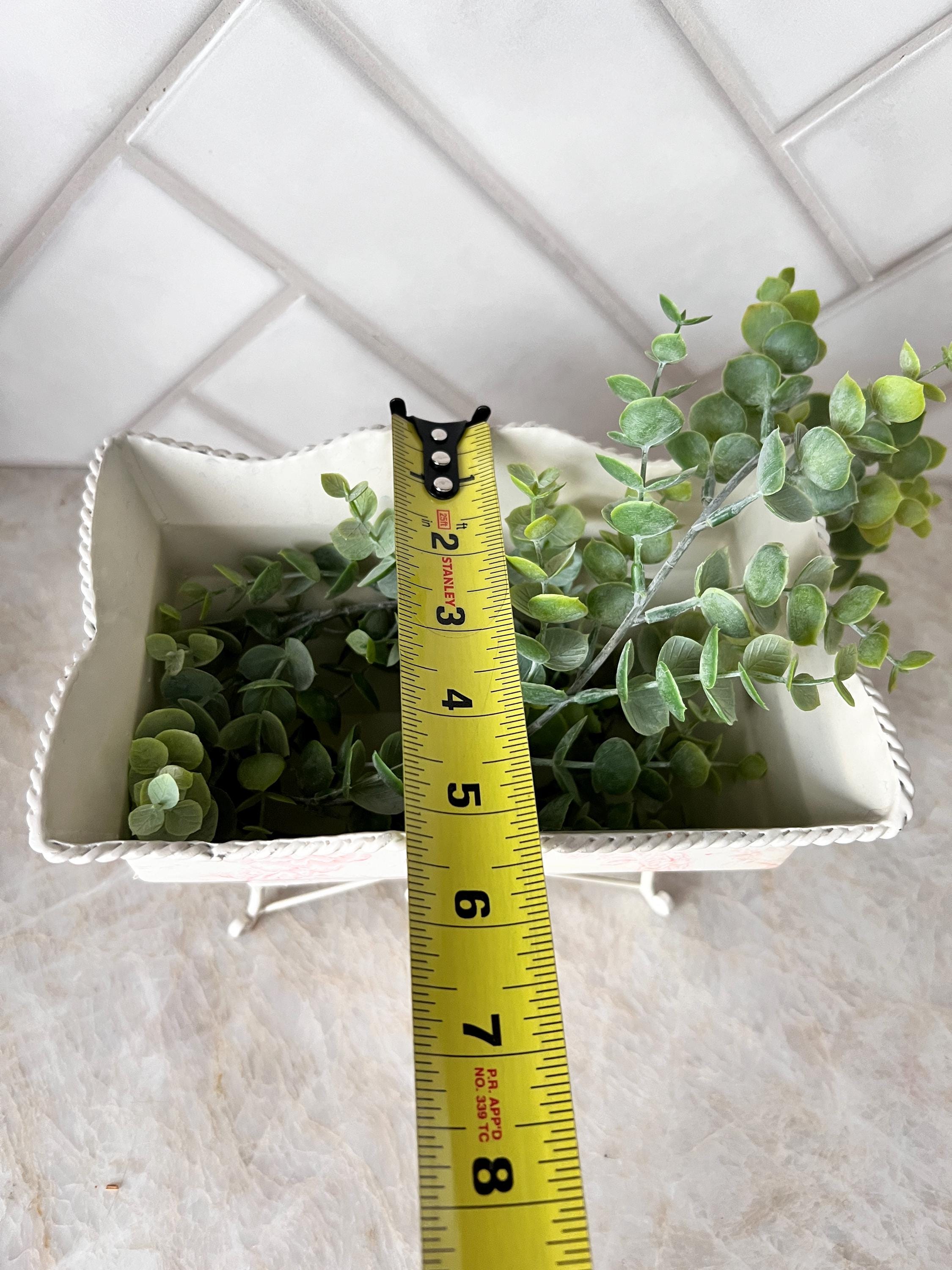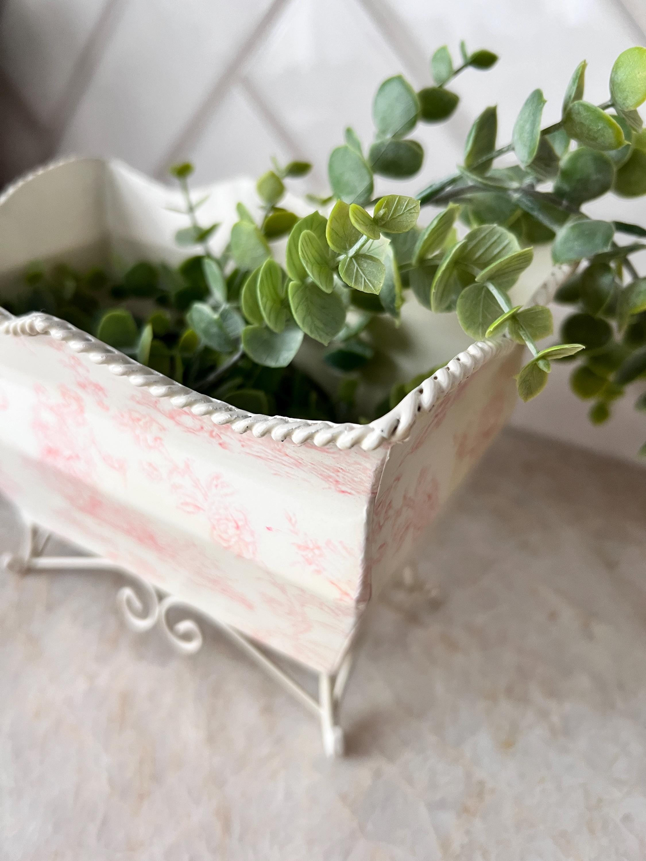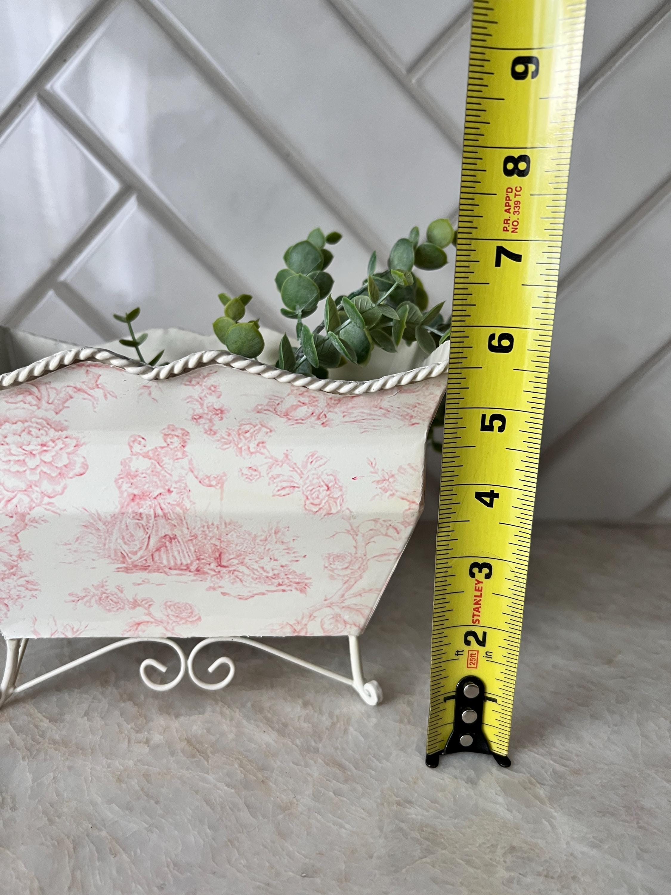 Bring home a dash of whimsical French country charm with this delightfully odd vintage planter! Featuring a red pastoral toile pattern on a cream-toned metal body and nestled in an ornate white scroll wire stand, this cachepot is pure romantic nostalgia. The curved top edge adds flair, and the raised footed base gives it a decorative touch that feels both playful and refined. Perfect for faux greenery, dried florals, rolled hand towels in a guest bath, or as an unexpected desk organizer for your coquette cottage workspace.