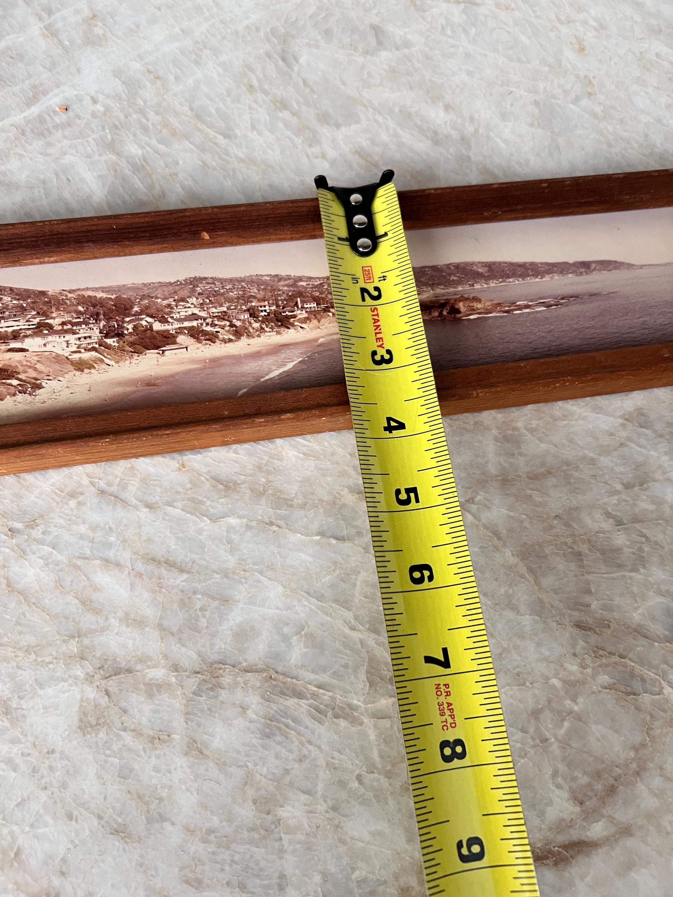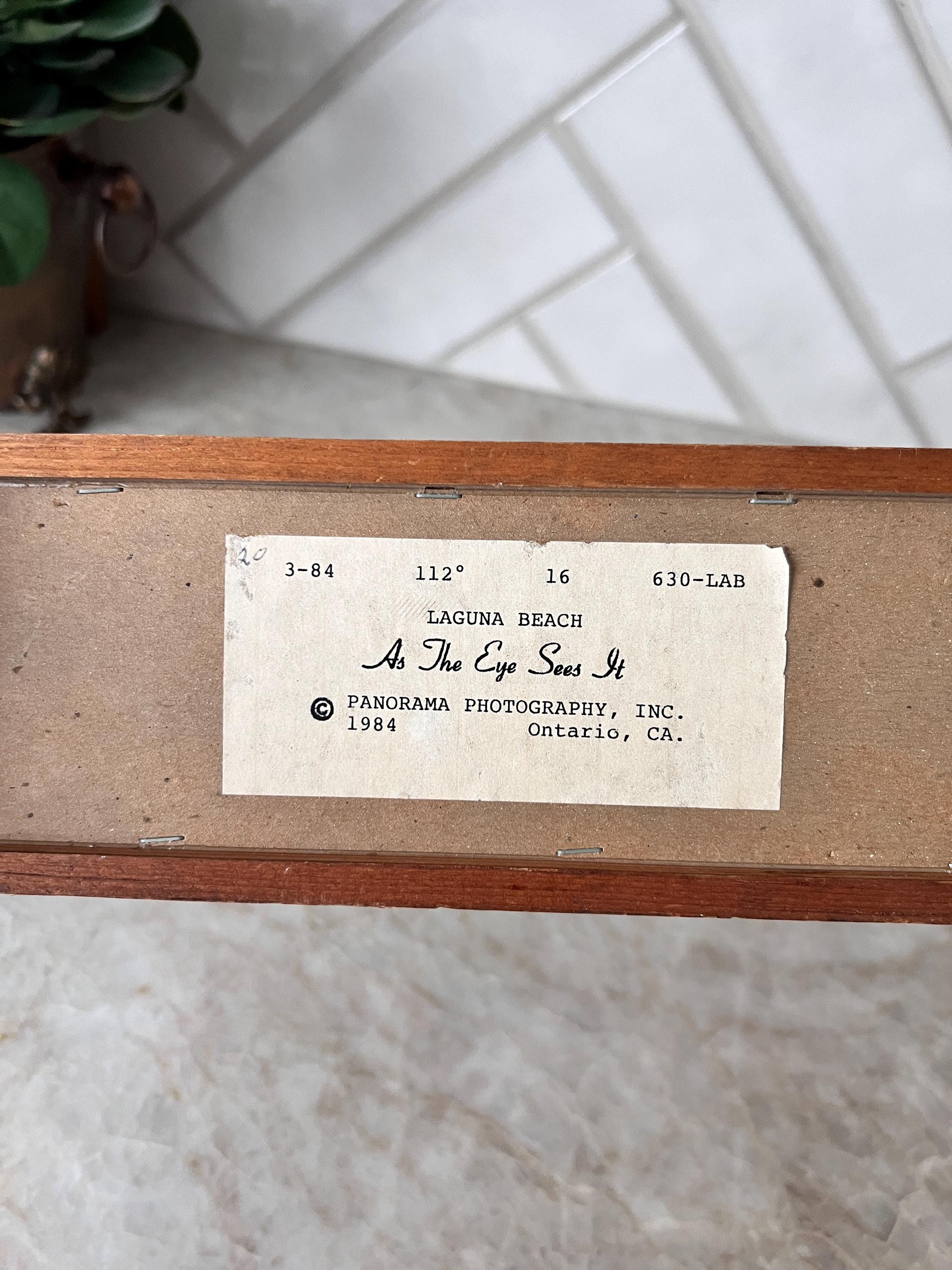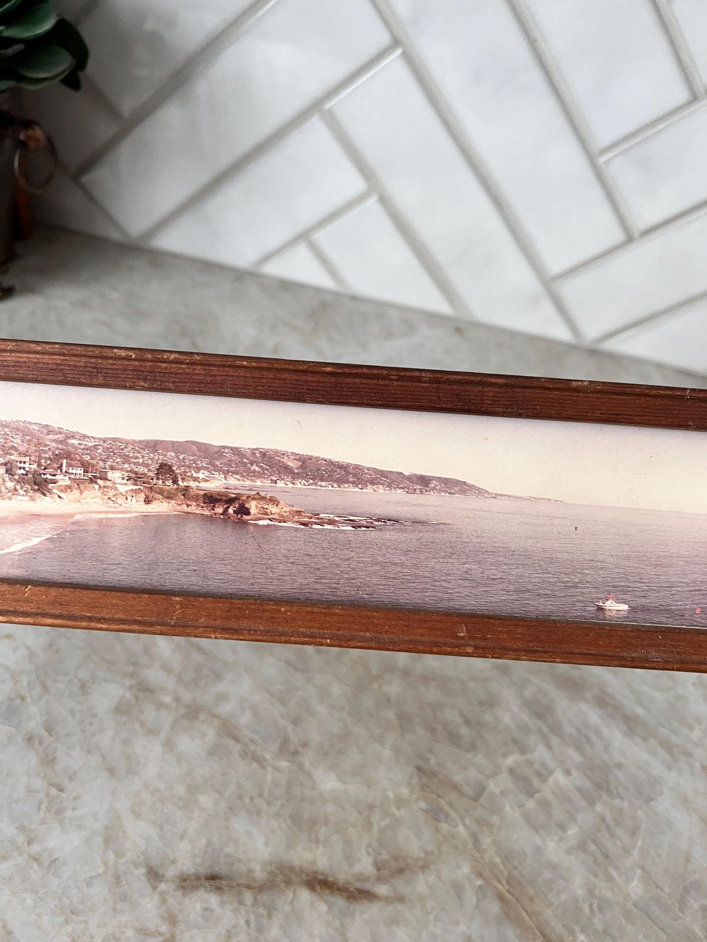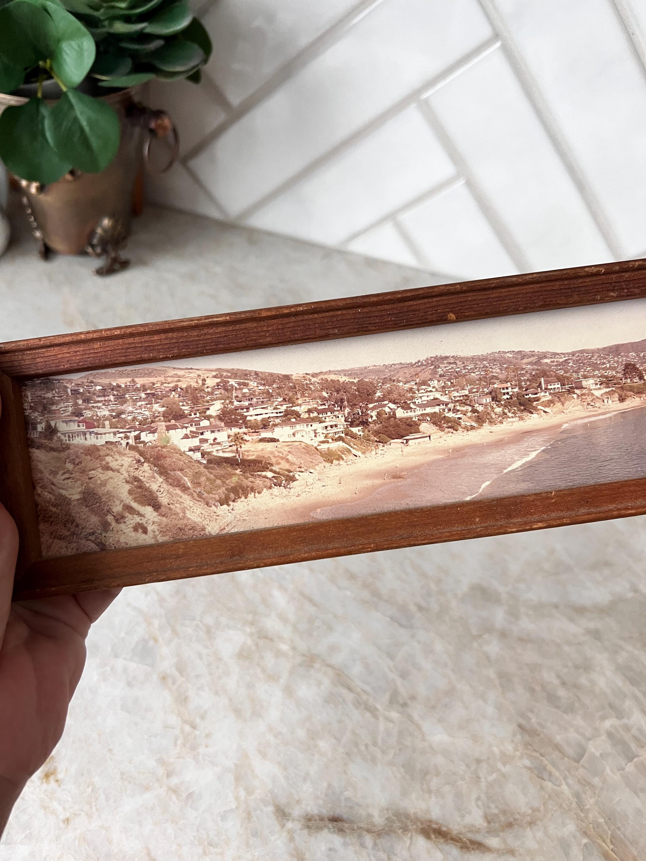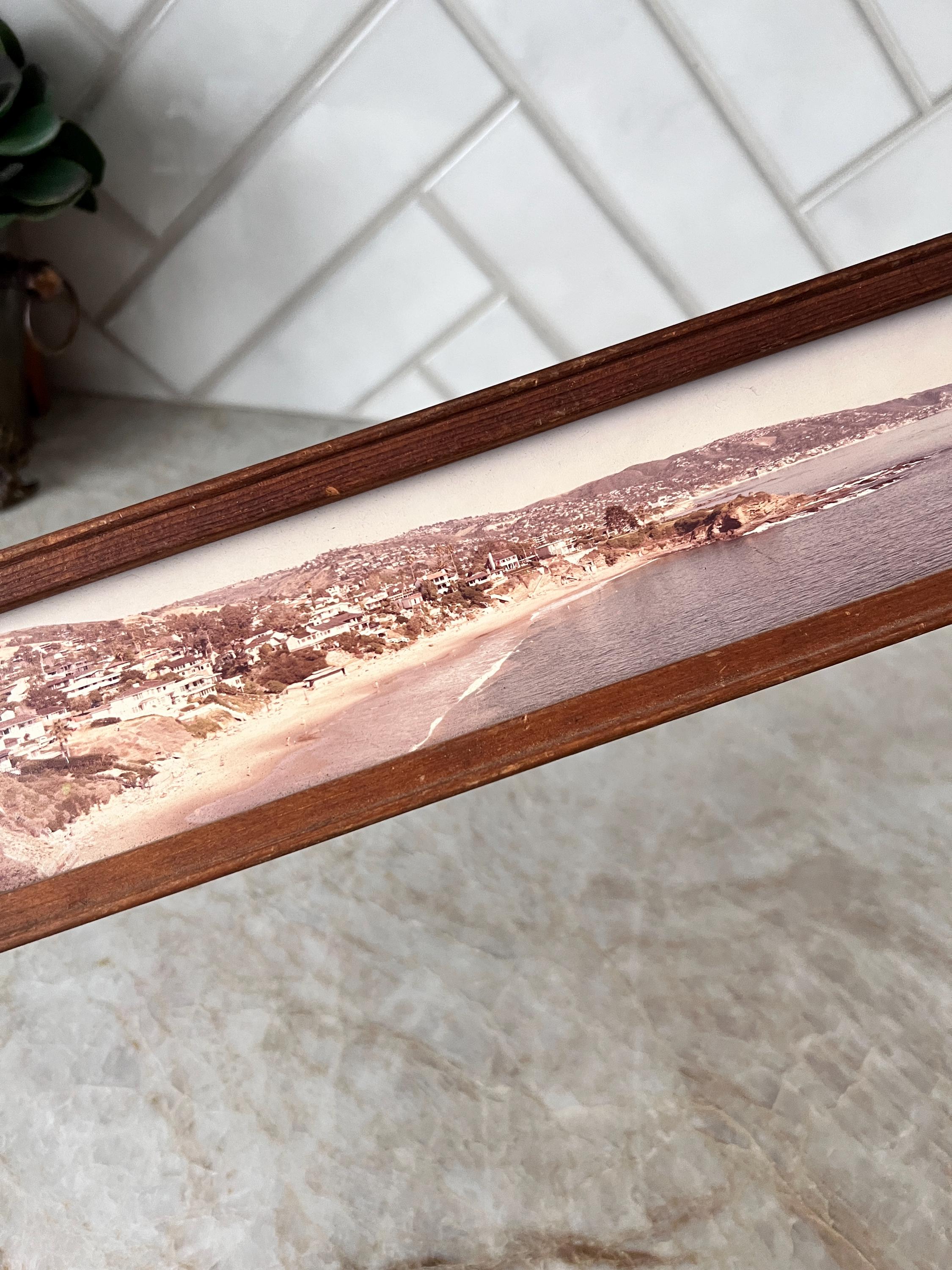 Transport yourself to the sun-soaked shores of Southern California with this vintage panoramic photograph of Malibu beach, beautifully framed in rich wood. Likely taken in the 1960's or 70's, the image captures the iconic stretch of coastline lined with beach houses, winding roads, and that unmistakable California surf vibe.