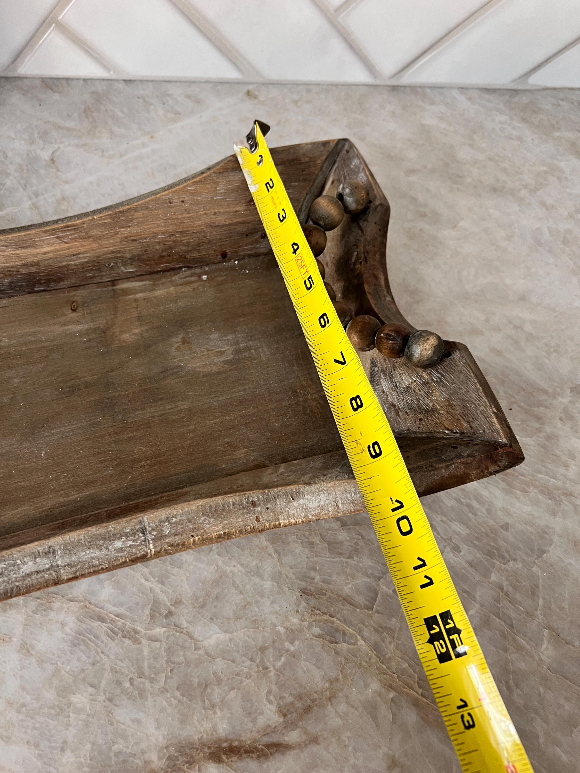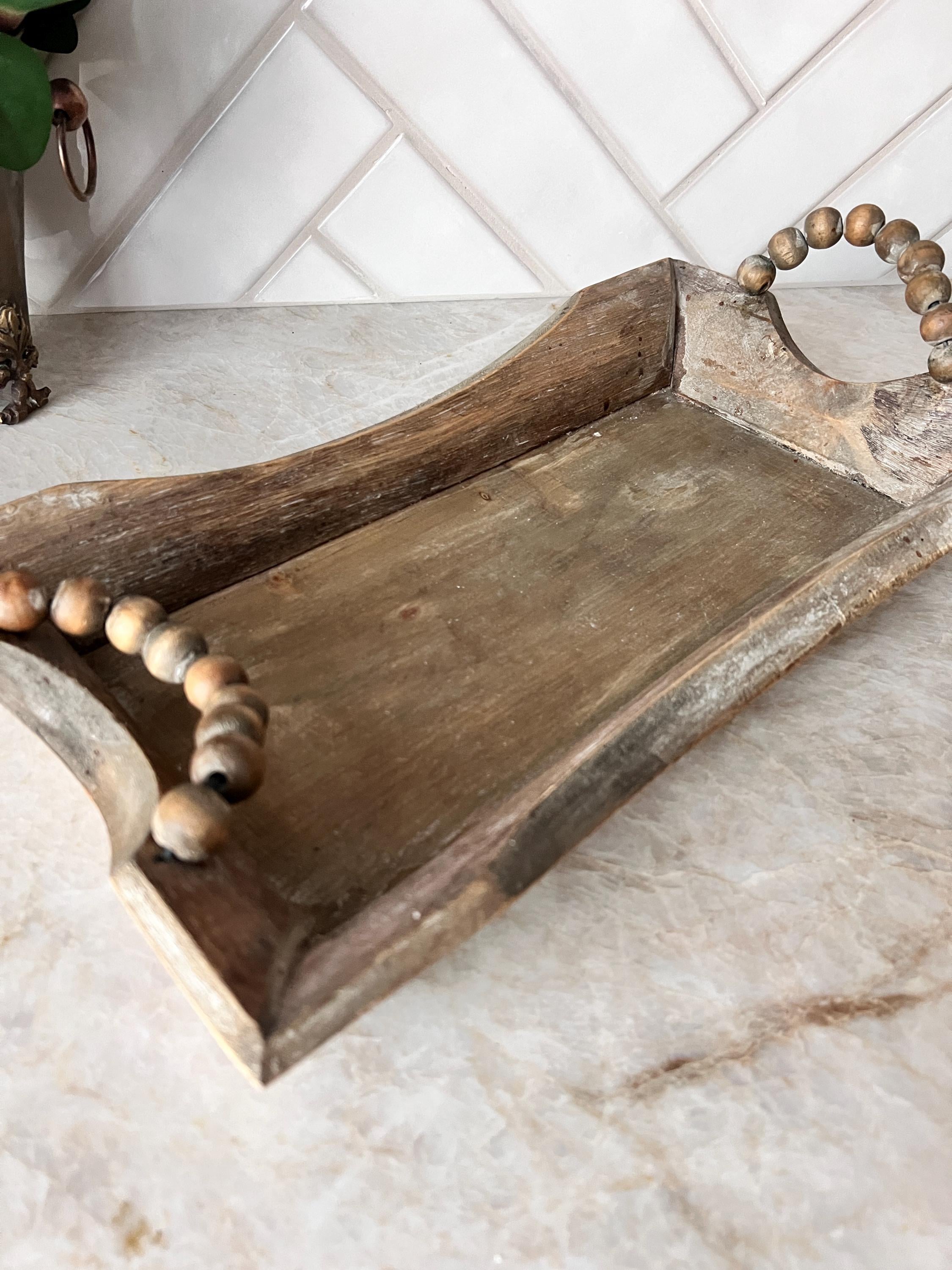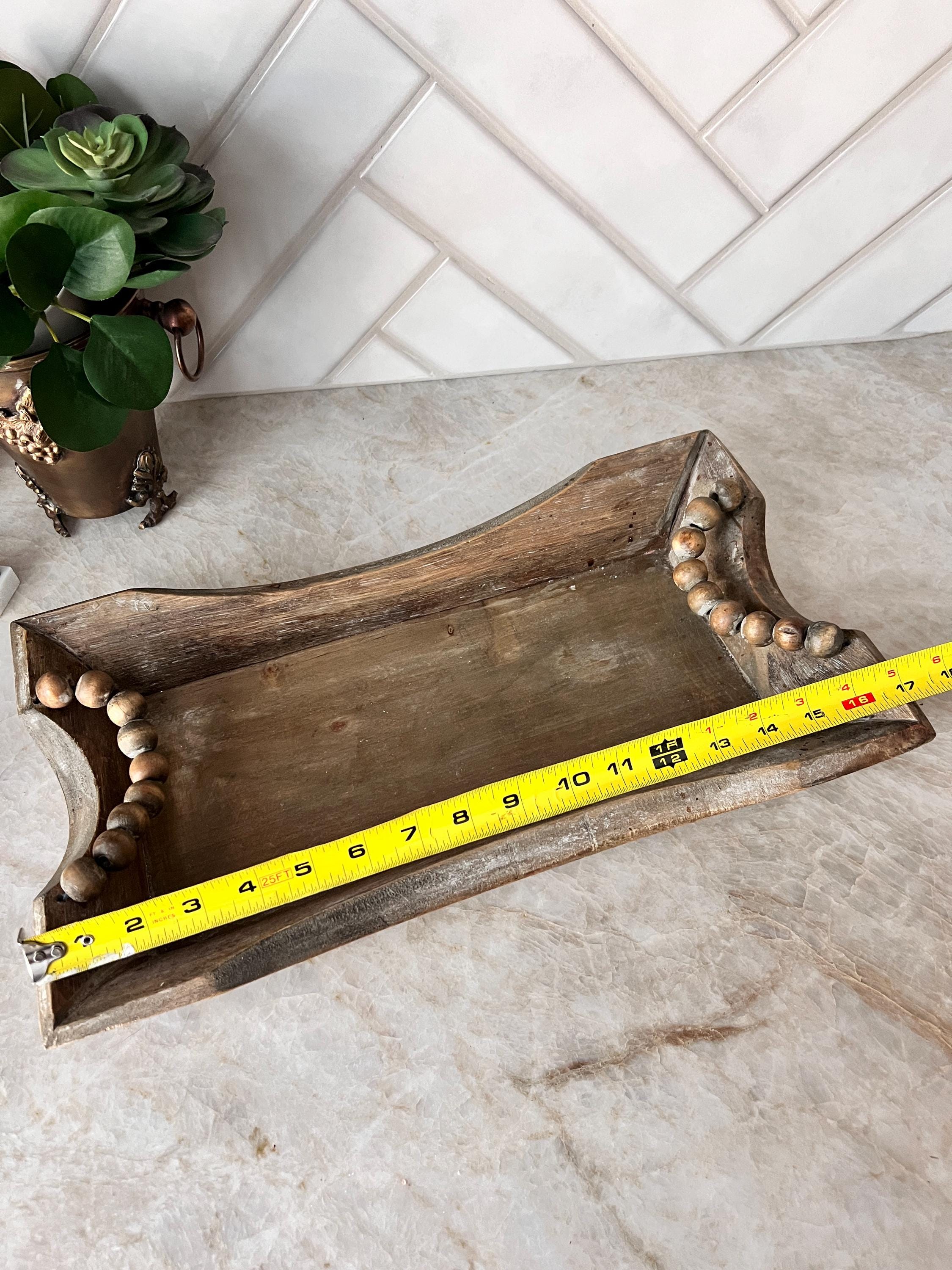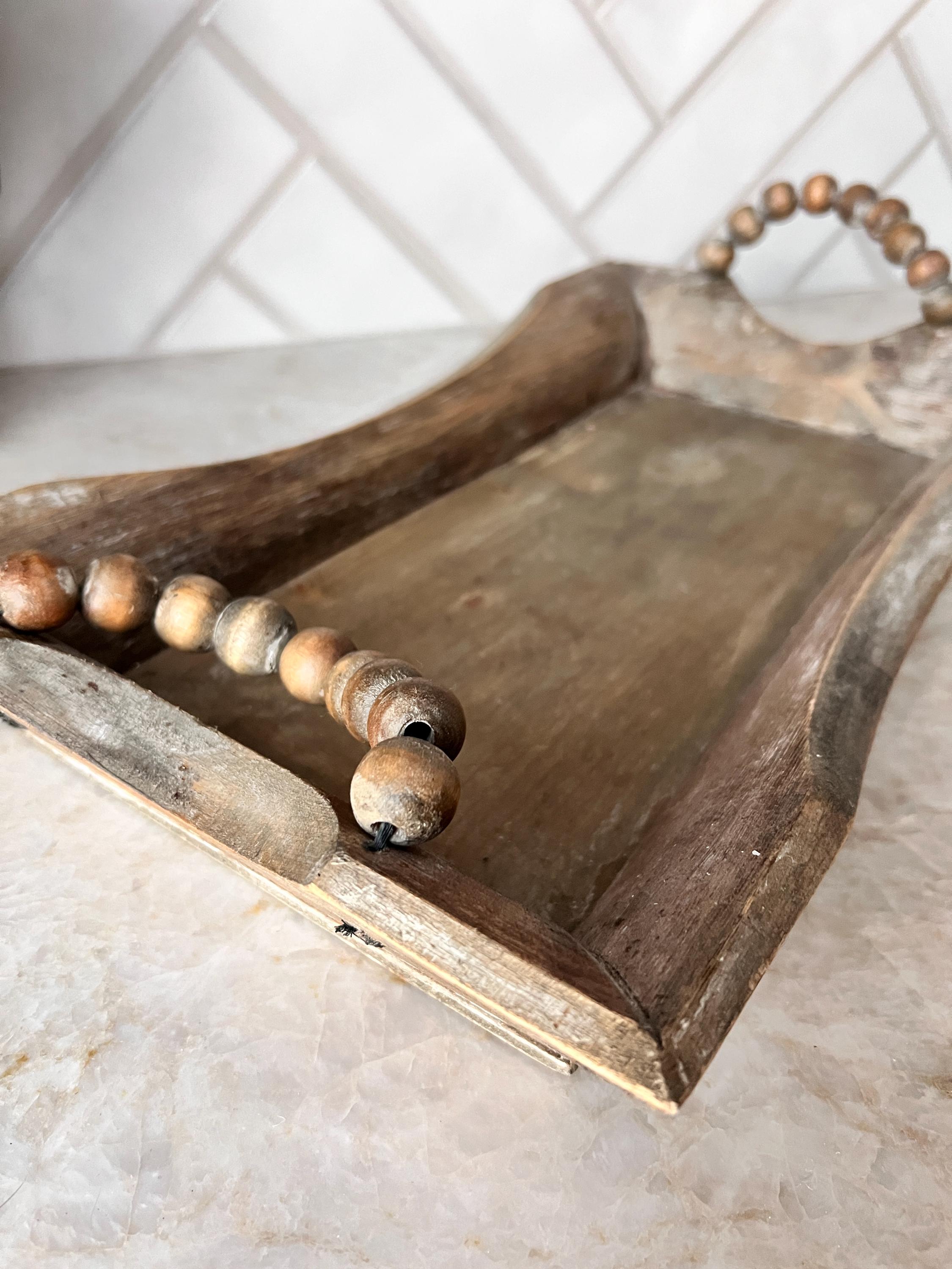 Add texture and charm to your home with this rustic wooden tray featuring curved sides and chunky wooden beaded handles. Perfect for serving drinks, organizing a coffee table, or styling with candles and seasonal décor. Its distressed wood finish gives it that warm, timeworn feel that blends beautifully with farmhouse, boho, or neutral home aesthetics.