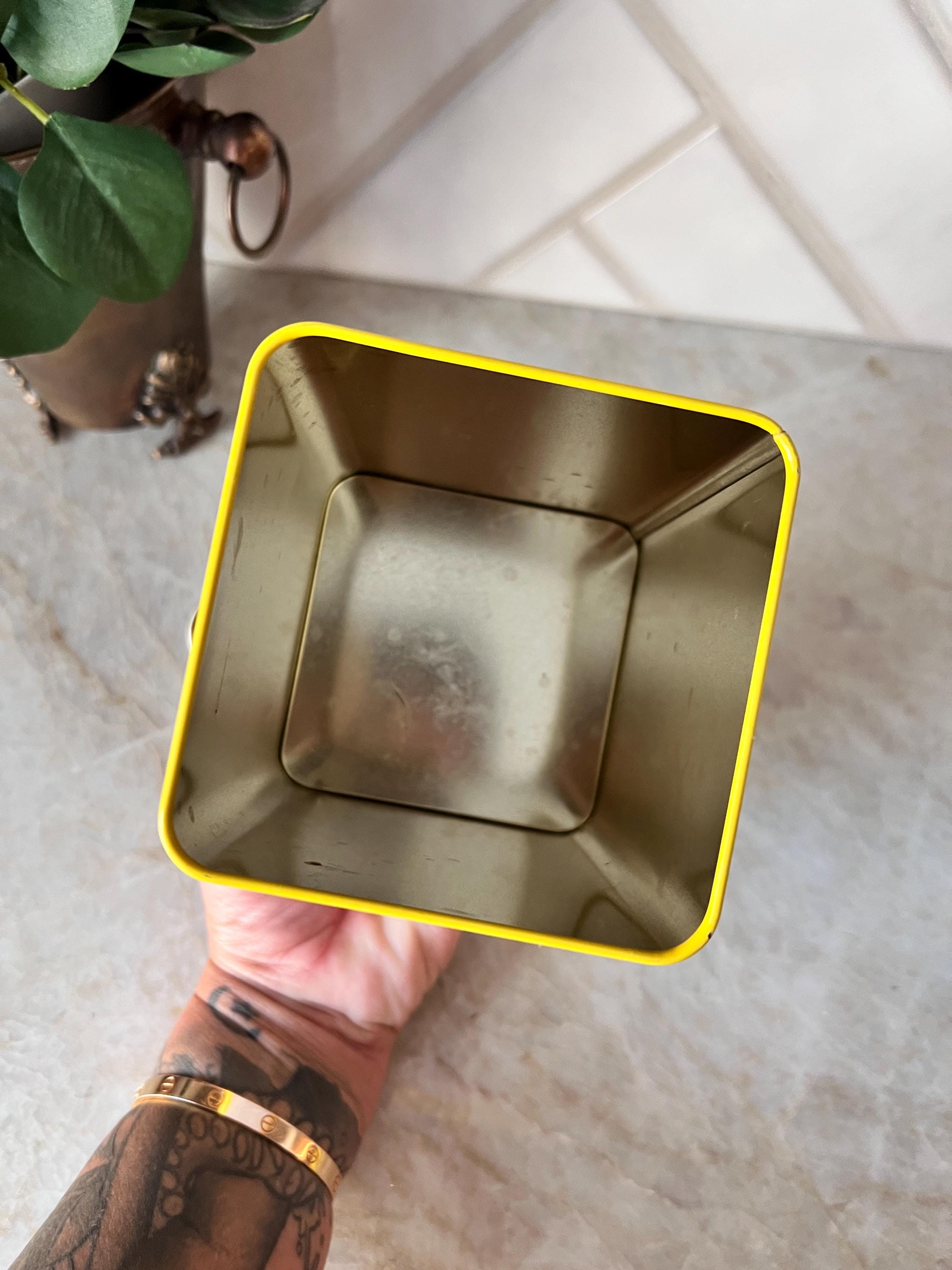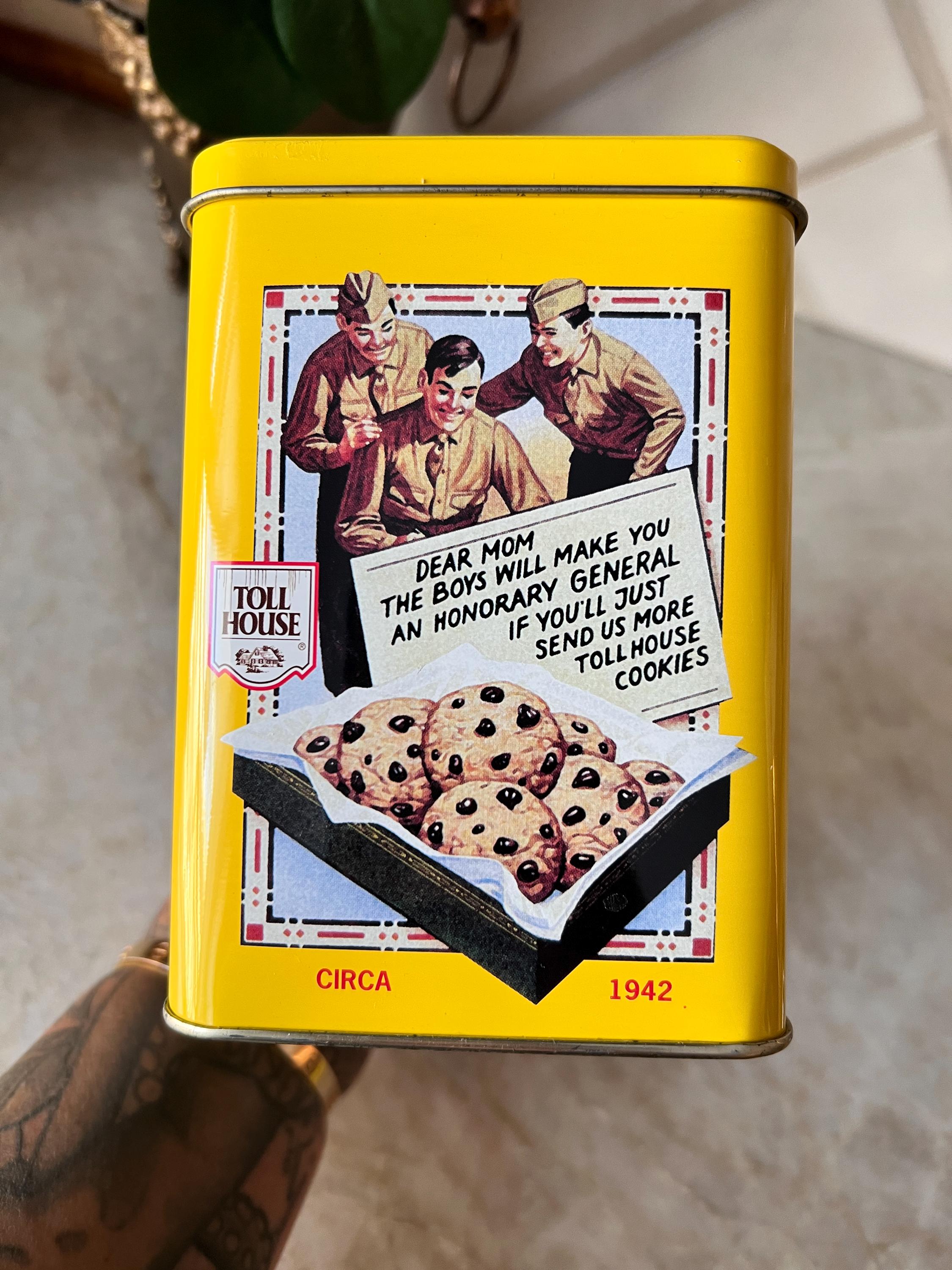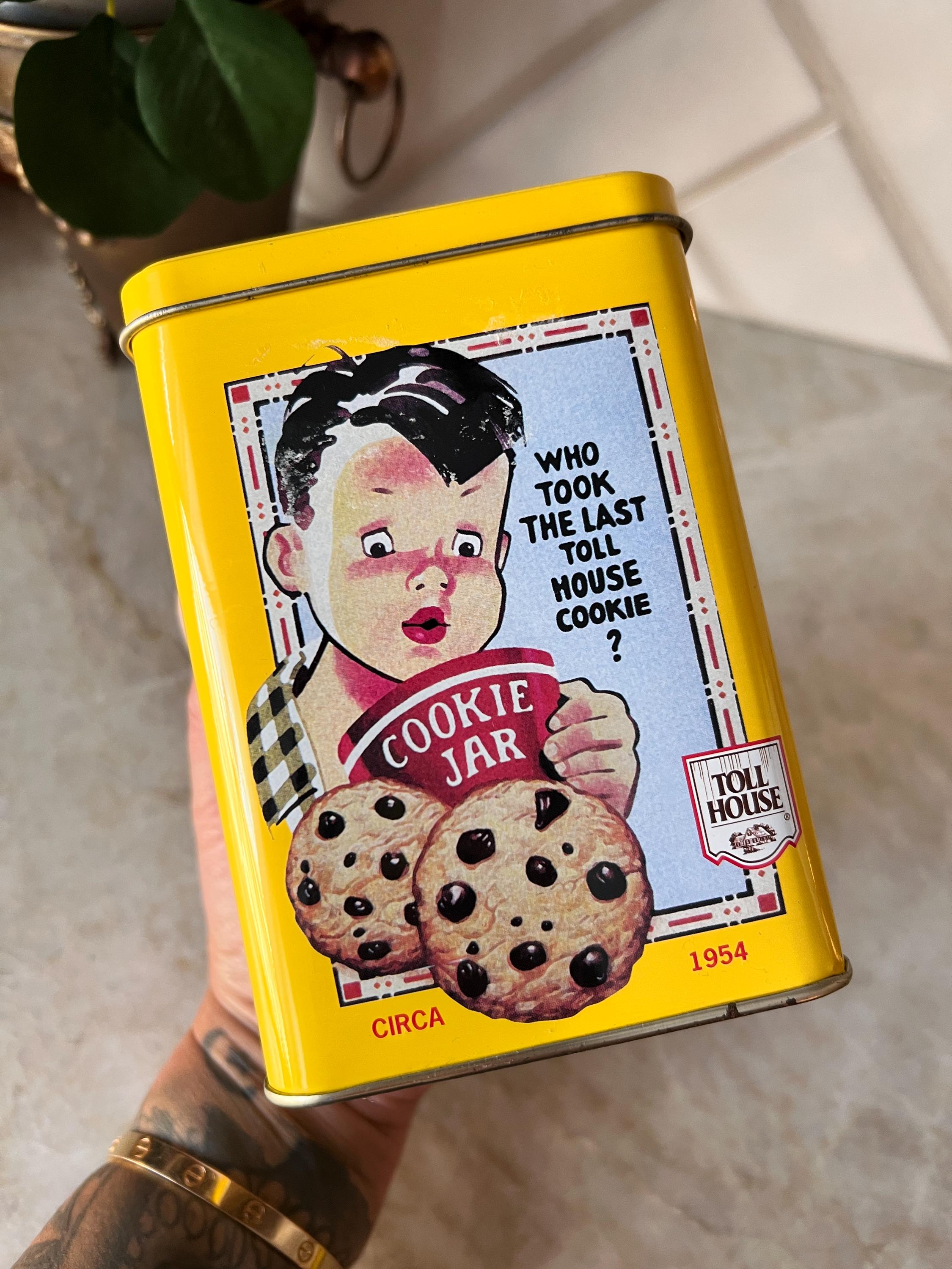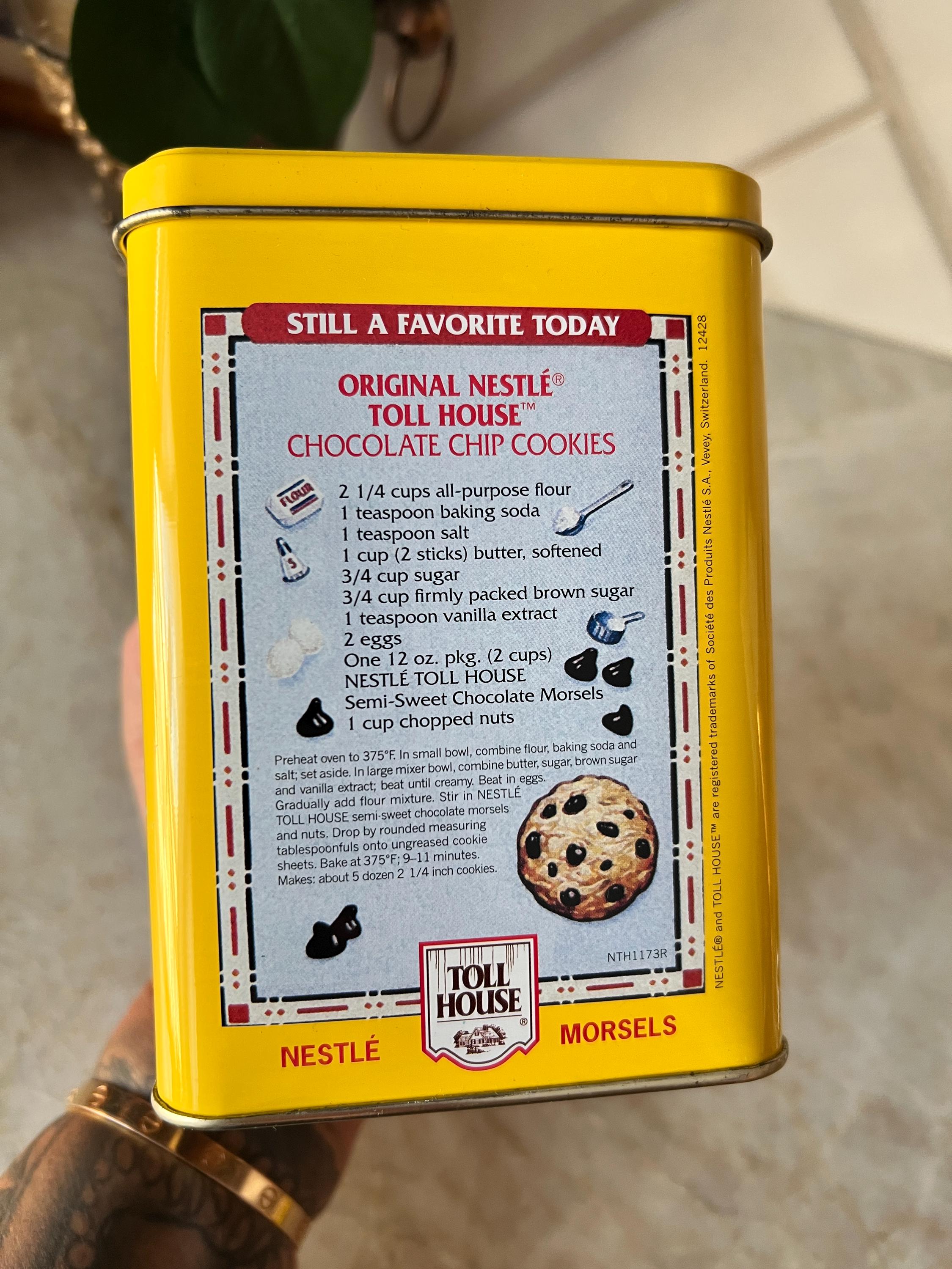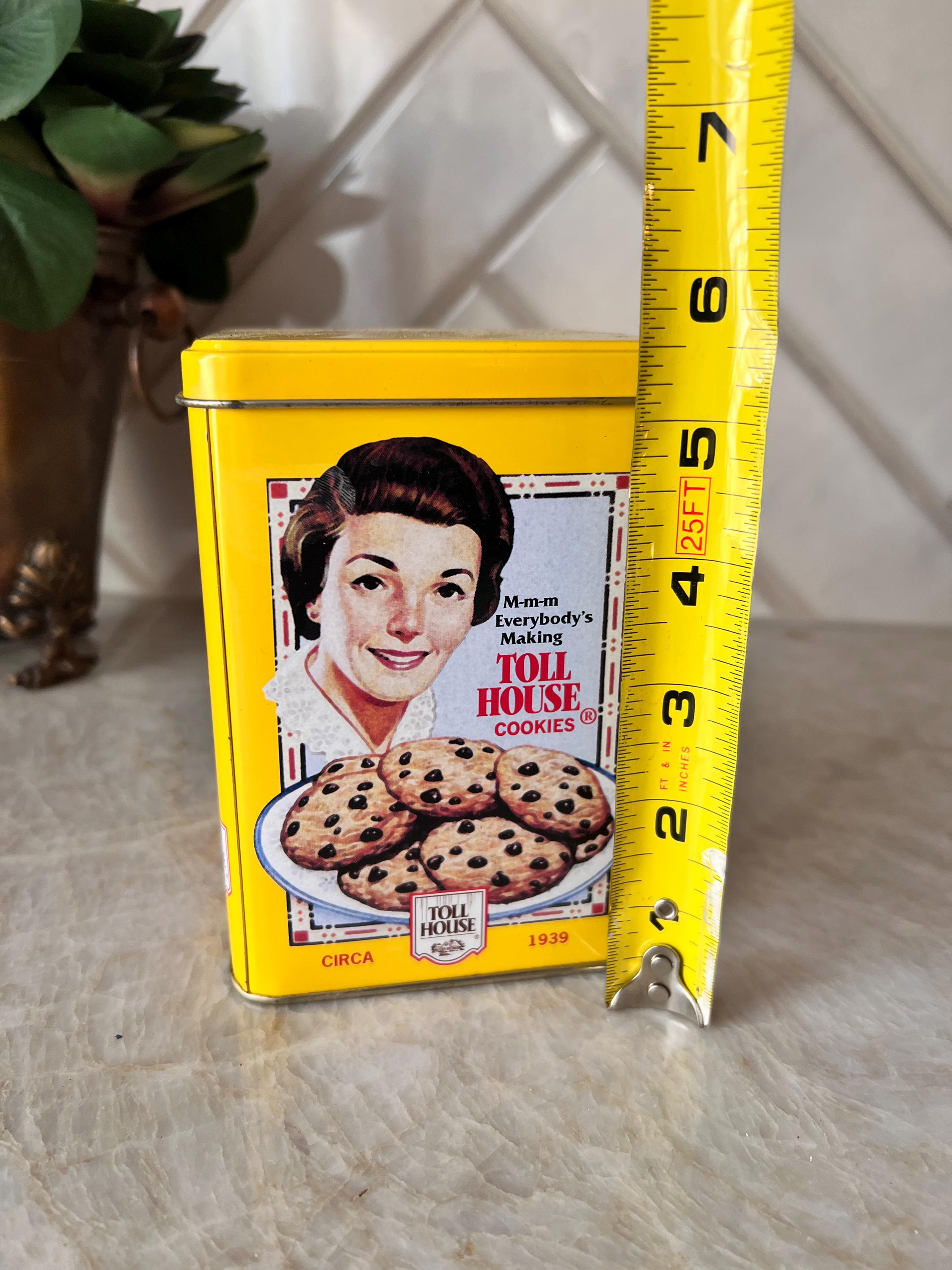 Step back in time with this cheerful vintage Nestlé Toll House cookie tin, a tribute to the iconic chocolate chip cookie recipe introduced in 1939. Featuring a bright yellow finish and nostalgic retro artwork of a smiling 1950s-style homemaker alongside a tempting plate of cookies, this collectible tin is both charming and practical.