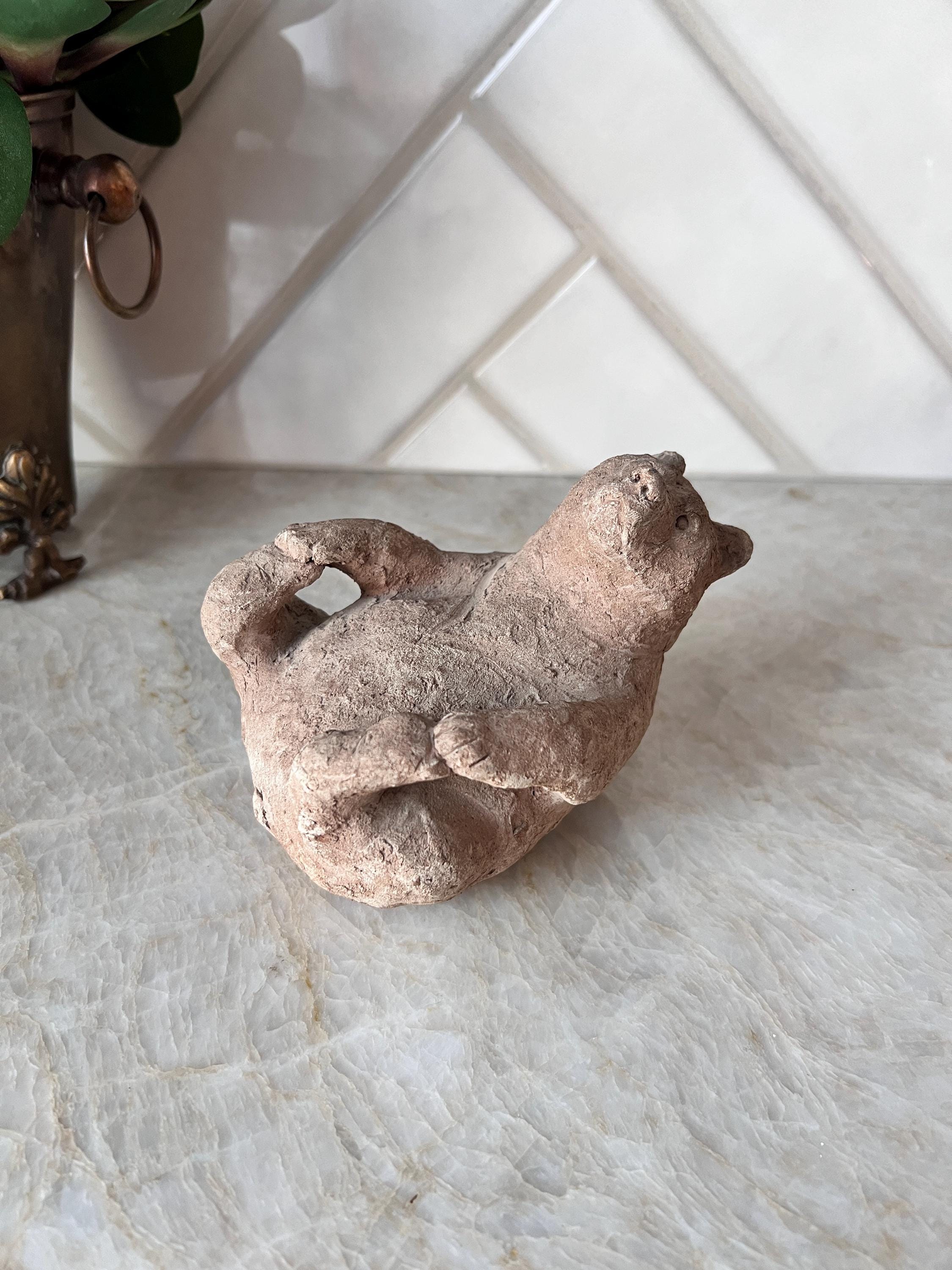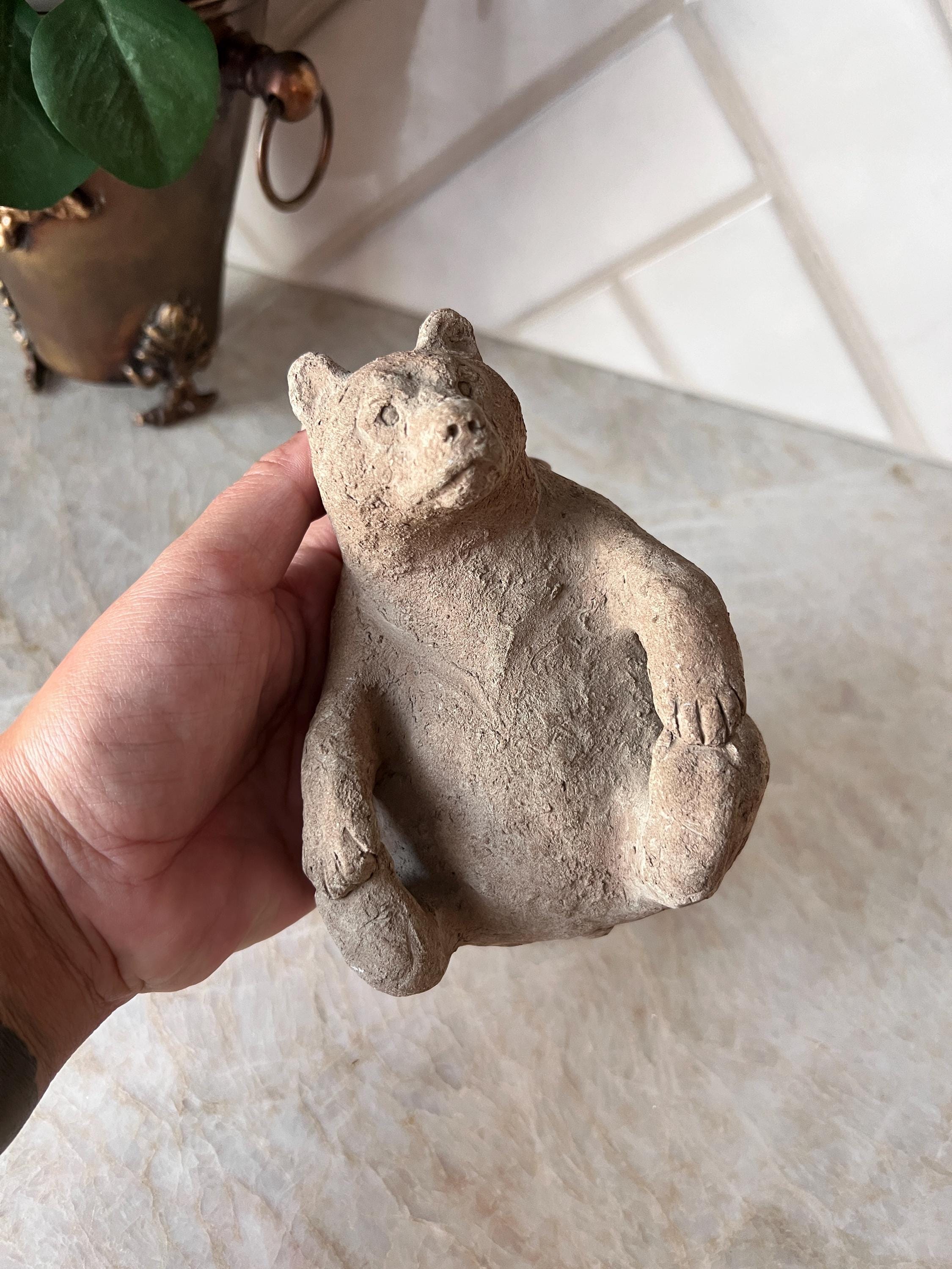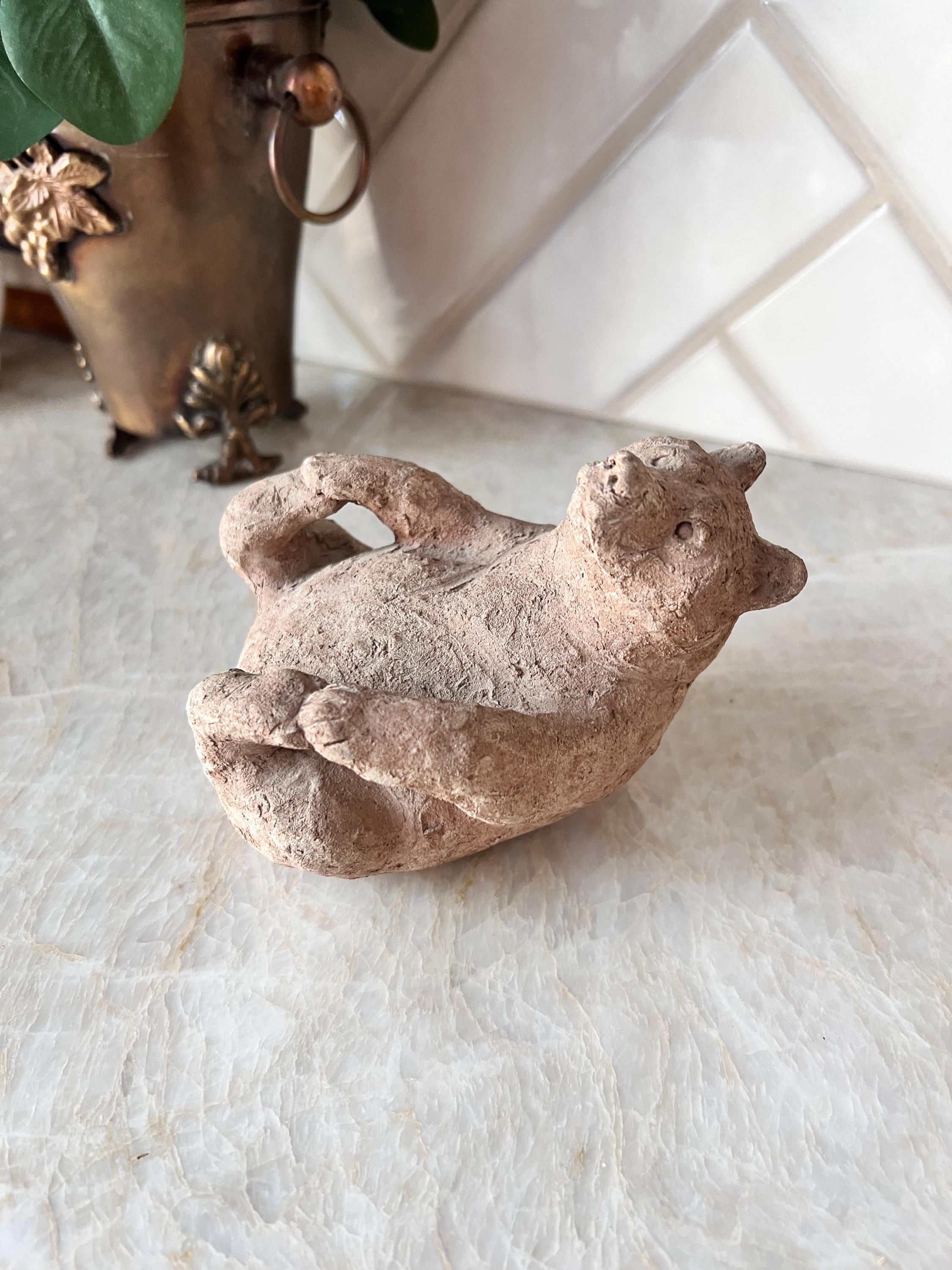 This charming vintage Scandinavian bear sculpture brings the warmth and whimsy of Nordic folk art to your space. Hand-formed from natural clay, this small reclining bear features primitive detailing and a rustic finish that highlights its handmade character. Whether you’re styling a woodland nursery, a cozy cabin shelf, or a Scandinavian-inspired vignette, this little creature adds personality and storytelling charm.
