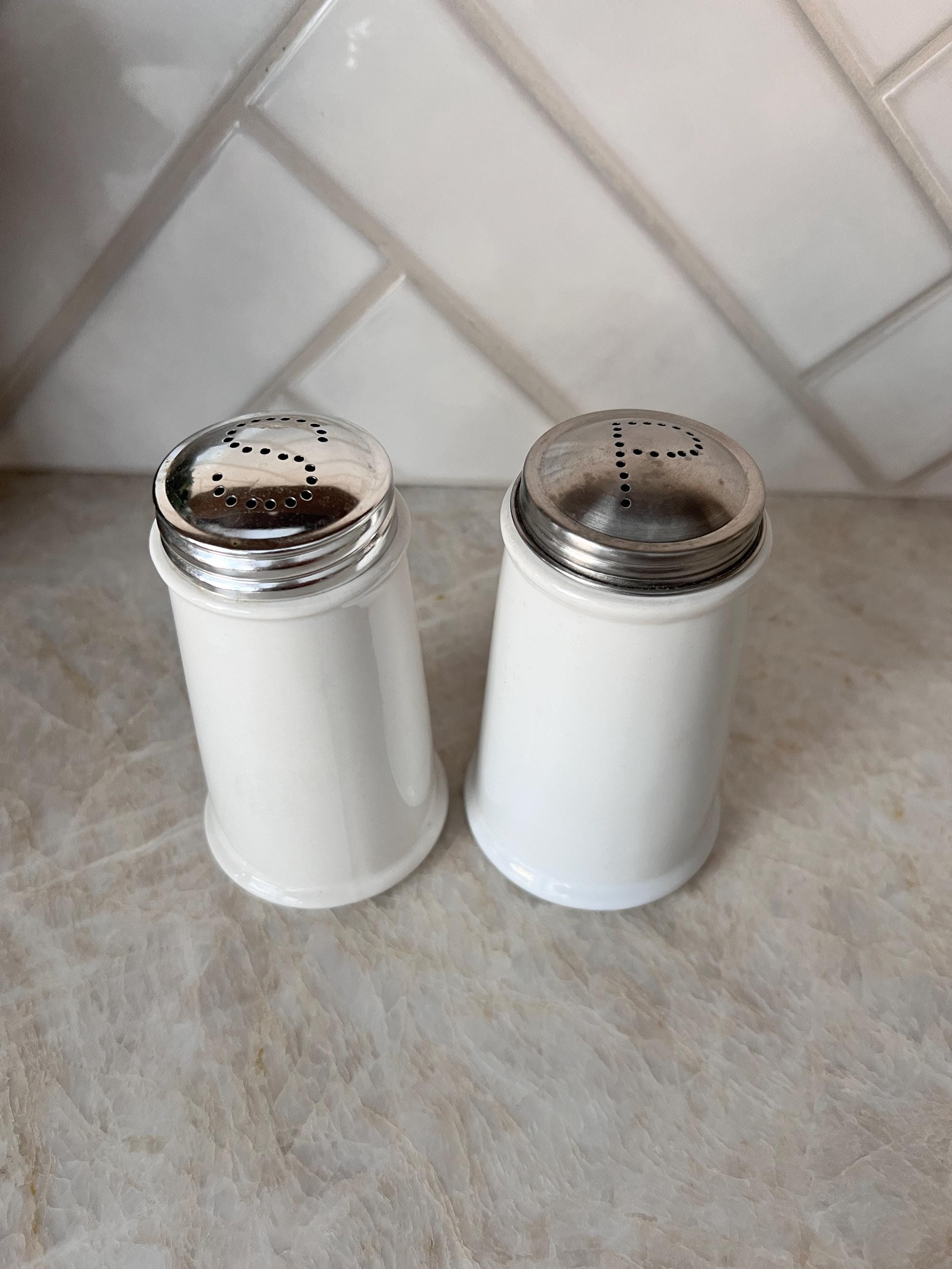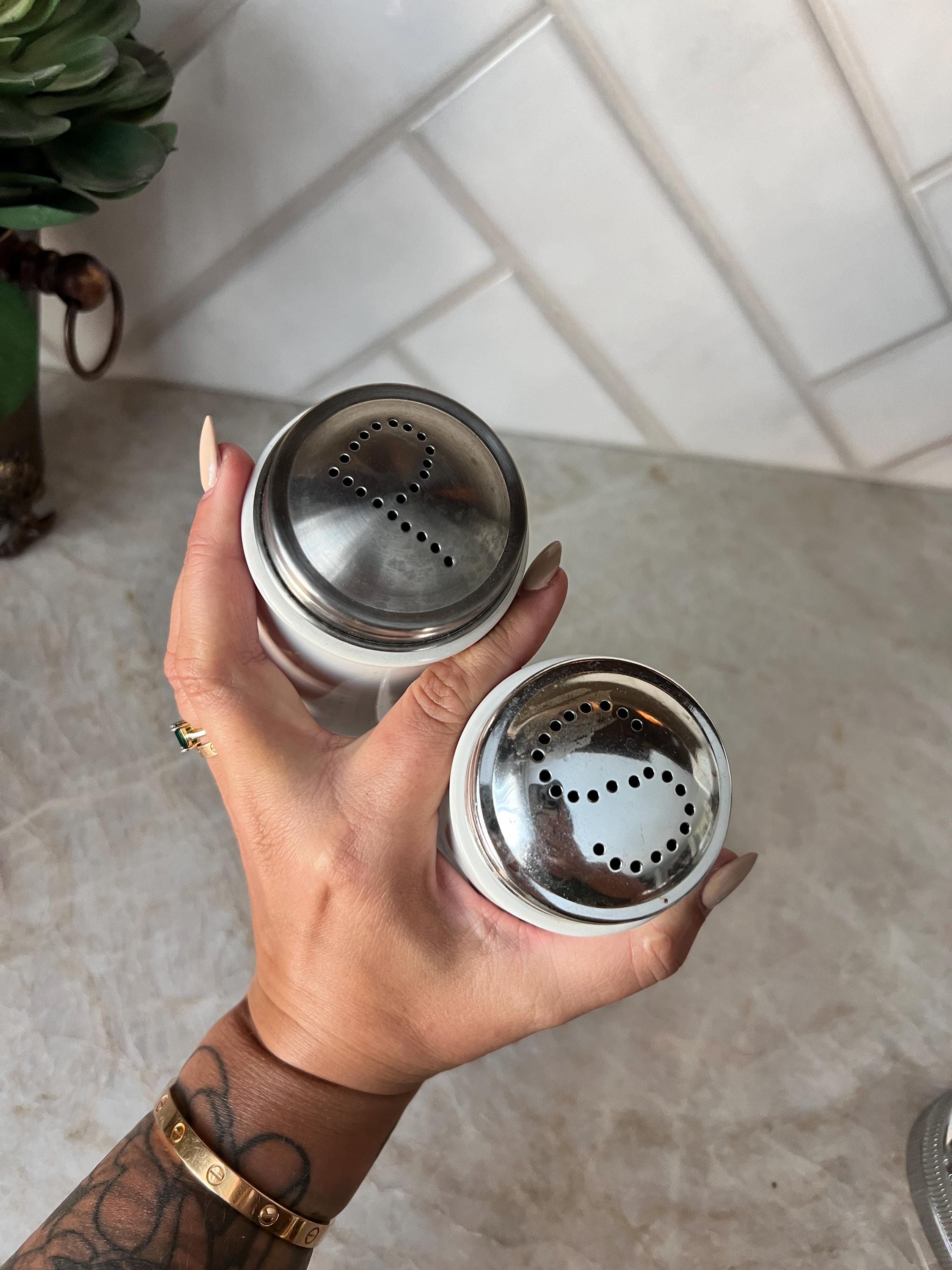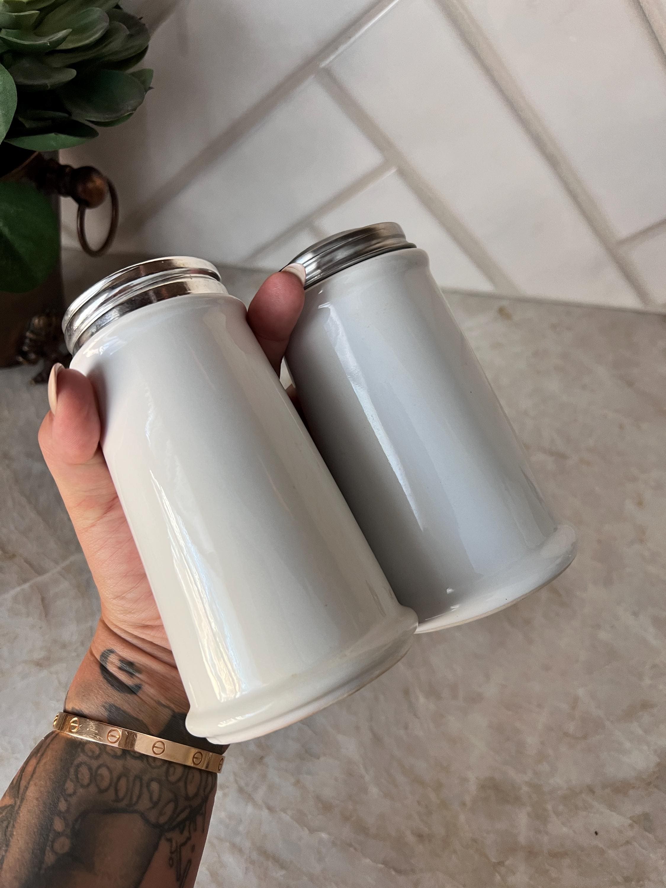 Add timeless charm to your table with this classic pair of vintage white porcelain salt and pepper shakers, featuring sleek chrome tops marked with a "P" and "S." Their clean, minimalist design makes them a versatile addition to farmhouse, cottagecore, or mid-century modern kitchens. Functional yet stylish, these are ideal for collectors, food stylists, or anyone who appreciates vintage kitchenware with a subtle statement.