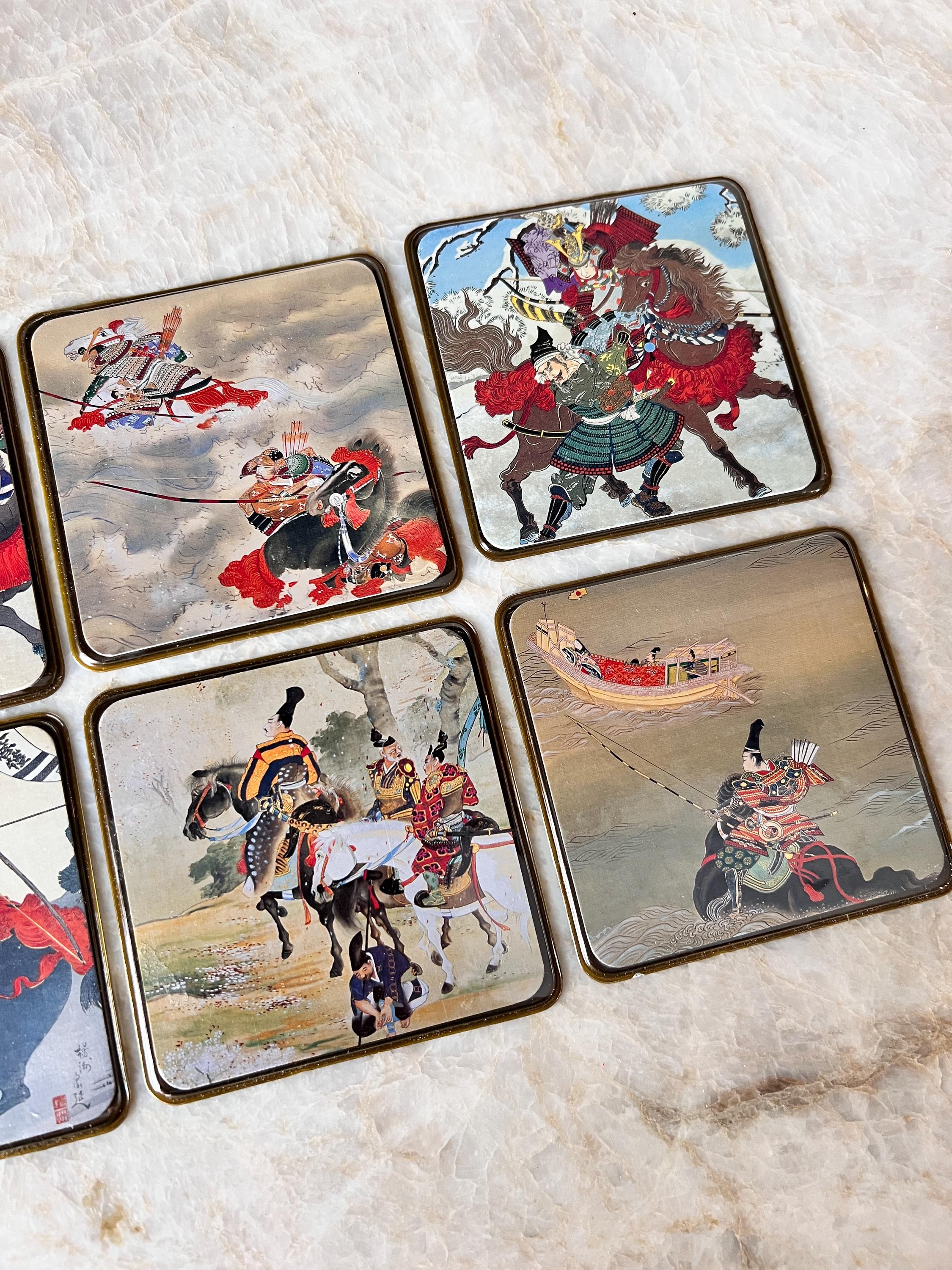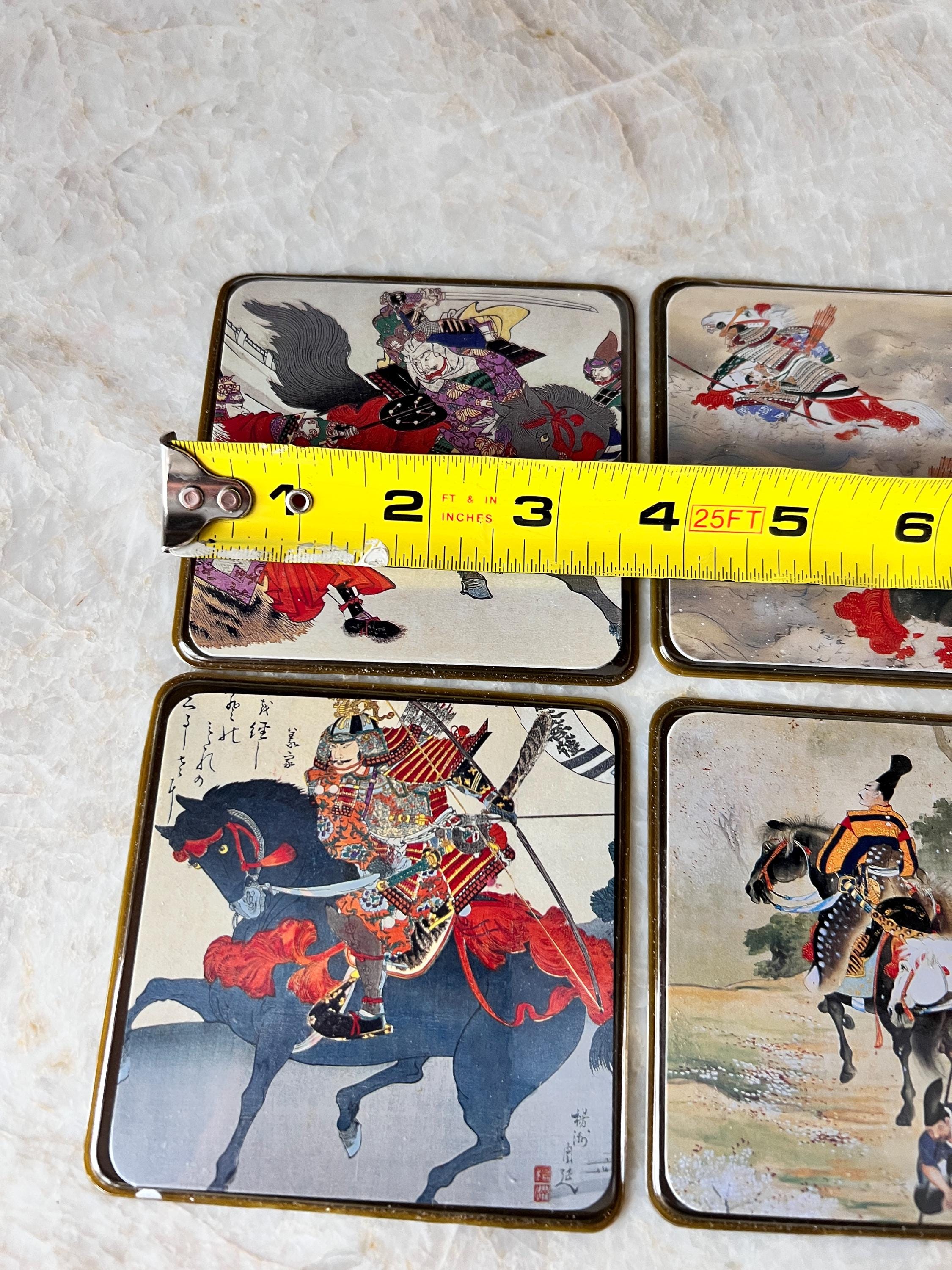 This striking set of 6 vintage Japanese drink coasters features traditional samurai warrior scenes in vibrant, detailed artwork. Each coaster depicts a unique battle moment or warrior portrait, showcasing mounted archers, sword-wielding fighters, and iconic feudal Japan imagery. These square coasters are trimmed in gold tone and made from a durable laminate material, ideal for functional use or as decorative accents.