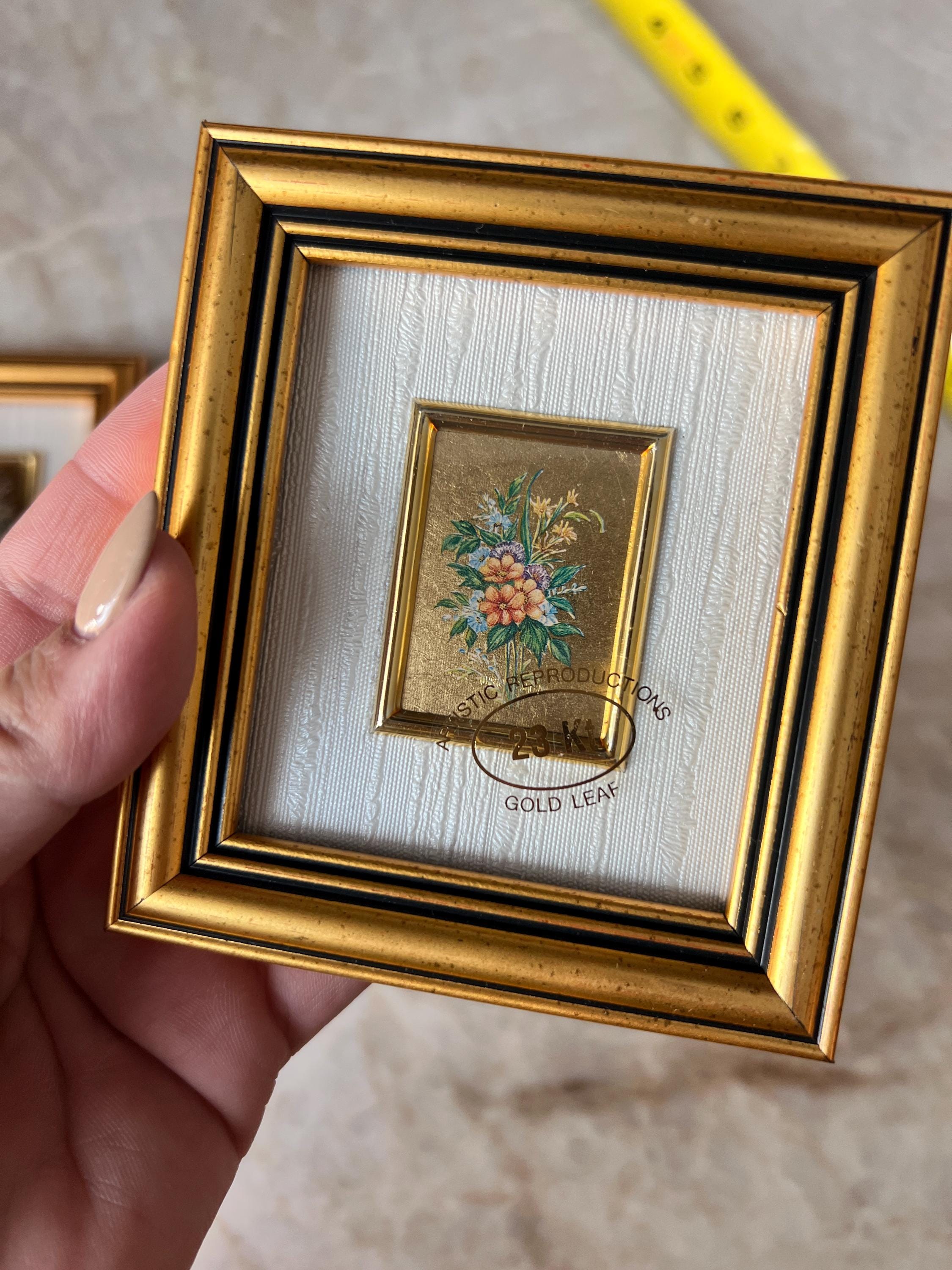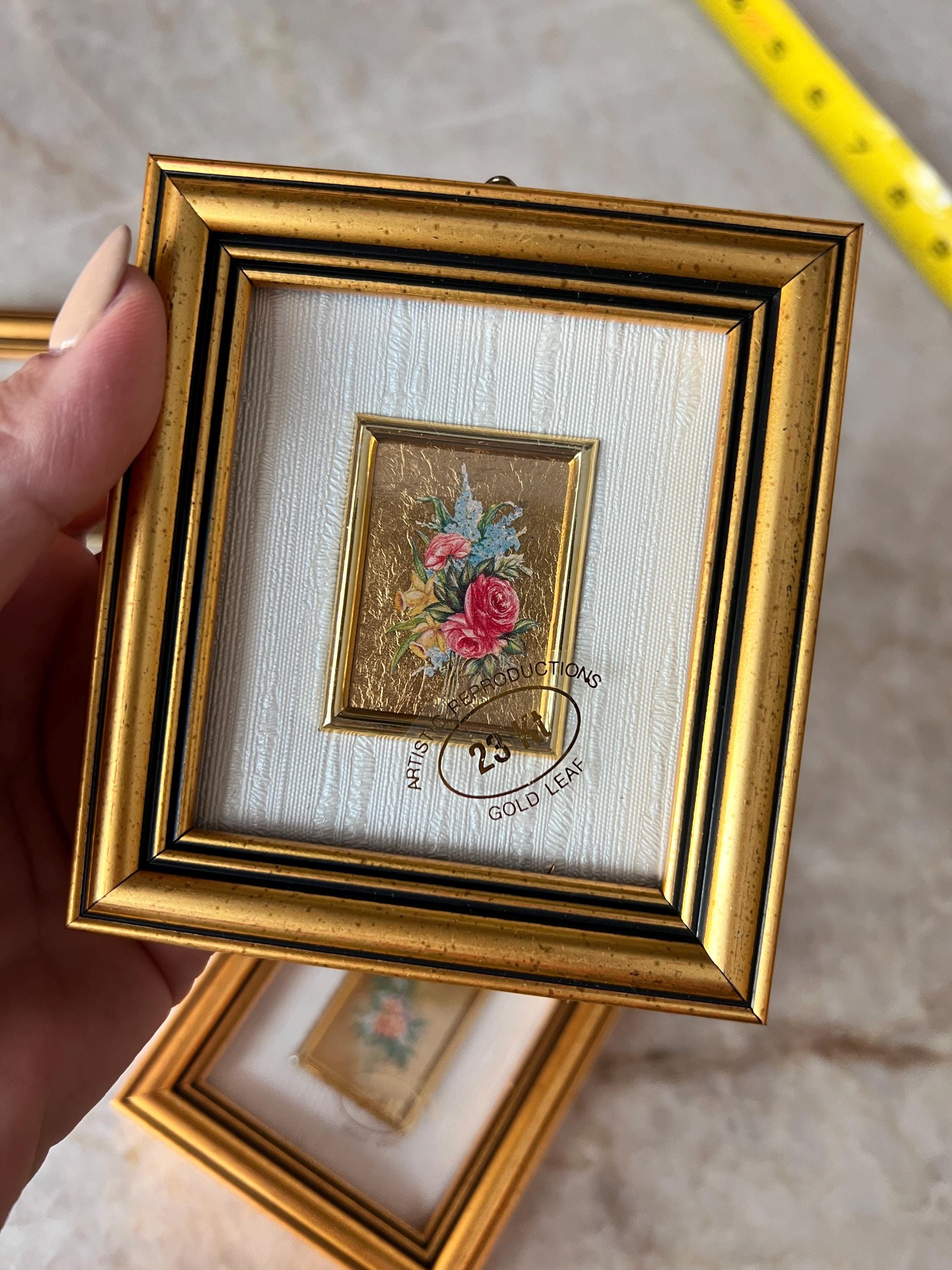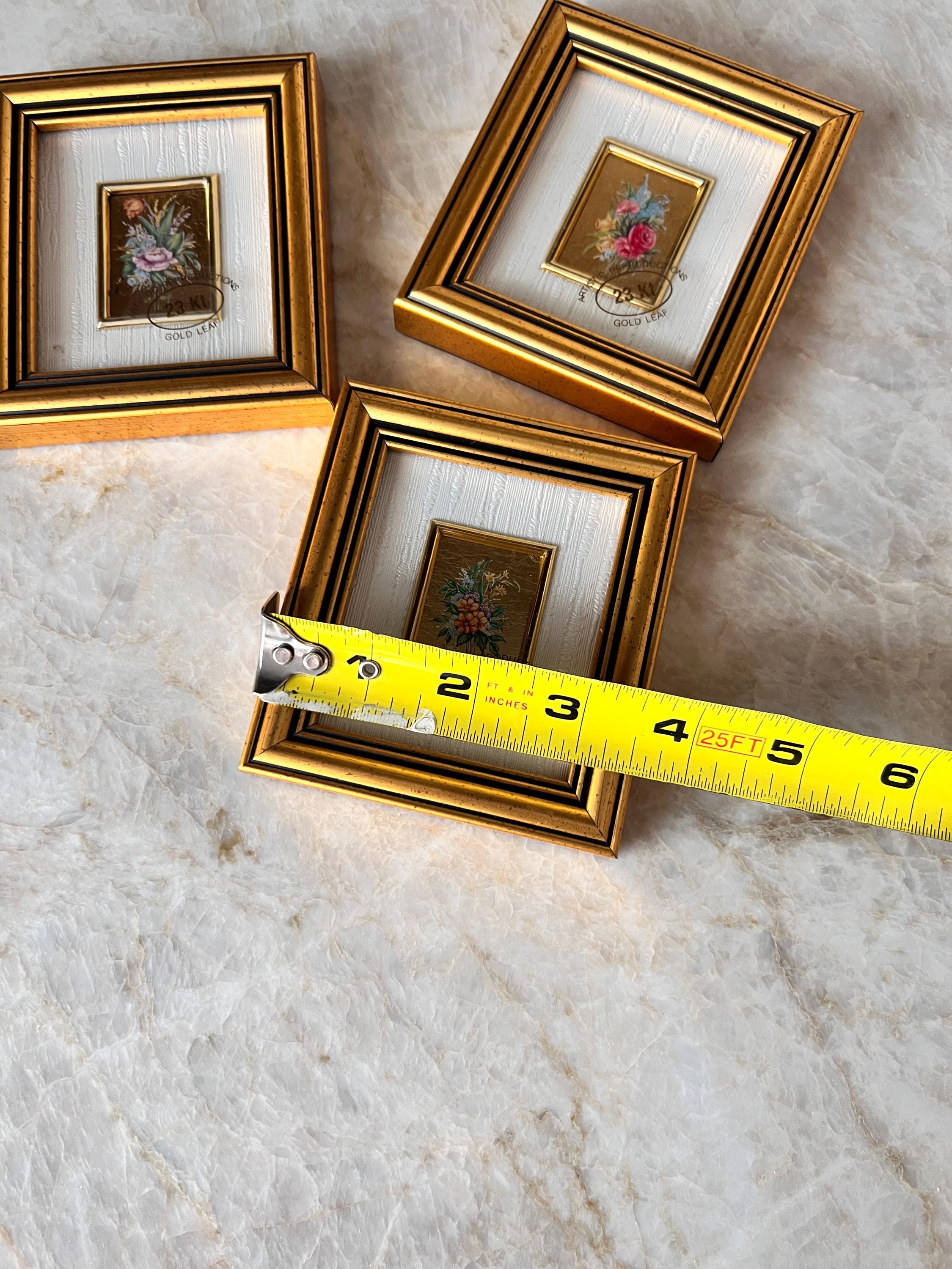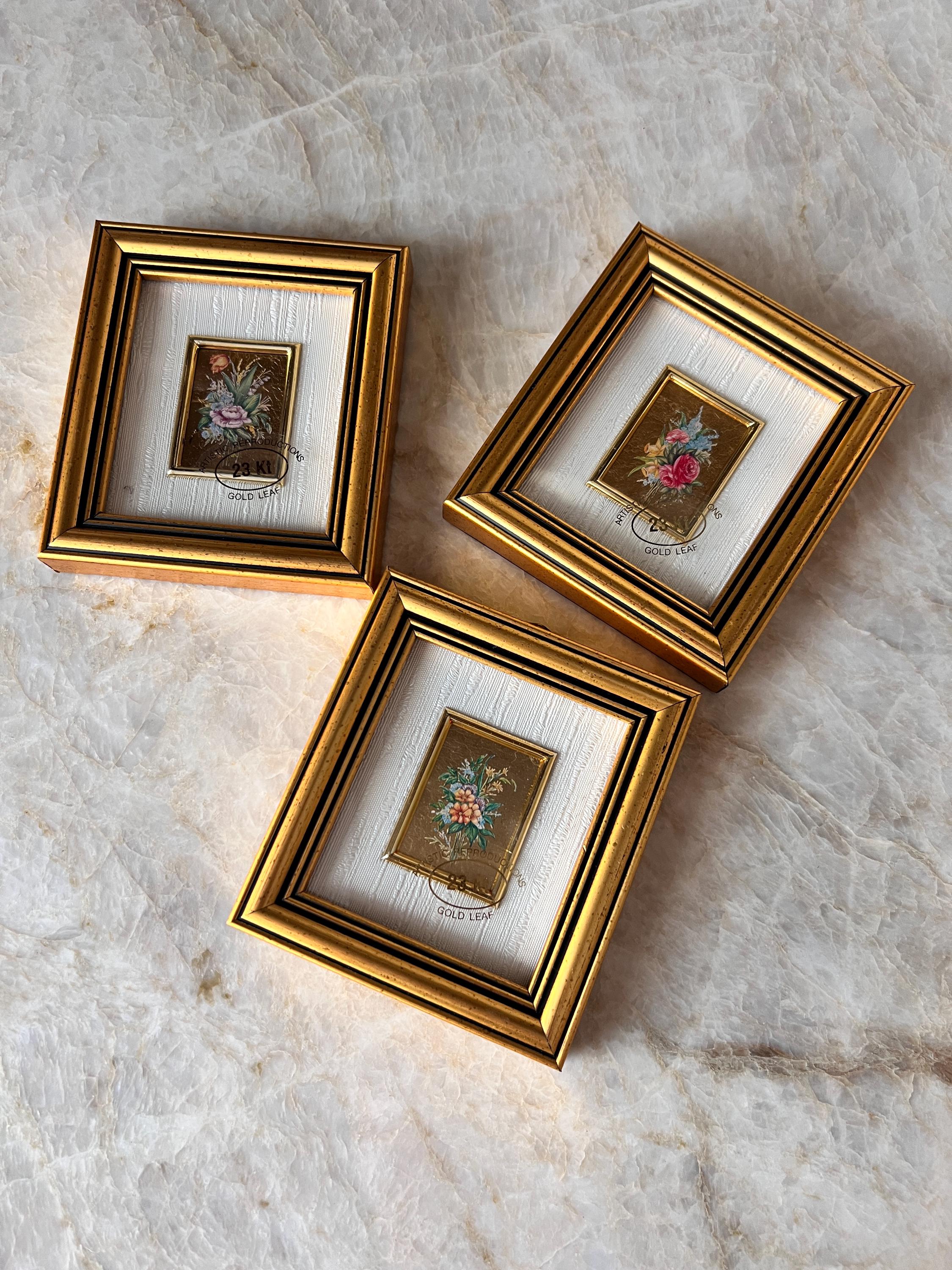 Add a touch of elegance to your space with this stunning set of three framed miniature floral paintings, each certified with 23K gold leaf. These petite works of art feature hand-painted florals on gold backgrounds, set in ornate golden frames with textured linen matting. A timeless accent for traditional, French country, or grand-millennial decor.