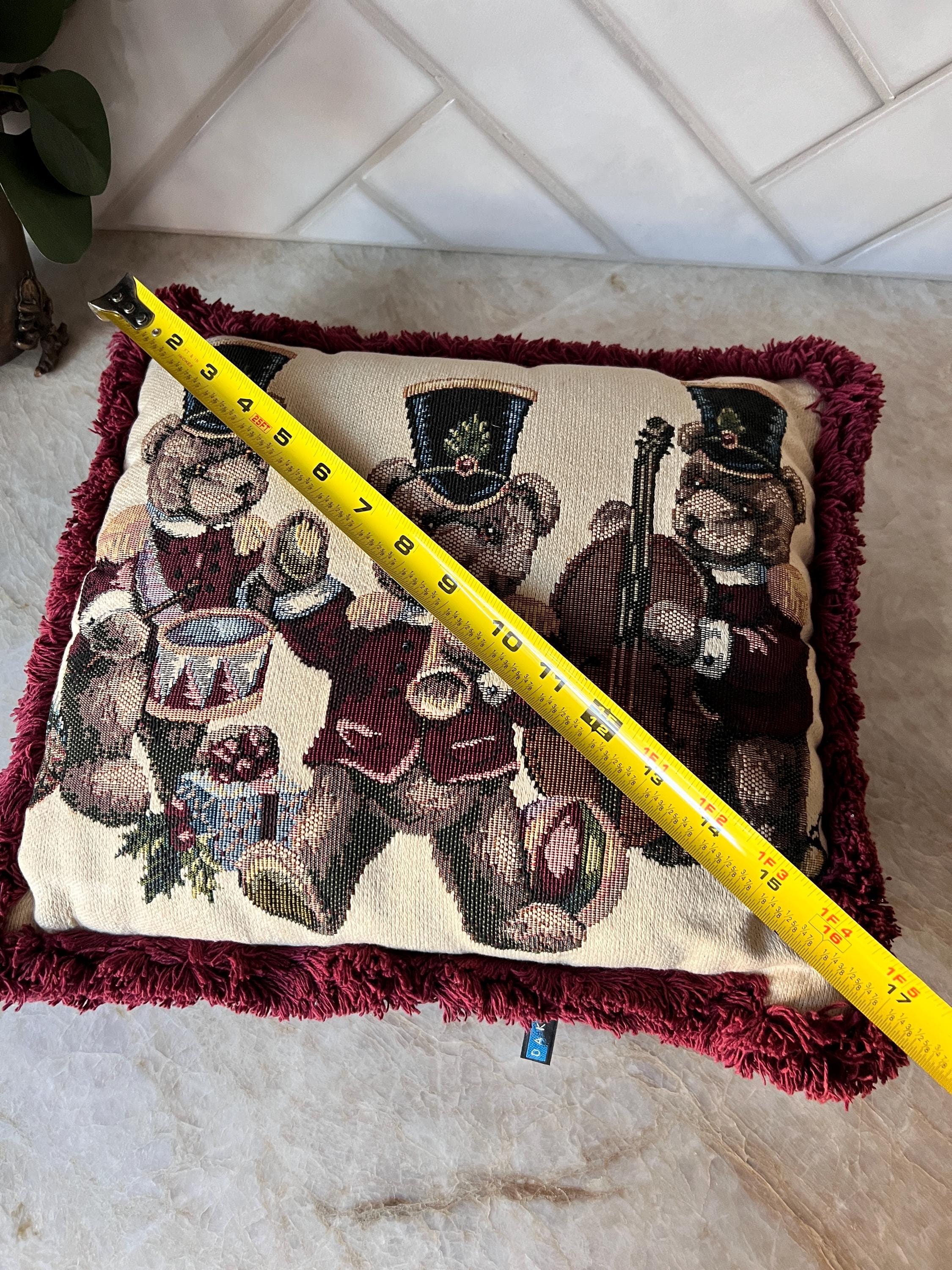 Add festive charm to your holiday décor with this vintage Dakota tapestry pillow featuring an adorable teddy bear band dressed in classic Christmas band uniforms. With deep red fringe trim and rich, muted tones, this piece channels the cozy elegance of Ralph Lauren holiday styling — perfect for a cottagecore Christmas, cabin retreat, or nostalgic Americana living room.