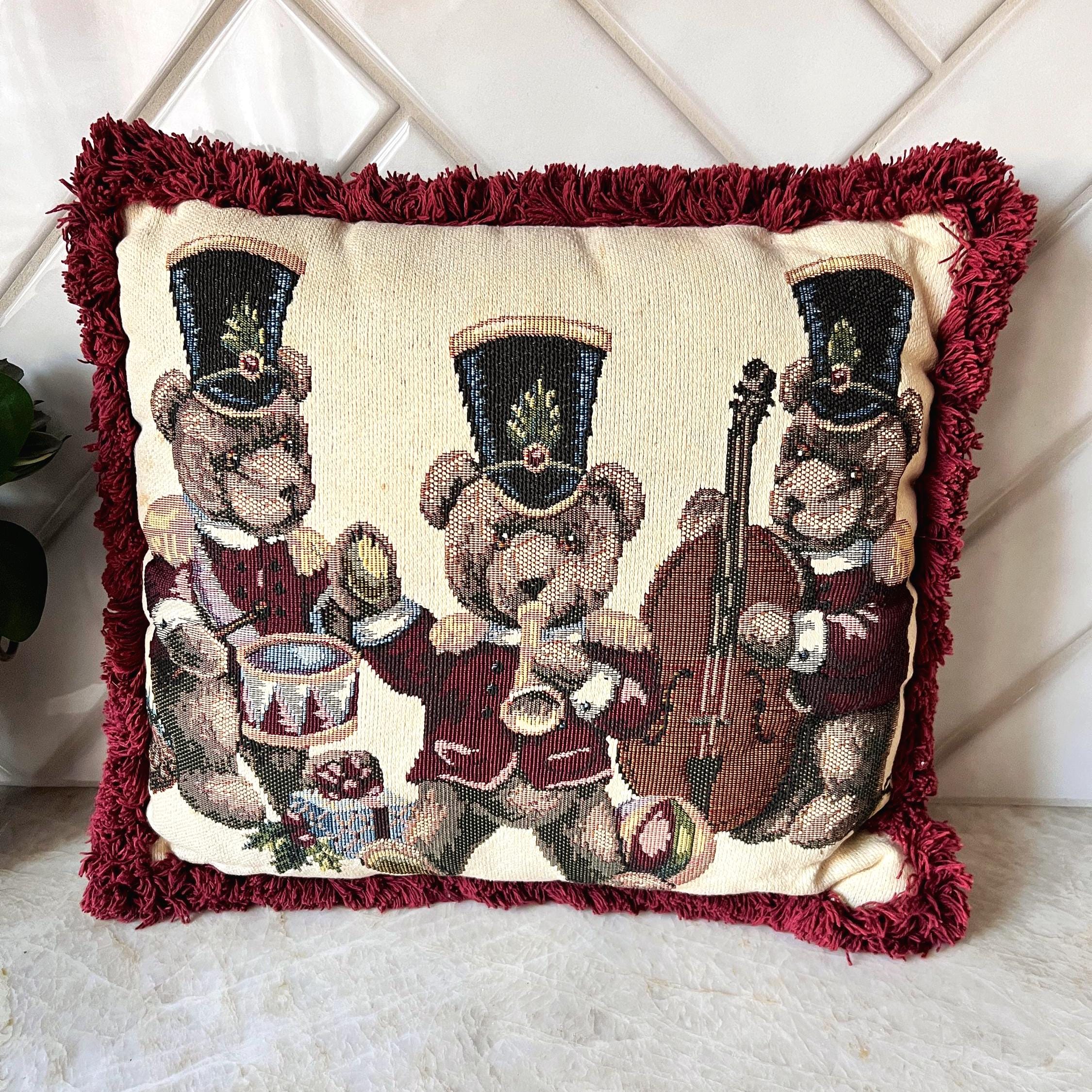 The woven tapestry front showcases three teddy bears playing instruments (drum, trumpet, cello), set against a neutral background for timeless holiday appeal. Backed in soft cotton with plush filling, this decorative pillow brings warmth and whimsy to sofas, armchairs, or guest bedrooms.