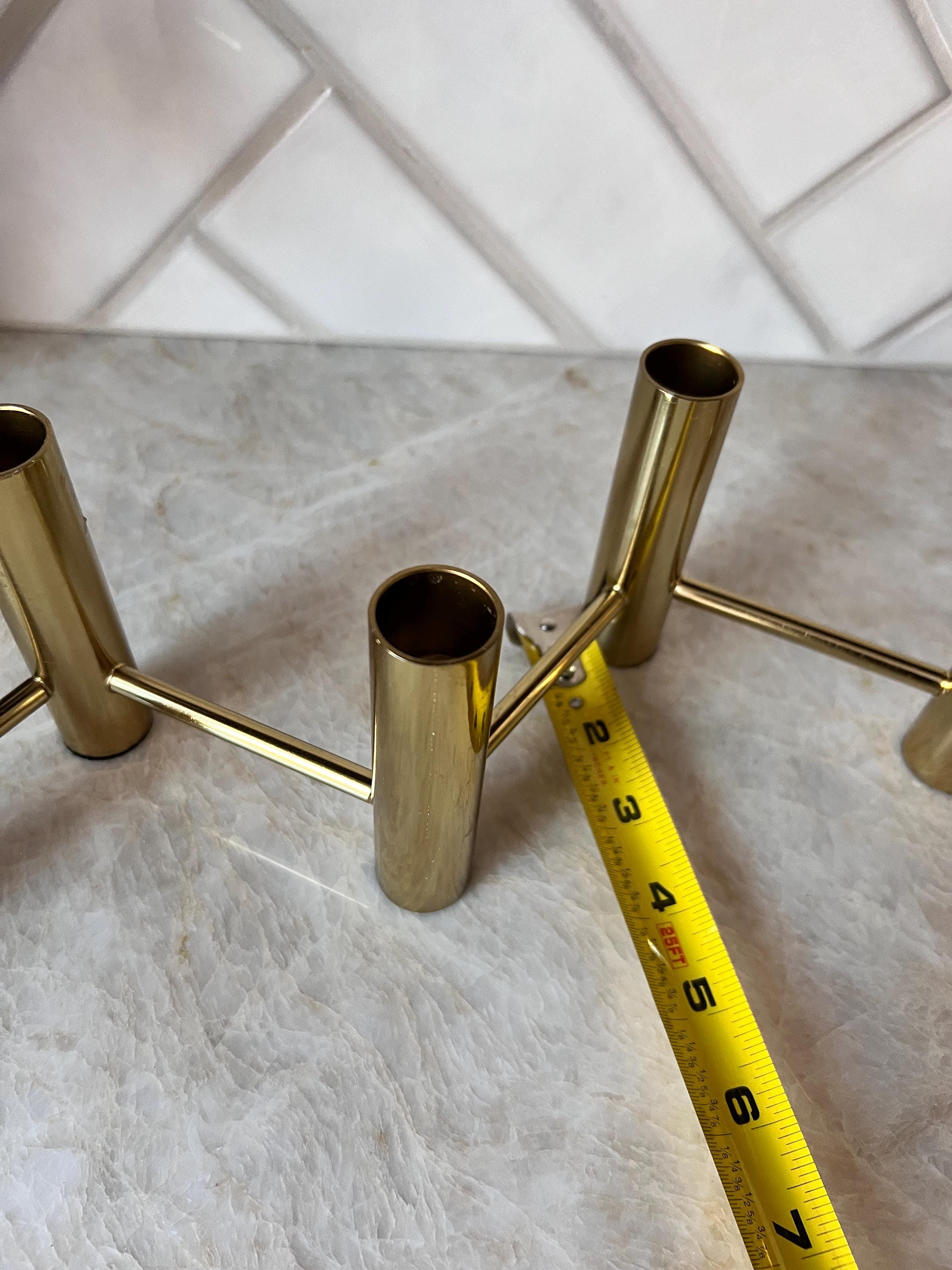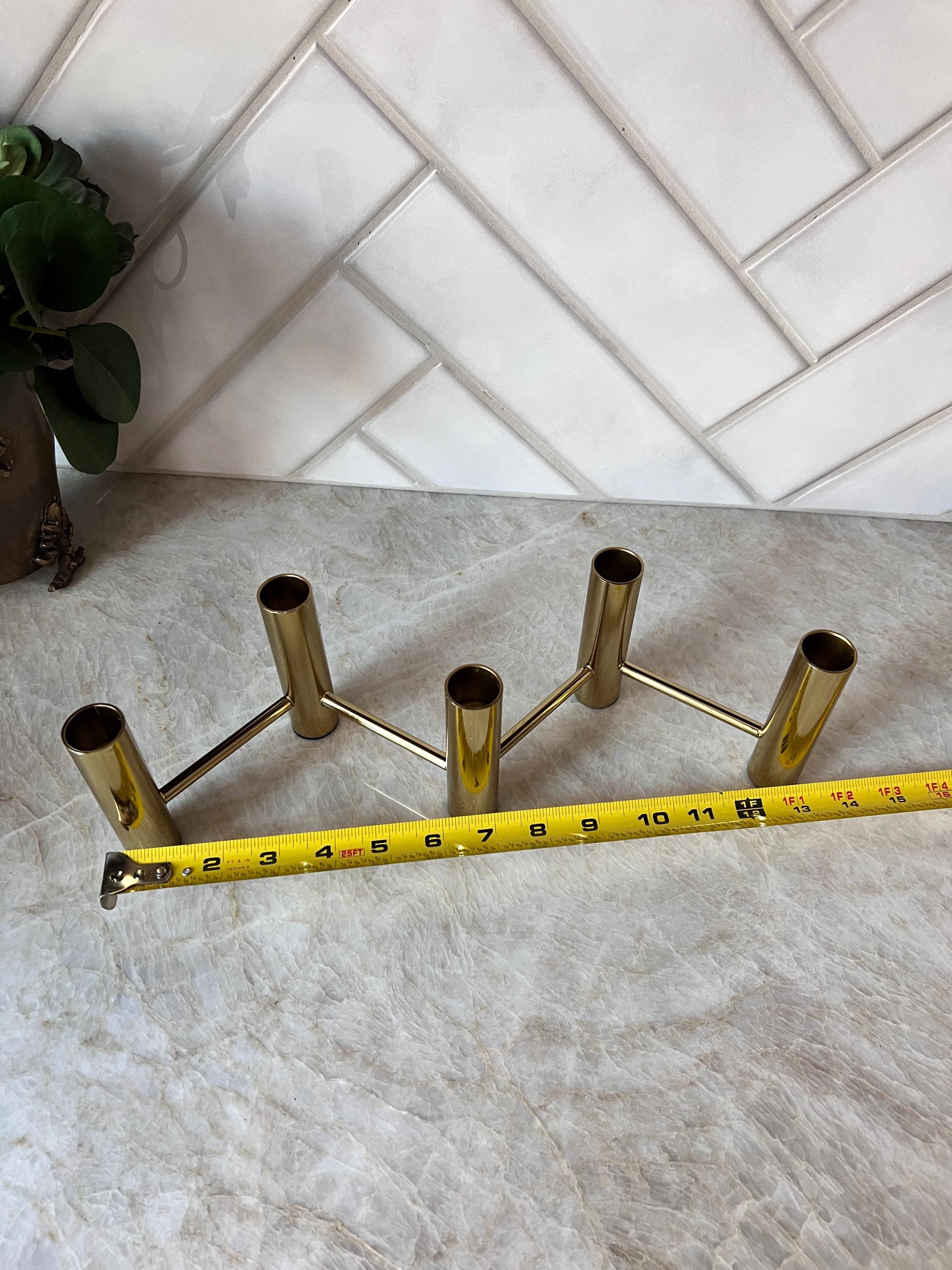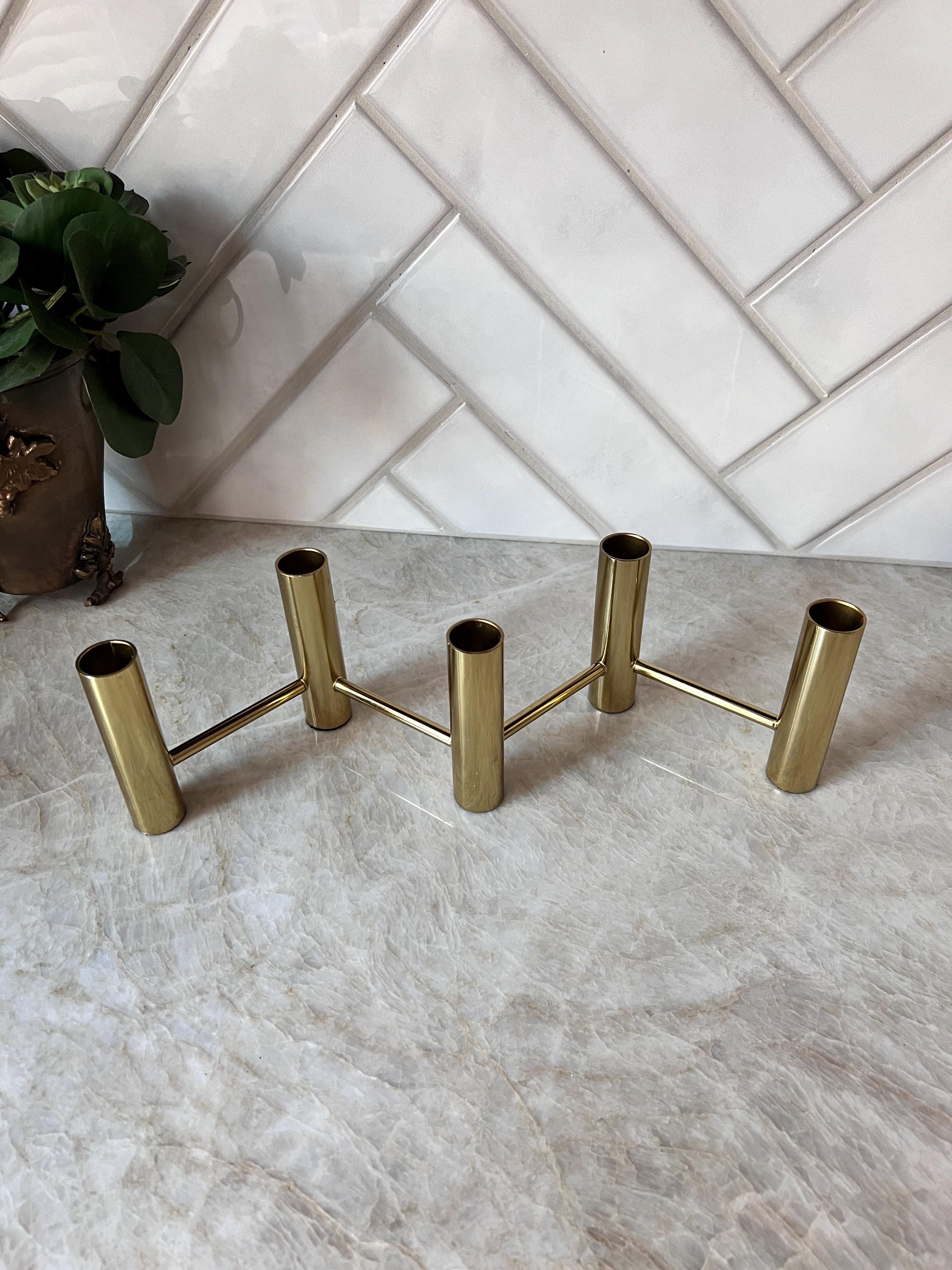 Elevate your table setting or mantel with this striking vintage brass 5‑candle holder centerpiece, featuring a sleek zig‑zag layout that creates a dynamic visual effect when lit. Crafted in a warm brass tone, this piece accommodates five standard taper candles and brings an elegant mid‑century or modern‑classic vibe to any space.