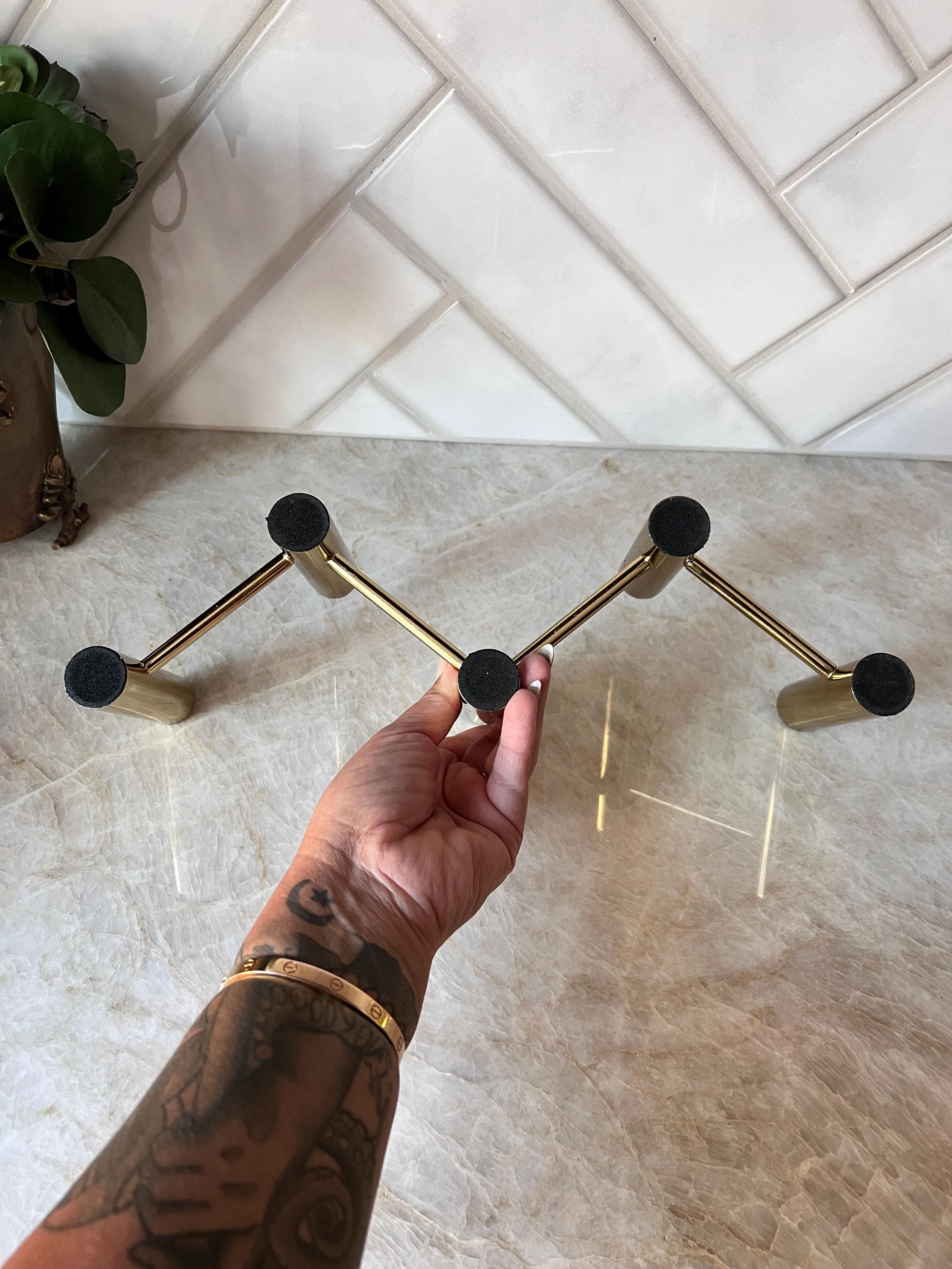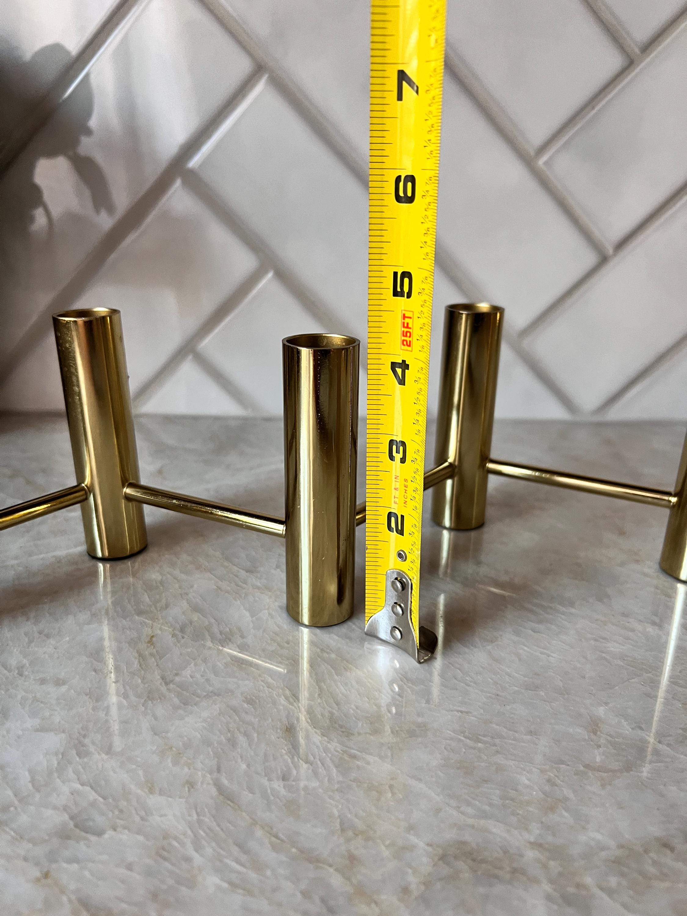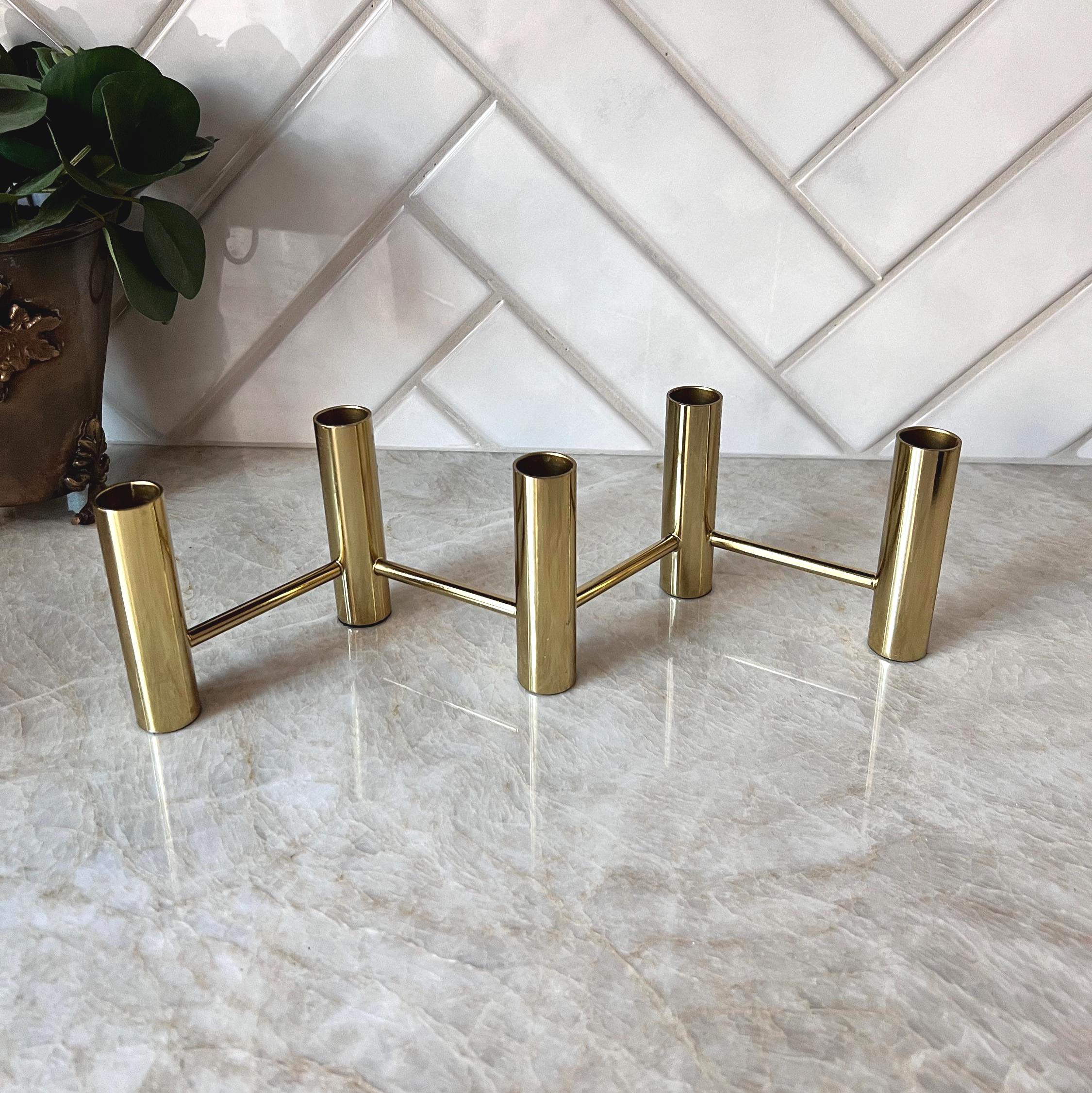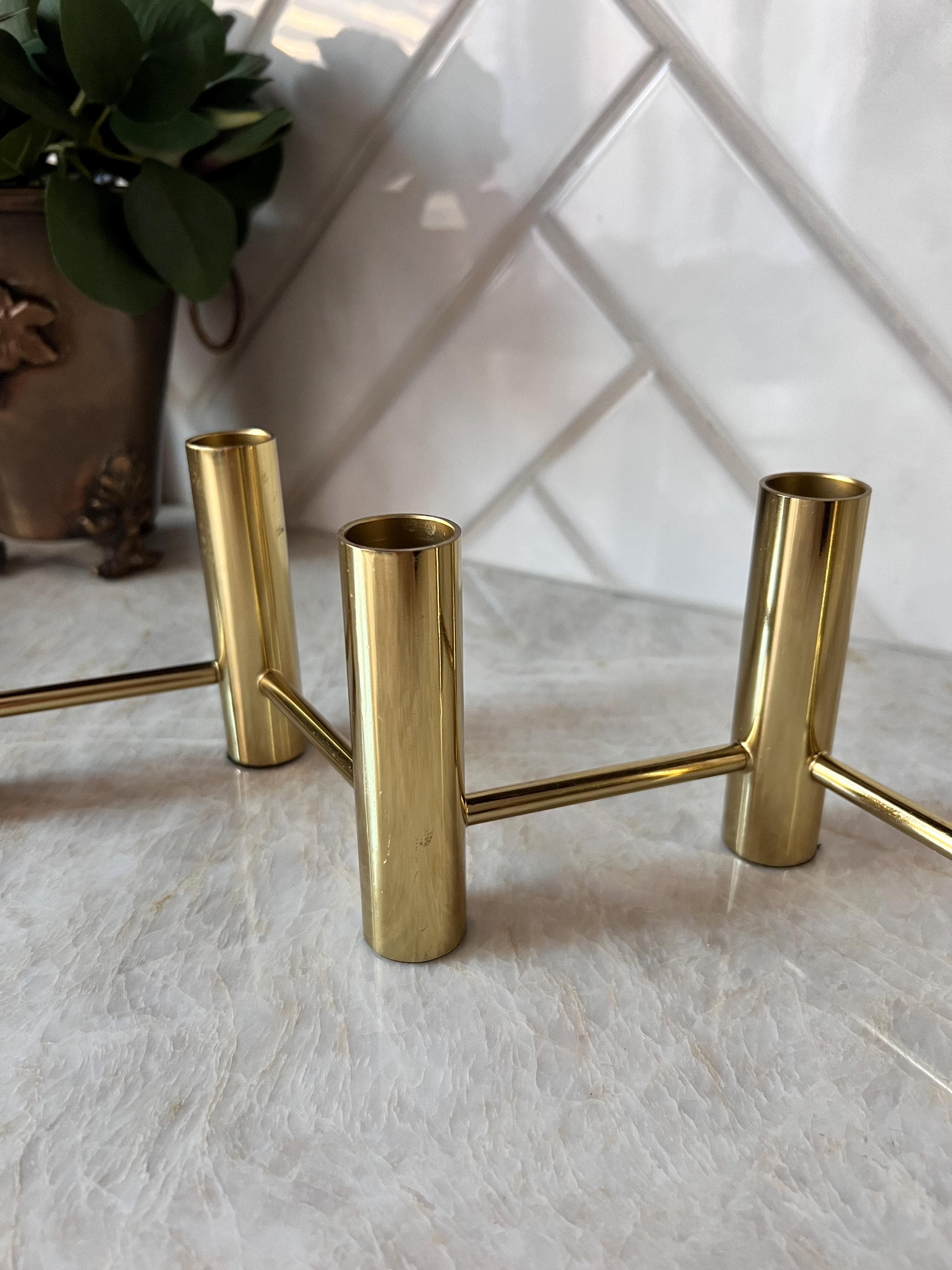 Elevate your table setting or mantel with this striking vintage brass 5‑candle holder centerpiece, featuring a sleek zig‑zag layout that creates a dynamic visual effect when lit. Crafted in a warm brass tone, this piece accommodates five standard taper candles and brings an elegant mid‑century or modern‑classic vibe to any space.