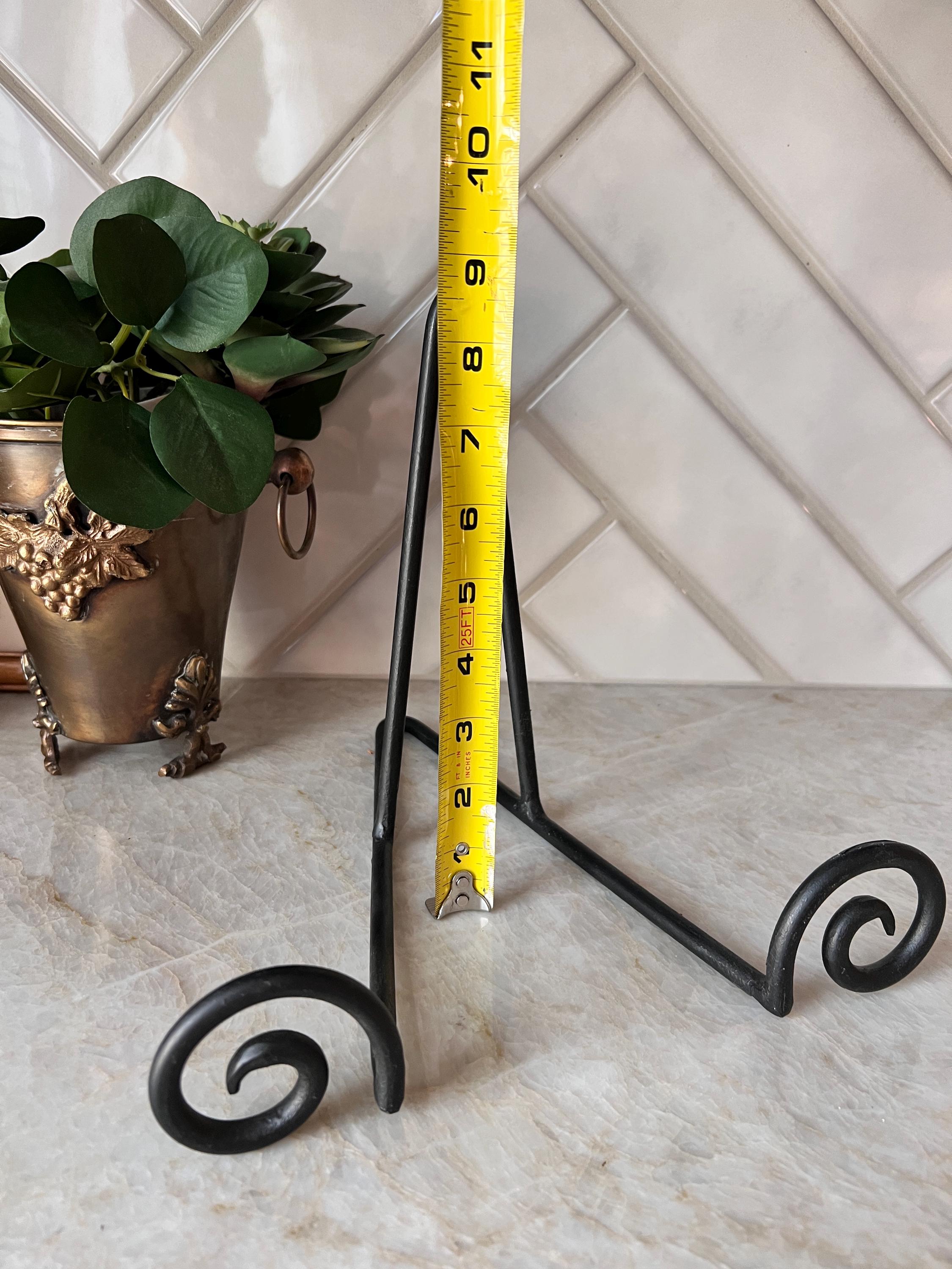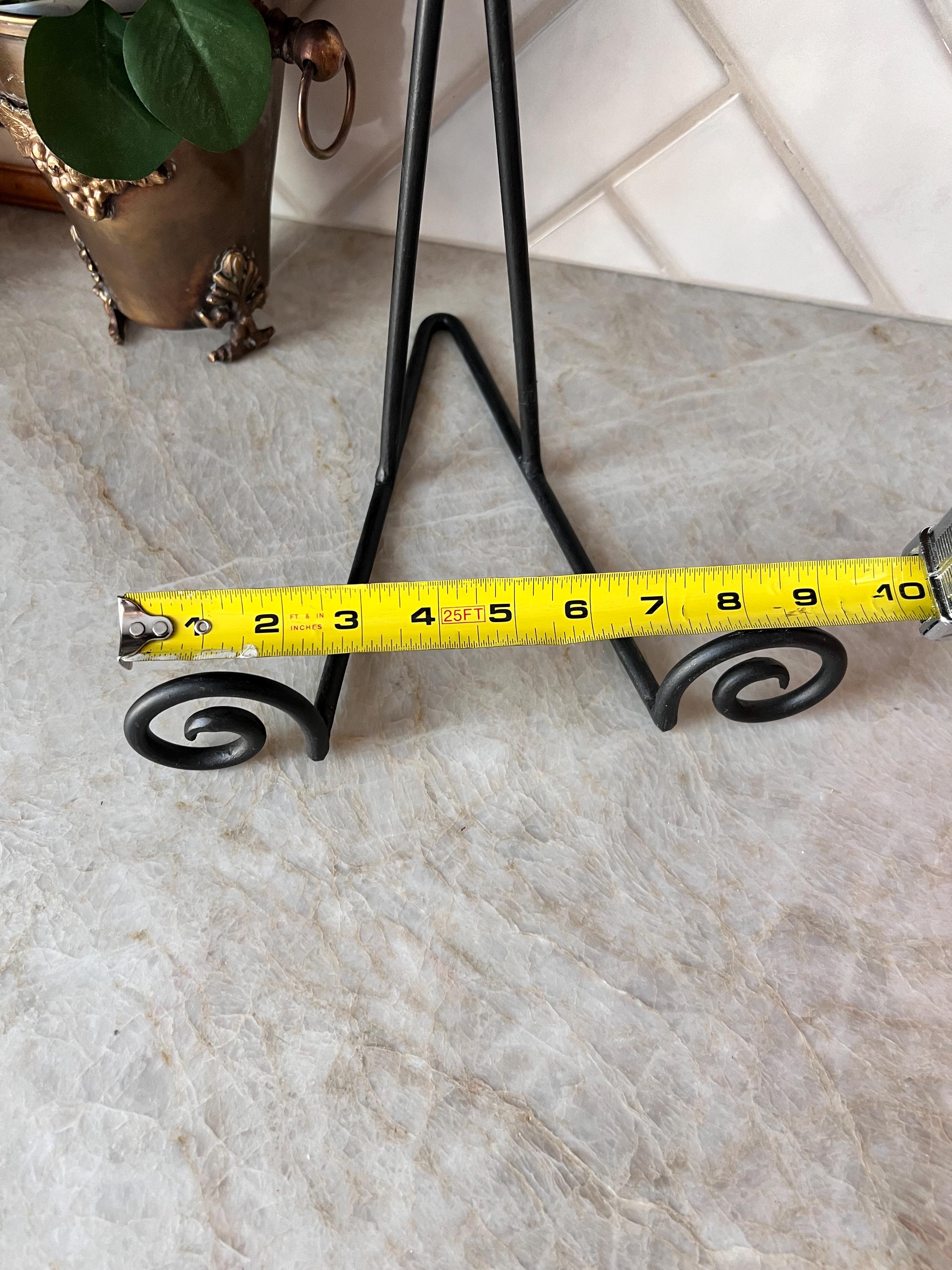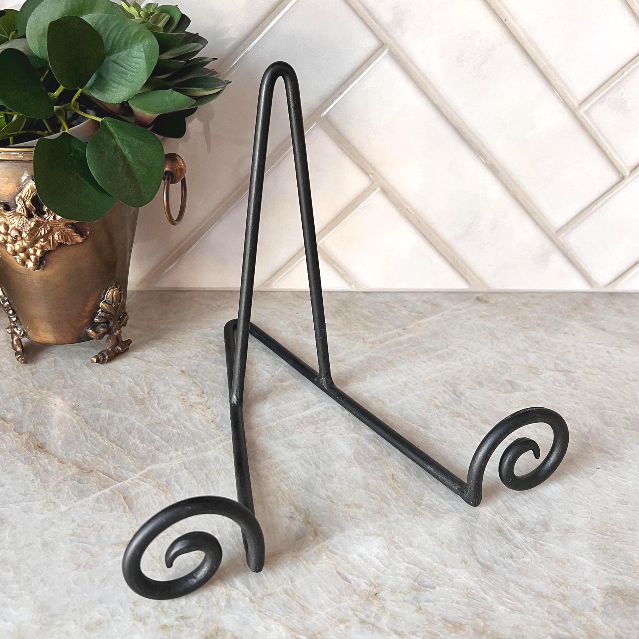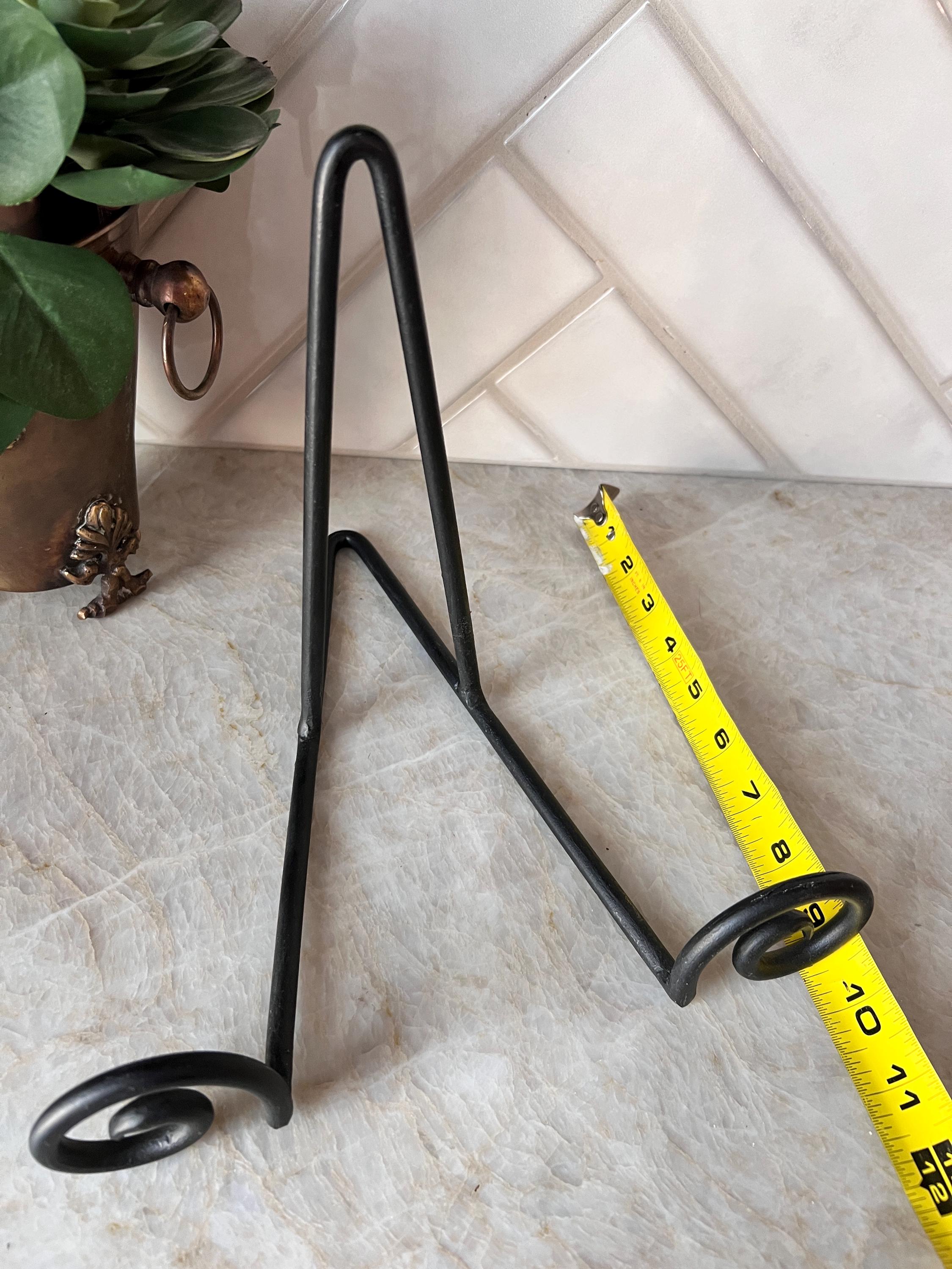 Add timeless charm to your decor or shop display with this vintage-style black metal easel stand. Crafted with graceful scrollwork and a matte black finish, it’s perfect for showcasing decorative plates, art prints, framed photos, or tabletop signage. Whether used on a bookshelf, kitchen counter, or gallery wall, this stand offers a sturdy and stylish way to elevate your treasures.
