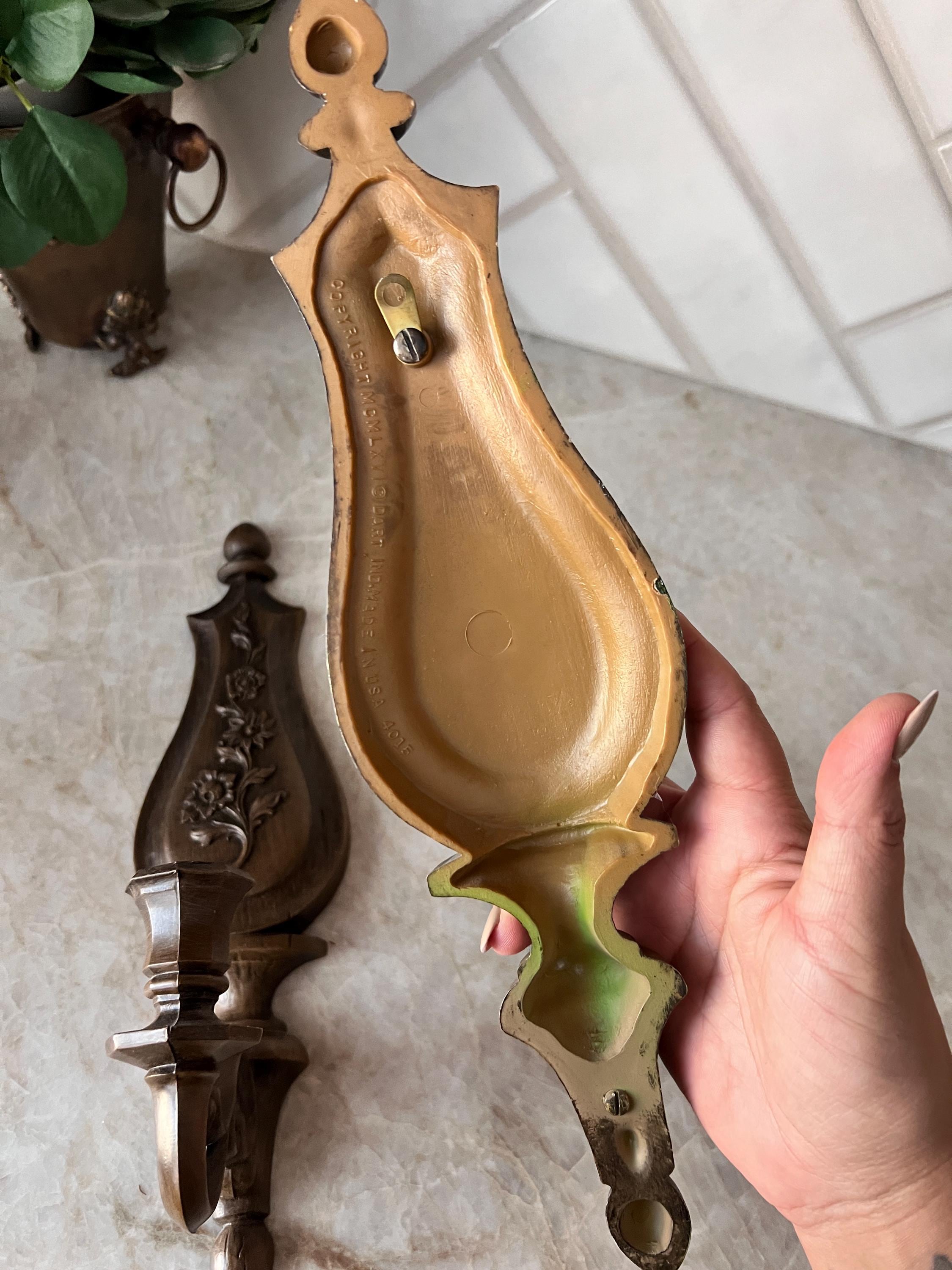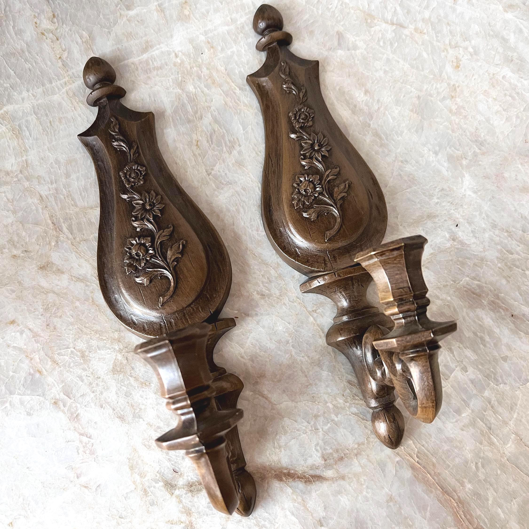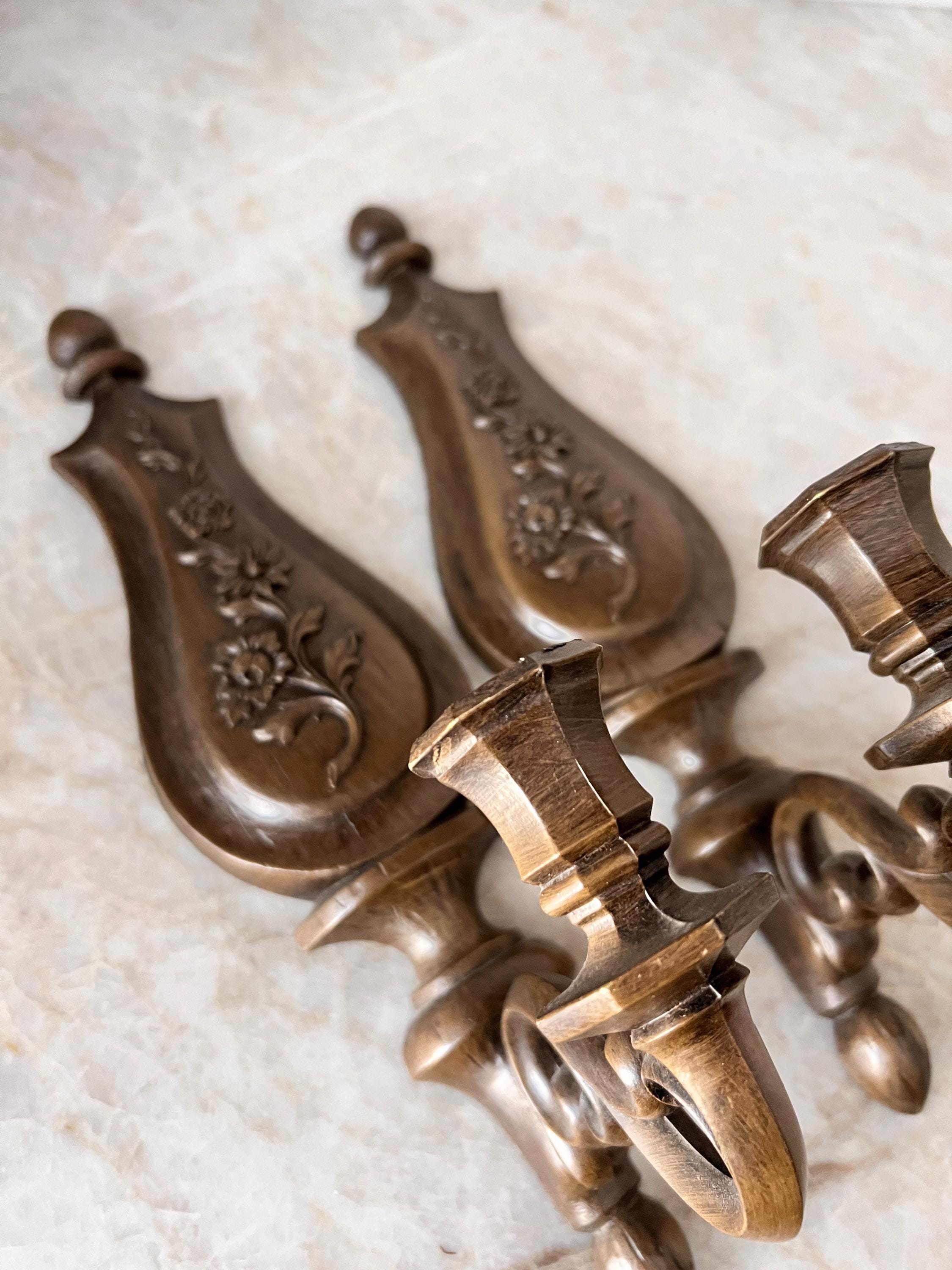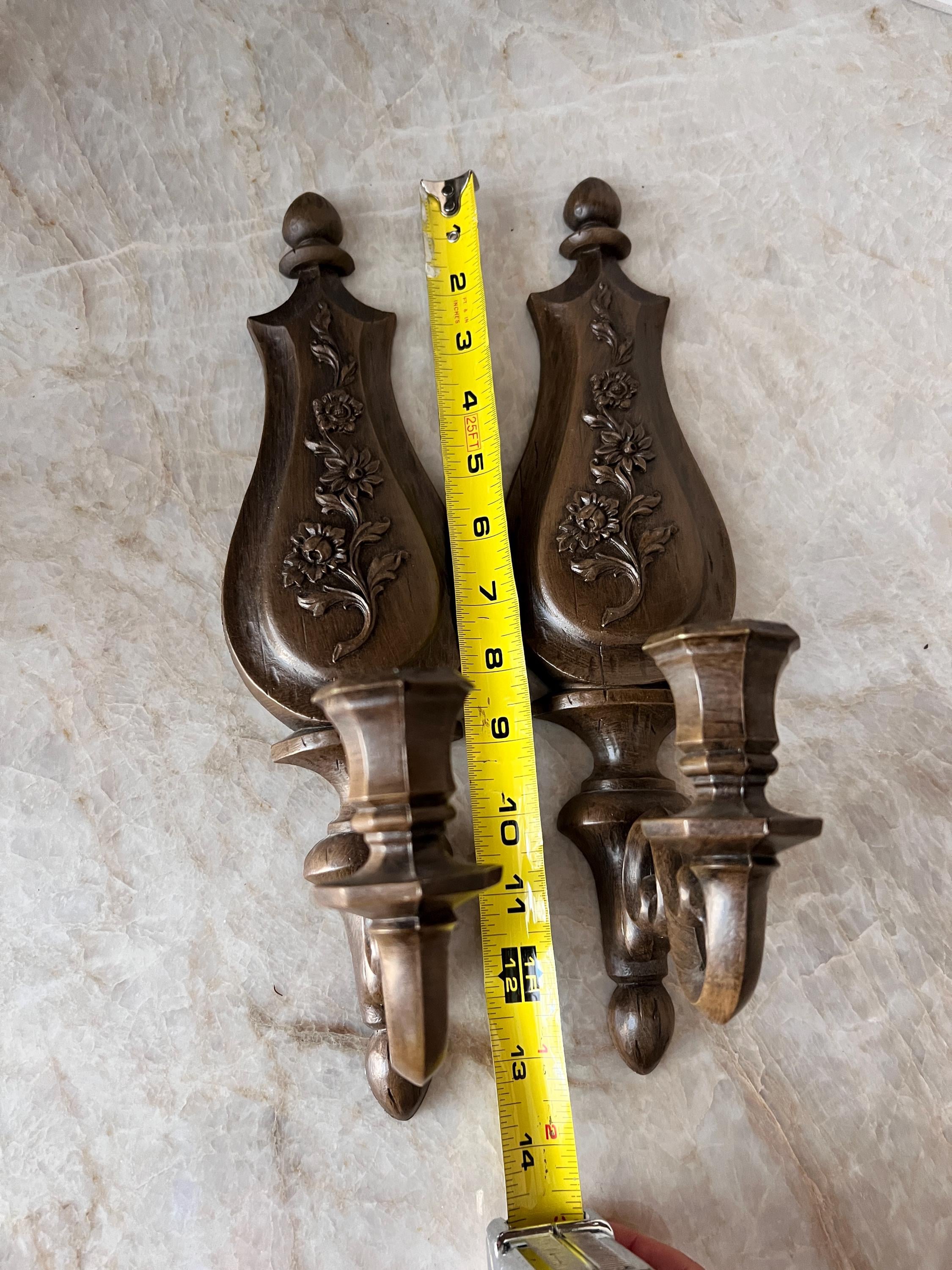 Add a touch of old-world charm to your space with this stunning pair of vintage-inspired resin wall sconces. Designed to mimic the look of hand-carved wood, each sconce features beautifully detailed floral motifs with an elegant, antique gold and bronze finish. These lightweight yet sturdy pieces are perfect for holding taper candles or as standalone decorative accents in a gallery wall or French country–inspired room.