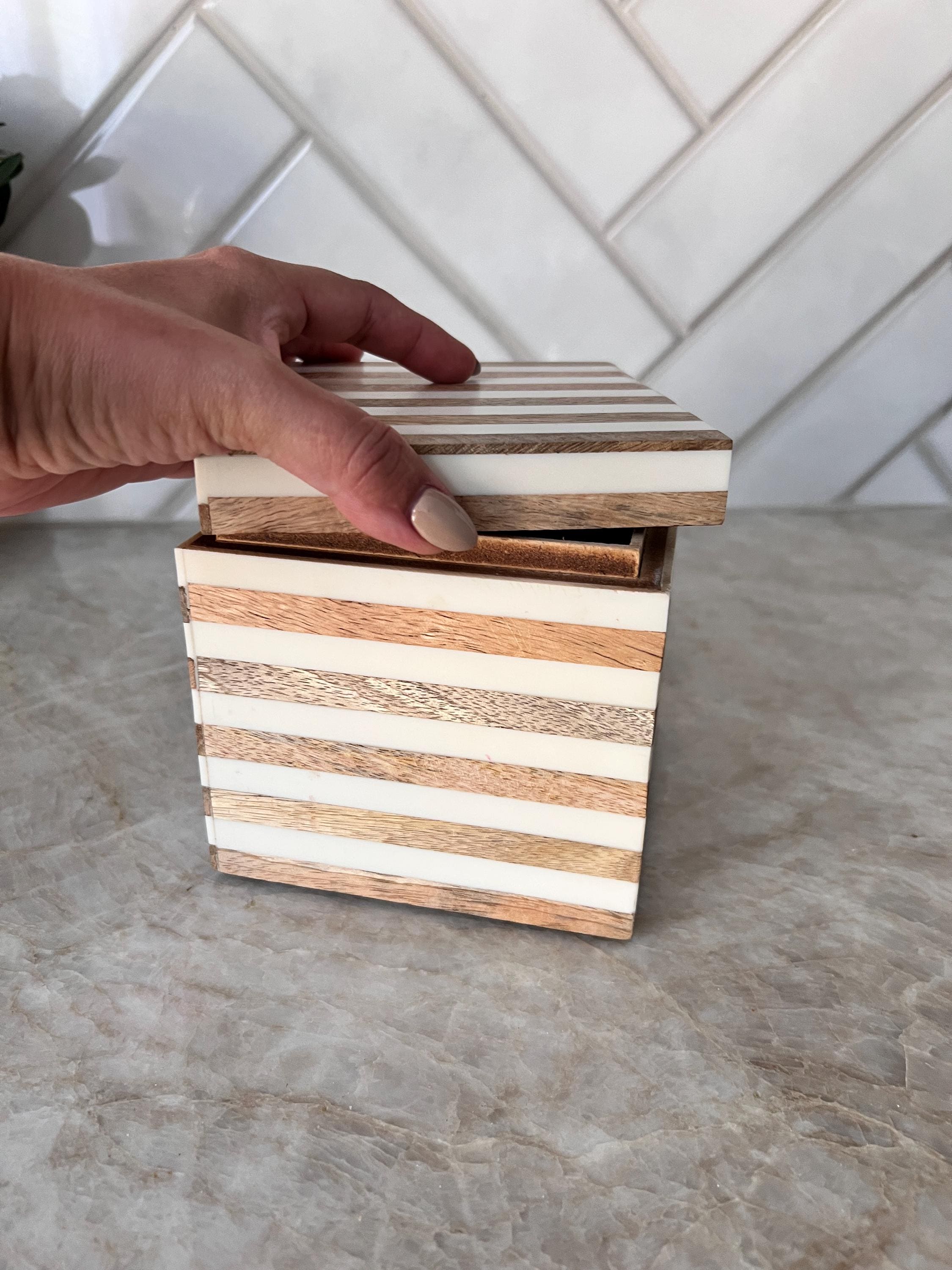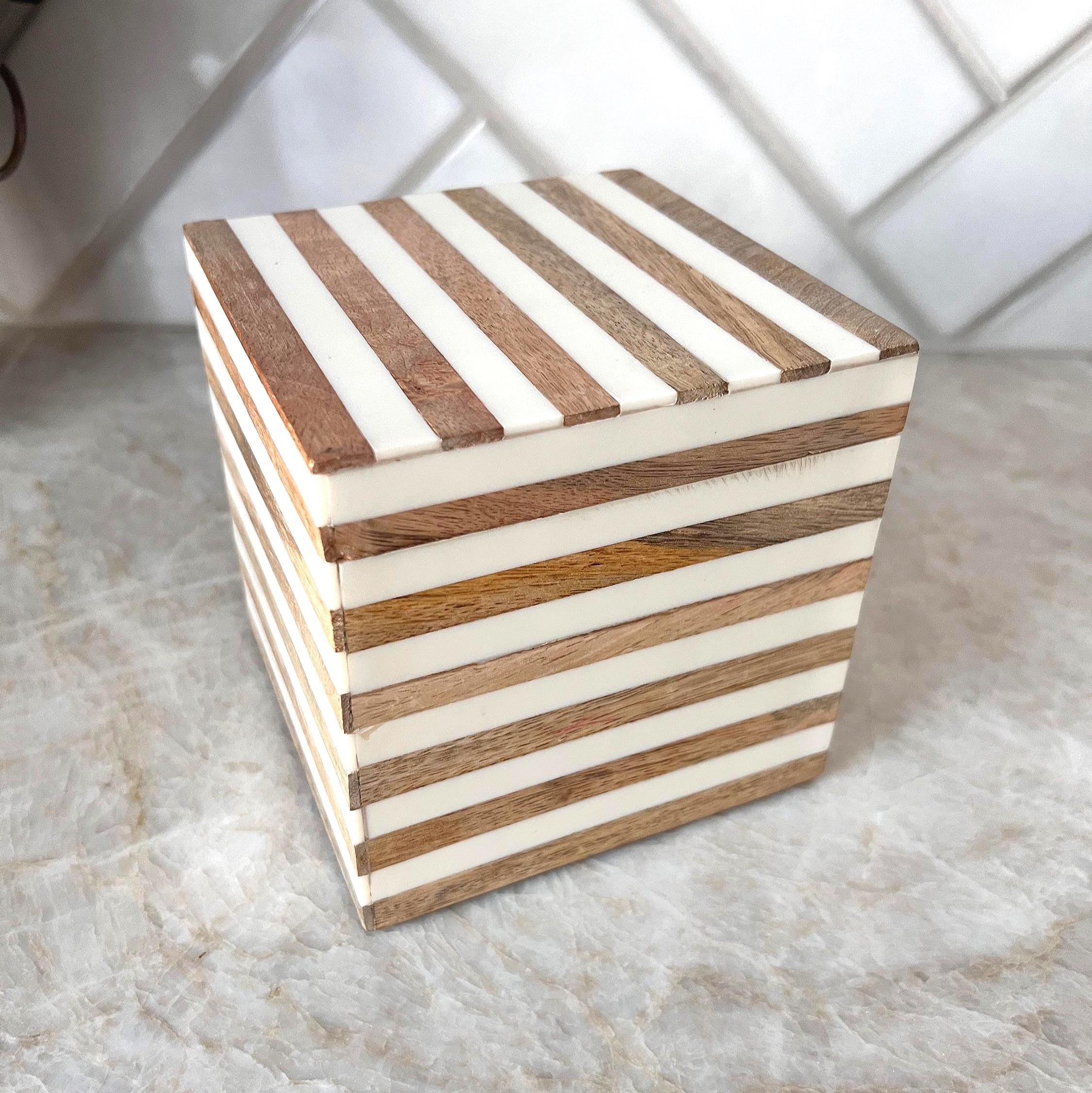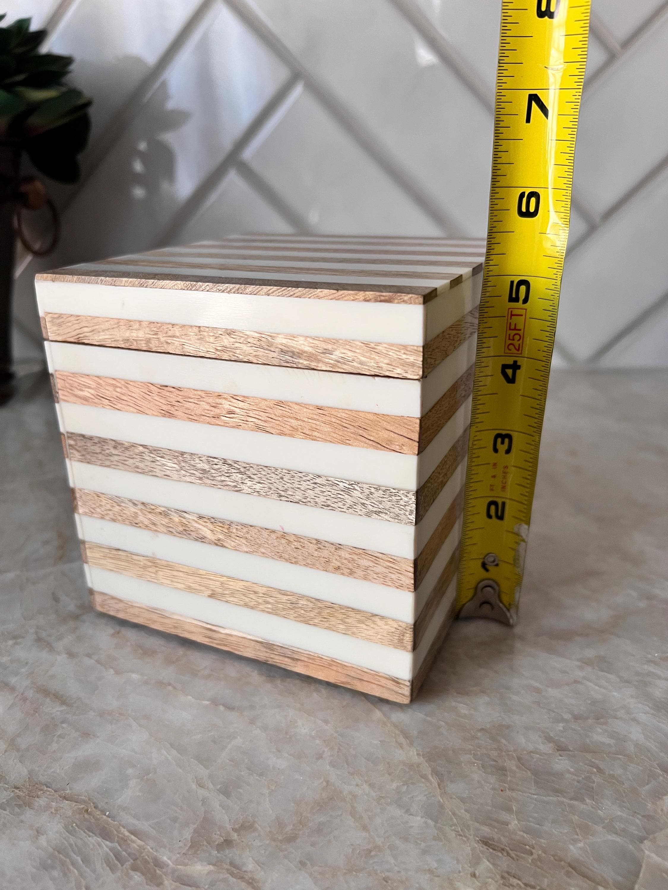 Add a modern, minimalist touch to your vanity, shelf, or desk with this Anthropologie-style decorative box. Measuring approximately 5 inches square, this stylish box features alternating bands of natural wood and glossy ivory resin for a clean and contemporary look.