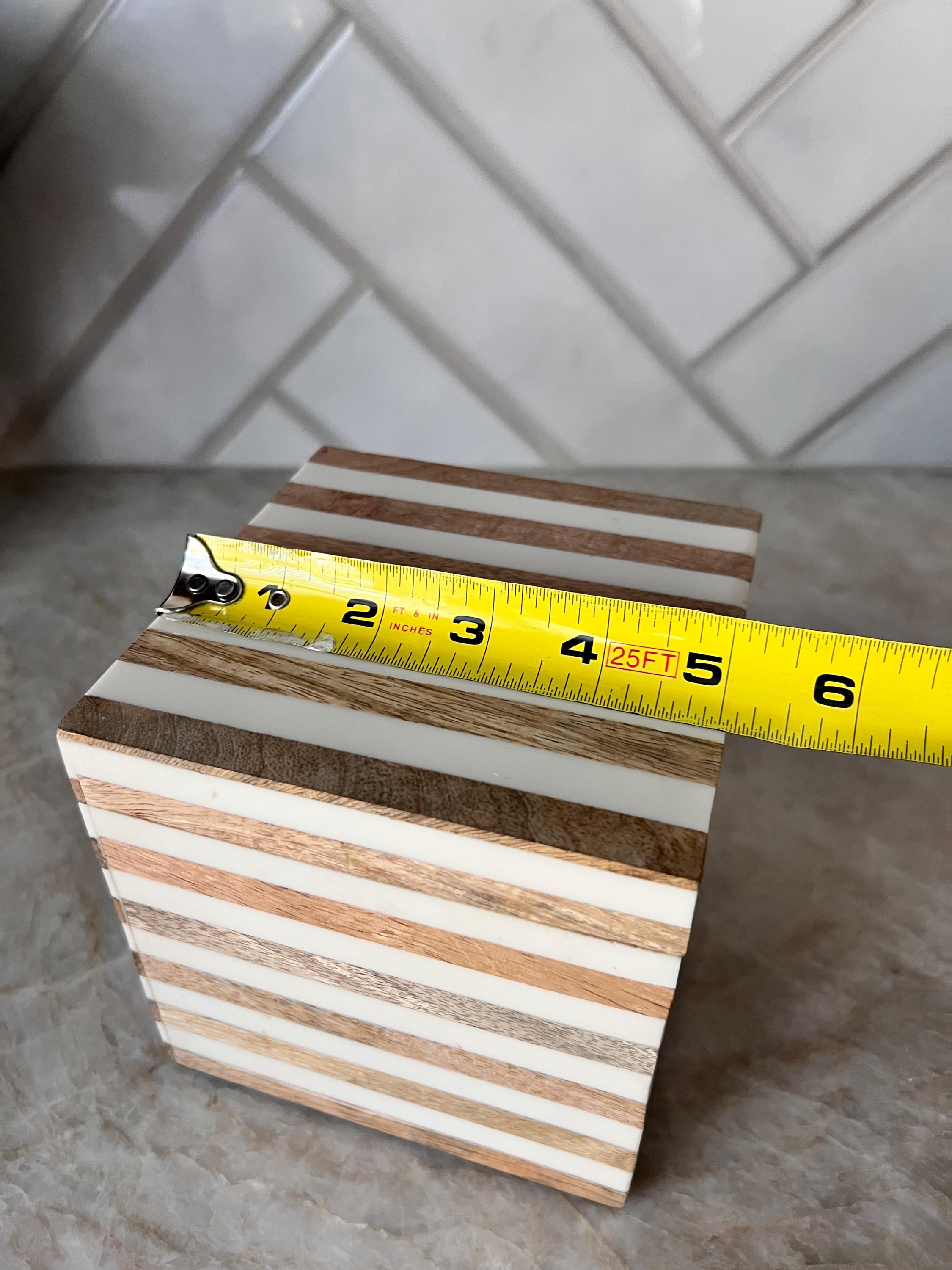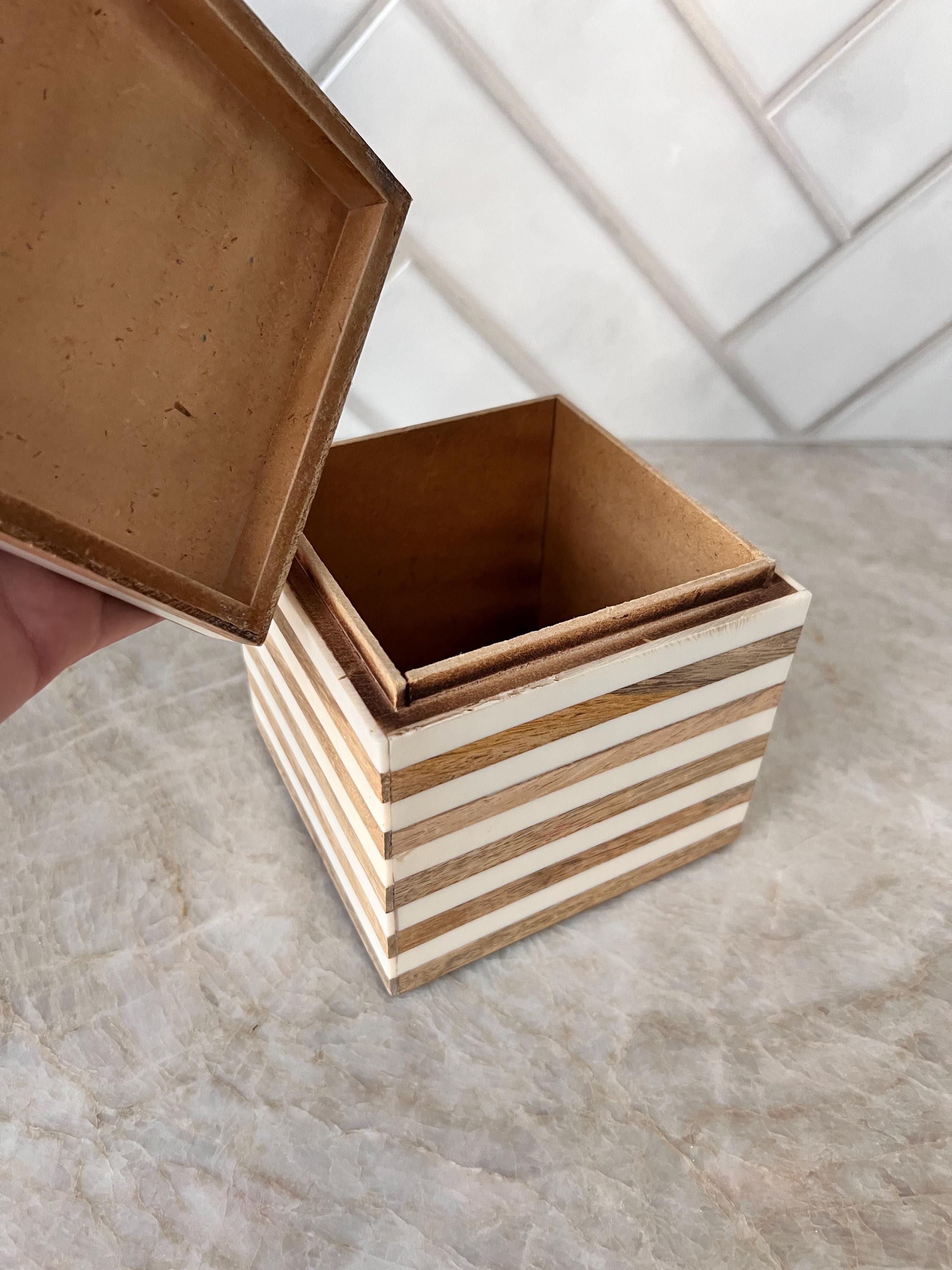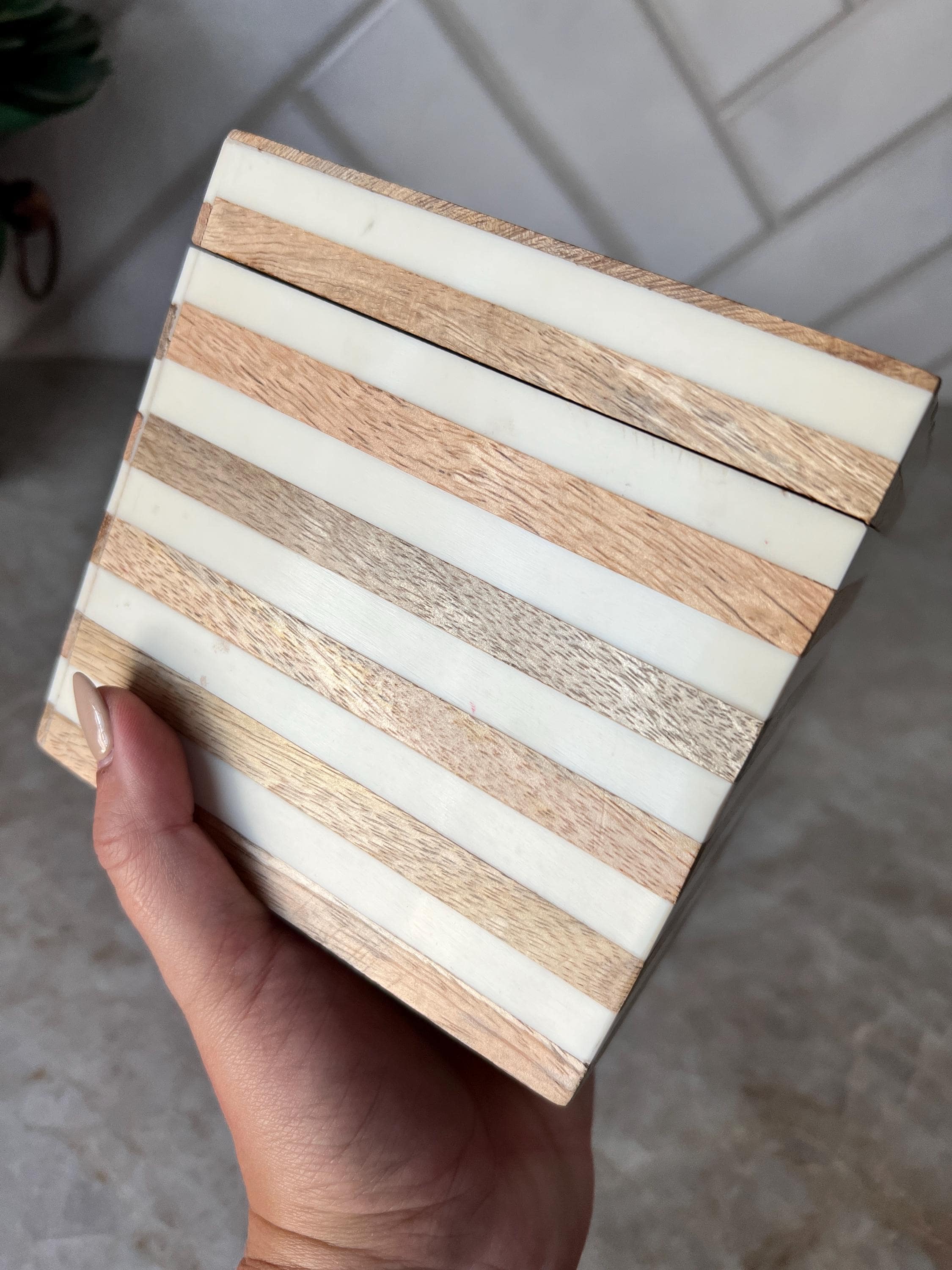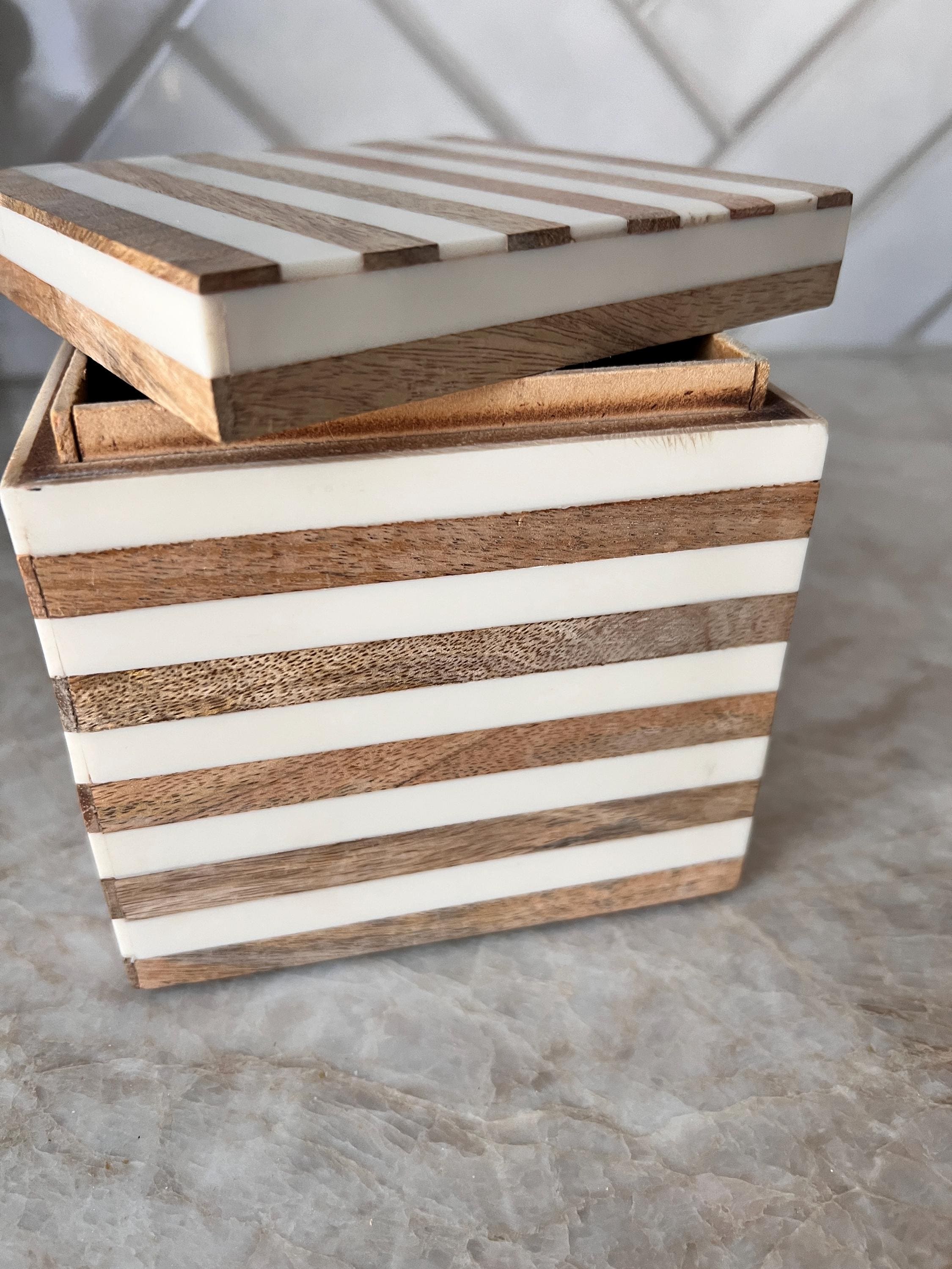 Add a modern, minimalist touch to your vanity, shelf, or desk with this Anthropologie-style decorative box. Measuring approximately 5 inches square, this stylish box features alternating bands of natural wood and glossy ivory resin for a clean and contemporary look.