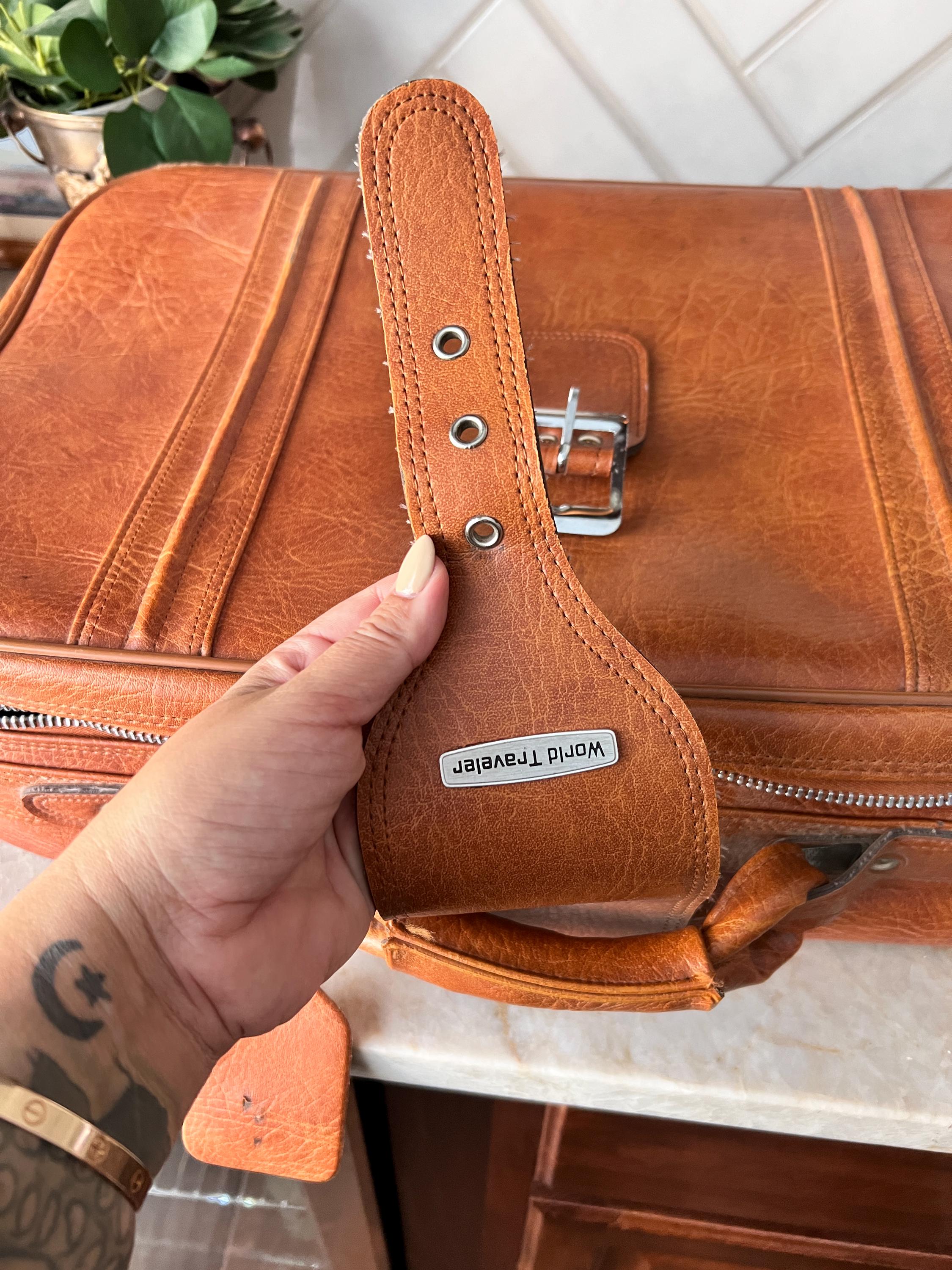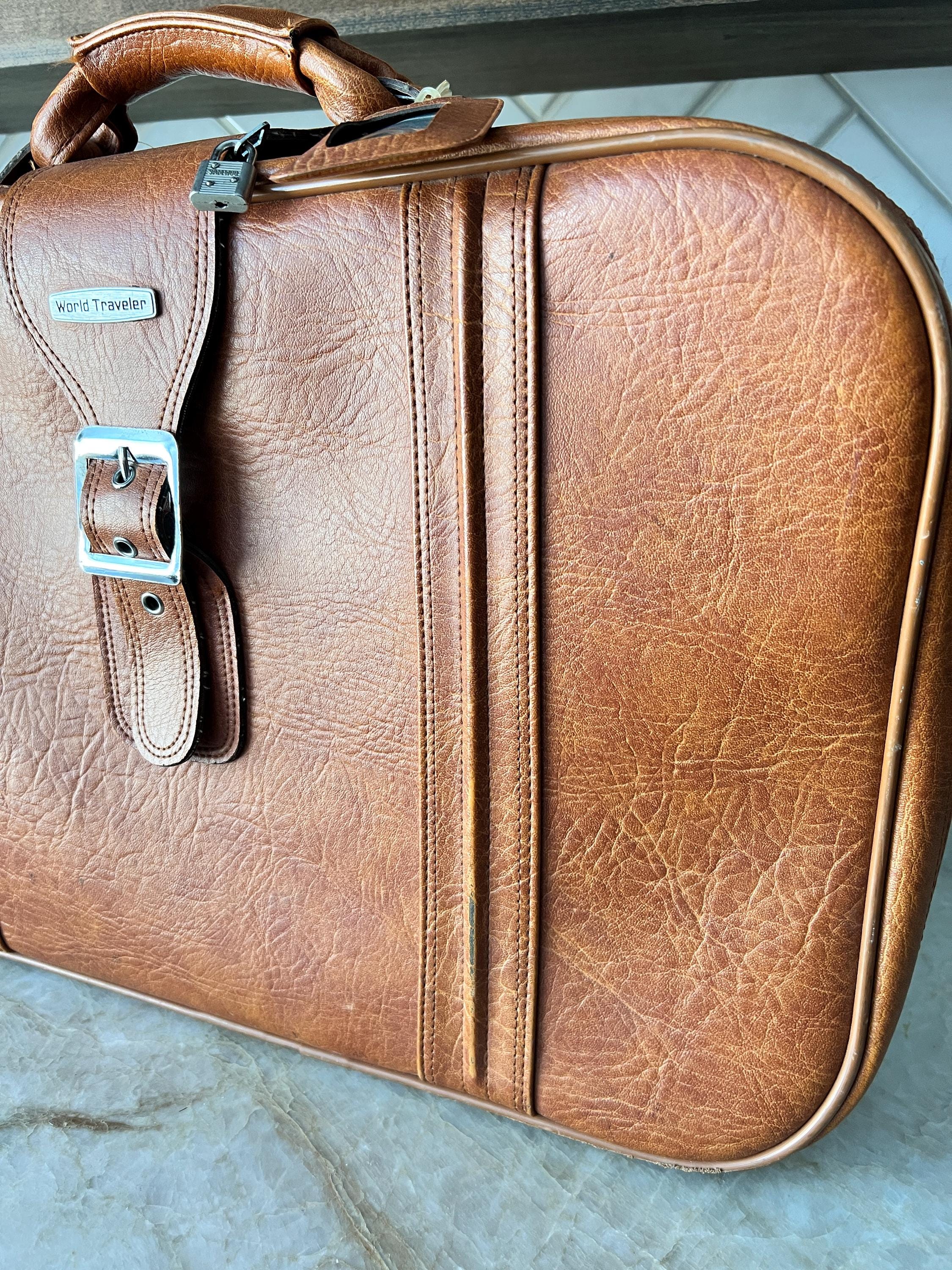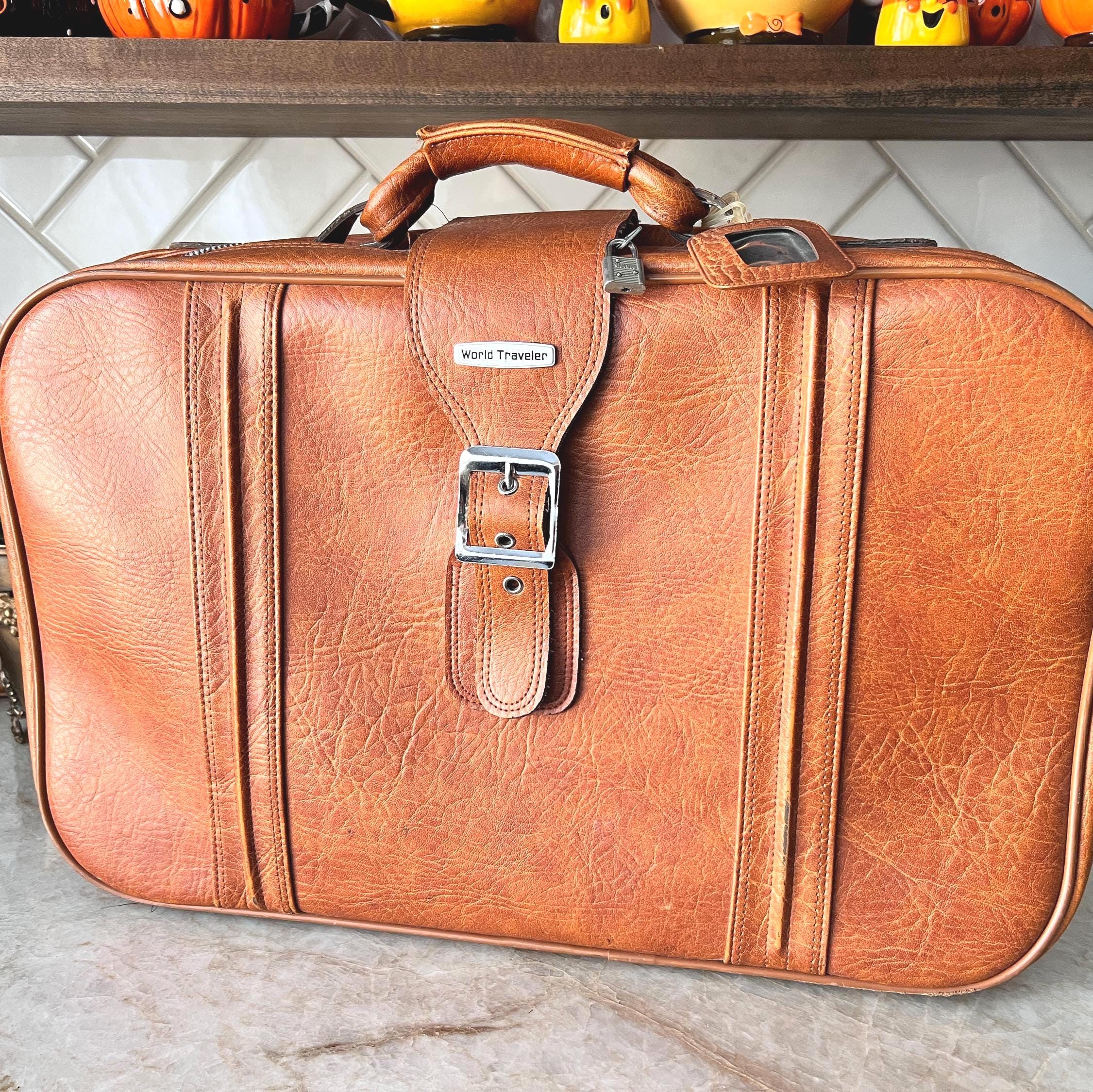 Step back in time with this handsome vintage suitcase by World Traveler. Made of textured faux leather in a warm, cognac brown tone, this mid-century luggage piece offers serious retro charm. Classic silver-tone buckle detail and sturdy top handle make it perfect for travel, storage, or even display. Ideal as a prop, home décor, or a thoughtful gift for the vintage collector or jet-setter in your life.