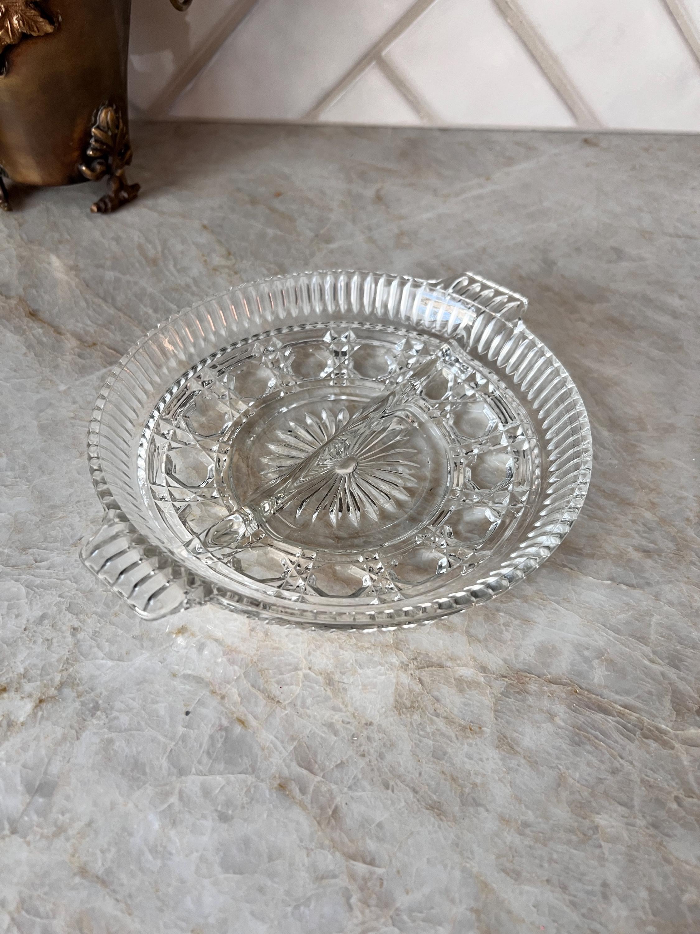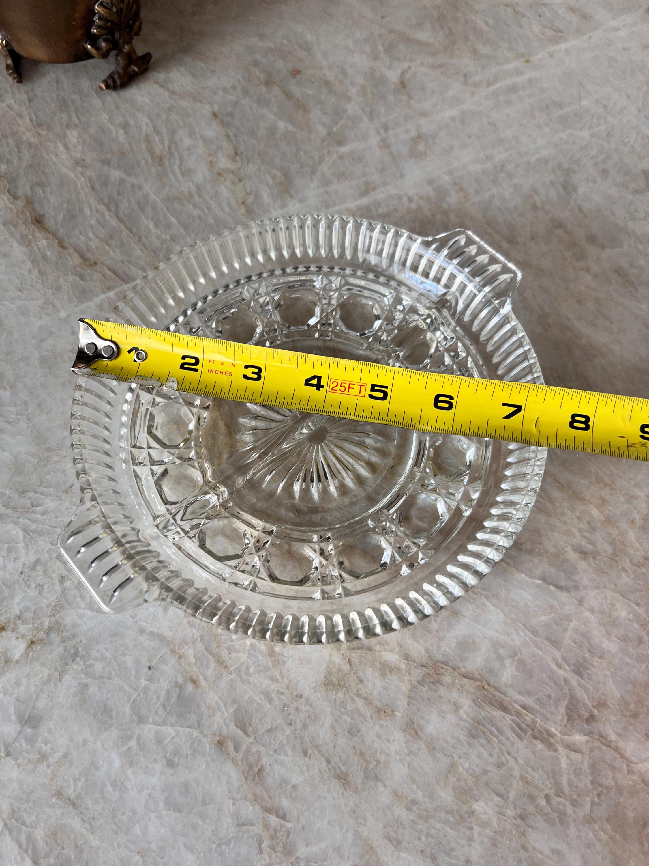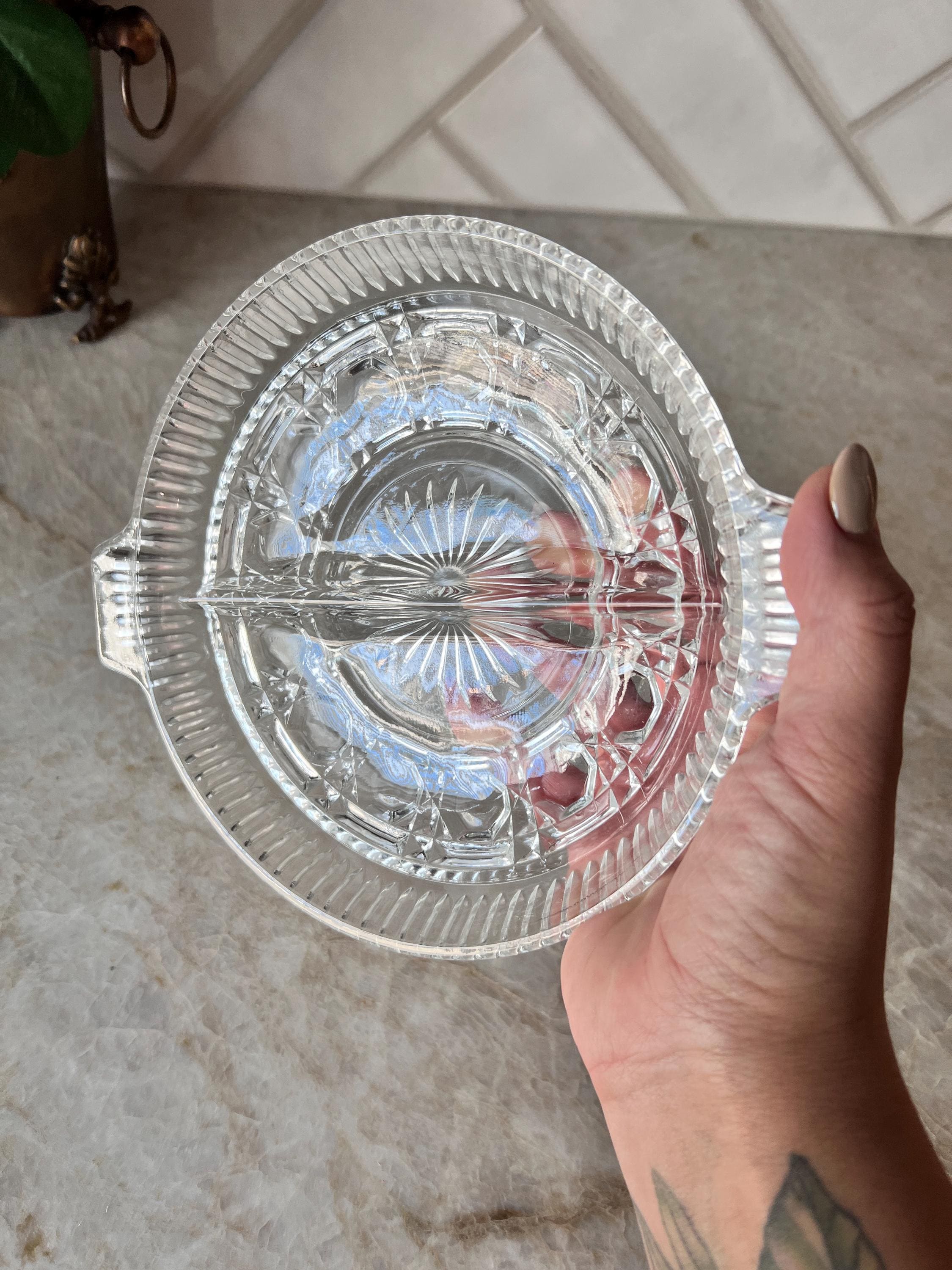 The radiant cut glass pattern reflects light beautifully, while the scalloped rim and dual-handle design give it a classic feel reminiscent of mid-century hostessware. Ideal for entertaining or simply elevating everyday organization.