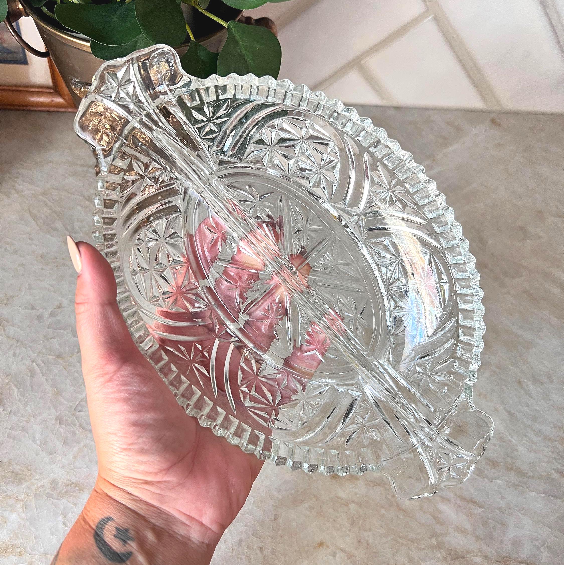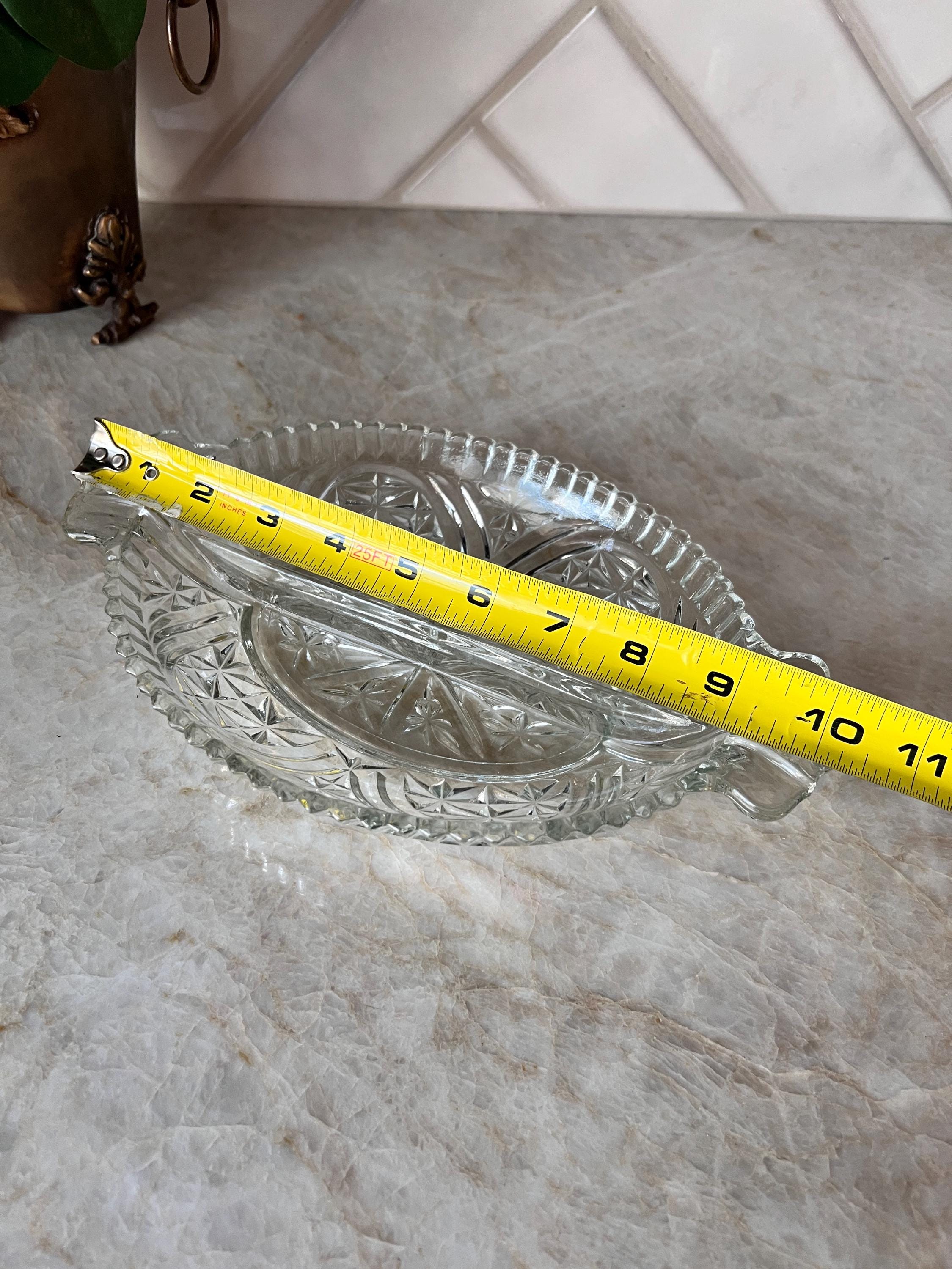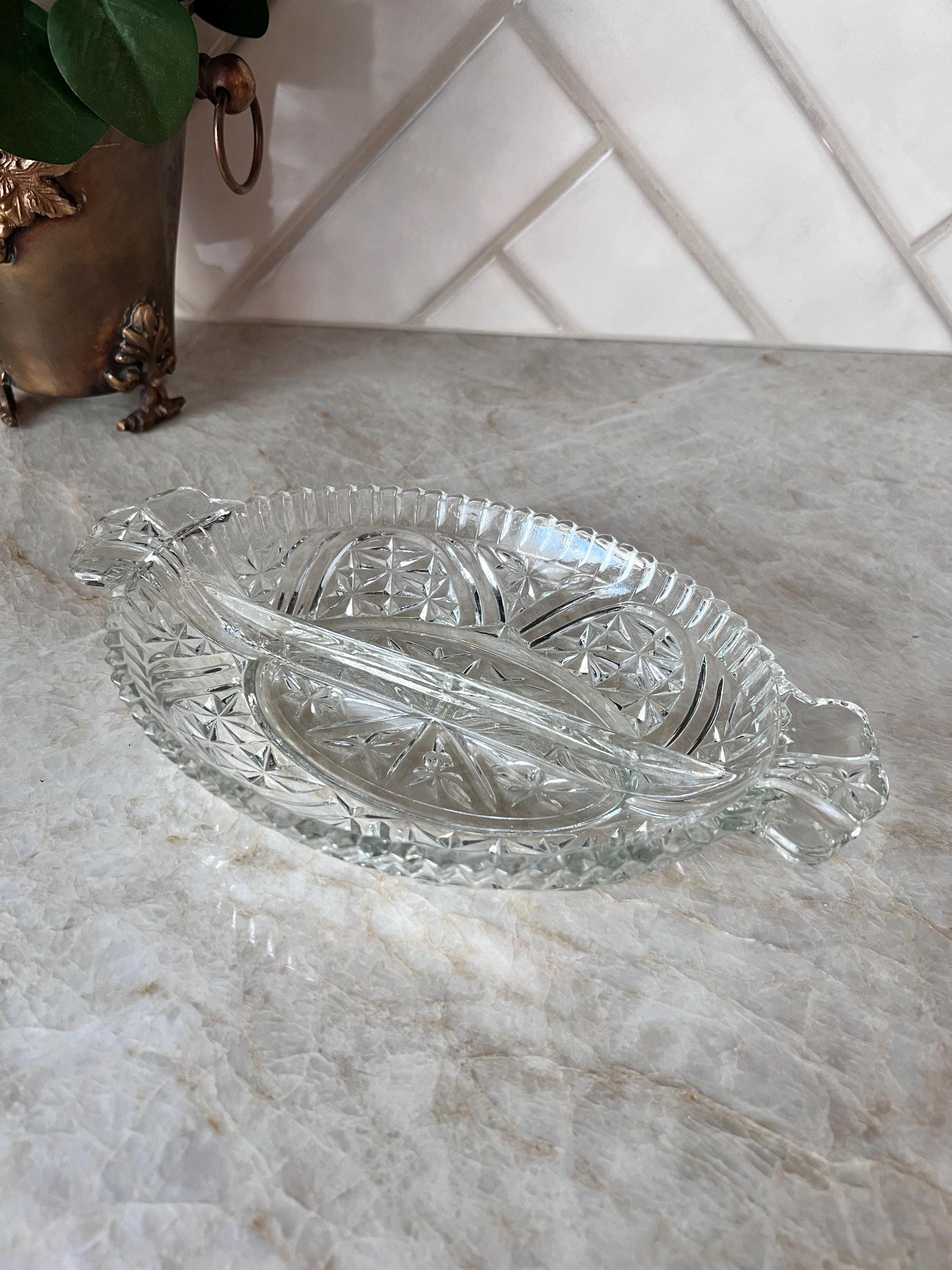 This beautiful vintage clear pressed glass dish features an elegant starburst pattern and a divided design, perfect for serving candy, nuts, olives, or relish at your next gathering. The oval shape and intricate detailing give it a timeless charm that suits both everyday use and special occasions. A lovely addition to your vintage glassware collection or a thoughtful hostess gift.