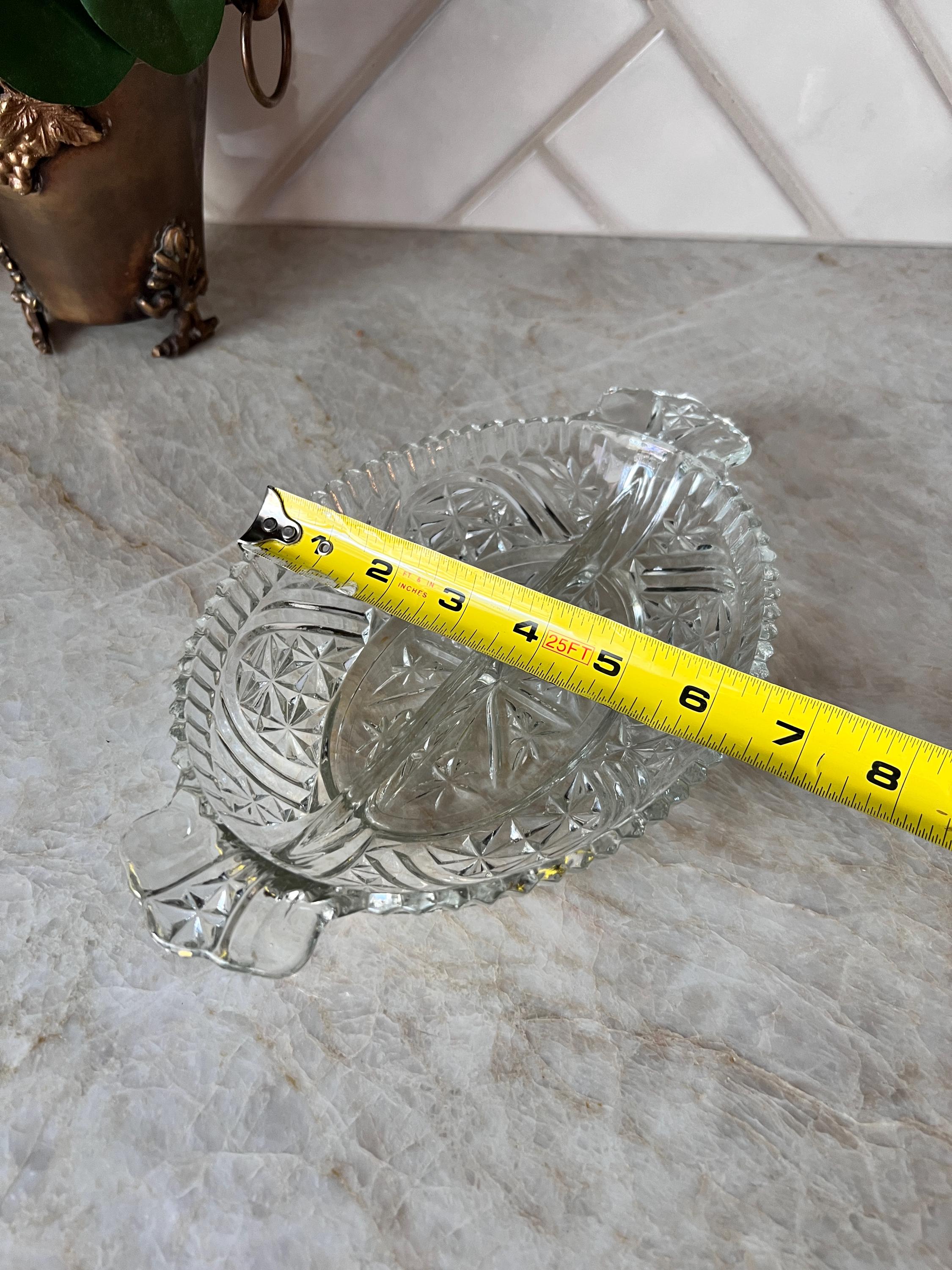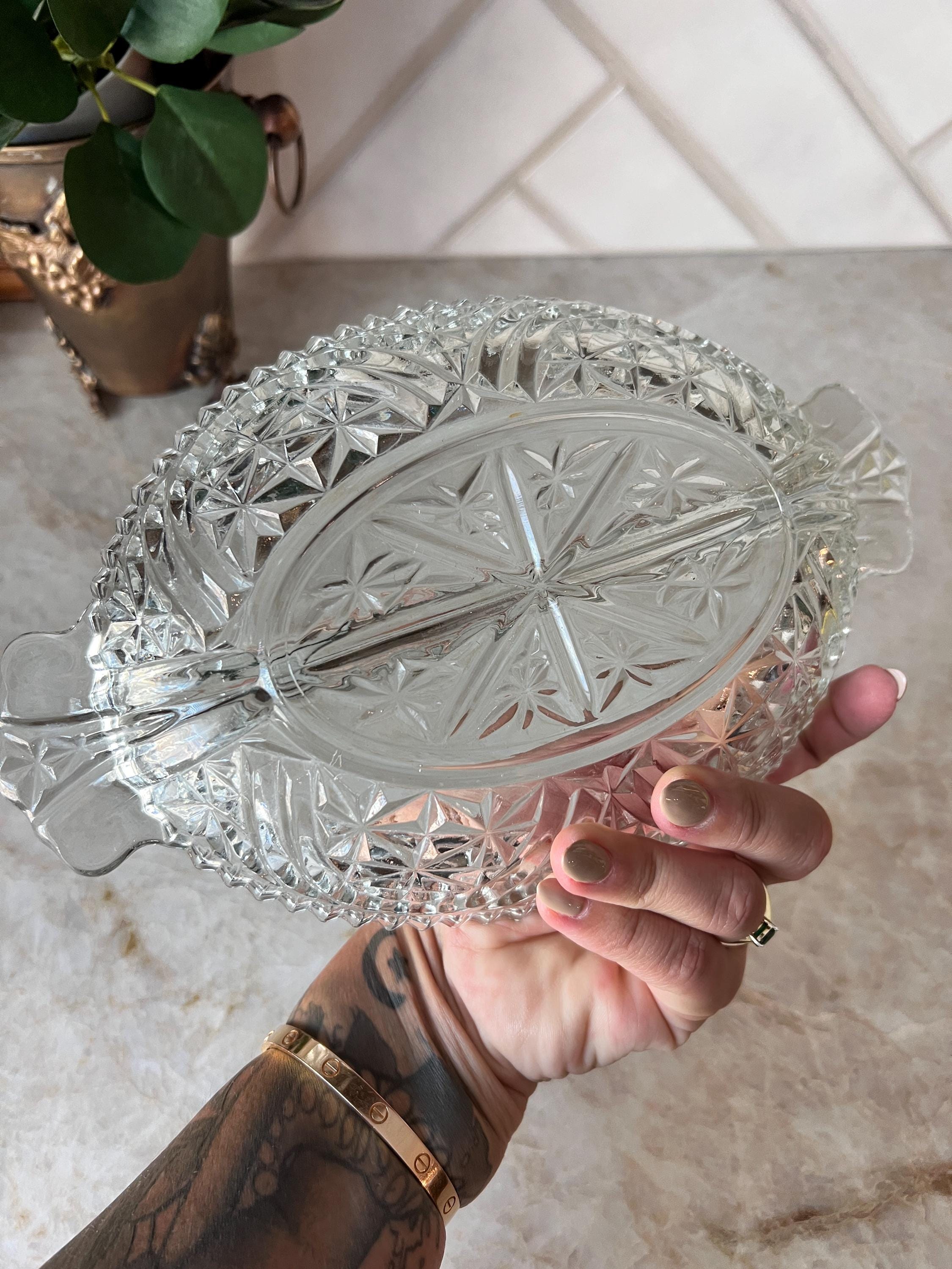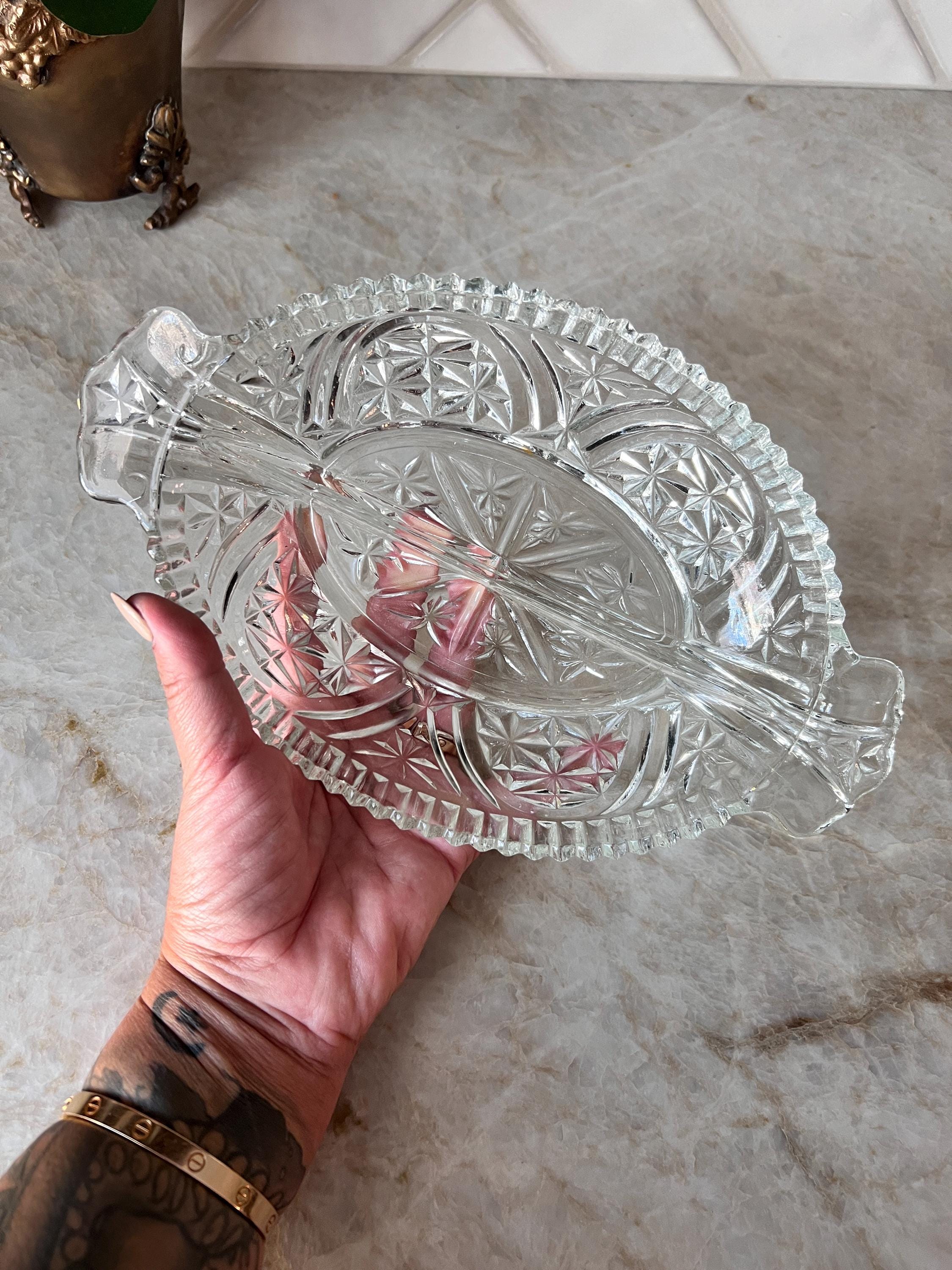 This beautiful vintage clear pressed glass dish features an elegant starburst pattern and a divided design, perfect for serving candy, nuts, olives, or relish at your next gathering. The oval shape and intricate detailing give it a timeless charm that suits both everyday use and special occasions. A lovely addition to your vintage glassware collection or a thoughtful hostess gift.
