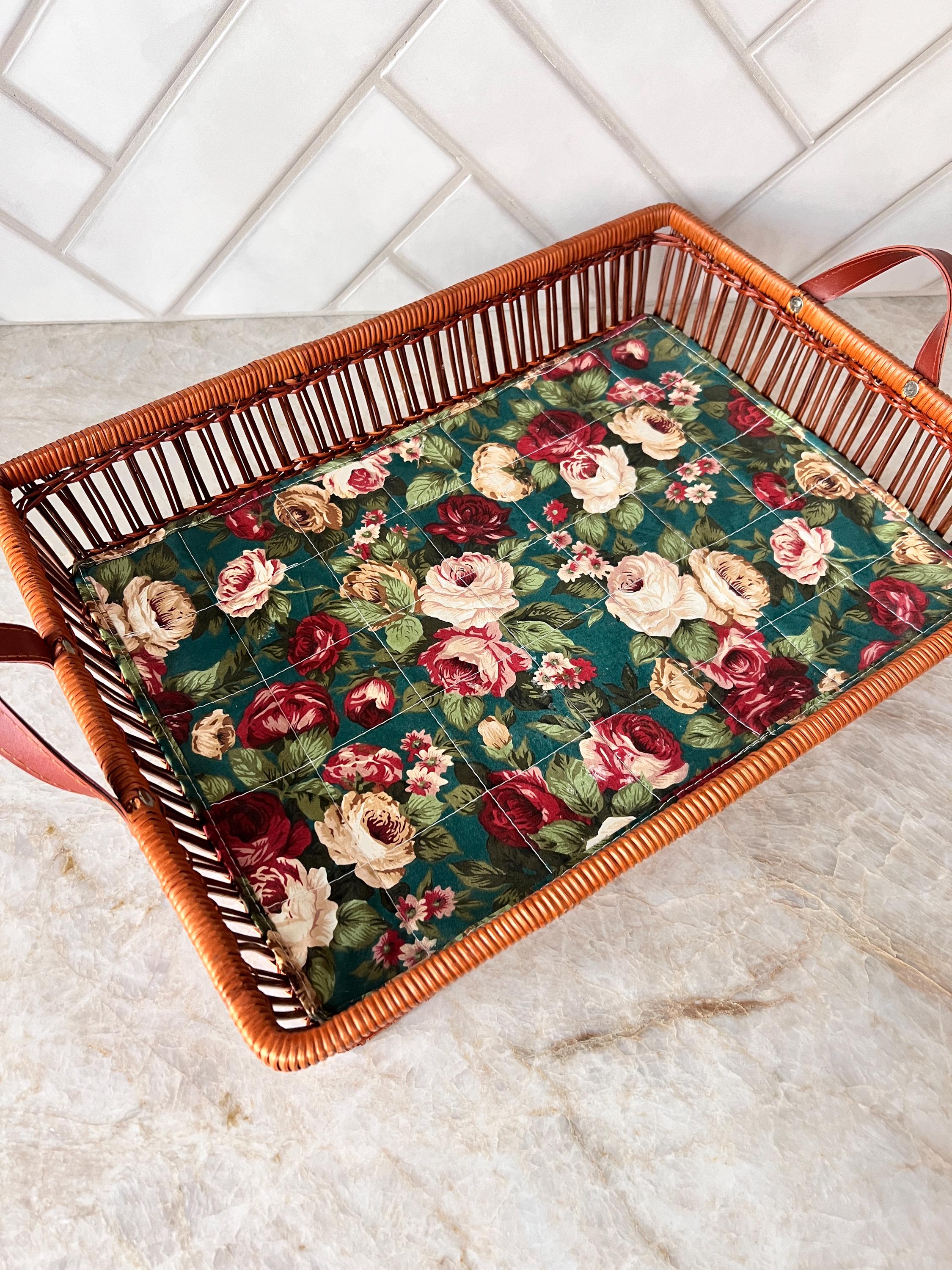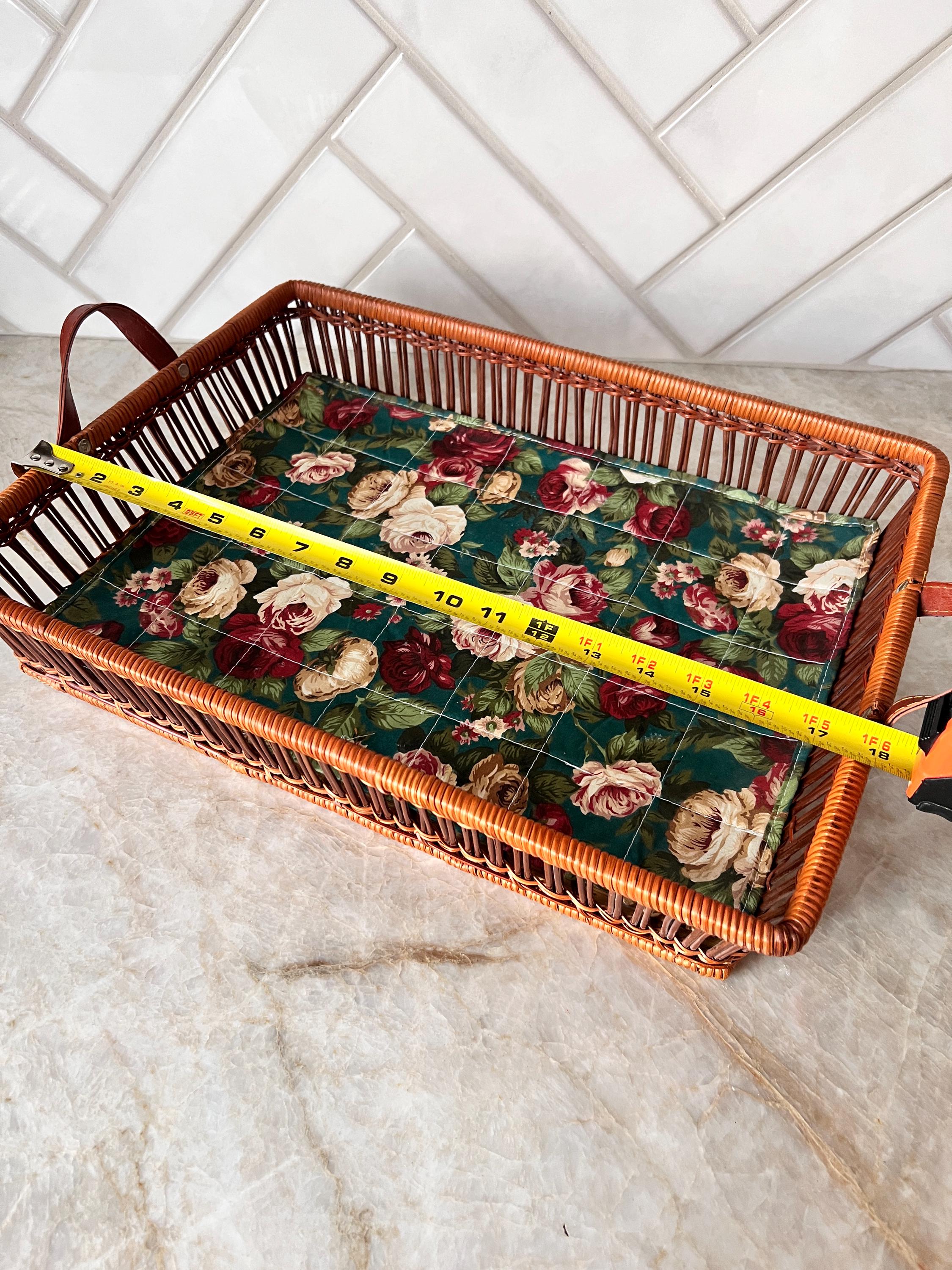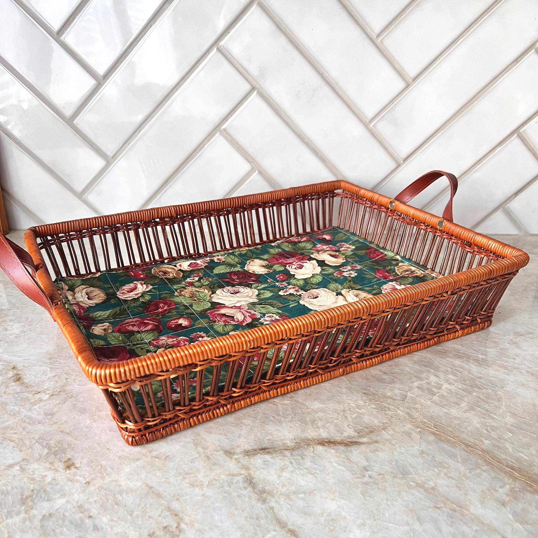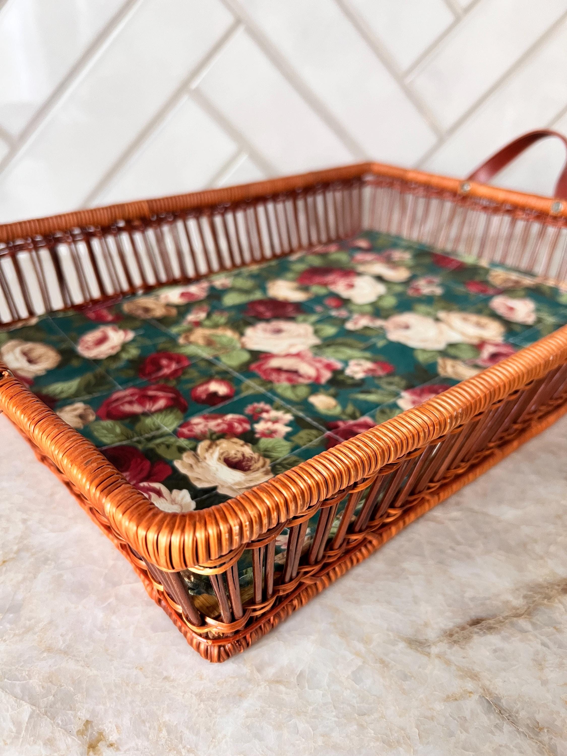 This charming vintage rectangular wicker tray features a vibrant rose-printed fabric base with rich green, ivory, and burgundy tones. Woven in a warm honey-brown finish, the open weave sides and faux leather handle accents add a cozy, rustic charm. It’s a perfect cottagecore or boho addition to your home.