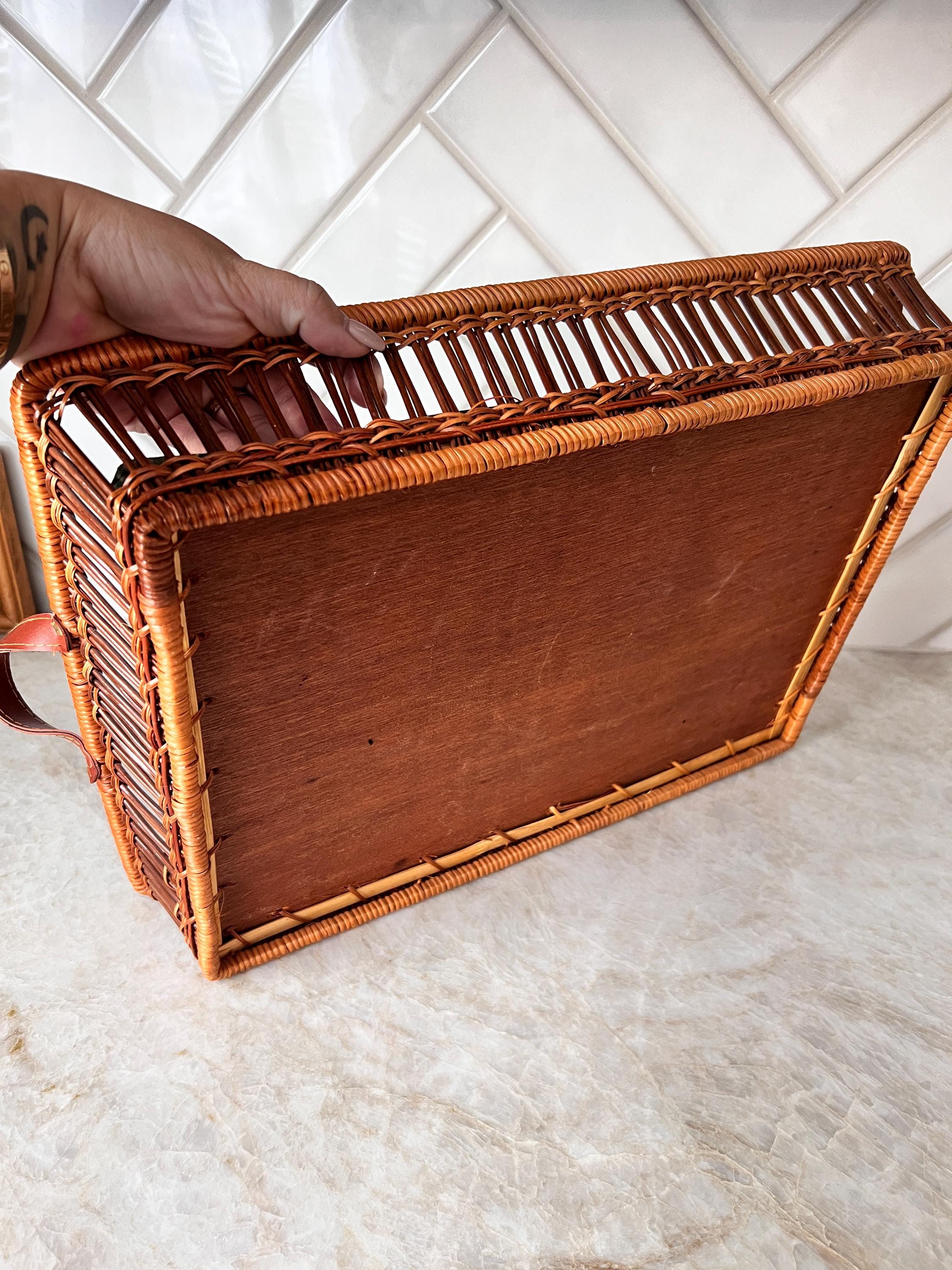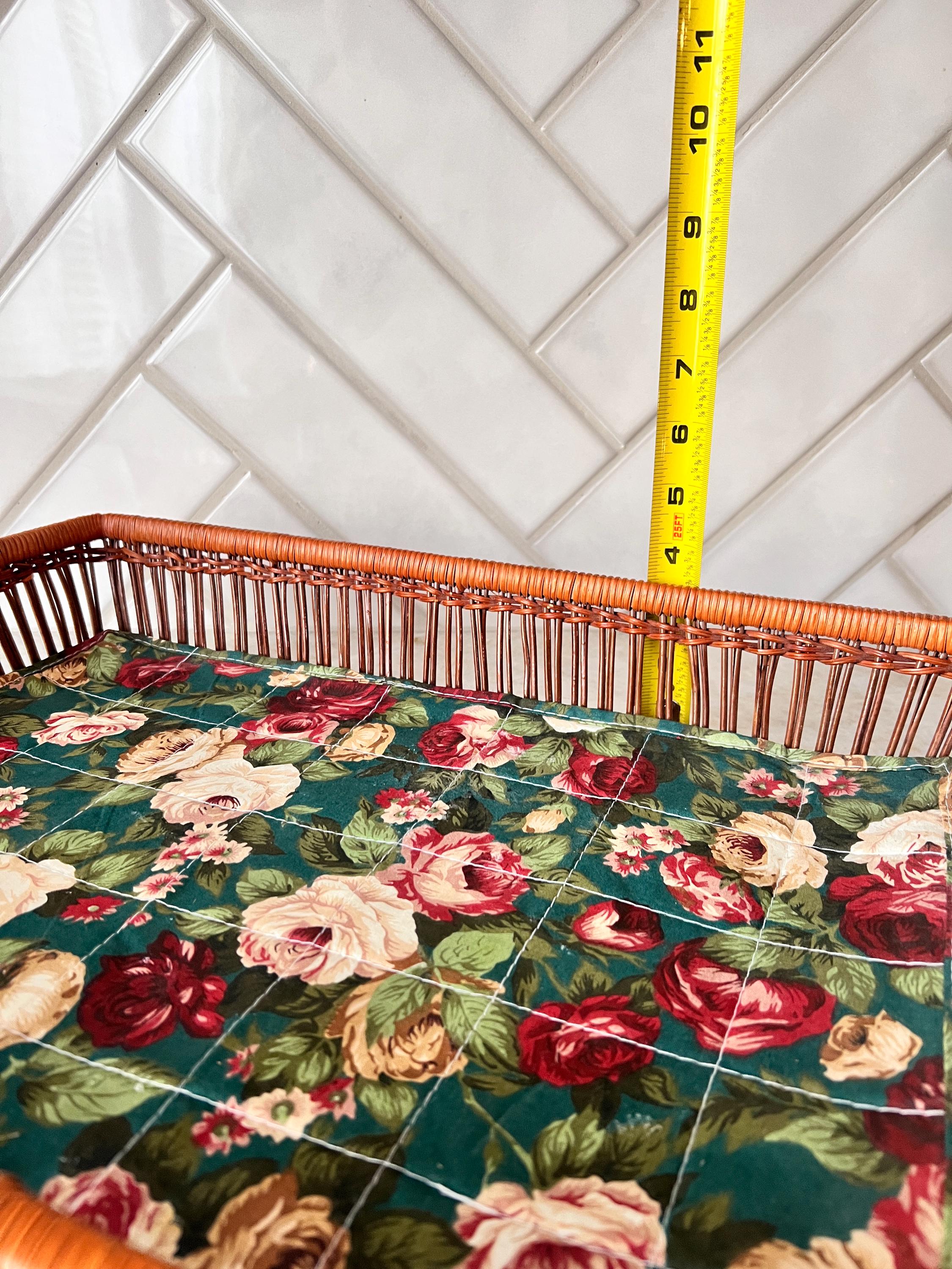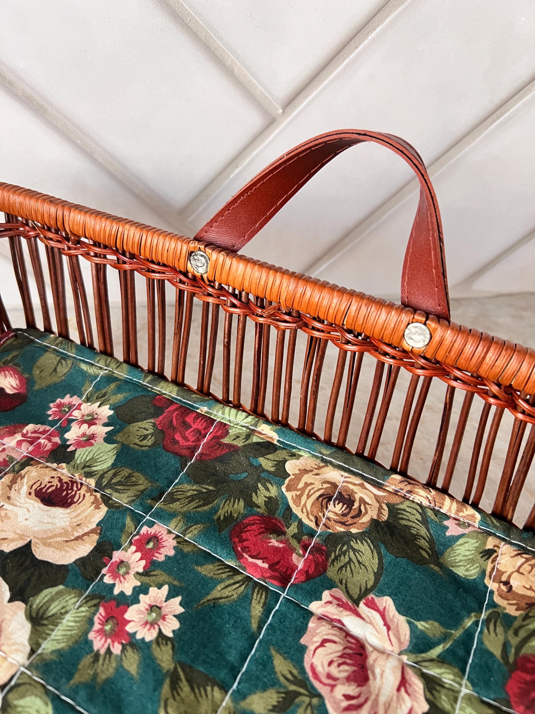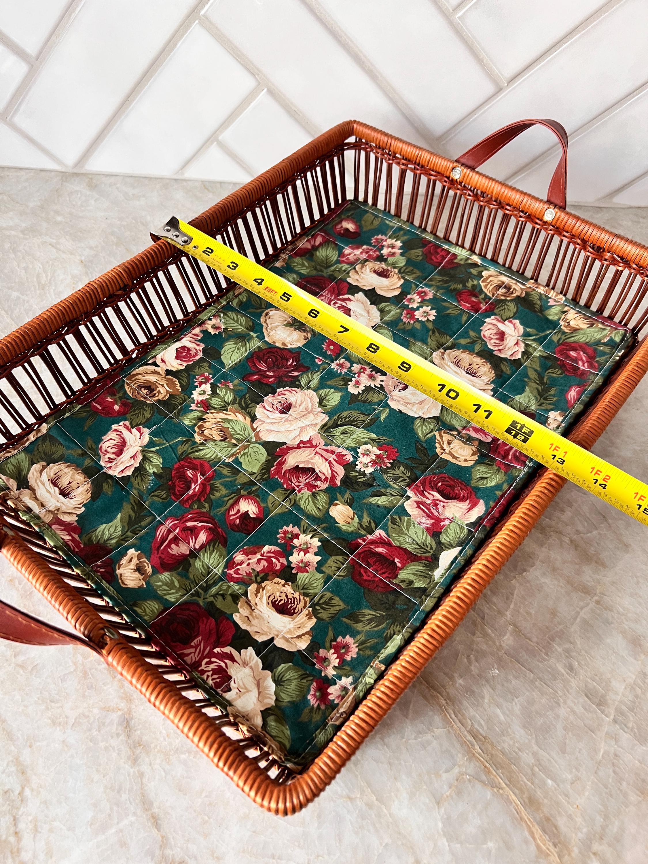 This charming vintage rectangular wicker tray features a vibrant rose-printed fabric base with rich green, ivory, and burgundy tones. Woven in a warm honey-brown finish, the open weave sides and faux leather handle accents add a cozy, rustic charm. It’s a perfect cottagecore or boho addition to your home.
