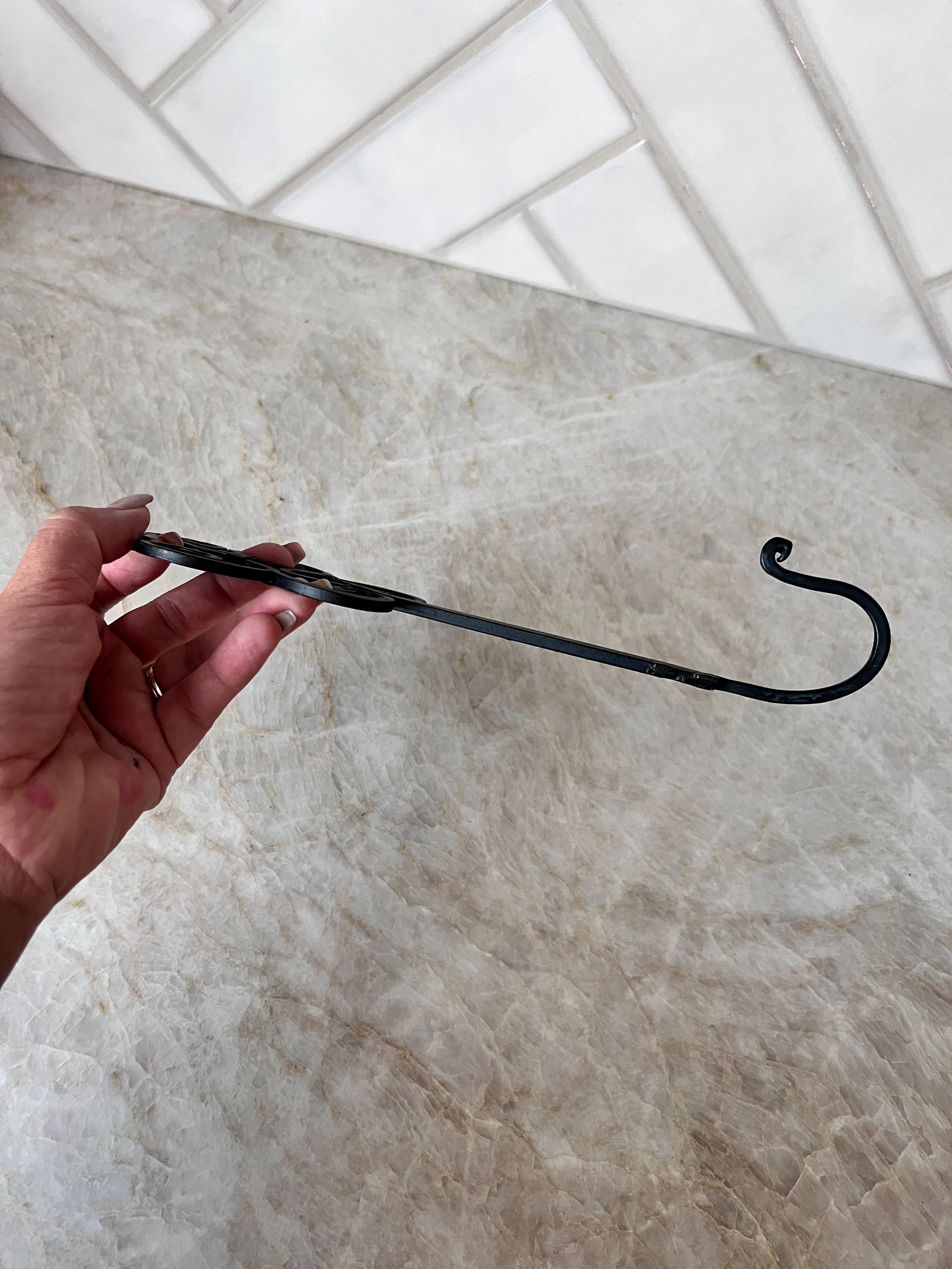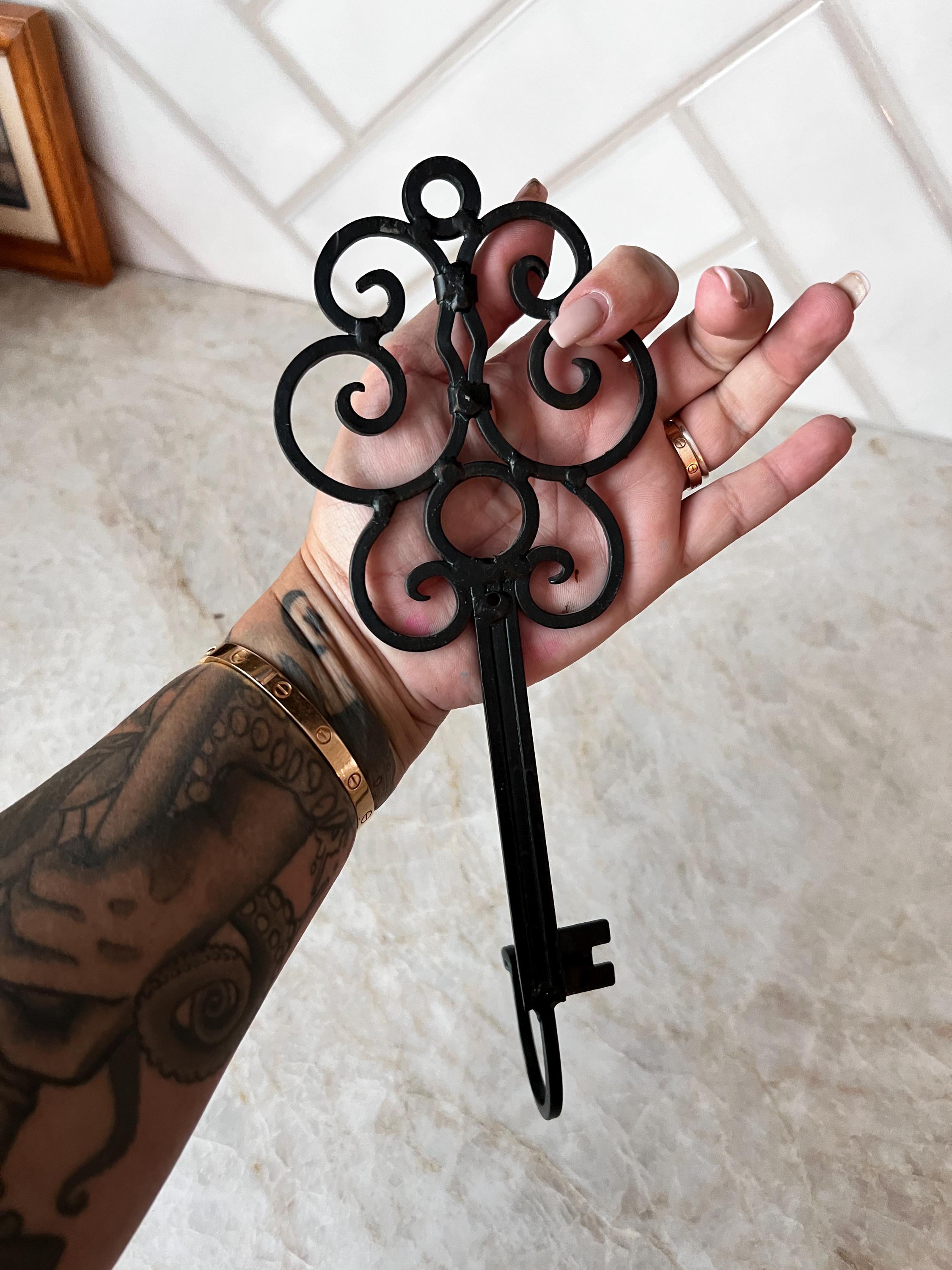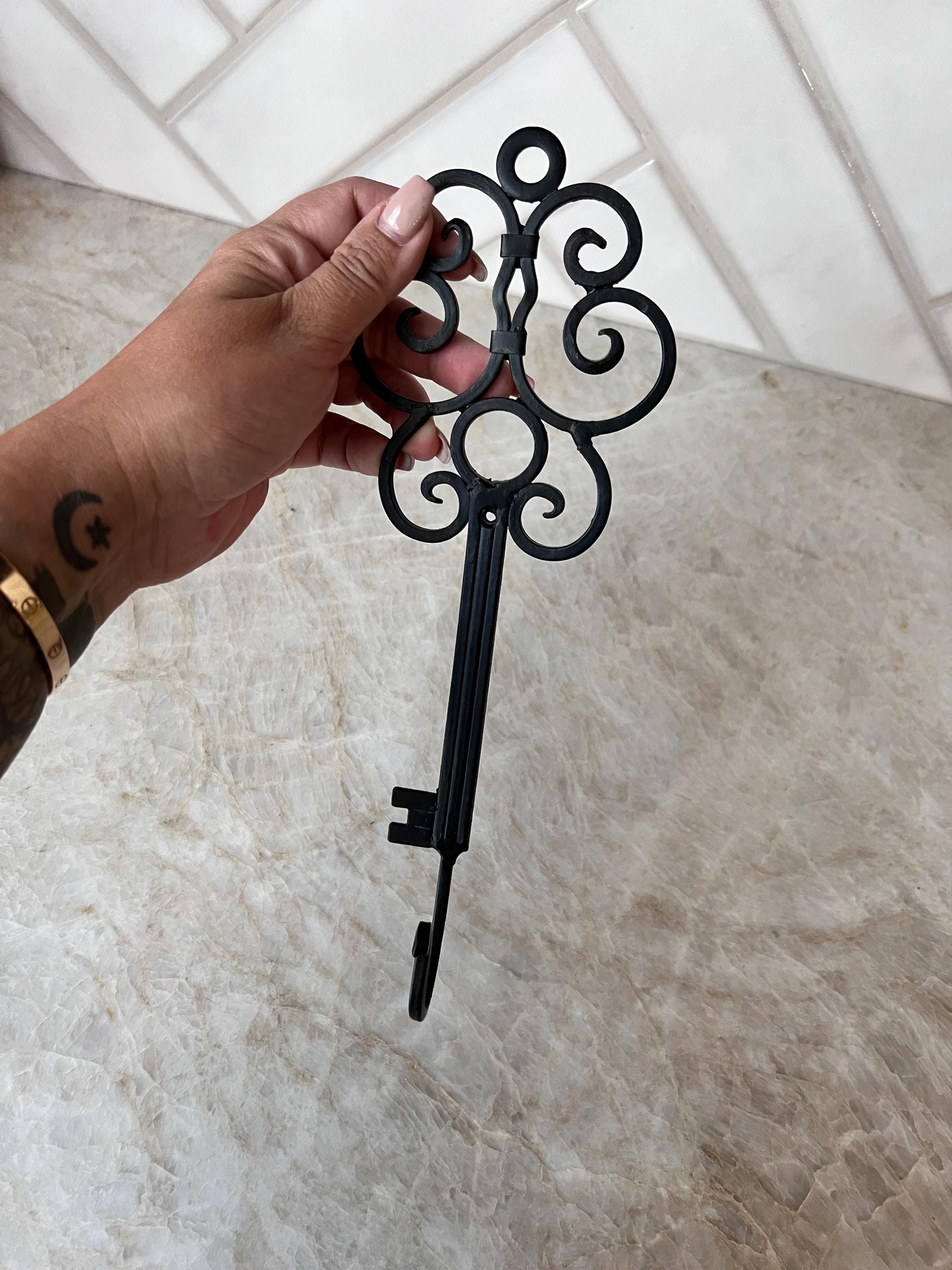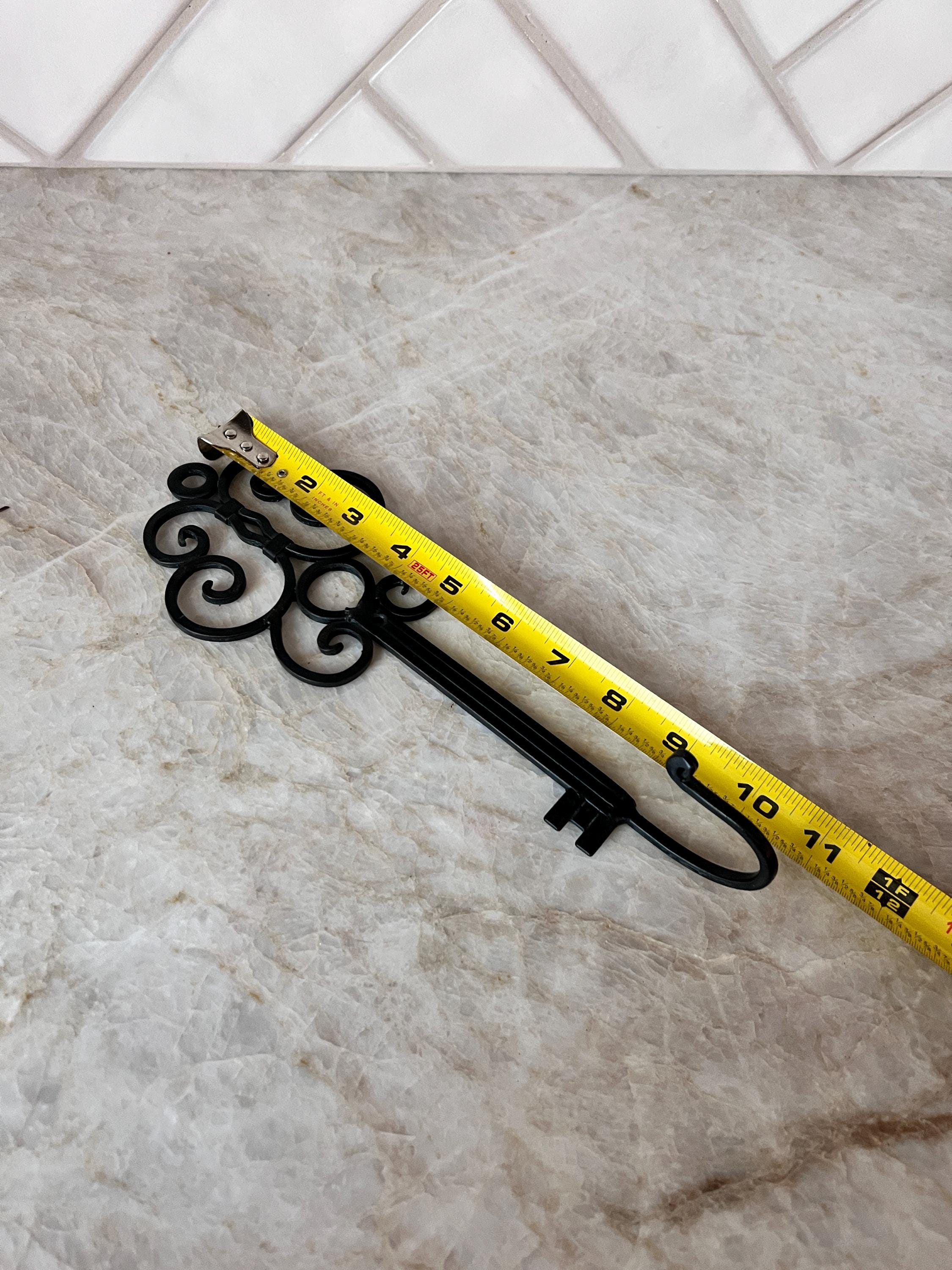 Add a touch of antique charm to your wall with this vintage wrought iron skeleton key wall hook. Crafted from sturdy black cast iron, this decorative piece features elegant scrollwork and a functional hook—perfect for hanging keys, lightweight accessories, or just displaying as an accent in farmhouse, gothic, or eclectic spaces.